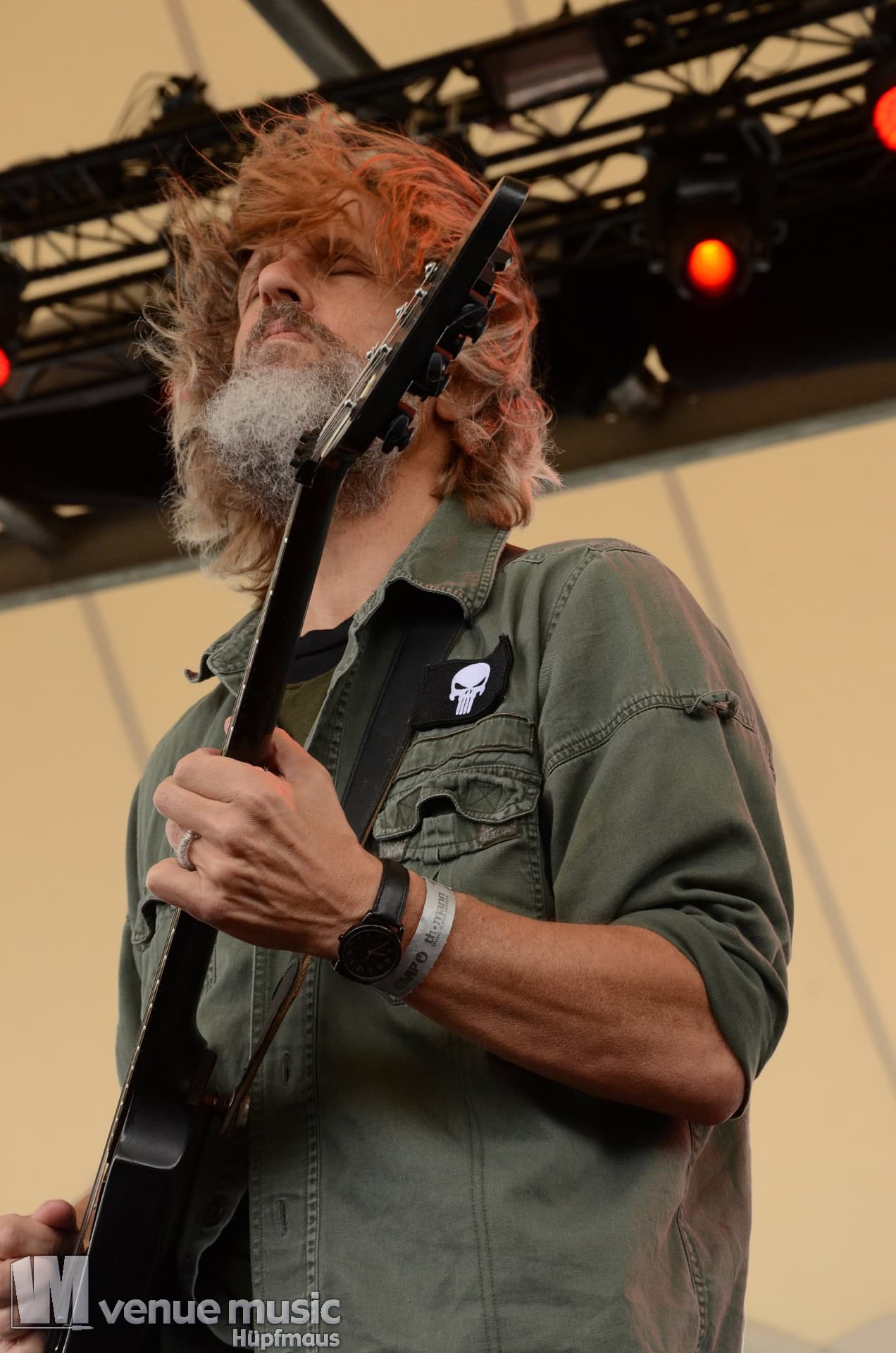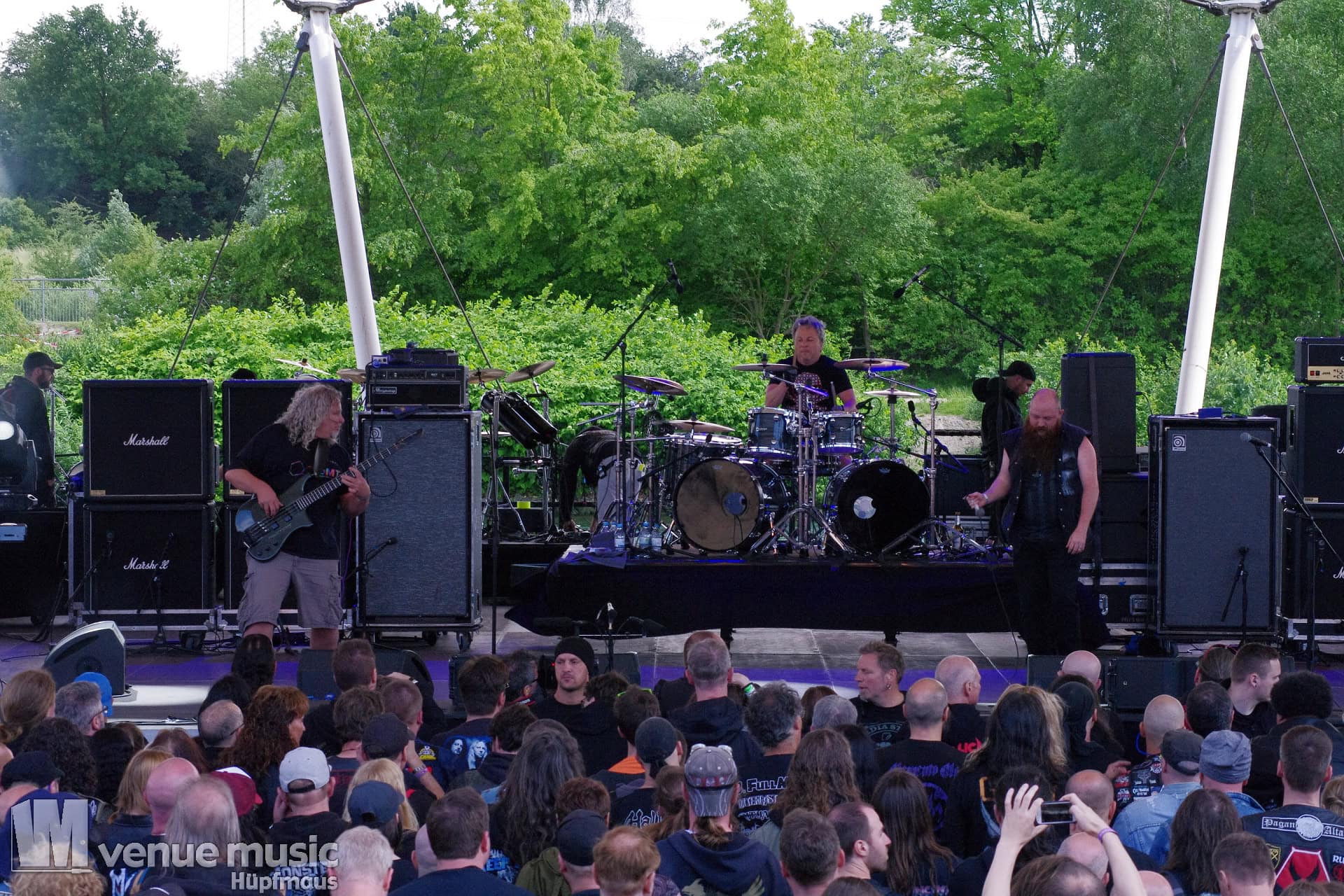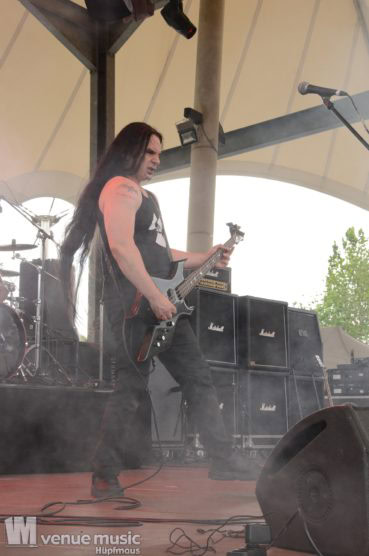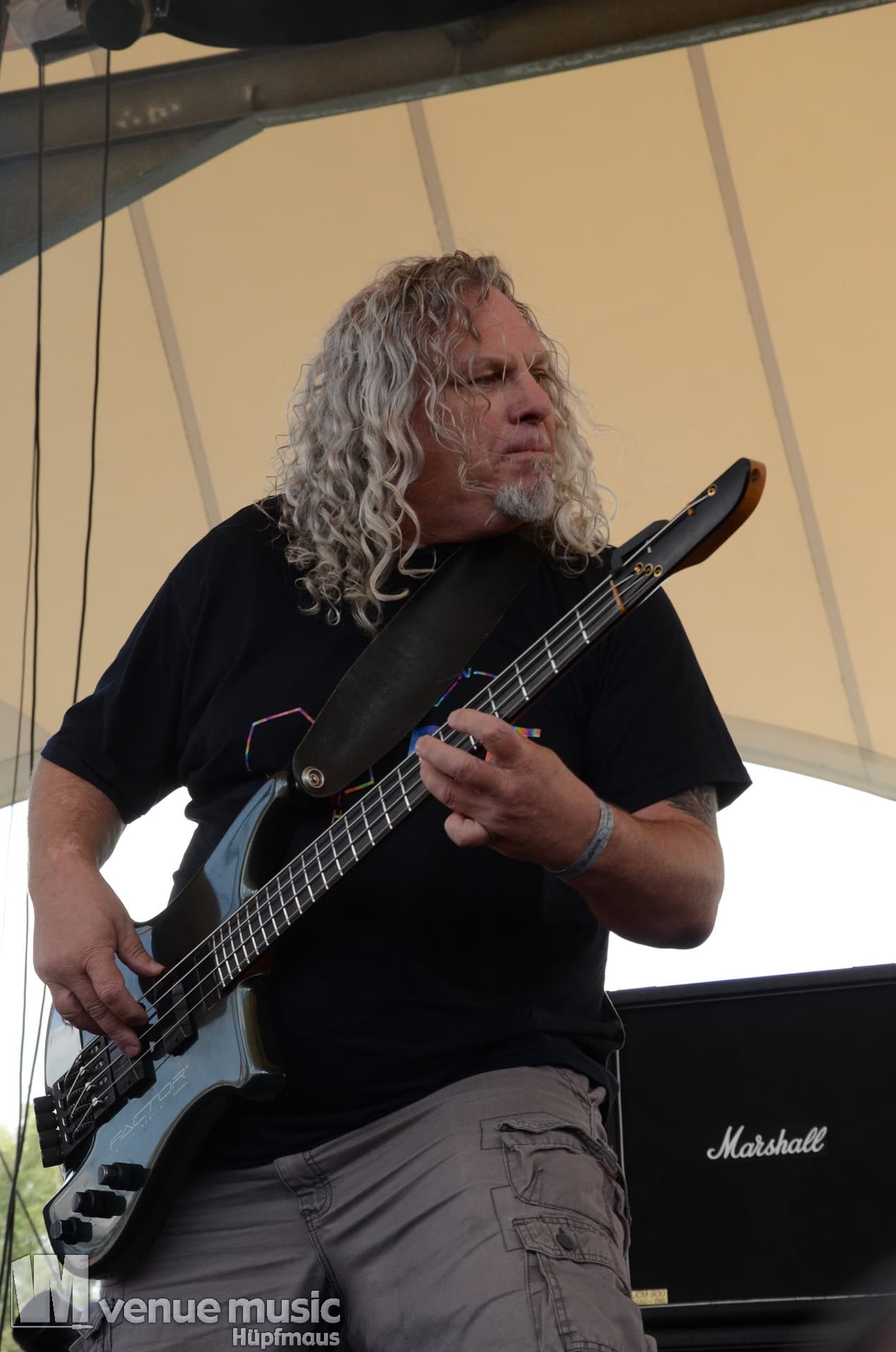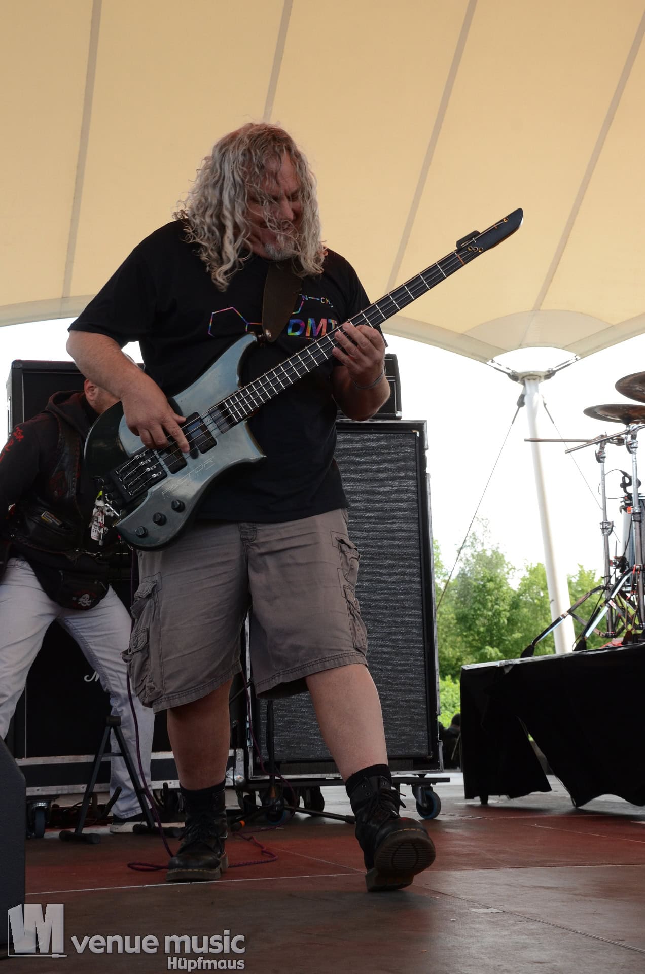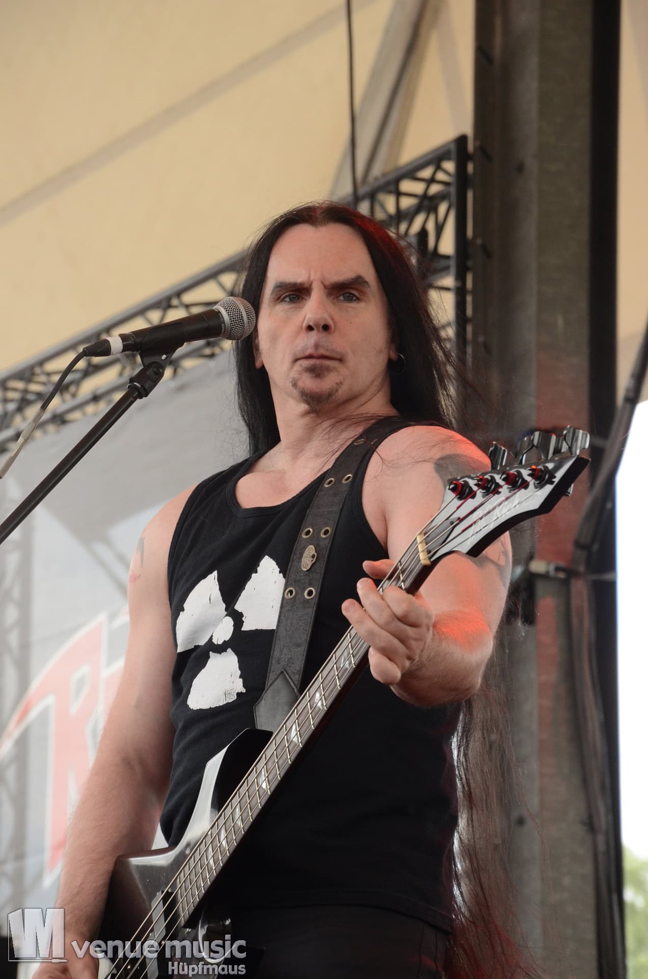 Tag 2 des Rock Hard Festivals startete für mich mit Carnivore A.D.. Die Bühne wirkte recht leer. Zum einen, weil es nur drei Musiker waren, aber es war auch ungewohnt, dass kein Backdrop den Hintergrund zierte. Es war dafür schlicht zu windig. Dafür hat Baron Misuraca Haare für drei ;) Dass die sich bei dem Wind nicht an seinem Bass verhedderten, war ein Wunder..