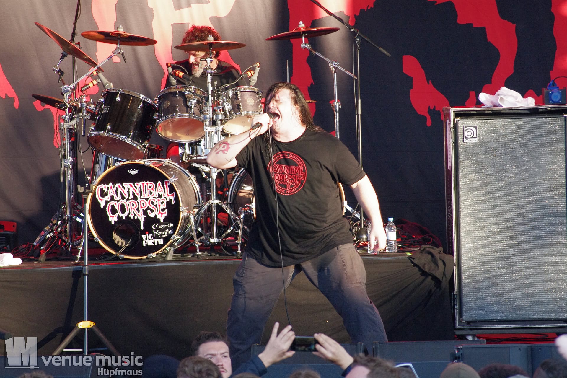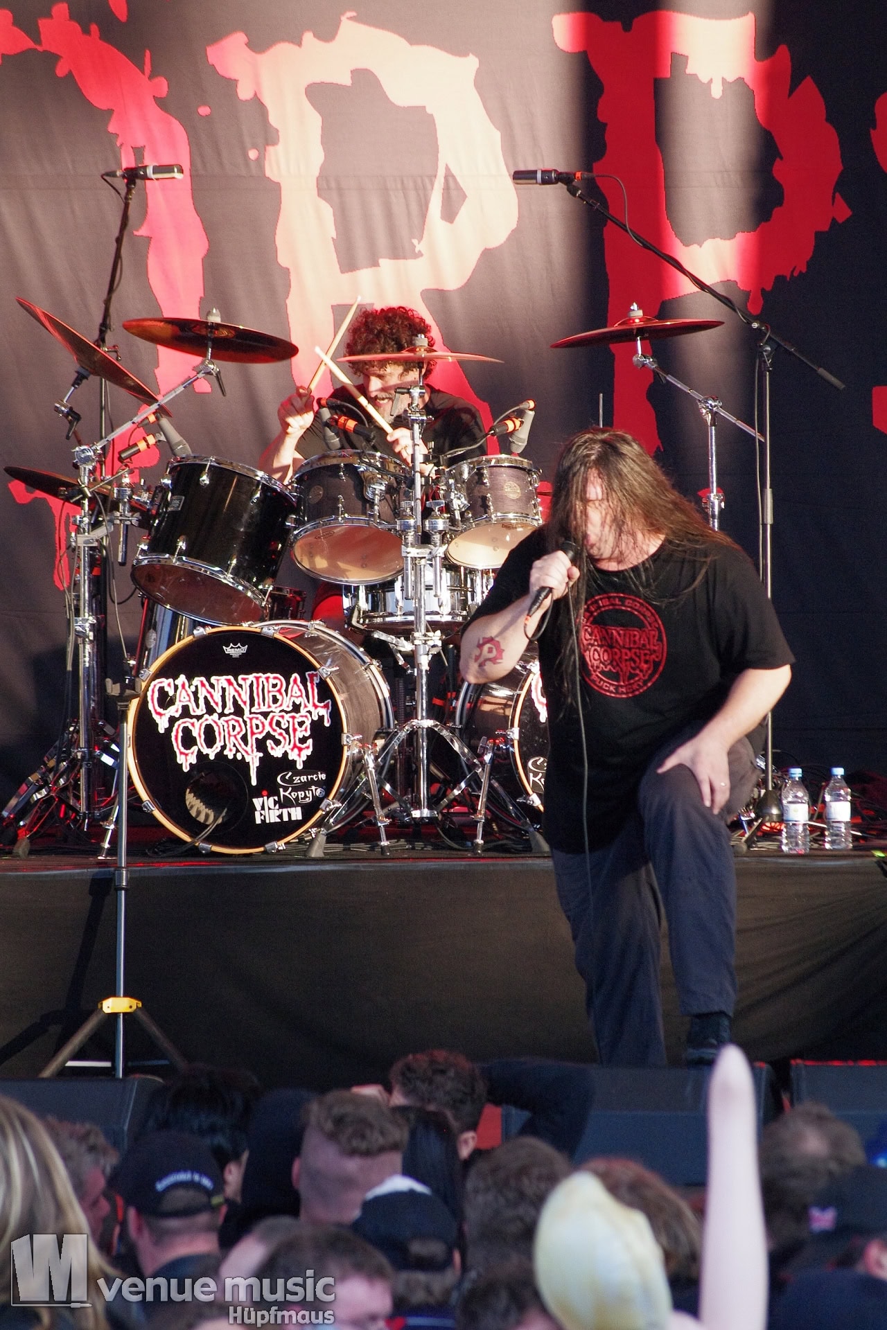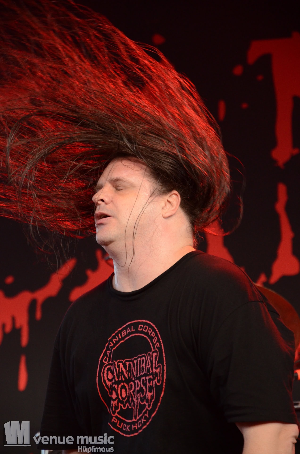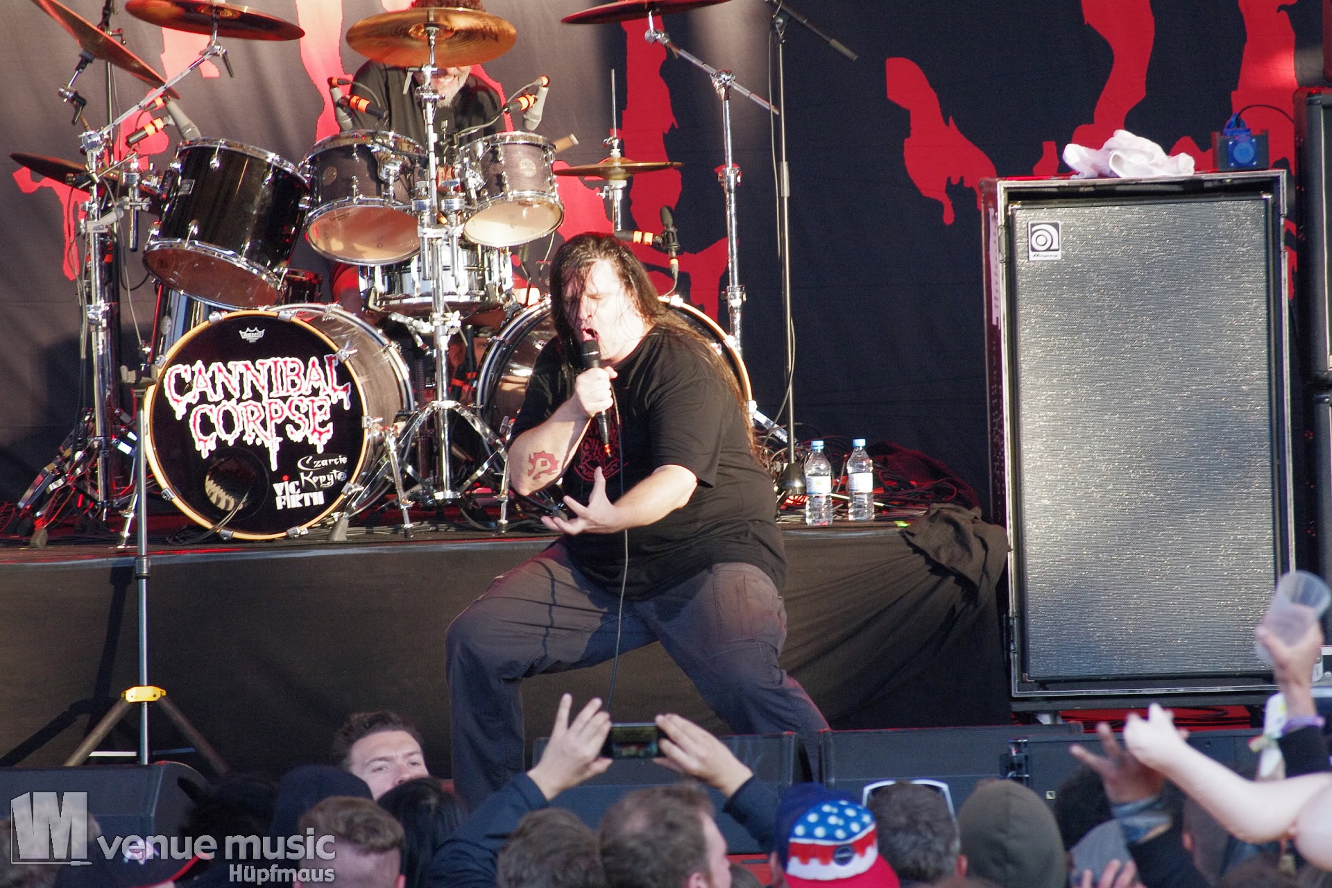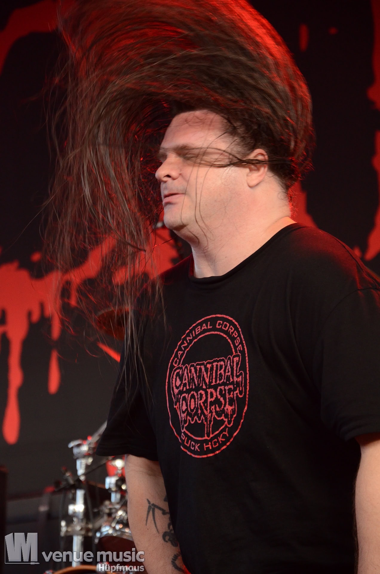 Bereits zu Skid Row hatte der Wind sich so weit gelegt, dass es wieder möglich war die Backdrops der Bands aufzuhängen und so konnte auch Cannibal Corpse ihres nutzen. Allerdings gab es vom ganzen Tag keine Videoaufzeichnung. Für die Fotografen im Graben natürlich schön, aber um im Nachhinein das Ganze noch mal Revue passieren zu lassen schade war. Ebenso für all diejenigen, die nicht kommen konnten, aber wenigstens dann das ganze live auf dem Bildschirm mitverfolgen wollten.