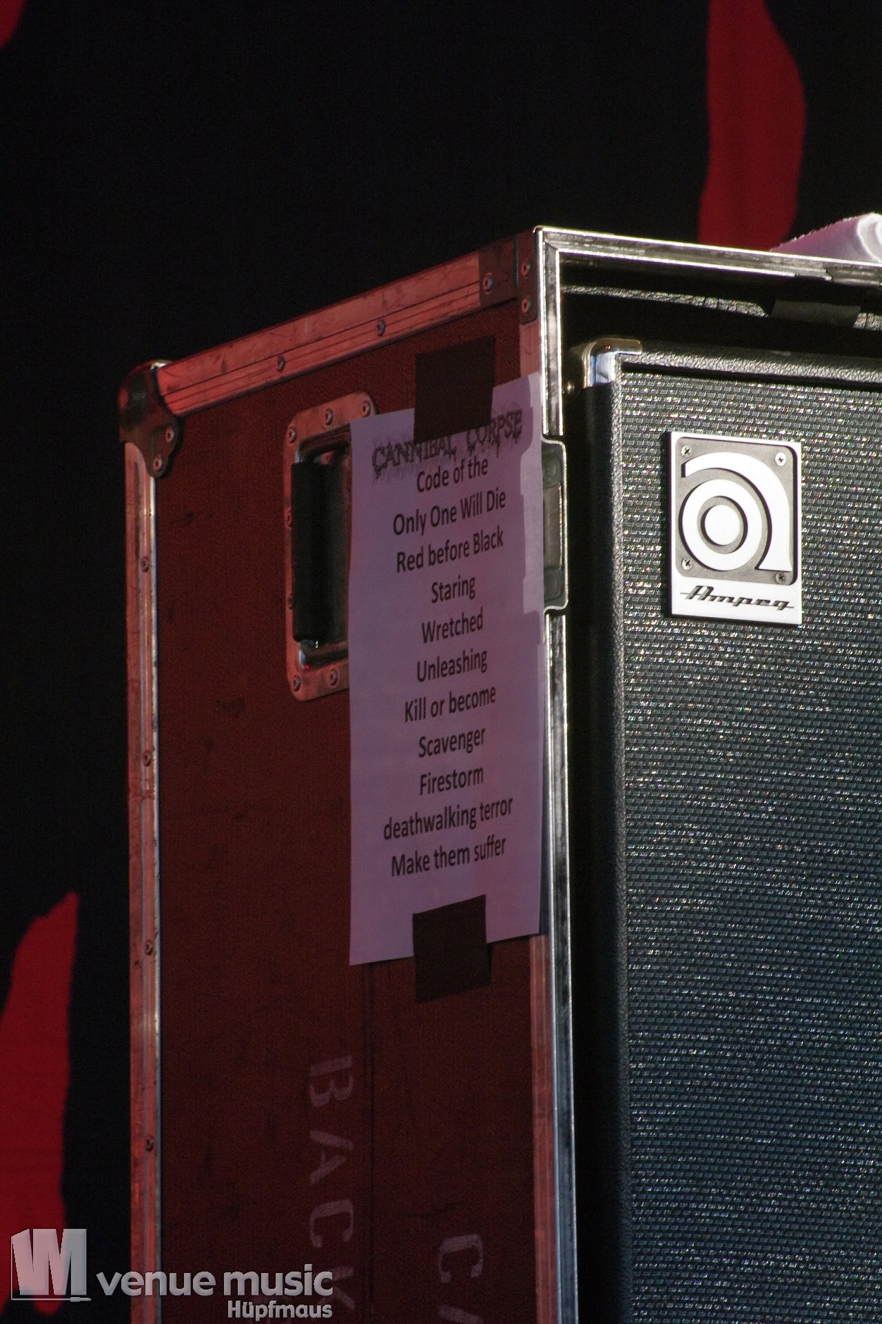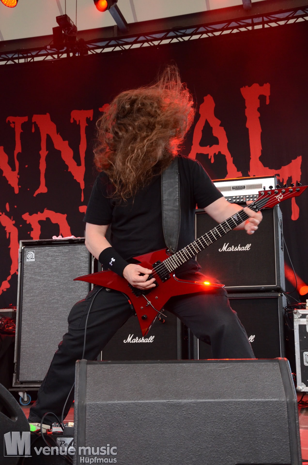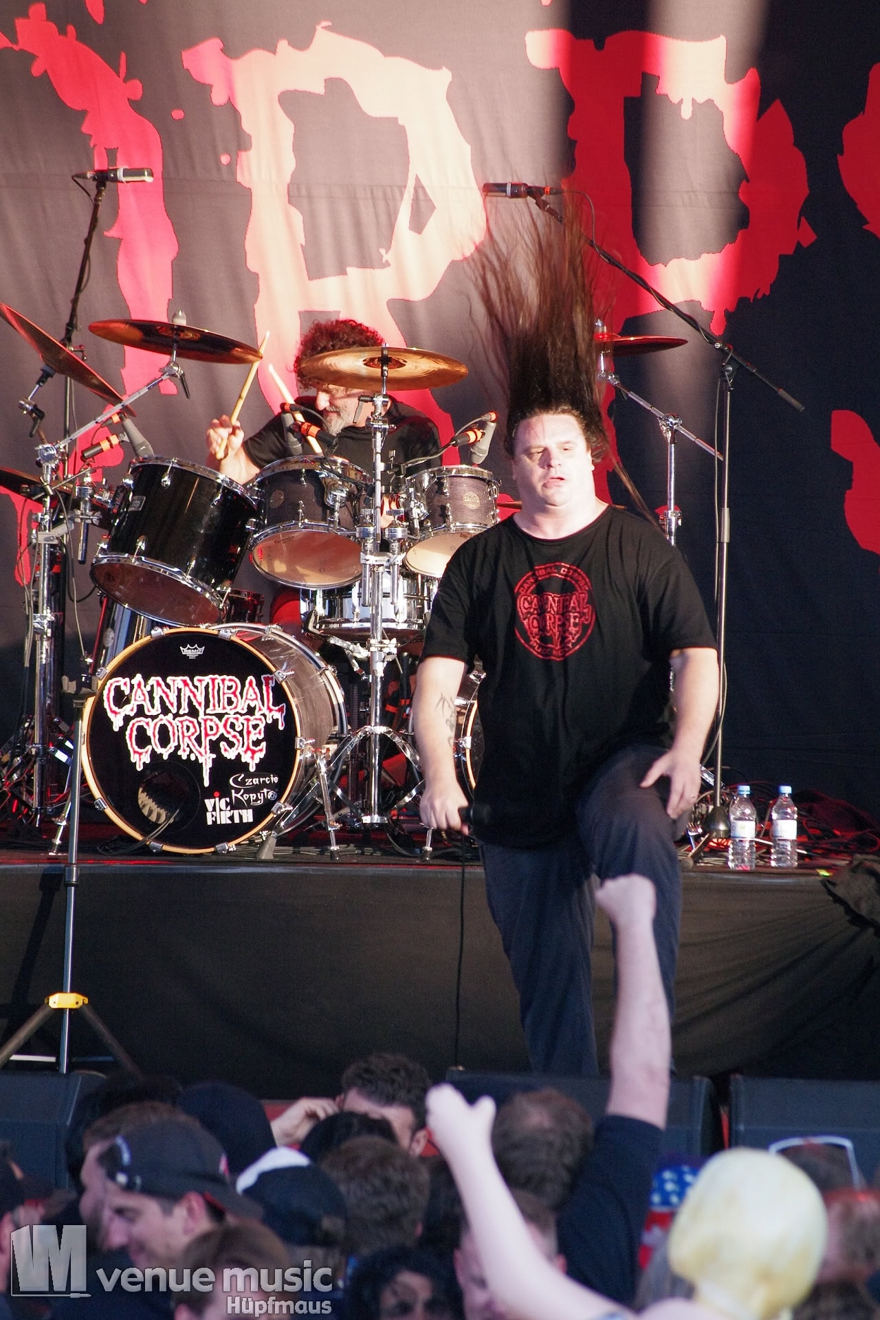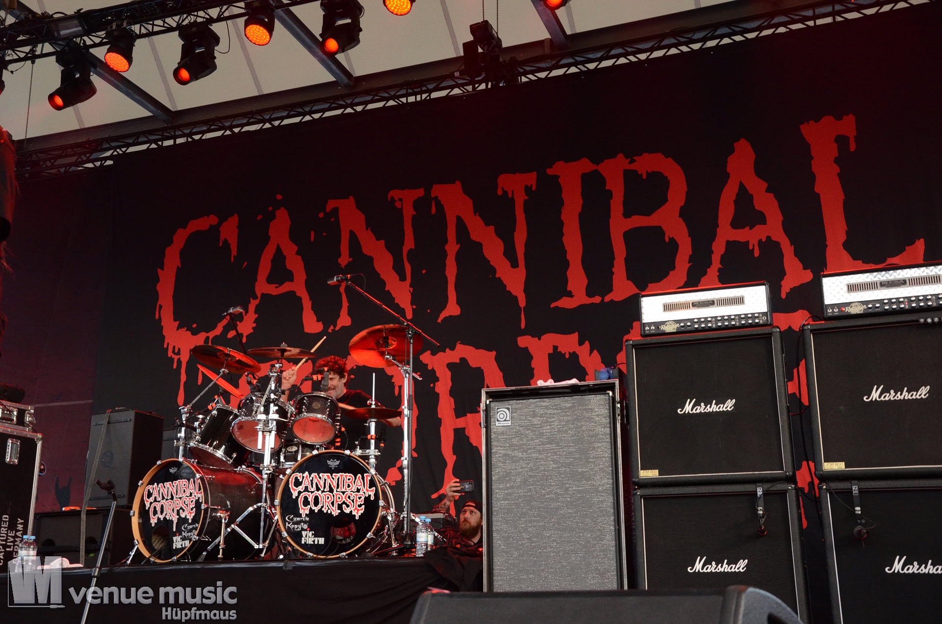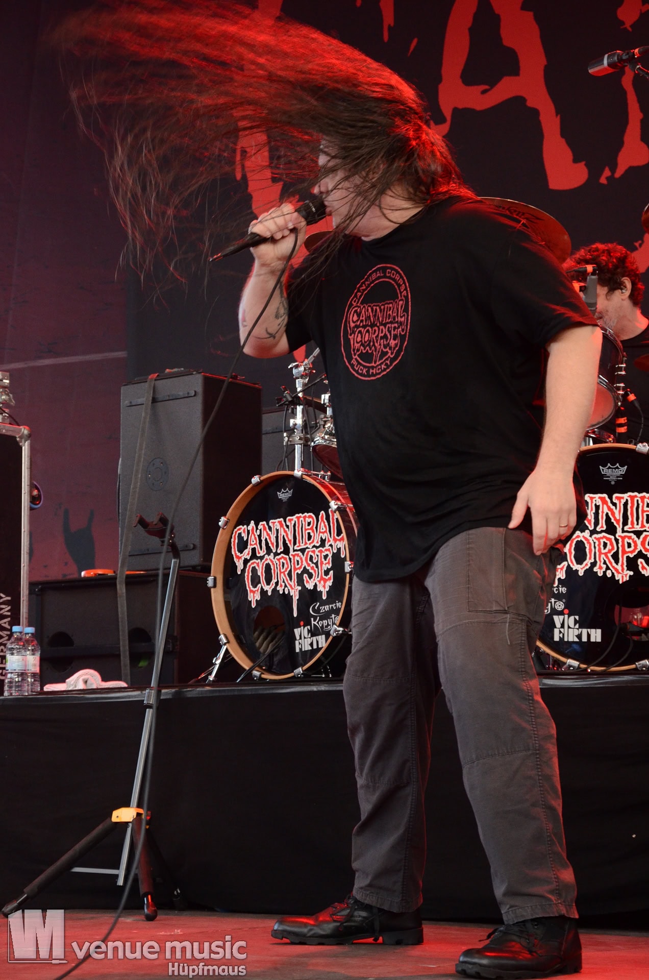Bereits zu Skid Row hatte der Wind sich so weit gelegt, dass es wieder möglich war die Backdrops der Bands aufzuhängen und so konnte auch Cannibal Corpse ihres nutzen. Allerdings gab es vom ganzen Tag keine Videoaufzeichnung. Für die Fotografen im Graben natürlich schön, aber um im Nachhinein das Ganze noch mal Revue passieren zu lassen schade war. Ebenso für all diejenigen, die nicht kommen konnten, aber wenigstens dann das ganze live auf dem Bildschirm mitverfolgen wollten.