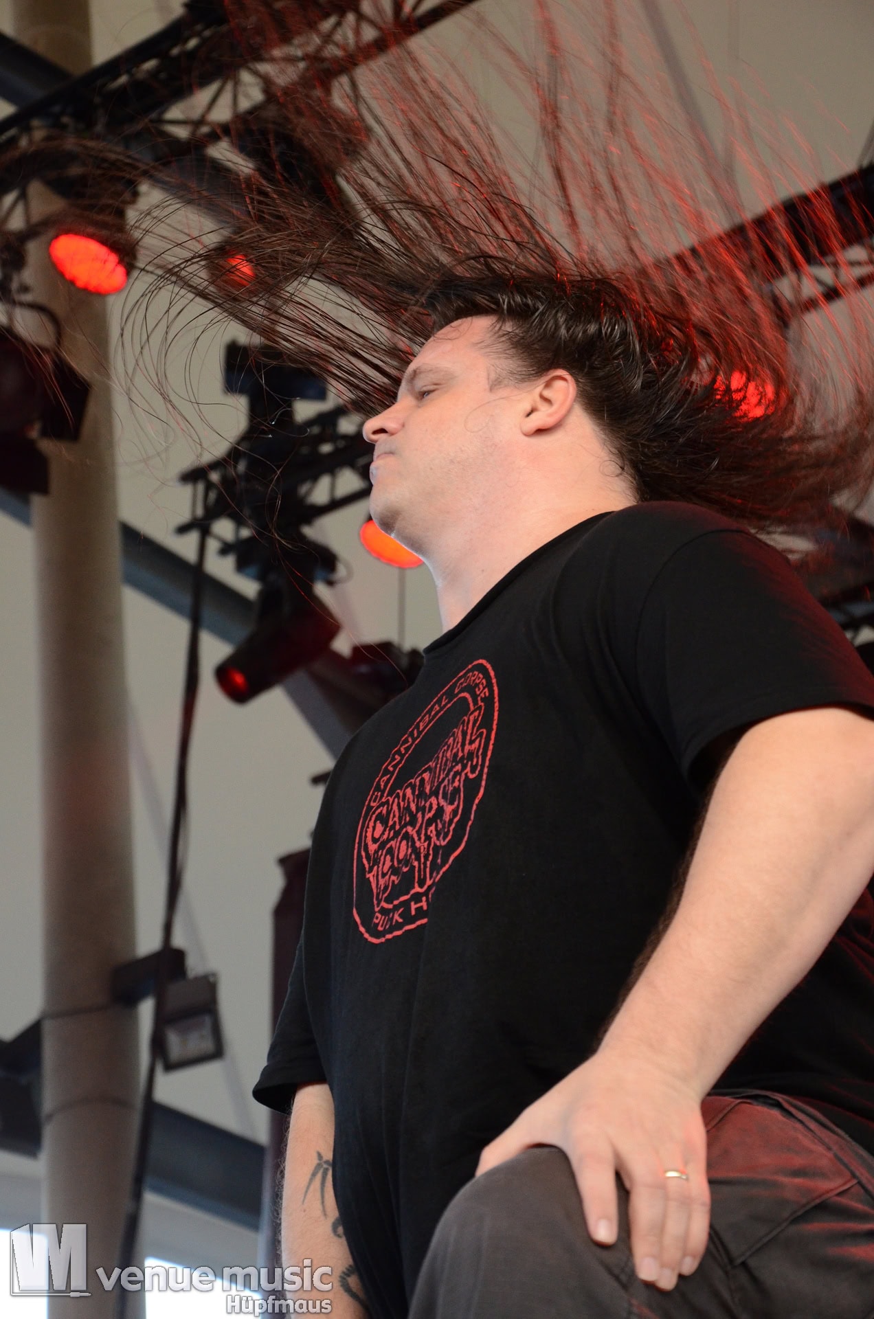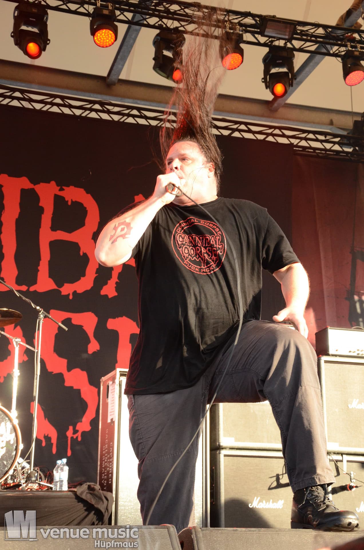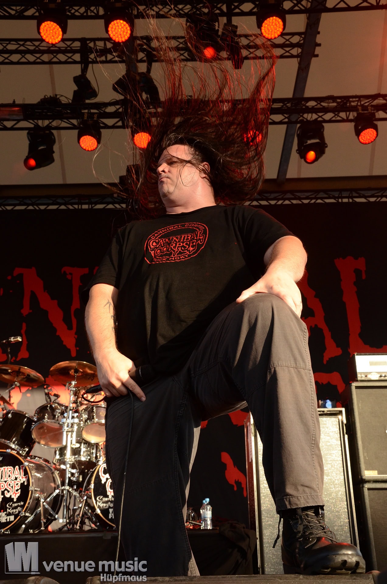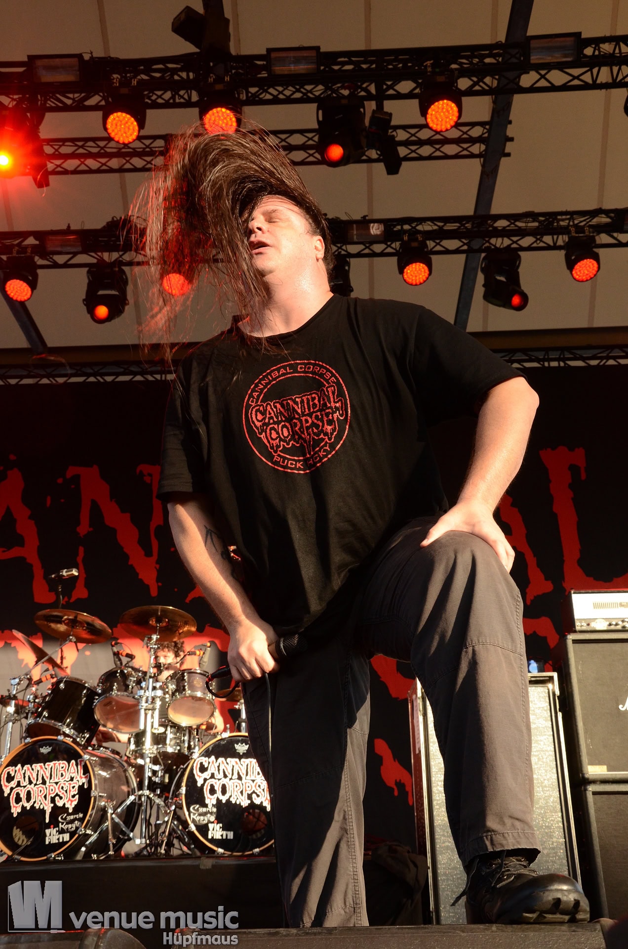 Bereits zu Skid Row hatte der Wind sich so weit gelegt, dass es wieder möglich war die Backdrops der Bands aufzuhängen und so konnte auch Cannibal Corpse ihres nutzen. Allerdings gab es vom ganzen Tag keine Videoaufzeichnung. Für die Fotografen im Graben natürlich schön, aber um im Nachhinein das Ganze noch mal Revue passieren zu lassen schade war. Ebenso für all diejenigen, die nicht kommen konnten, aber wenigstens dann das ganze live auf dem Bildschirm mitverfolgen wollten.