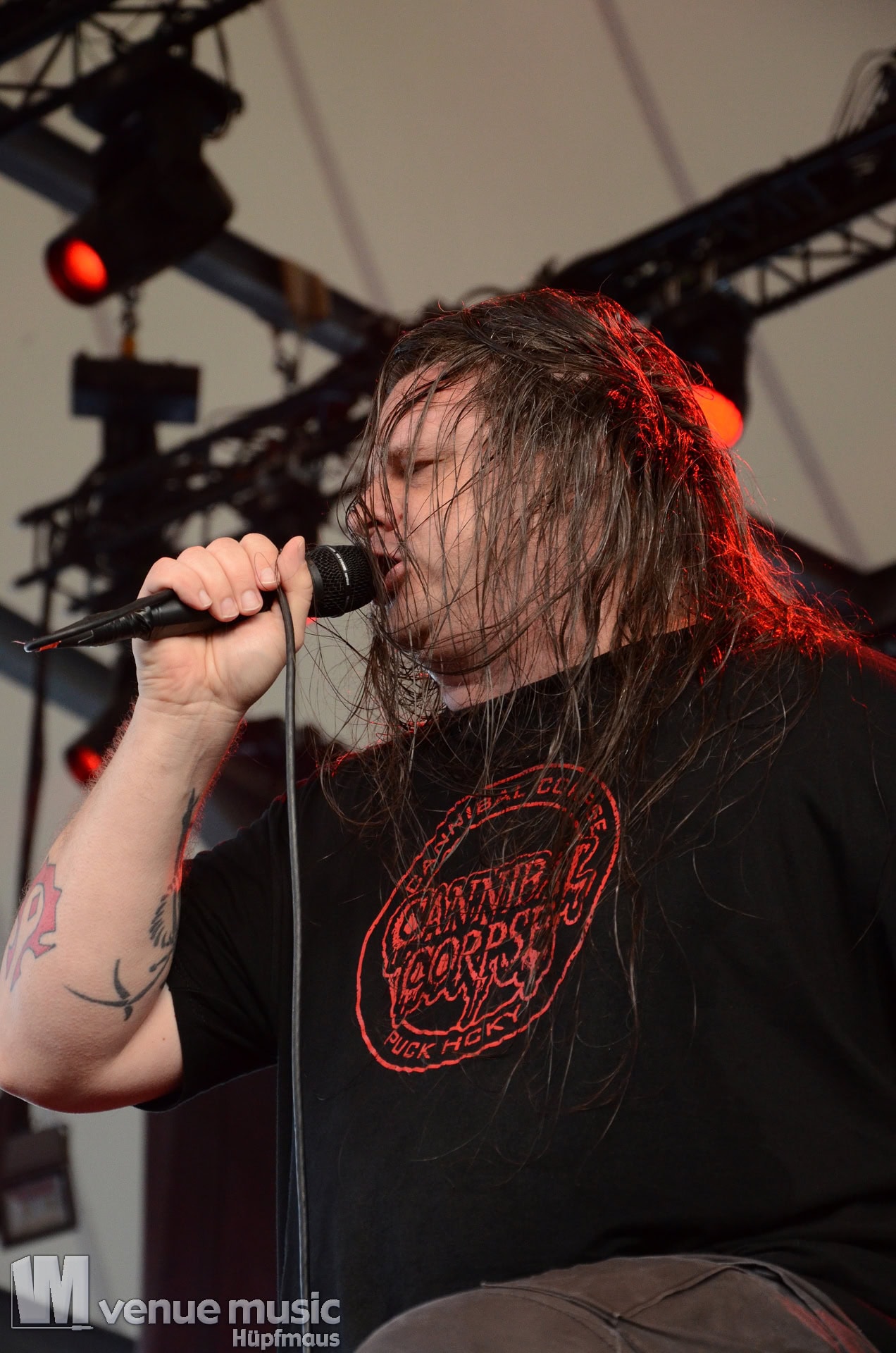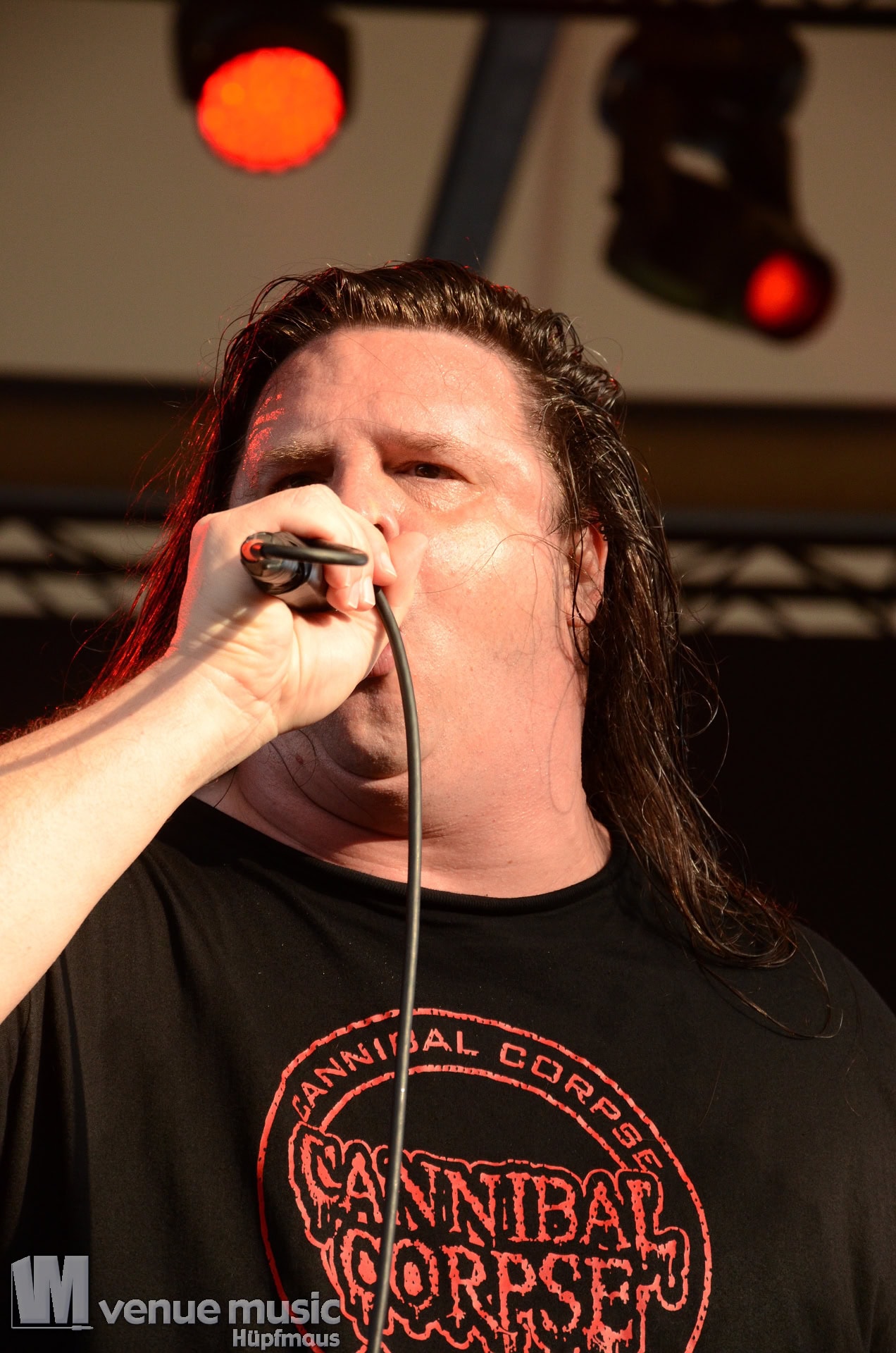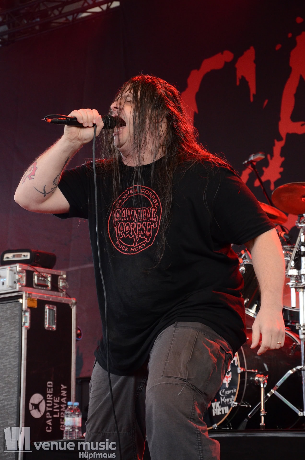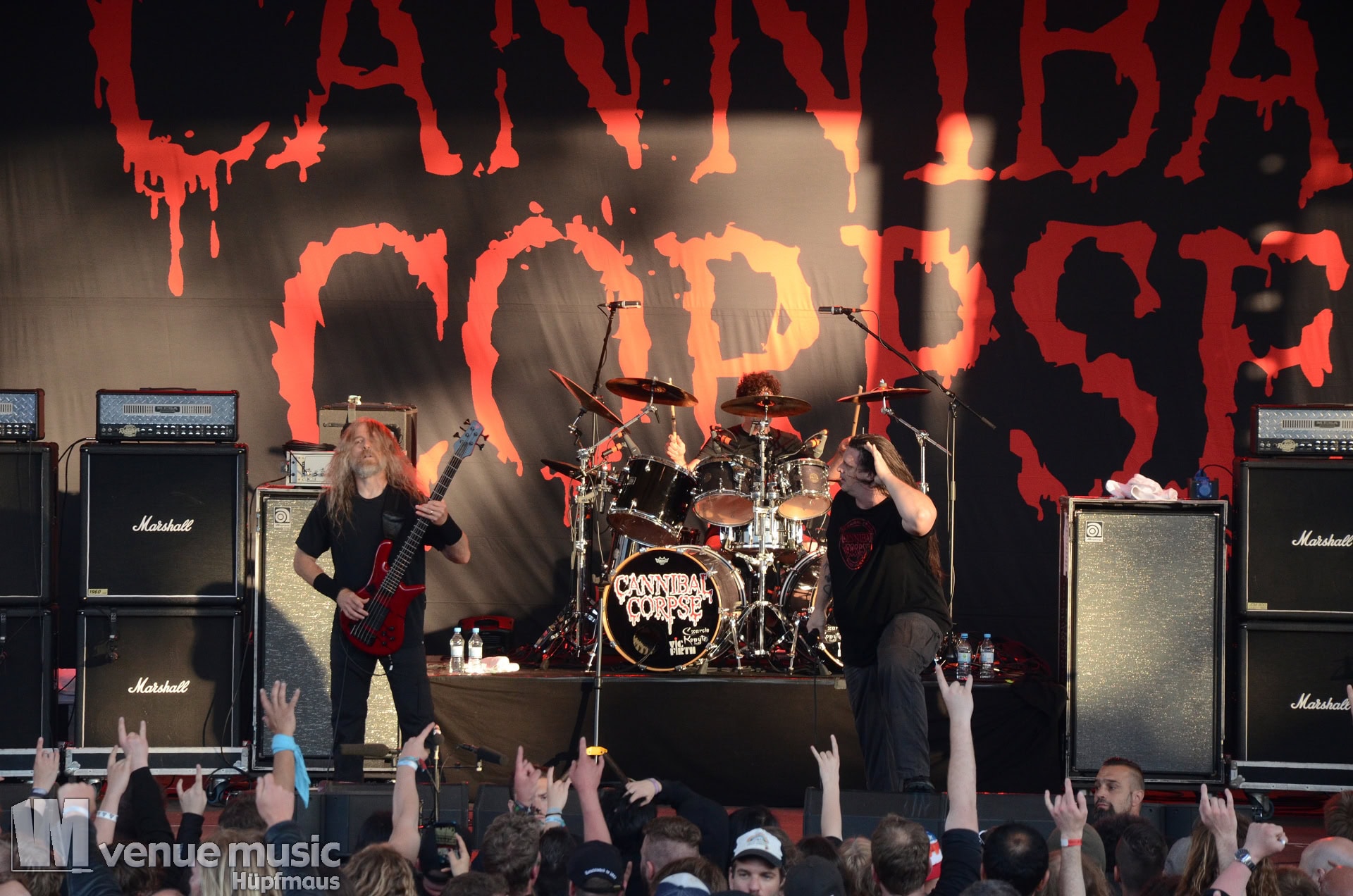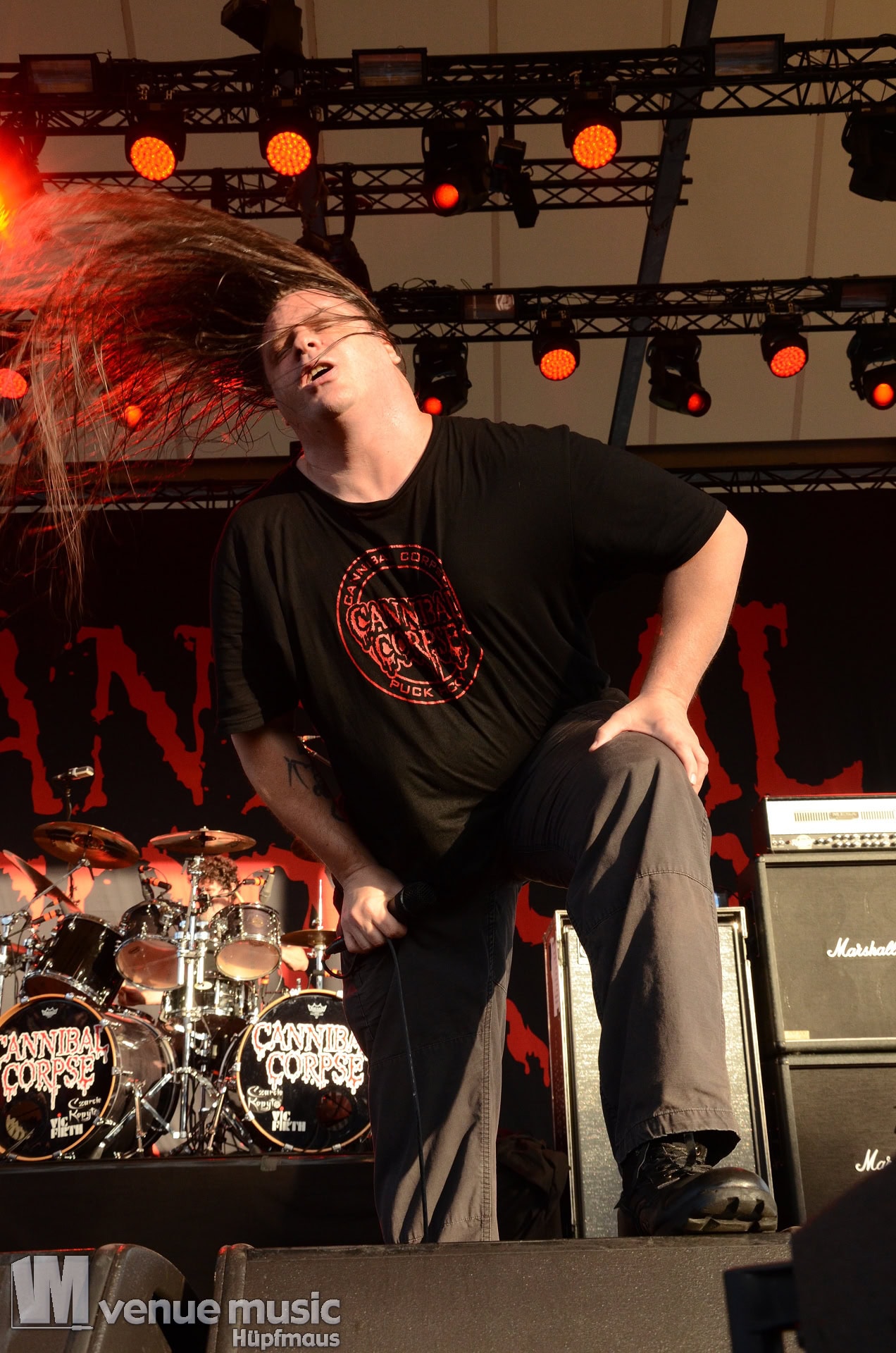Bereits zu Skid Row hatte der Wind sich so weit gelegt, dass es wieder möglich war die Backdrops der Bands aufzuhängen und so konnte auch Cannibal Corpse ihres nutzen. Allerdings gab es vom ganzen Tag keine Videoaufzeichnung. Für die Fotografen im Graben natürlich schön, aber um im Nachhinein das Ganze noch mal Revue passieren zu lassen schade war. Ebenso für all diejenigen, die nicht kommen konnten, aber wenigstens dann das ganze live auf dem Bildschirm mitverfolgen wollten.