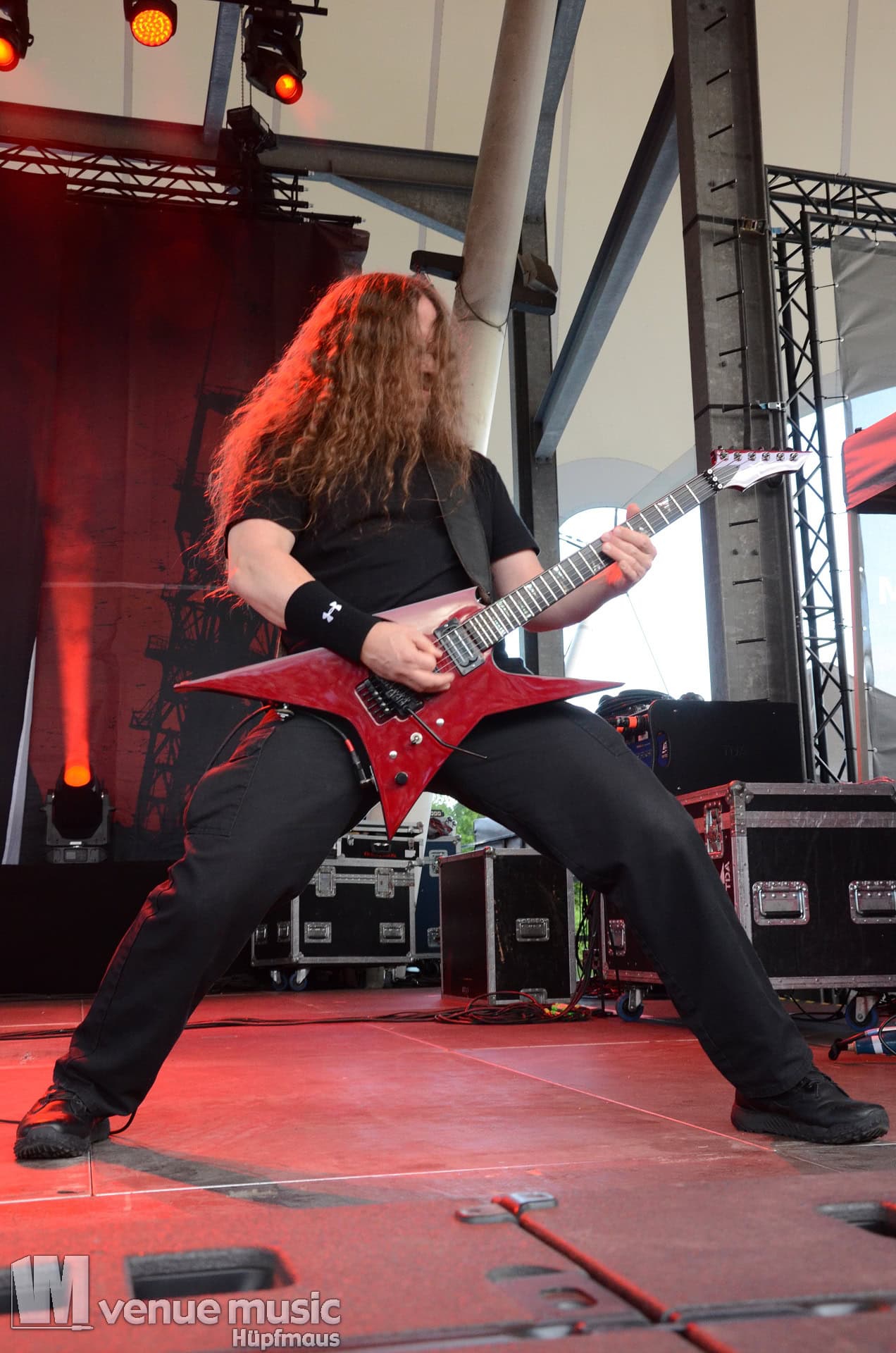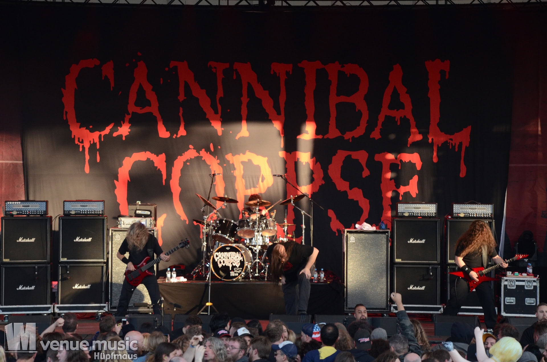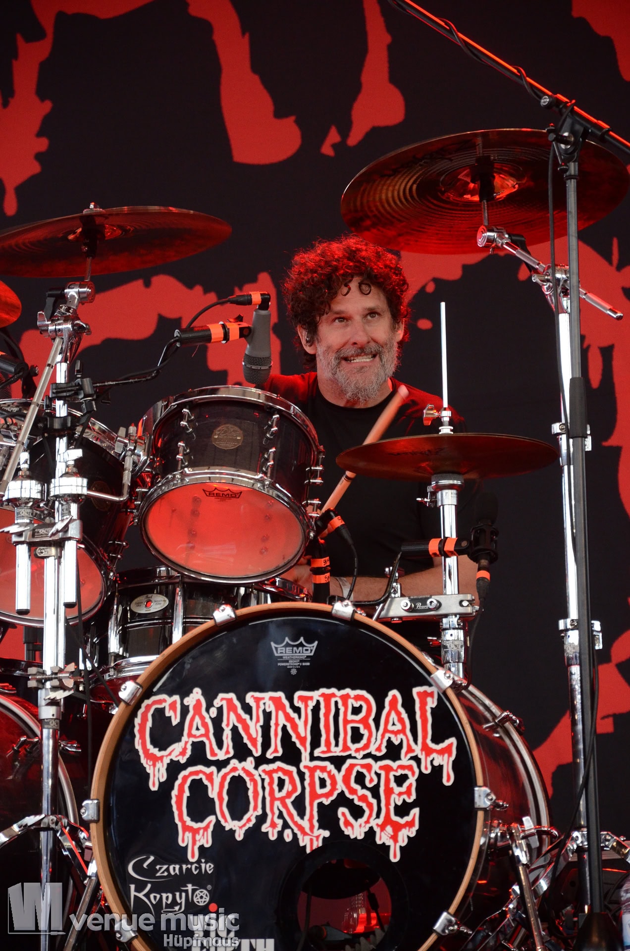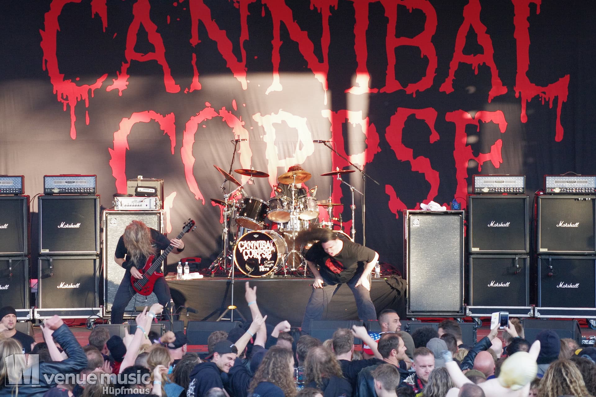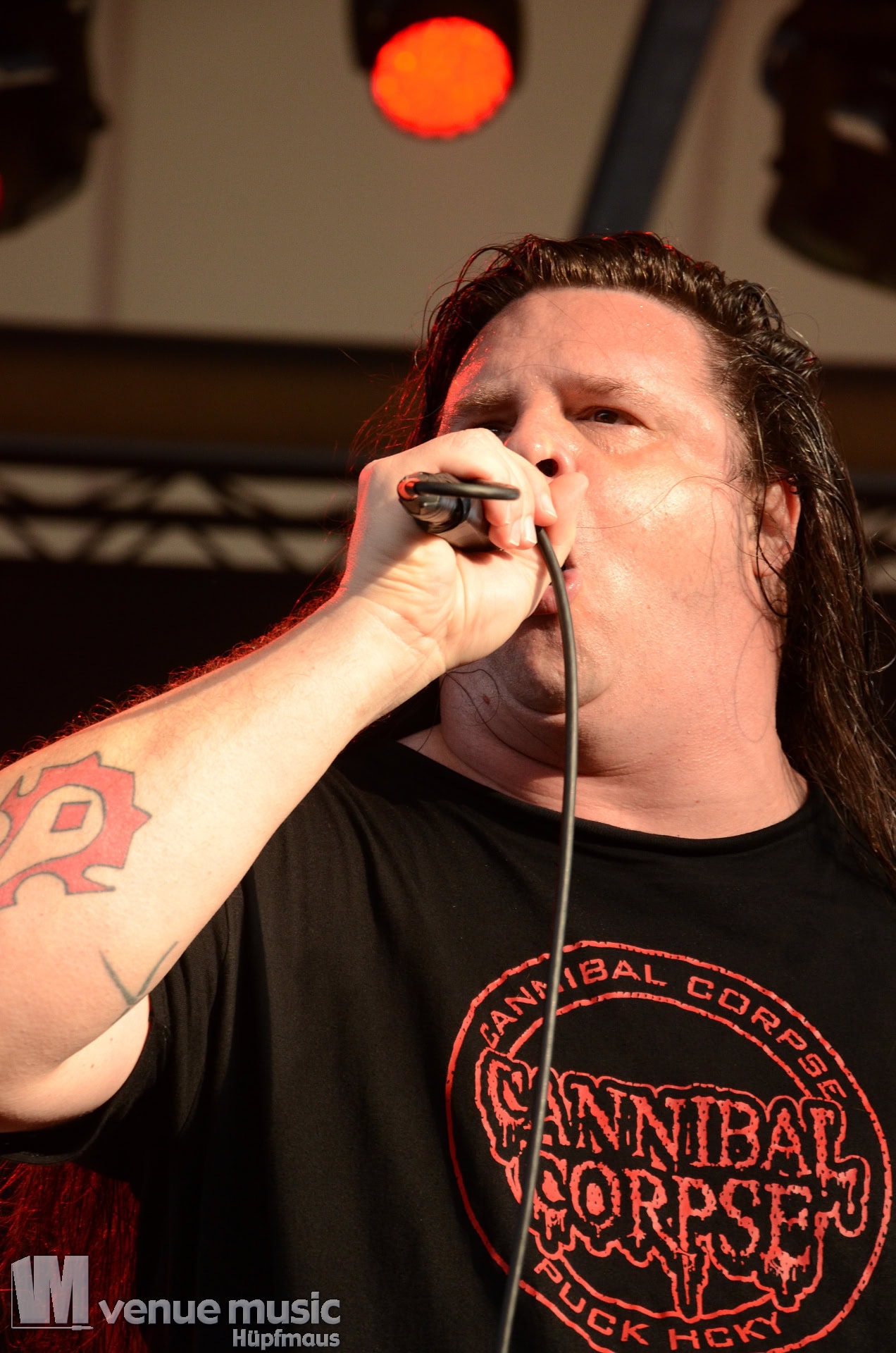 Bereits zu Skid Row hatte der Wind sich so weit gelegt, dass es wieder möglich war die Backdrops der Bands aufzuhängen und so konnte auch Cannibal Corpse ihres nutzen. Allerdings gab es vom ganzen Tag keine Videoaufzeichnung. Für die Fotografen im Graben natürlich schön, aber um im Nachhinein das Ganze noch mal Revue passieren zu lassen schade war. Ebenso für all diejenigen, die nicht kommen konnten, aber wenigstens dann das ganze live auf dem Bildschirm mitverfolgen wollten.