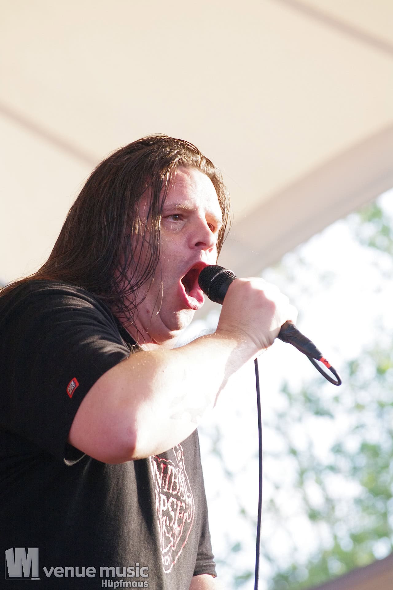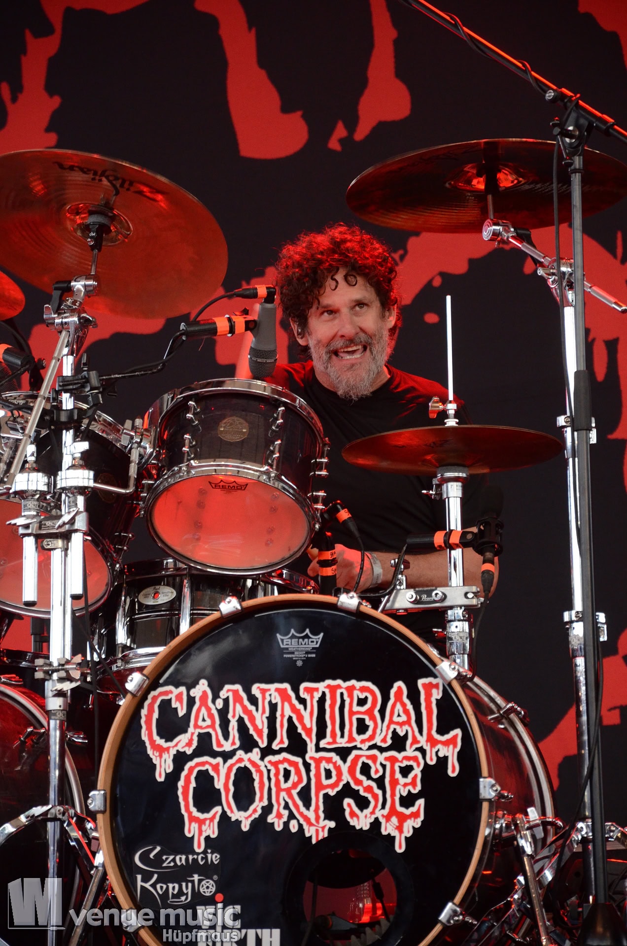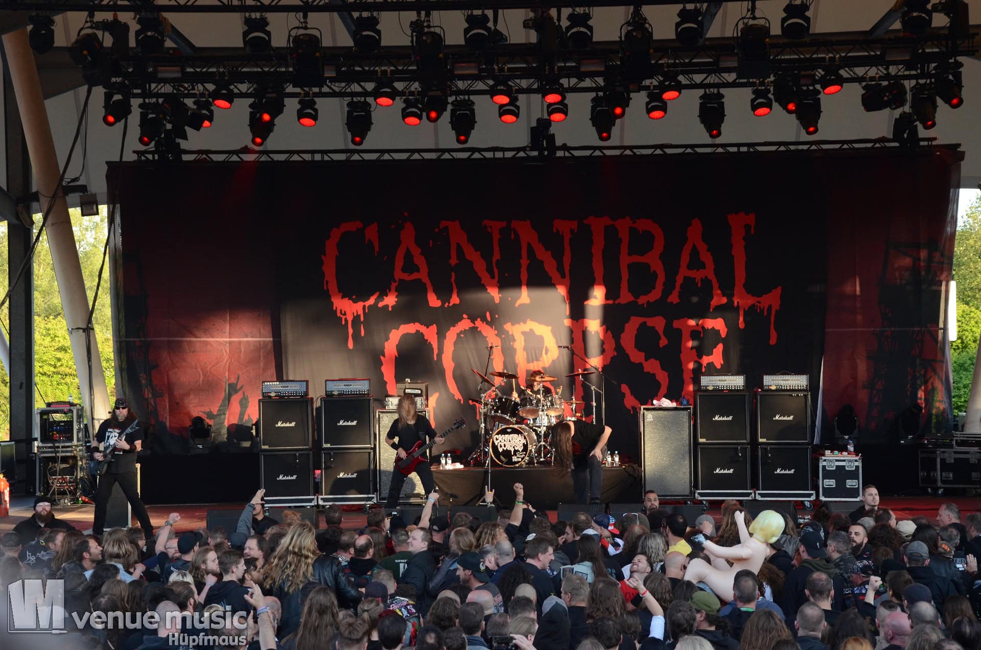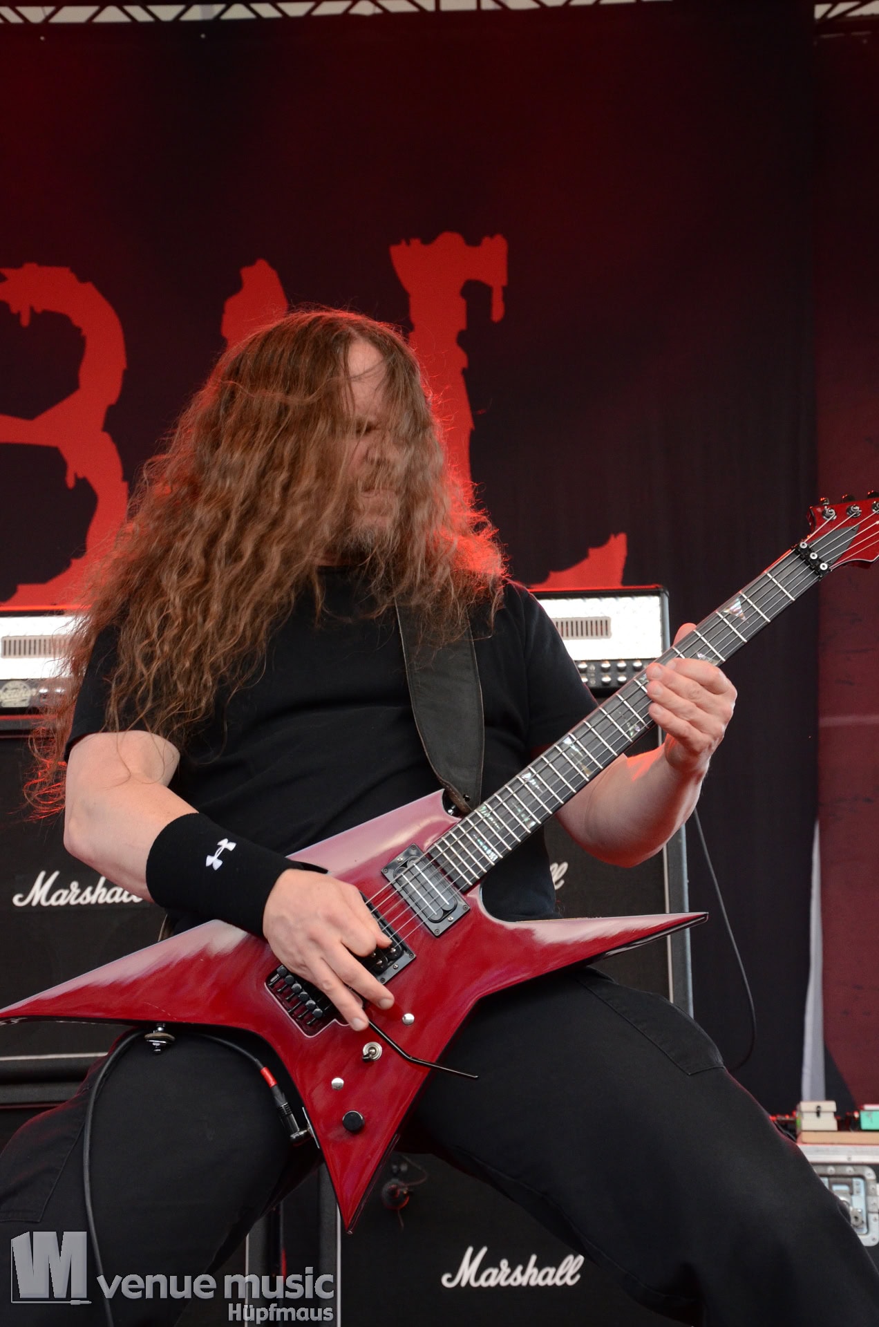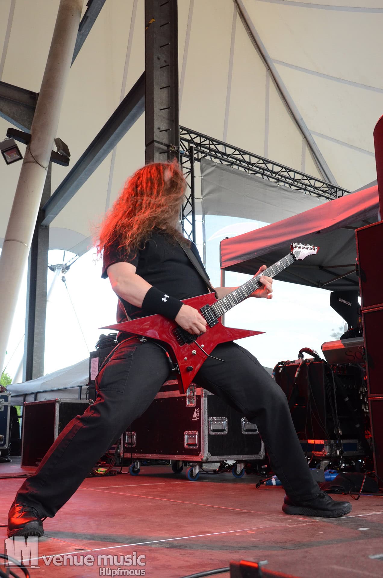 Bereits zu Skid Row hatte der Wind sich so weit gelegt, dass es wieder möglich war die Backdrops der Bands aufzuhängen und so konnte auch Cannibal Corpse ihres nutzen. Allerdings gab es vom ganzen Tag keine Videoaufzeichnung. Für die Fotografen im Graben natürlich schön, aber um im Nachhinein das Ganze noch mal Revue passieren zu lassen schade war. Ebenso für all diejenigen, die nicht kommen konnten, aber wenigstens dann das ganze live auf dem Bildschirm mitverfolgen wollten.