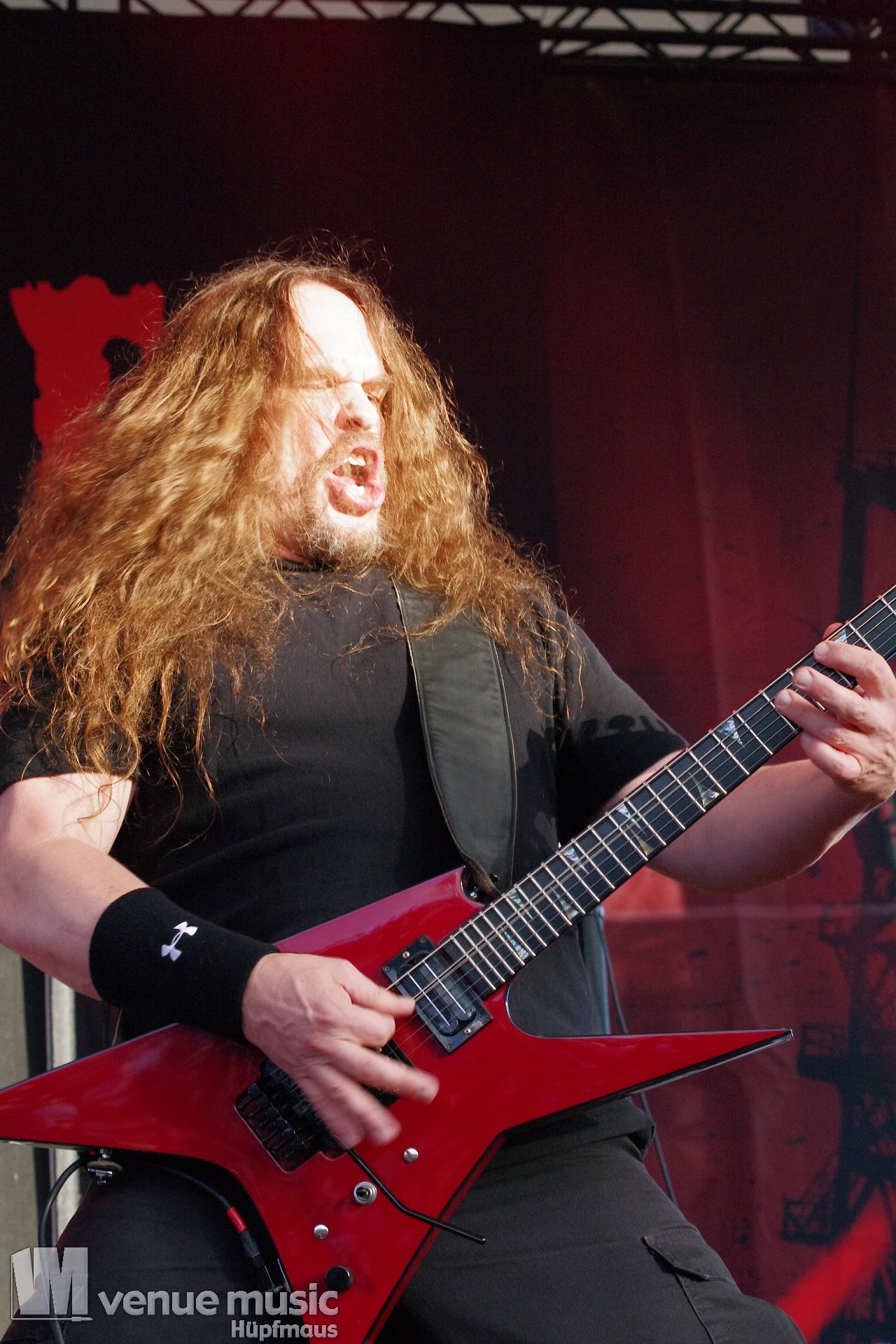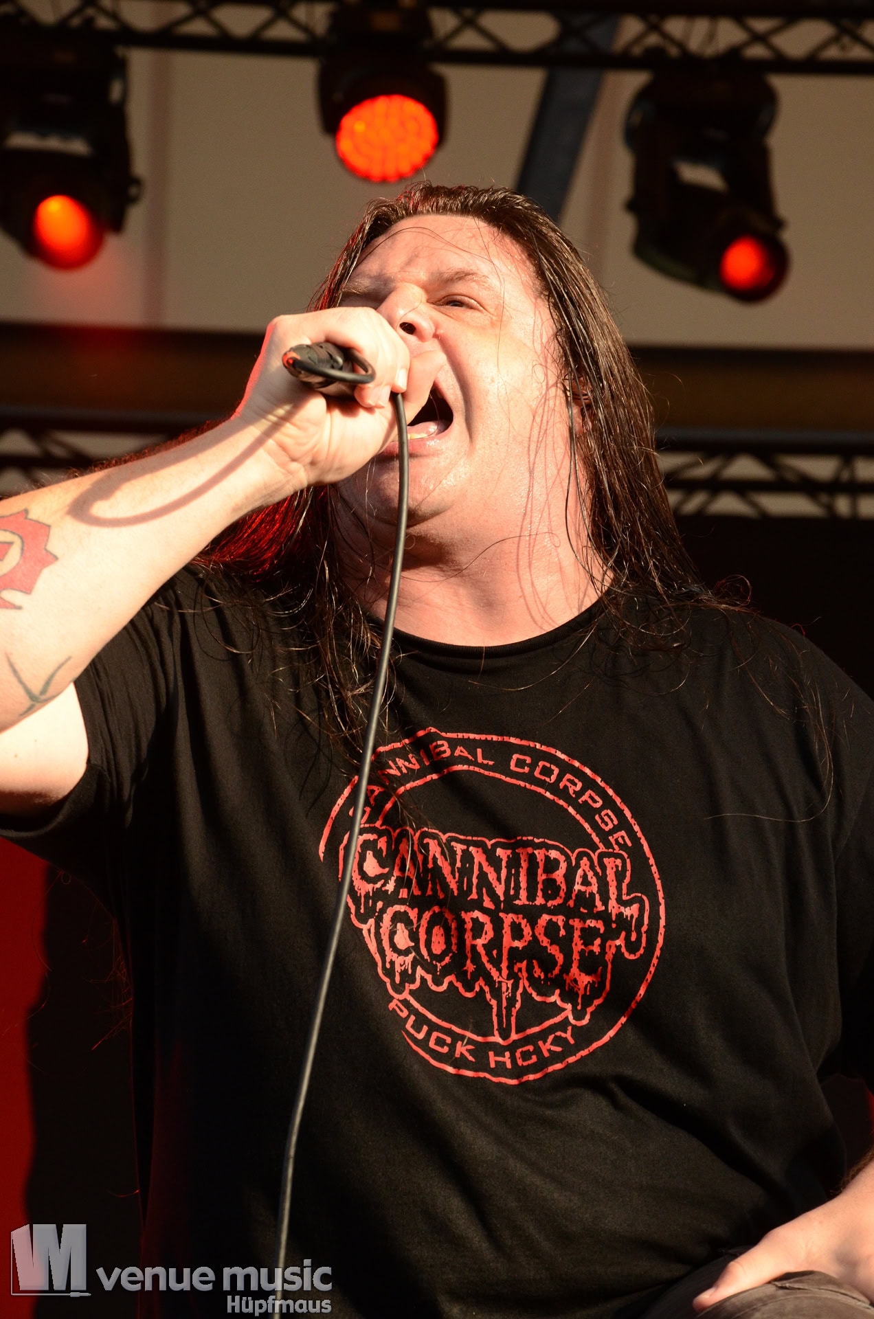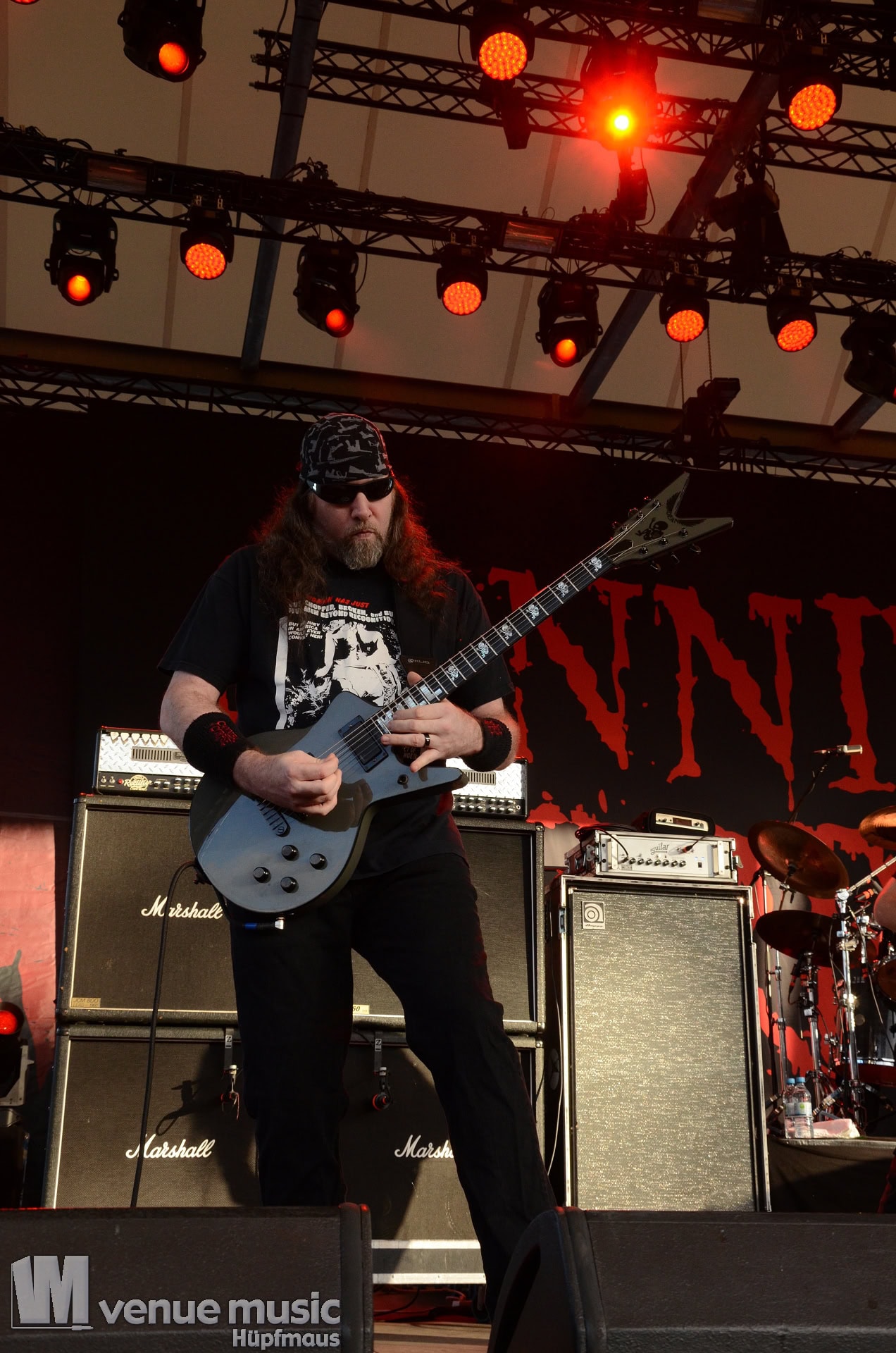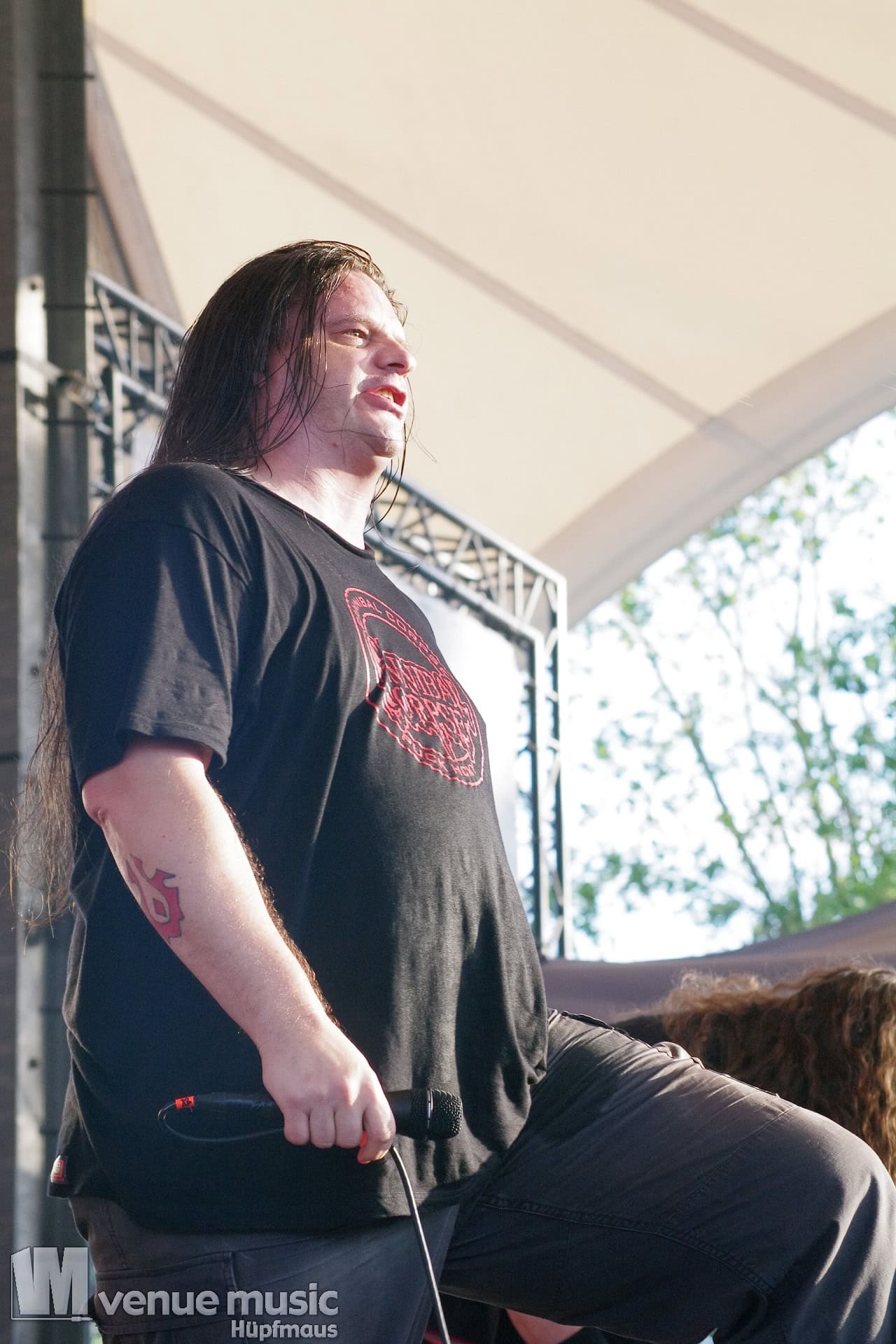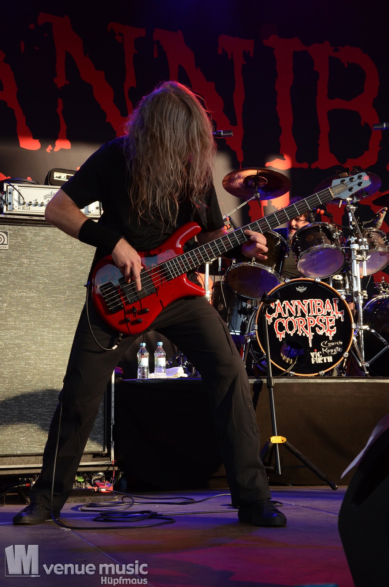 Bereits zu Skid Row hatte der Wind sich so weit gelegt, dass es wieder möglich war die Backdrops der Bands aufzuhängen und so konnte auch Cannibal Corpse ihres nutzen. Allerdings gab es vom ganzen Tag keine Videoaufzeichnung. Für die Fotografen im Graben natürlich schön, aber um im Nachhinein das Ganze noch mal Revue passieren zu lassen schade war. Ebenso für all diejenigen, die nicht kommen konnten, aber wenigstens dann das ganze live auf dem Bildschirm mitverfolgen wollten.