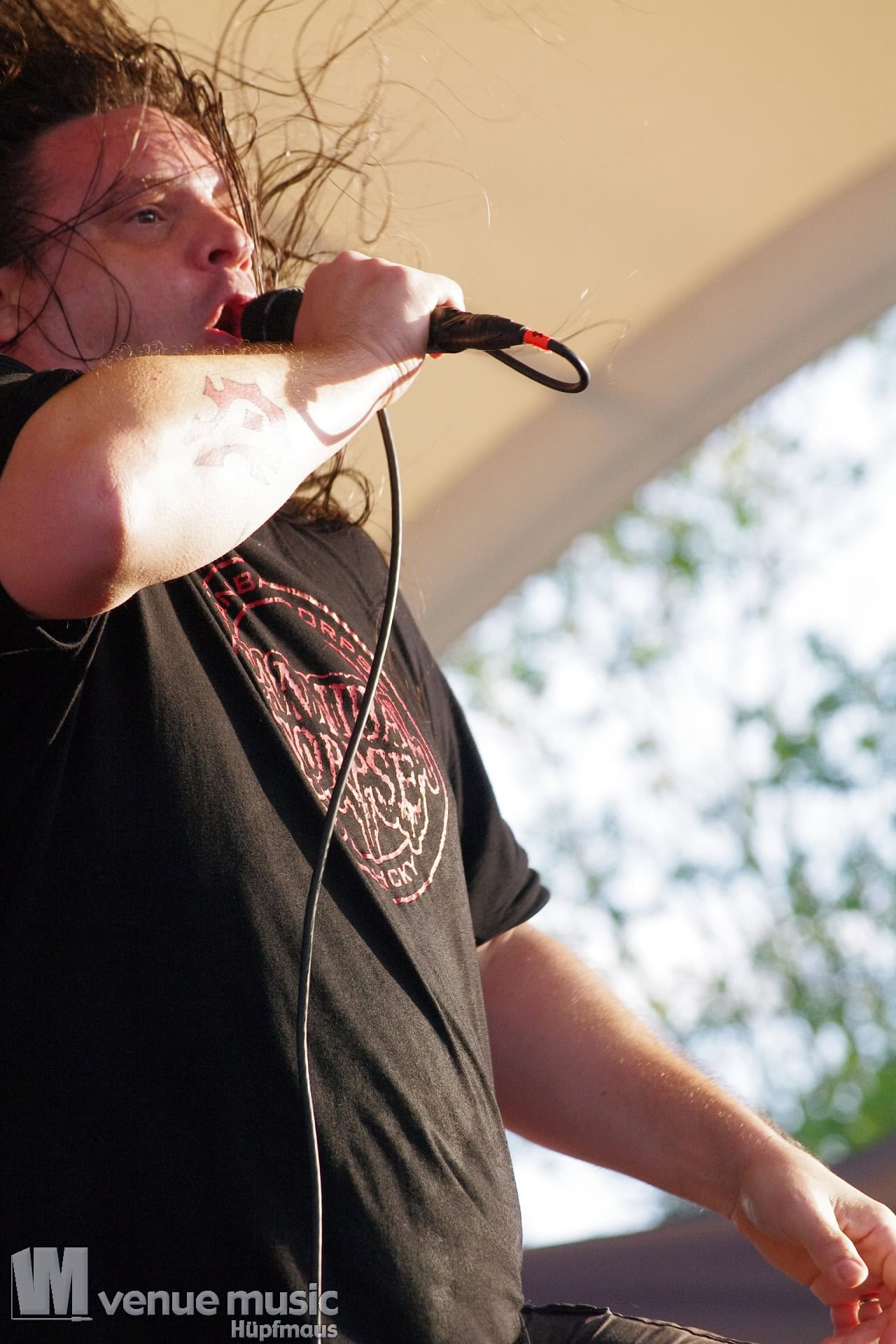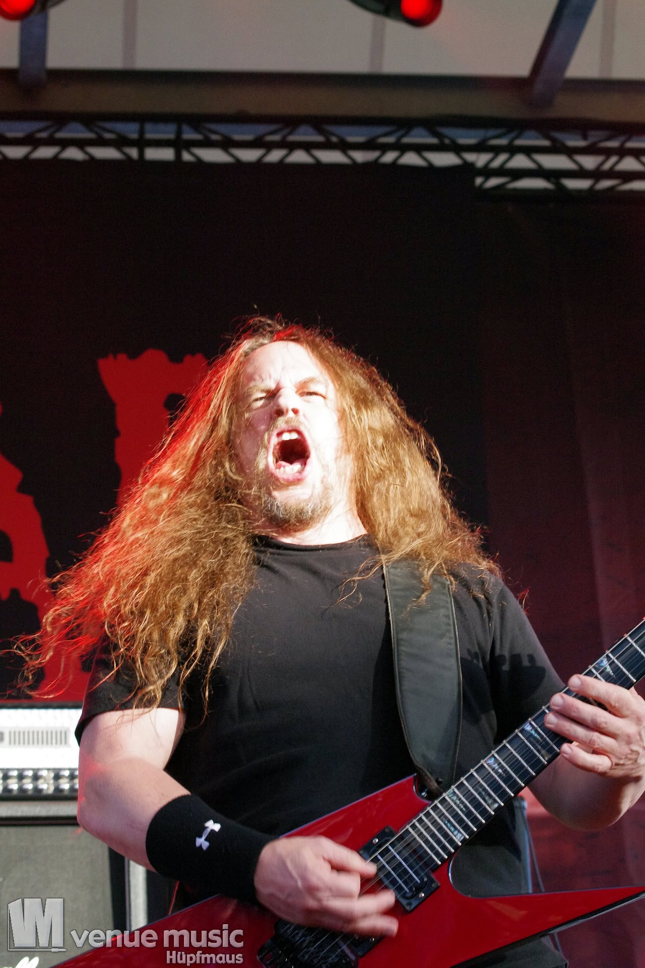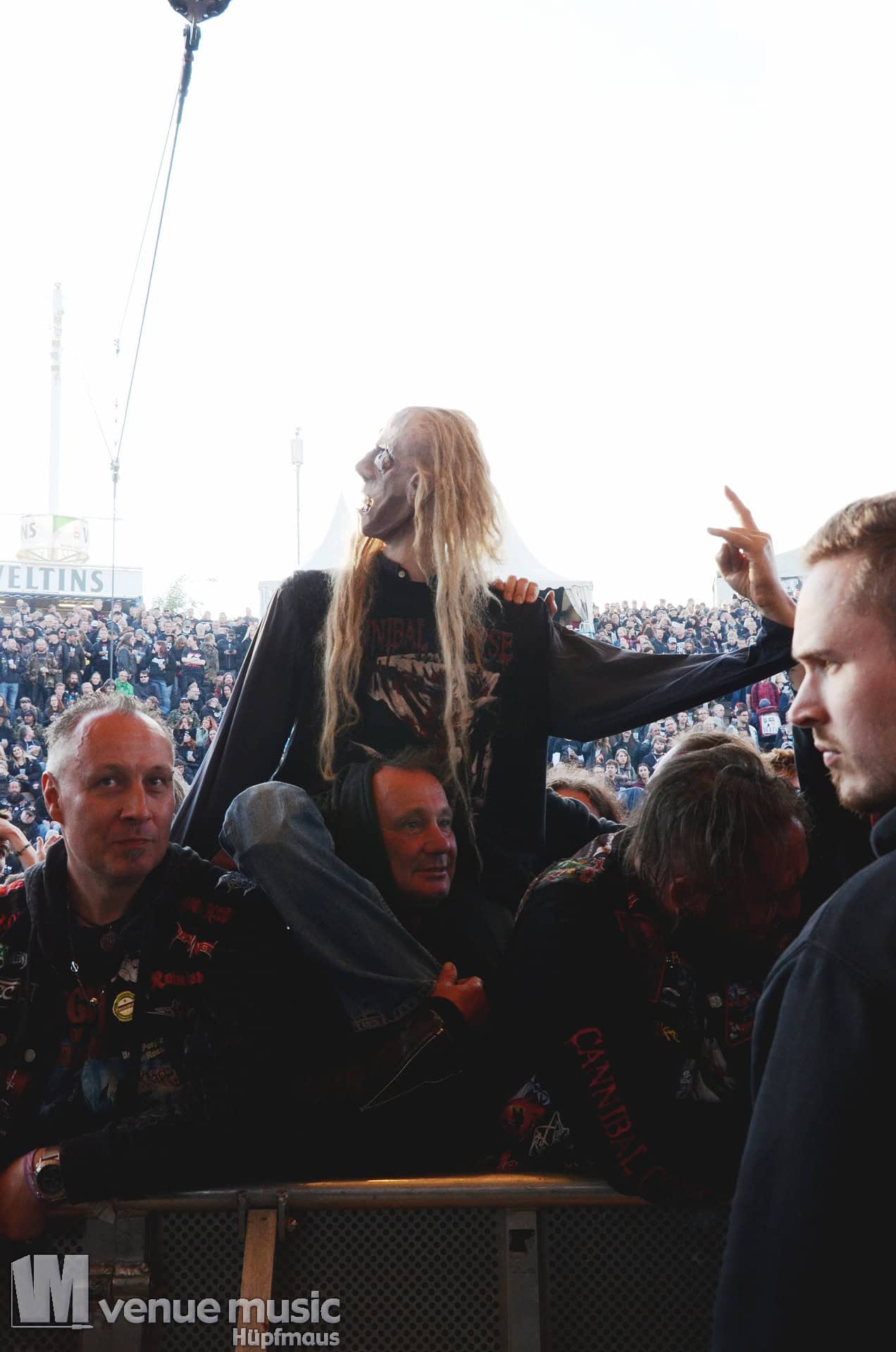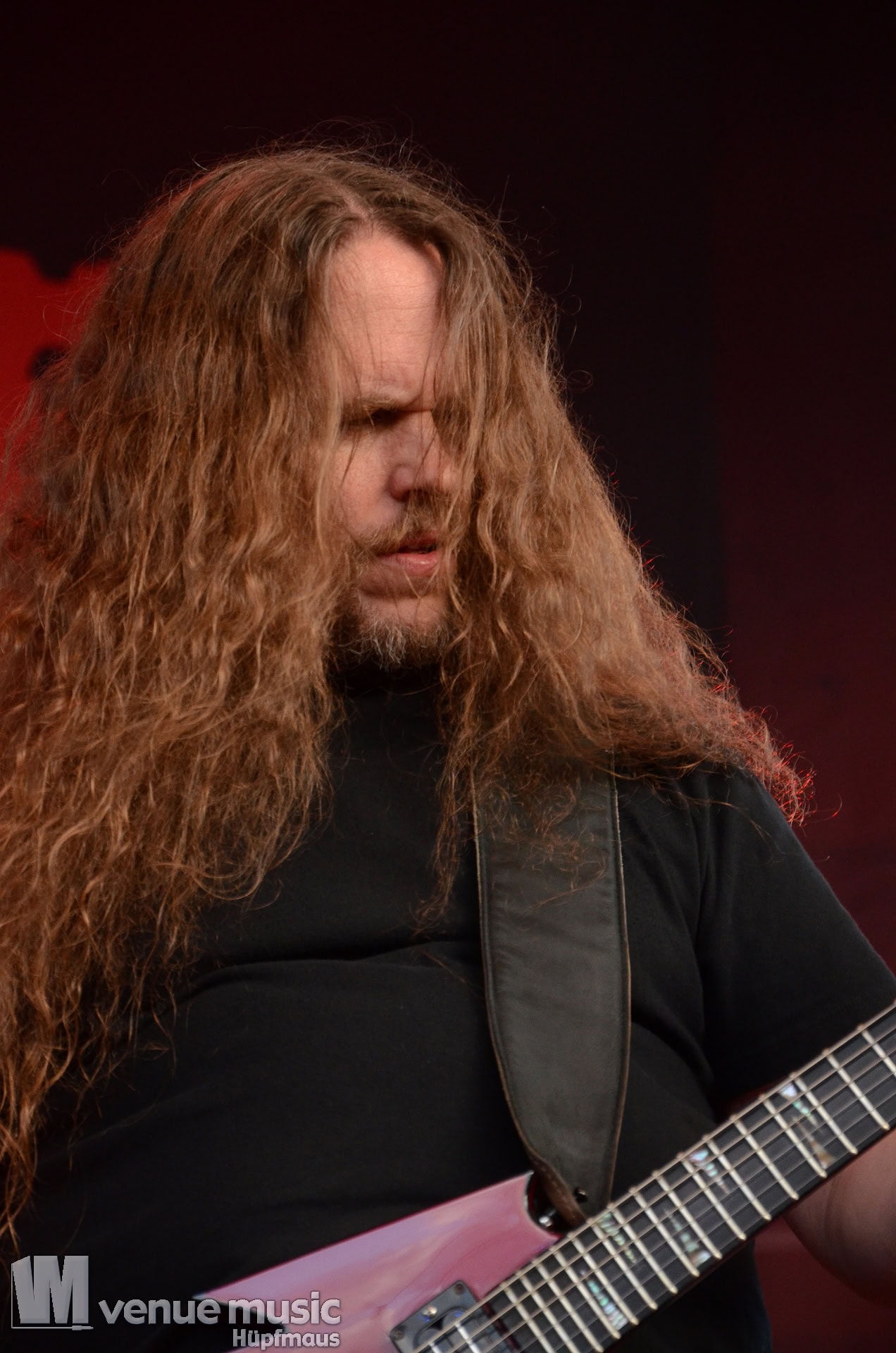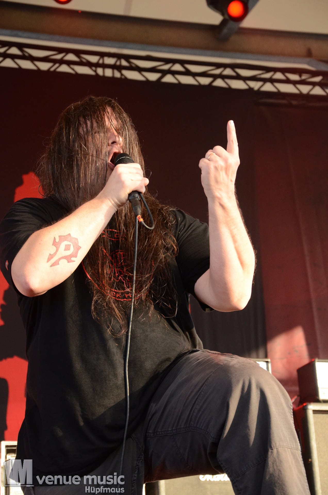 Bereits zu Skid Row hatte der Wind sich so weit gelegt, dass es wieder möglich war die Backdrops der Bands aufzuhängen und so konnte auch Cannibal Corpse ihres nutzen. Allerdings gab es vom ganzen Tag keine Videoaufzeichnung. Für die Fotografen im Graben natürlich schön, aber um im Nachhinein das Ganze noch mal Revue passieren zu lassen schade war. Ebenso für all diejenigen, die nicht kommen konnten, aber wenigstens dann das ganze live auf dem Bildschirm mitverfolgen wollten.