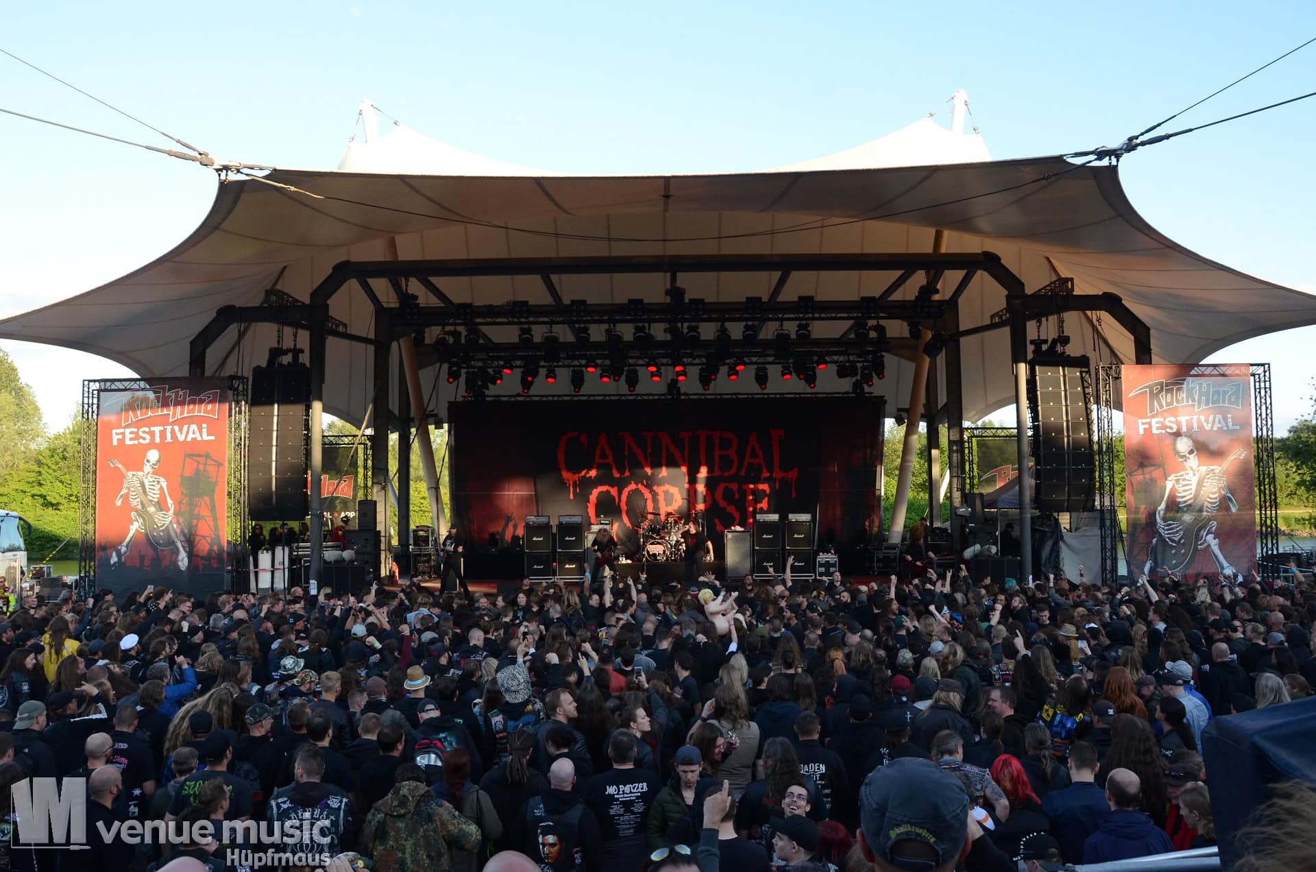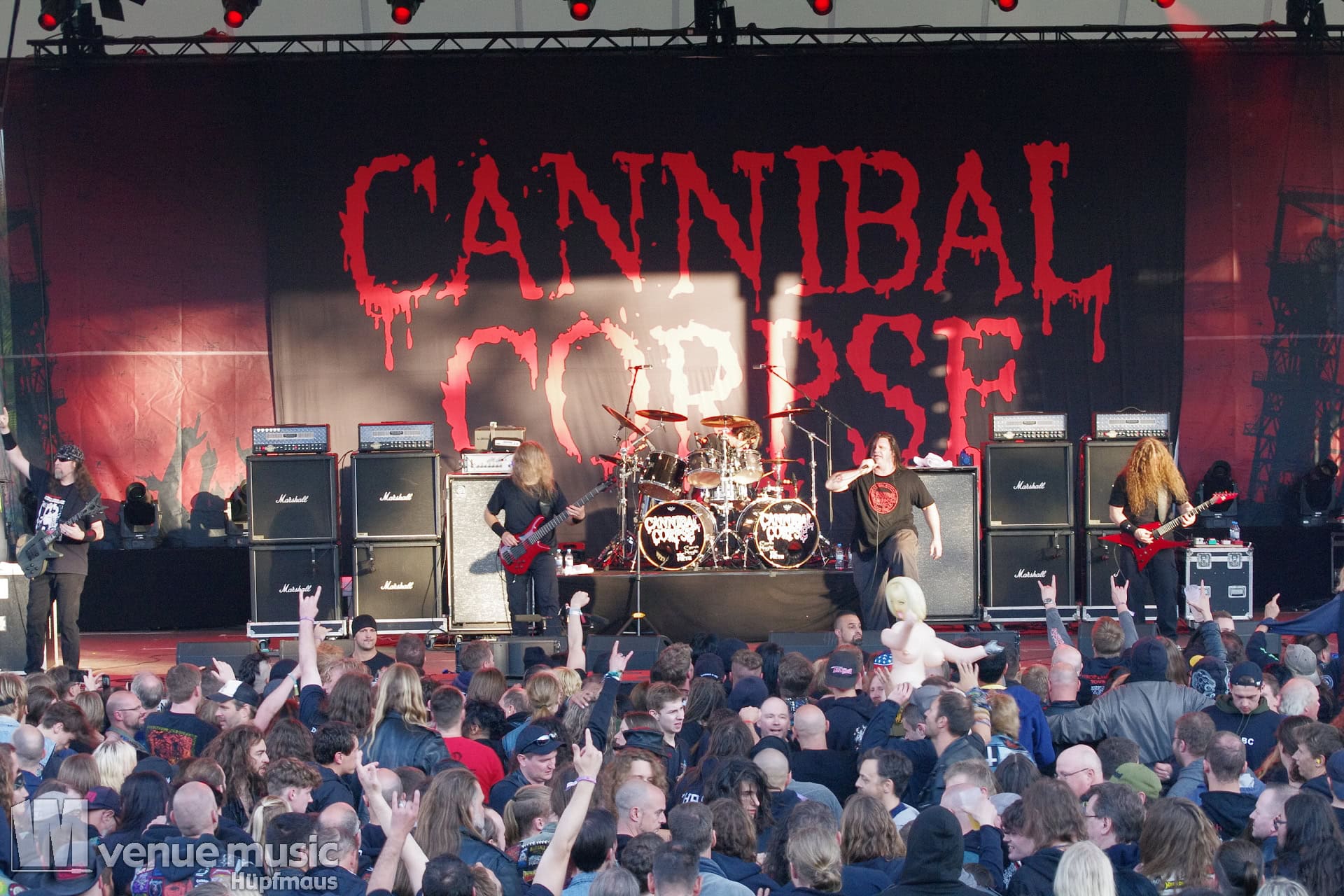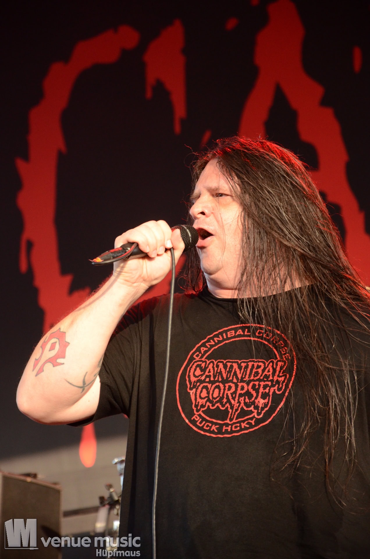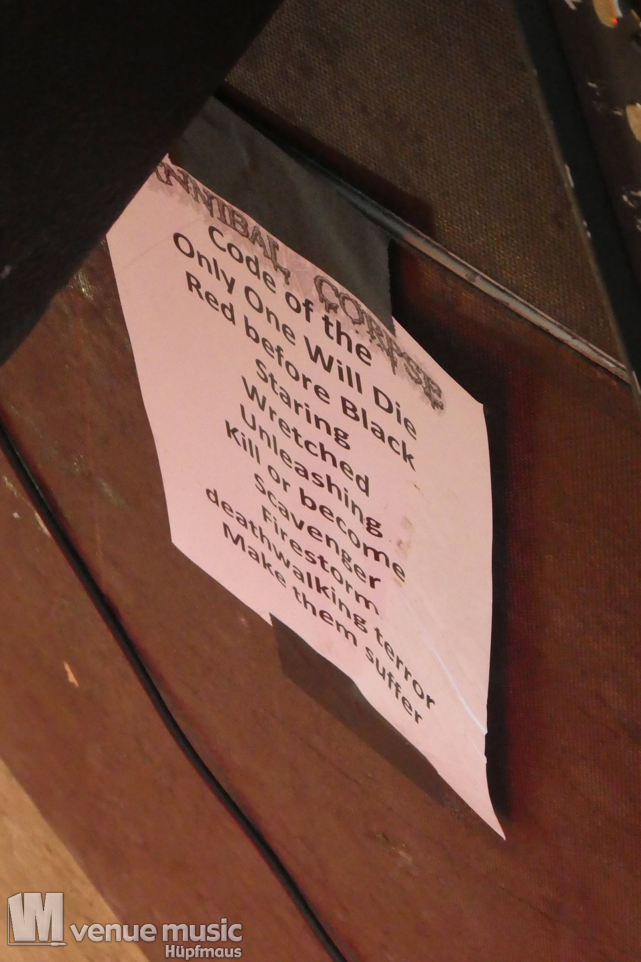 Bereits zu Skid Row hatte der Wind sich so weit gelegt, dass es wieder möglich war die Backdrops der Bands aufzuhängen und so konnte auch Cannibal Corpse ihres nutzen. Allerdings gab es vom ganzen Tag keine Videoaufzeichnung. Für die Fotografen im Graben natürlich schön, aber um im Nachhinein das Ganze noch mal Revue passieren zu lassen schade war. Ebenso für all diejenigen, die nicht kommen konnten, aber wenigstens dann das ganze live auf dem Bildschirm mitverfolgen wollten.