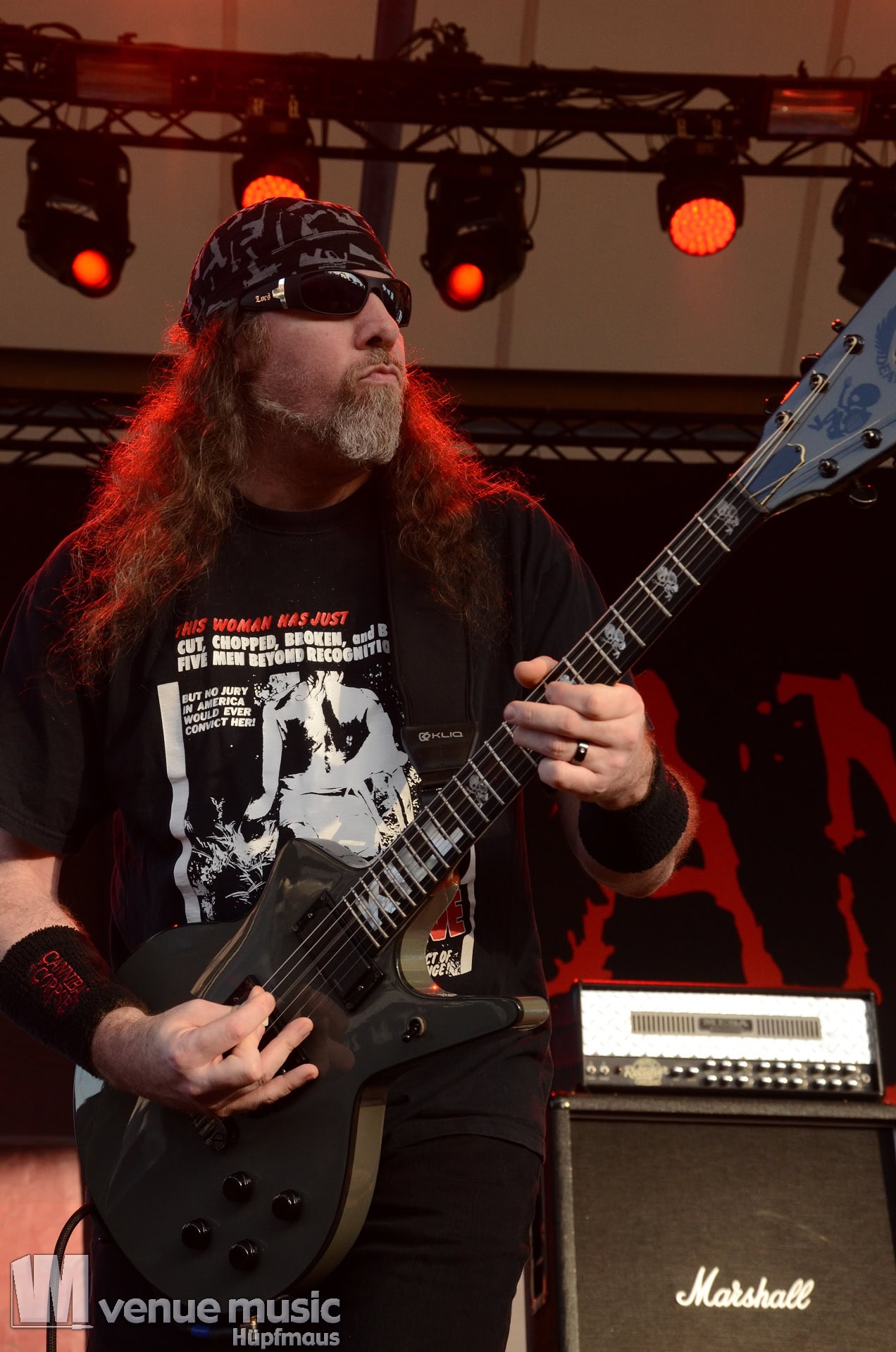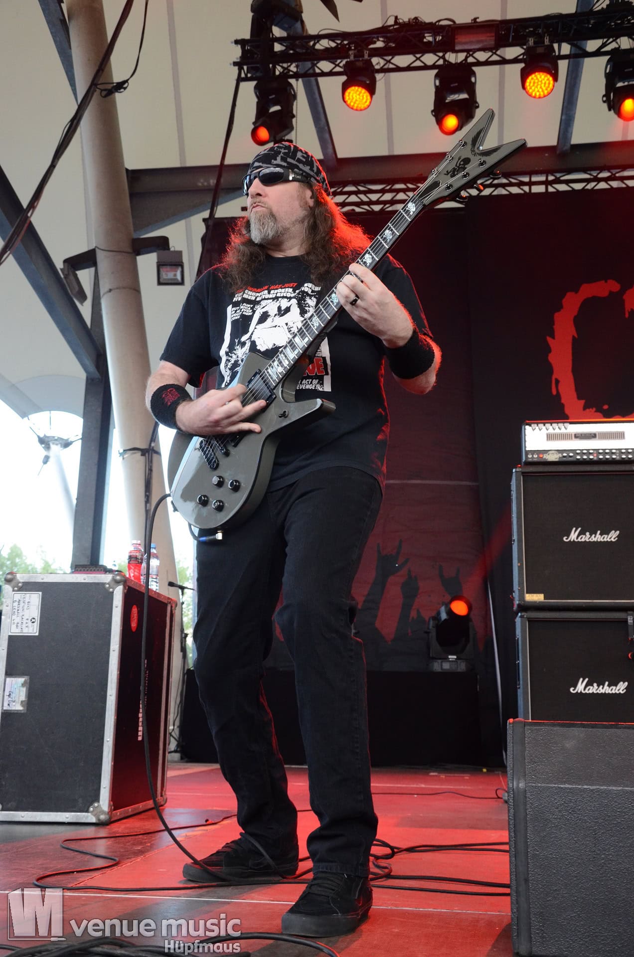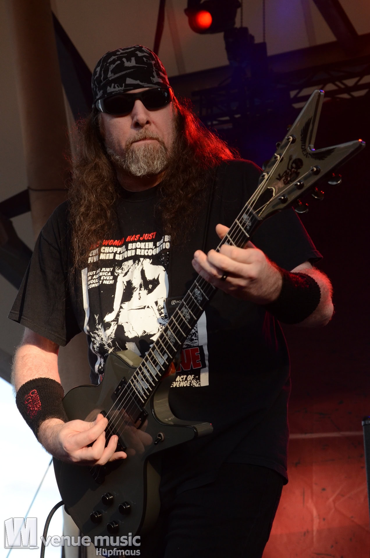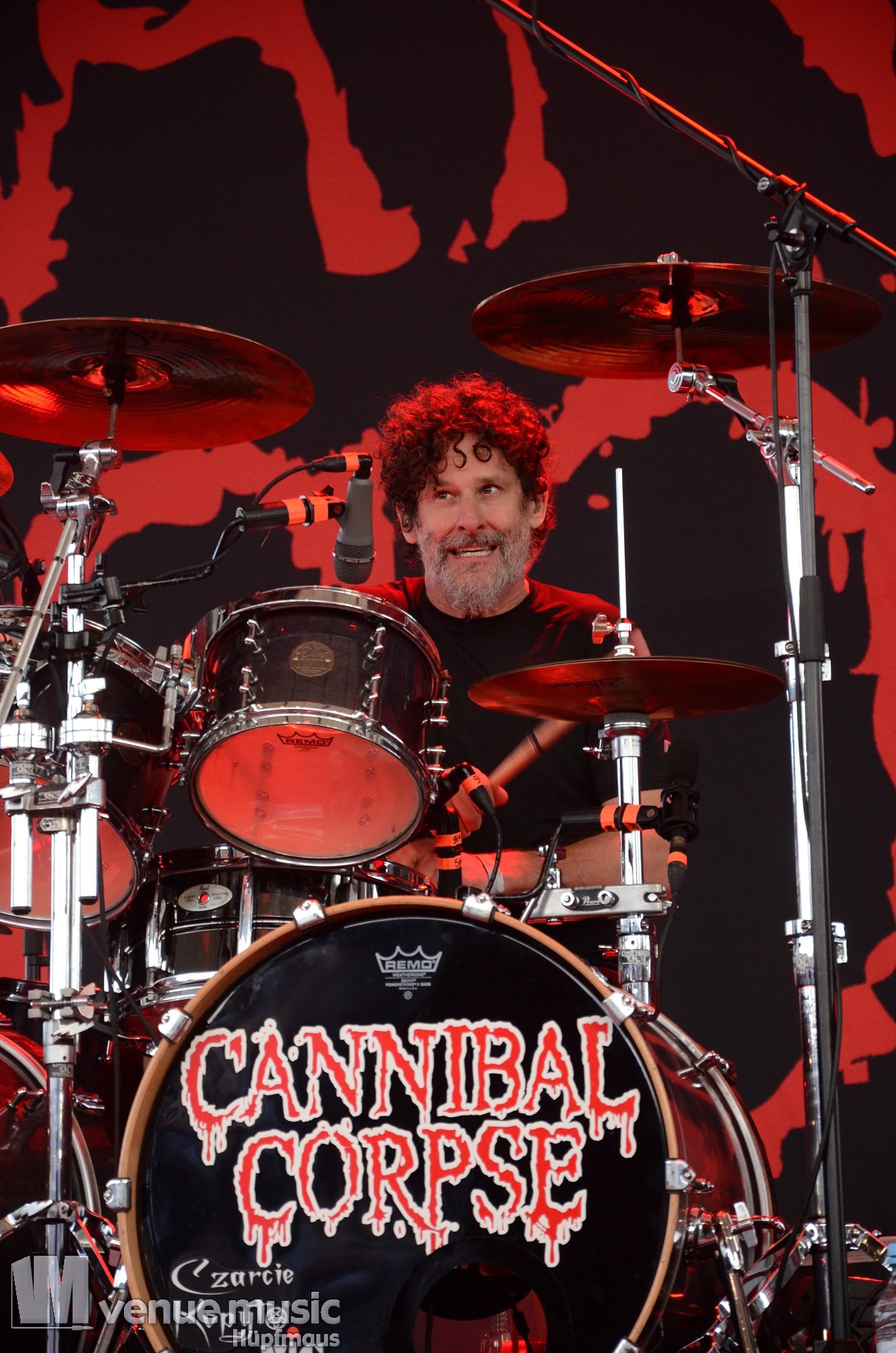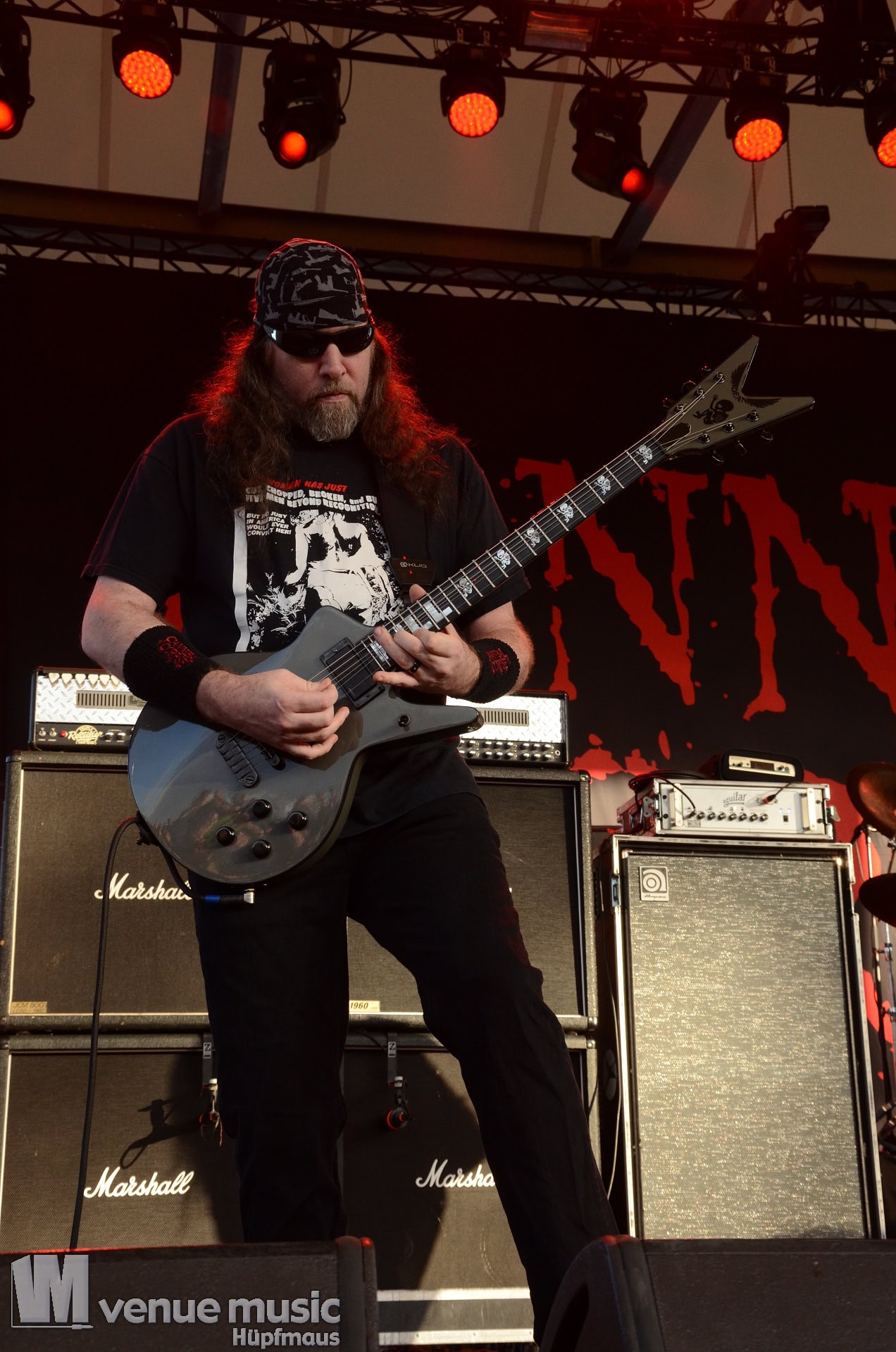 Bereits zu Skid Row hatte der Wind sich so weit gelegt, dass es wieder möglich war die Backdrops der Bands aufzuhängen und so konnte auch Cannibal Corpse ihres nutzen. Allerdings gab es vom ganzen Tag keine Videoaufzeichnung. Für die Fotografen im Graben natürlich schön, aber um im Nachhinein das Ganze noch mal Revue passieren zu lassen schade war. Ebenso für all diejenigen, die nicht kommen konnten, aber wenigstens dann das ganze live auf dem Bildschirm mitverfolgen wollten.
