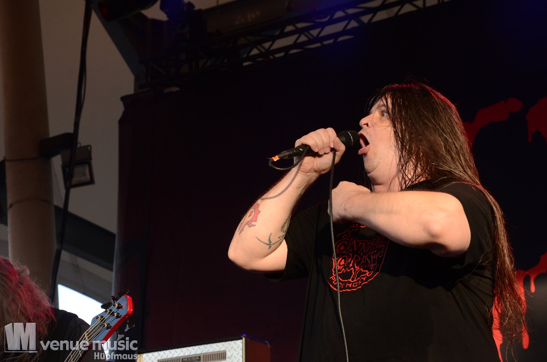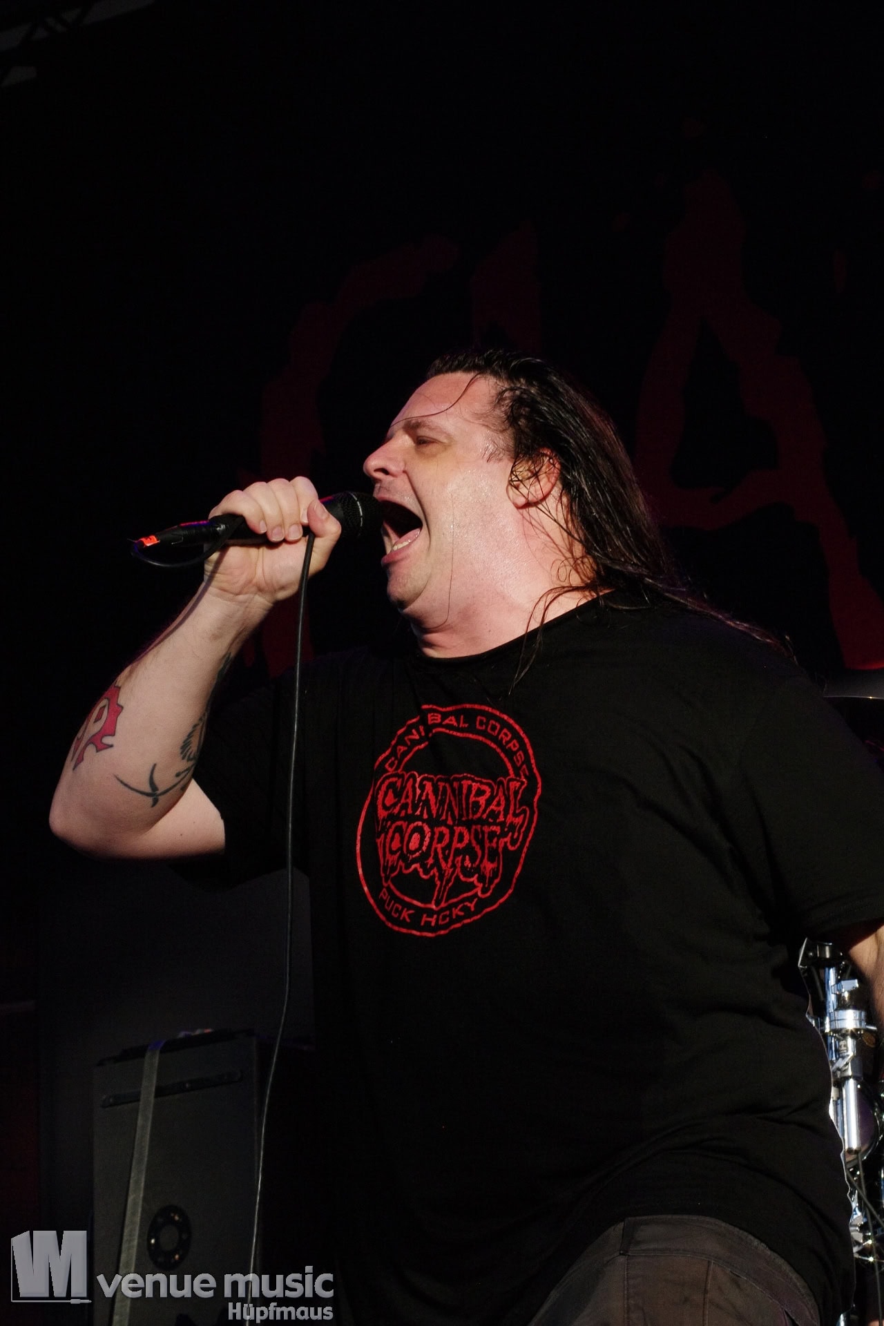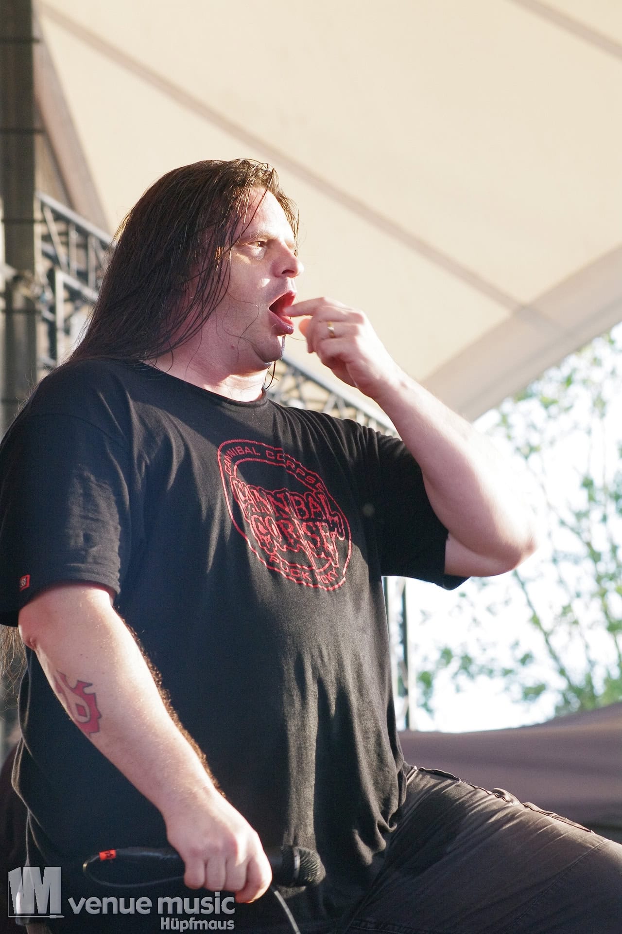 Cannibal Corpse sorgen ja immer mal wieder bei den Behörden für Aufsehen bzw. werden ihre Coverartworks oder Songs zensiert bzw. auf den Index gesetzt. Auch für das Rock Hard Festival galten für die Band besondere Regeln, denn die Stadt Gelsenkirchen hatte per Ordnungsverfügung das Spielen von insgesamt 6 Songs untersagt („Evisceration Plague“, „Gutted“, „Devored by Vermin“, „A Skull full of Maggots“, „Stripped, Raped & Strangled“, sowie „I cum Blood“). Diese standen dann auch ganz brav nicht auf der Setlist. Aber mal ehrlich: hätten die Aufpasser der Stadt die Songs überhaupt erkannt? Und wer – es sei denn, man hat sich die Texte vorher durchgelesen – hätte irgendwas vom Text erkennen können und wäre dadurch „gefährdet“ gewesen? Aber nun gut… es wird sich schon jemand was dabei gedacht haben.. oder so..