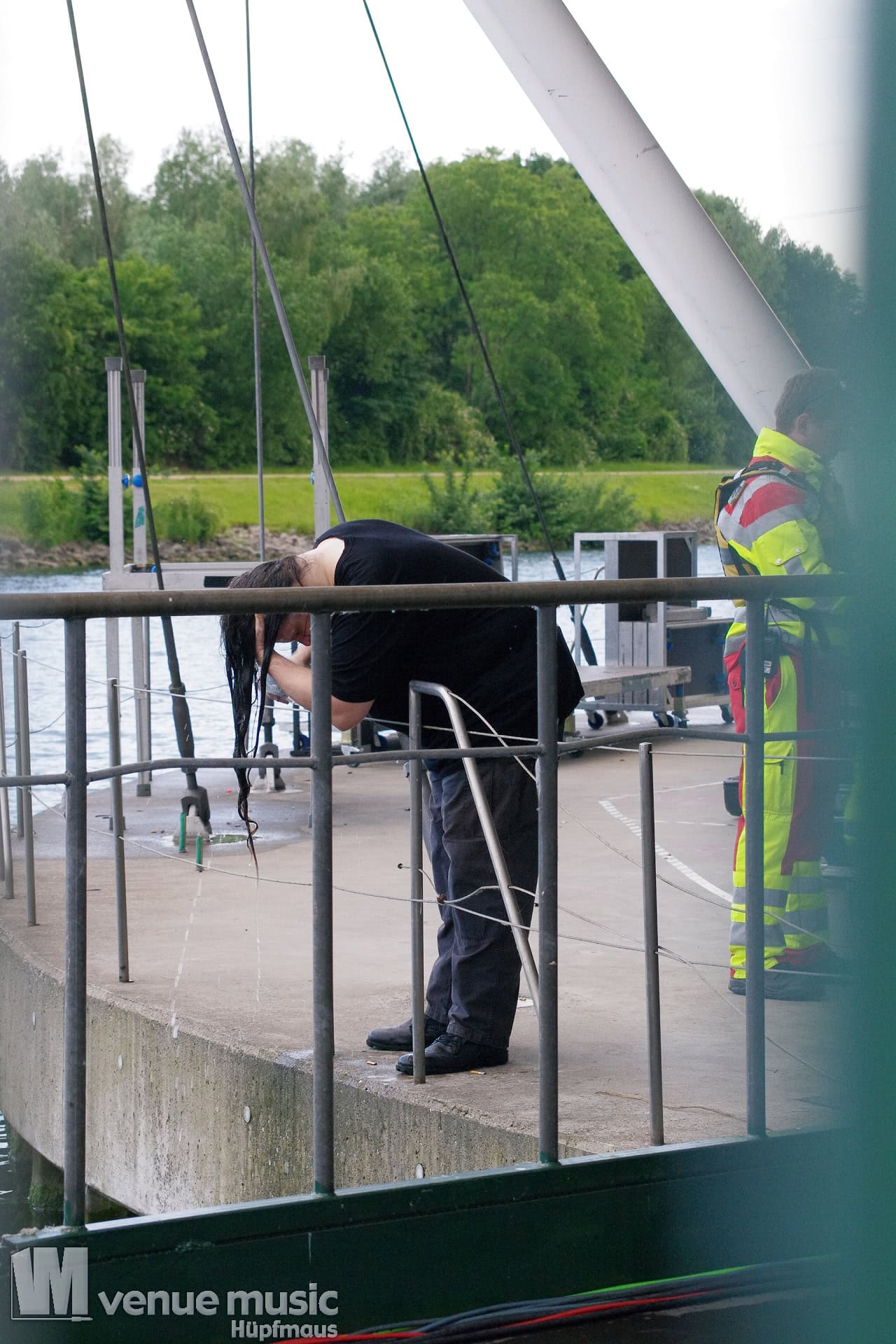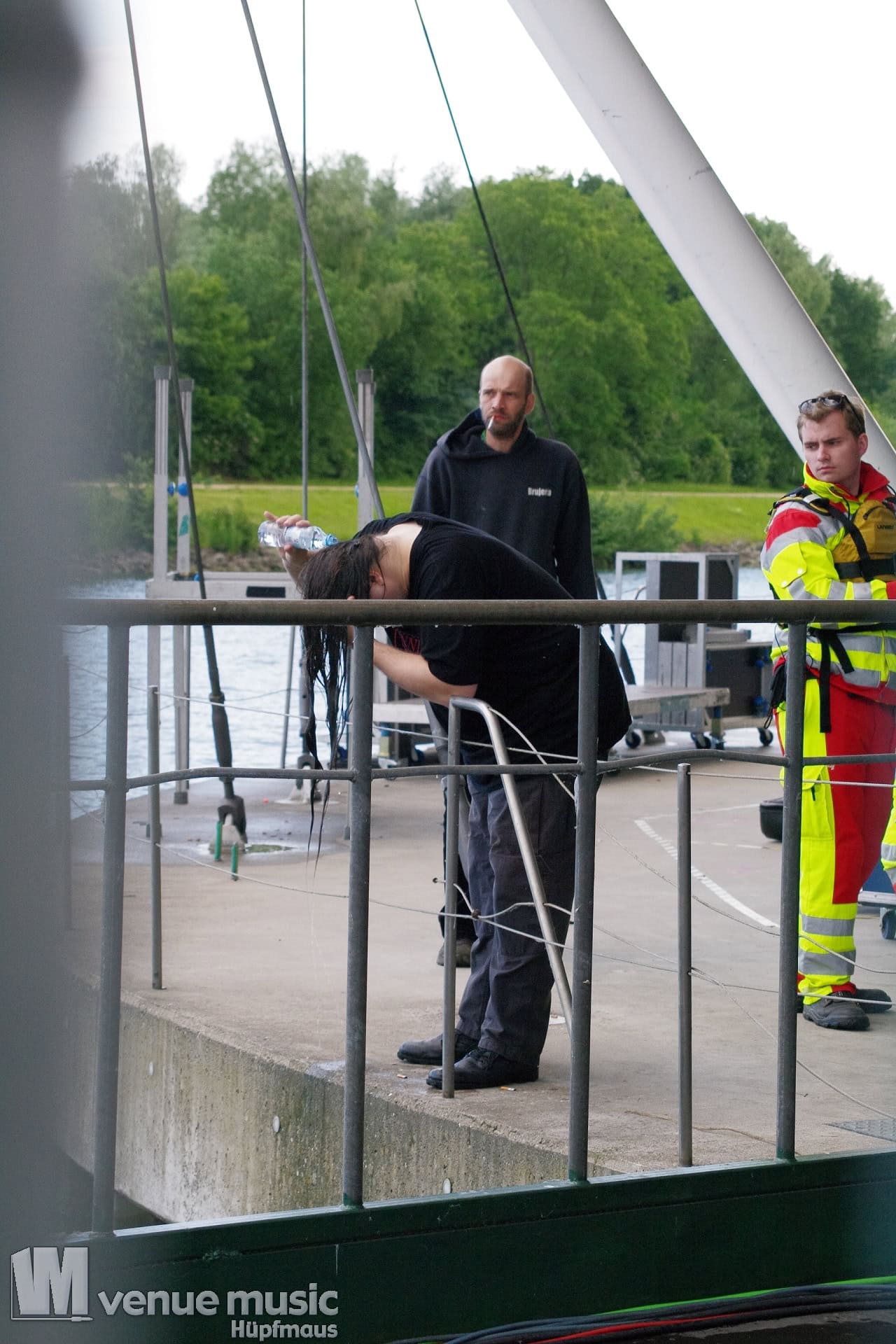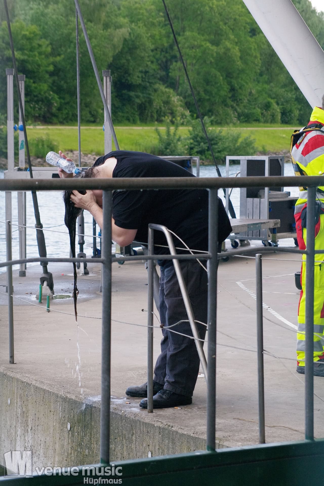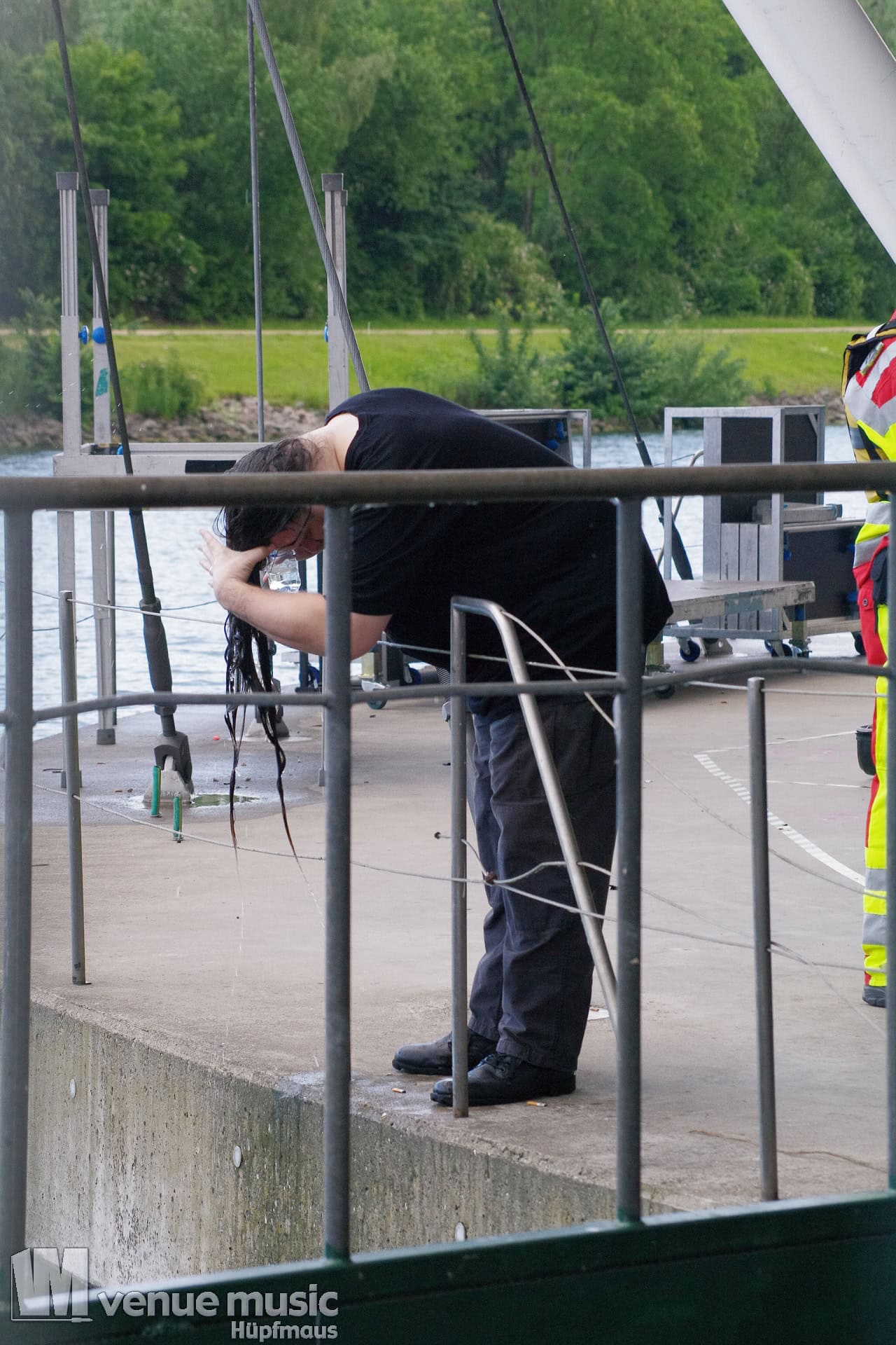 Vor dem Auftritt hat sich der Corpsegrinder noch mal „chick“ gemacht. Was bei ihm heißt: ne pulle Wasser über den Kopf gießen ;) bangt sich dann besser. Und wer will abstreiten, dass er der Meister des Helikopterbanges ist? Vor einem Wettstreit mit seinen Fans schreckt er auch nie zurück.