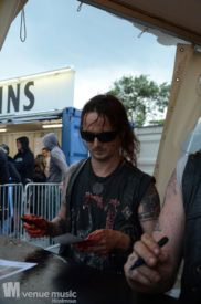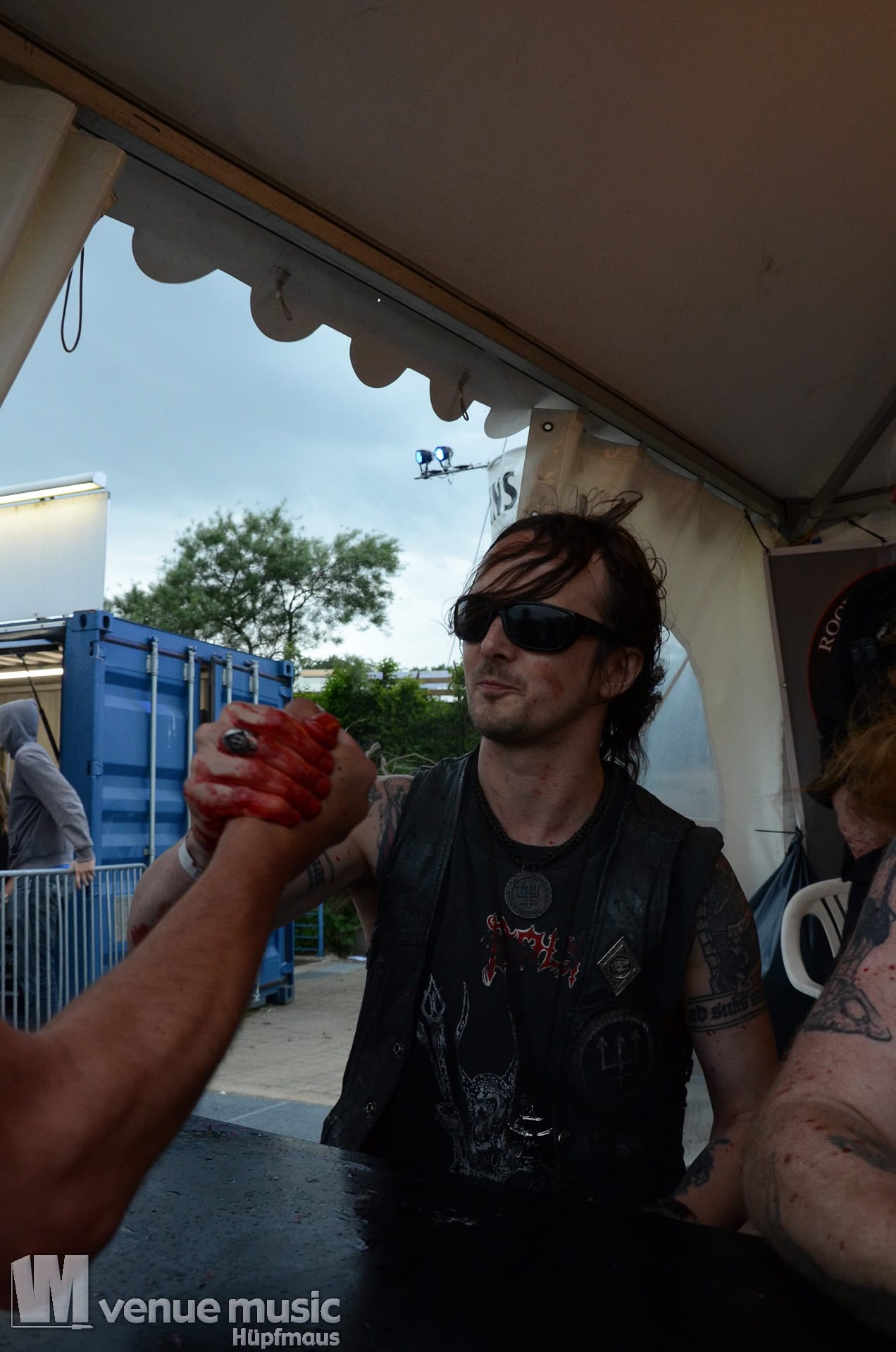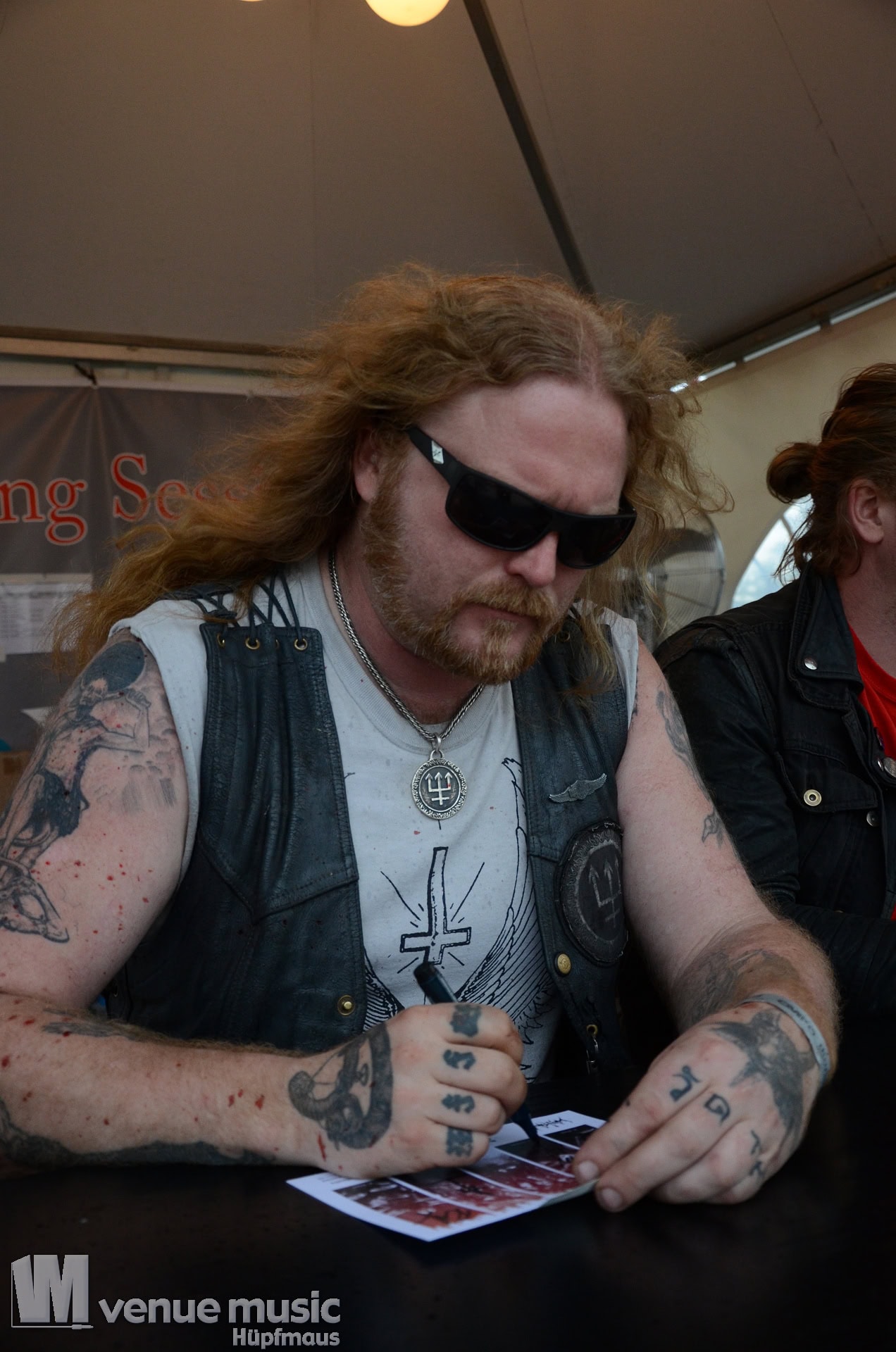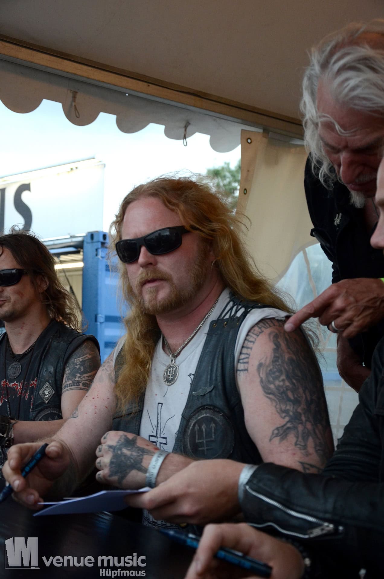 Am ersten Tag des Rock Hard Festivals 2019 haben Vulture, Watain, The Idiots, Tygers of Pan Tang und Lizzy Borden fleissig für ihre Fans Autogramme gegeben und Fotos gemacht. Lediglich Chapel of Disease hatten keine Signing Session. Während es bei Lizzy Borden schon recht dunkel wurde, standen Watain bereits nachmittags für Autogramme bereit. Allerdings musste man da aufpassen, dass nicht alles, was man dabei hatte, eingesaut wurde. Denn Sänger Erik Danielsson gab mindestens jeder Autogrammkarte eine eigene „Note“ – mit individuell aufgesprenkeltem Kunstblut. Und somit wurde auch der ganze Tisch und dadurch auch viele Plattencover, die die Fans zum unterschreiben dabei hatten mit verziert… Einerseits mal eine etwas andere Autogrammkarte (die brauchte aber ewig zum Trocknen…), aber insgesamt vielleicht keine sooo gute Idee…