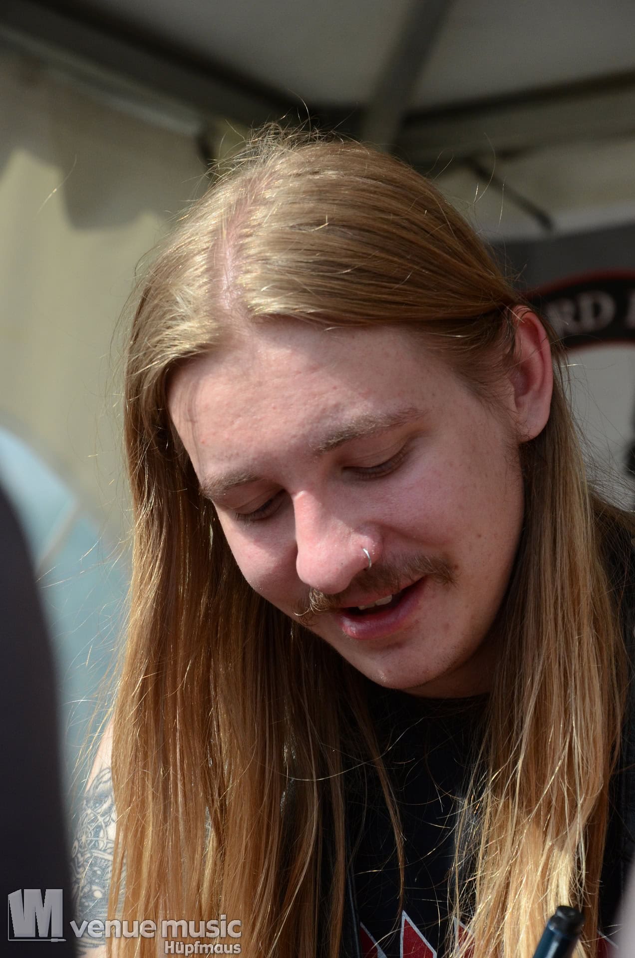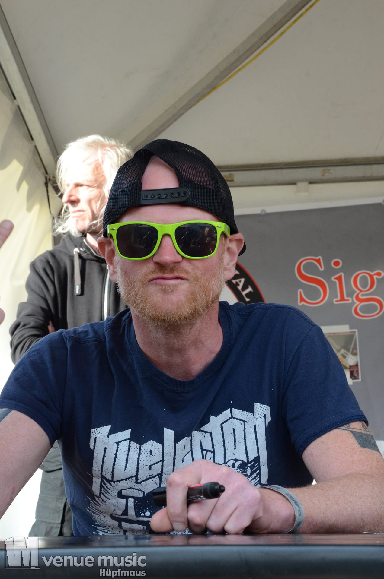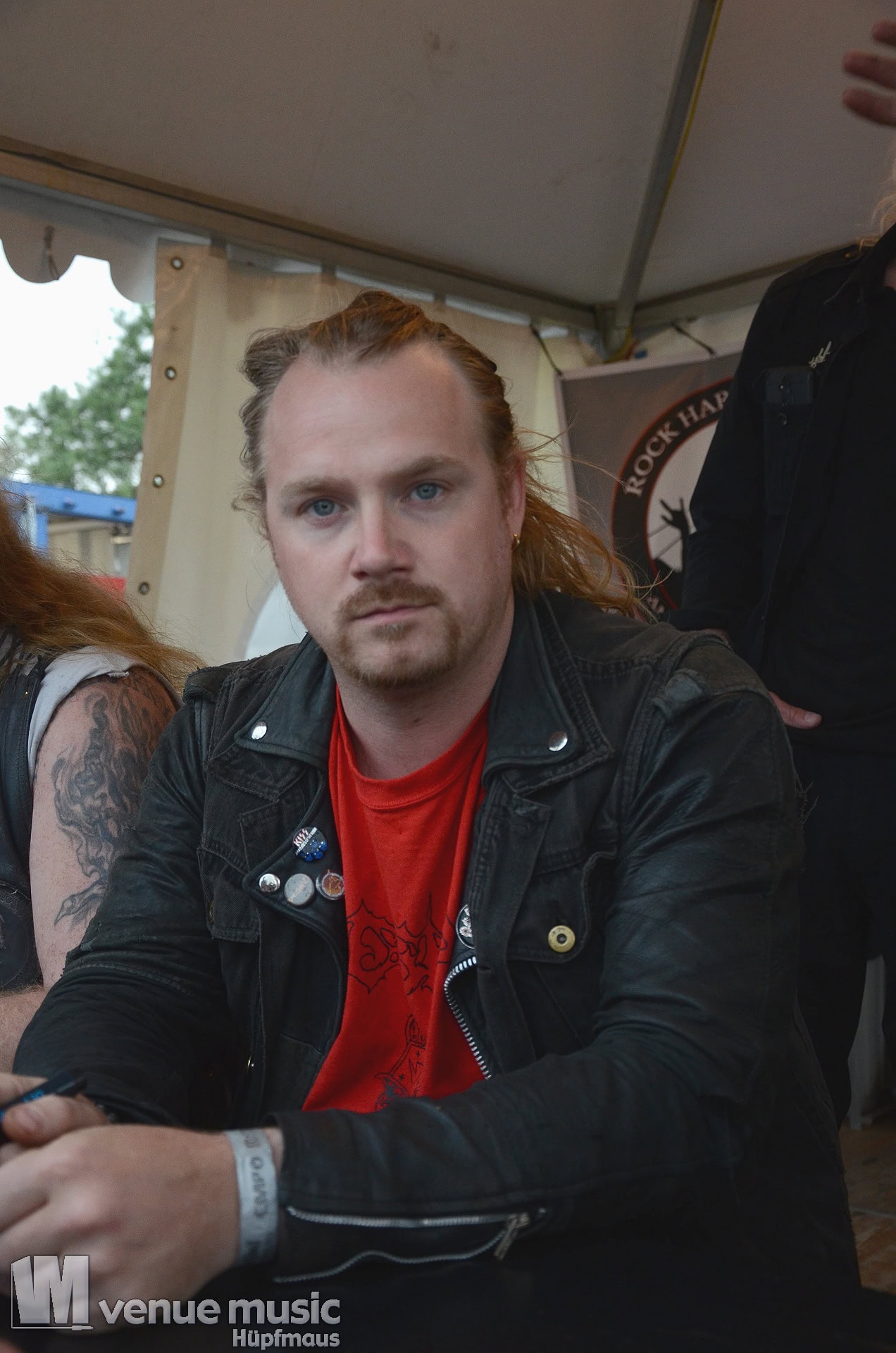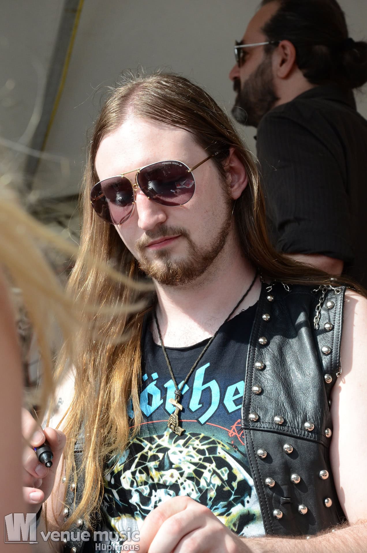 Am ersten Tag des Rock Hard Festivals 2019 haben Vulture, Watain, The Idiots, Tygers of Pan Tang und Lizzy Borden fleissig für ihre Fans Autogramme gegeben und Fotos gemacht. Lediglich Chapel of Disease hatten keine Signing Session. Während es bei Lizzy Borden schon recht dunkel wurde, standen Watain bereits nachmittags für Autogramme bereit. Allerdings musste man da aufpassen, dass nicht alles, was man dabei hatte, eingesaut wurde. Denn Sänger Erik Danielsson gab mindestens jeder Autogrammkarte eine eigene „Note“ – mit individuell aufgesprenkeltem Kunstblut. Und somit wurde auch der ganze Tisch und dadurch auch viele Plattencover, die die Fans zum unterschreiben dabei hatten mit verziert… Einerseits mal eine etwas andere Autogrammkarte (die brauchte aber ewig zum Trocknen…), aber insgesamt vielleicht keine sooo gute Idee…