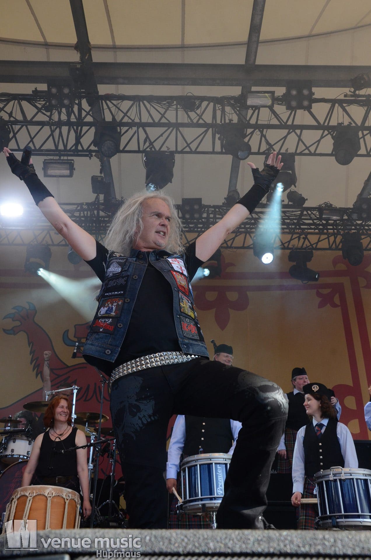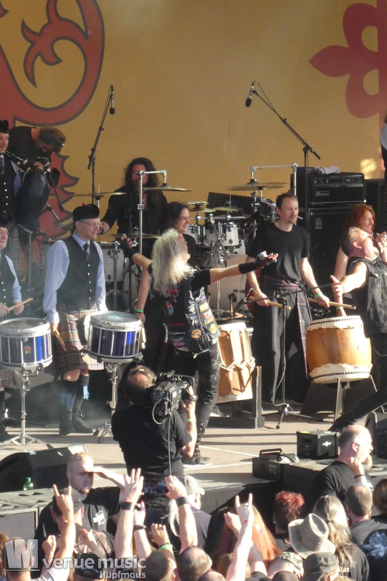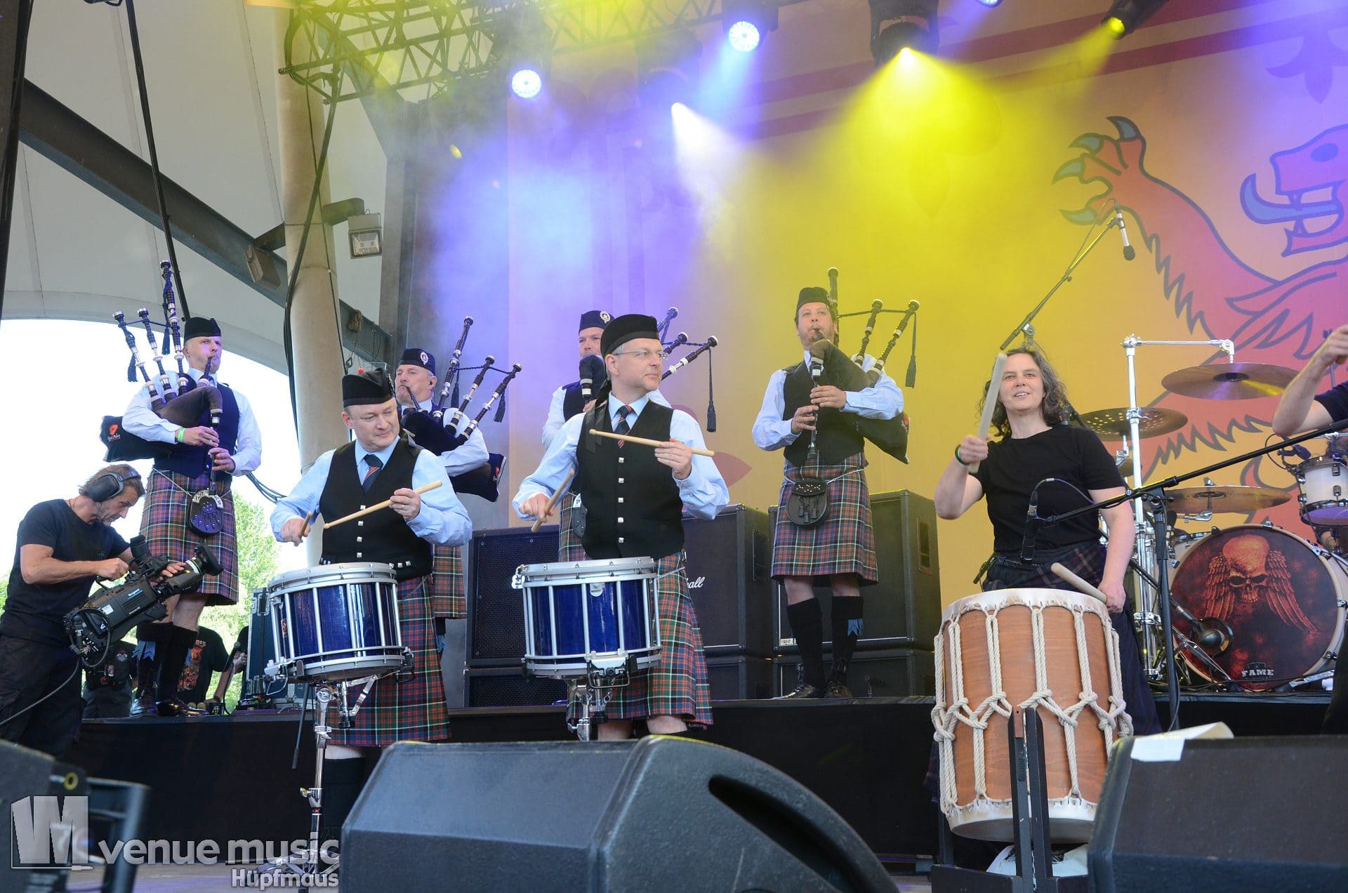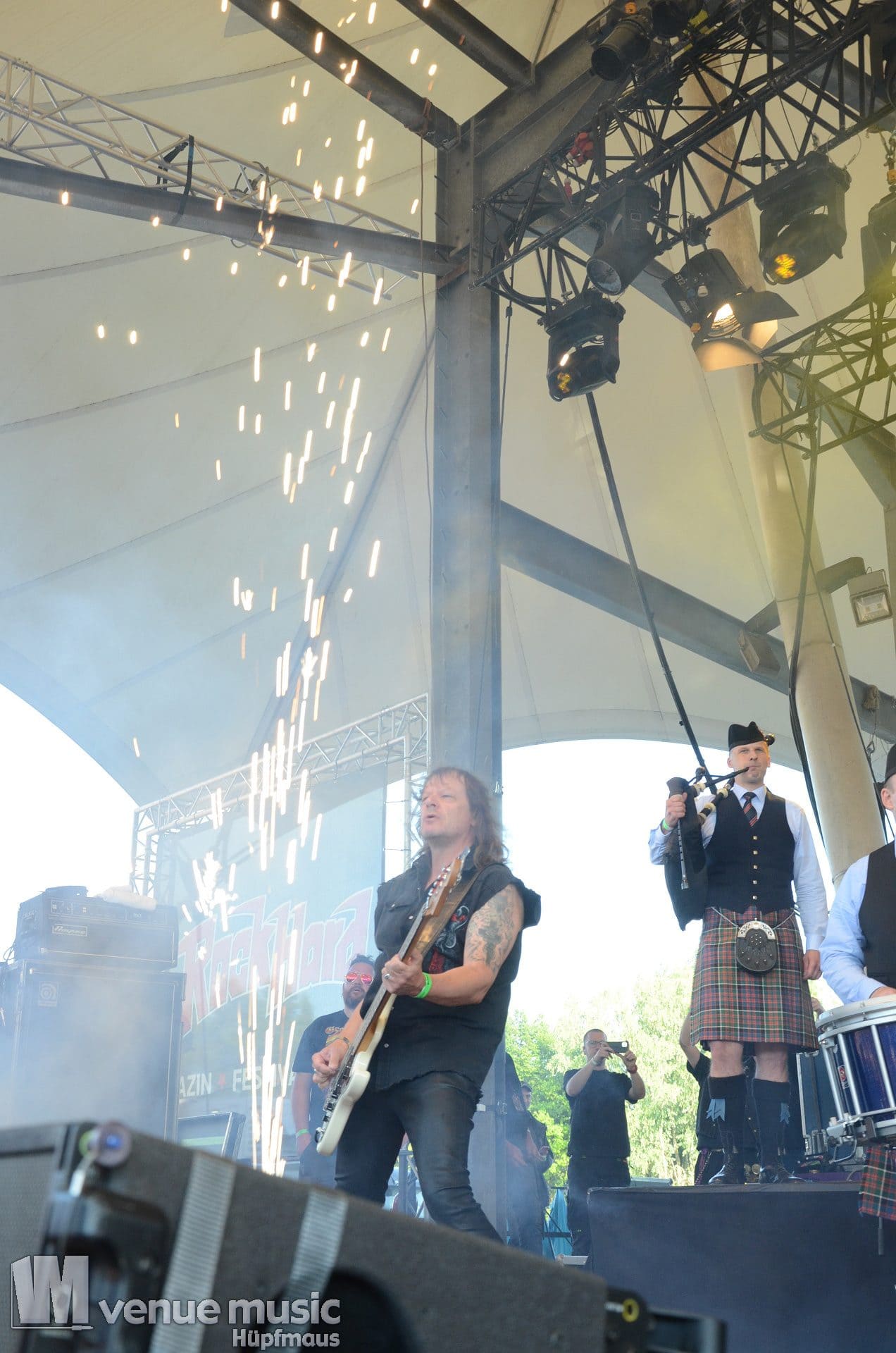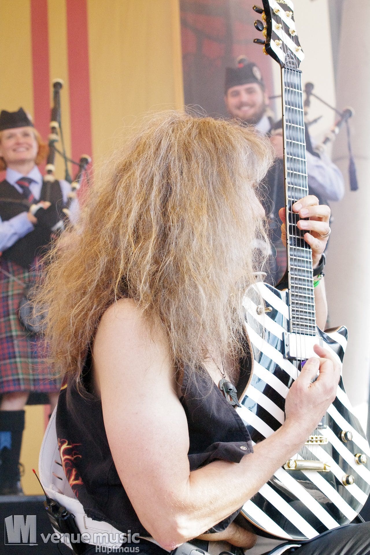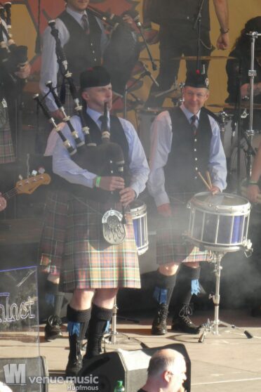 Bei Grave Digger wurde es voll auf der Bühne, hatten sie sich doch Unterstützung mit Baul Muluy Pipes & Drums mitgebracht. Für den Song „Rebellion“ ja quasi Pflicht, aber natürlich kamen die Musiker noch bei Titeln wie ‚The Clans Will Rise Again‘, ‚The Ballad Of Mary‘, ‚The Heart Of Scotland‘ oder ‚Highland Farewell‘ zum Zuge.