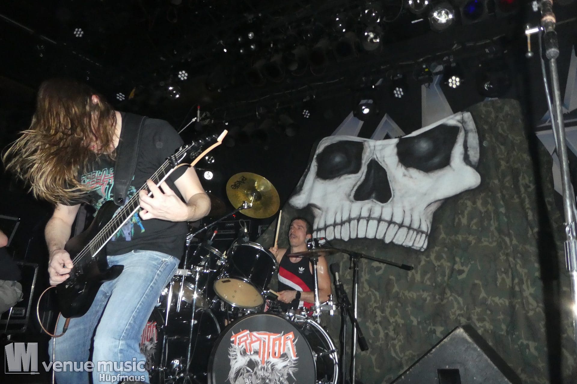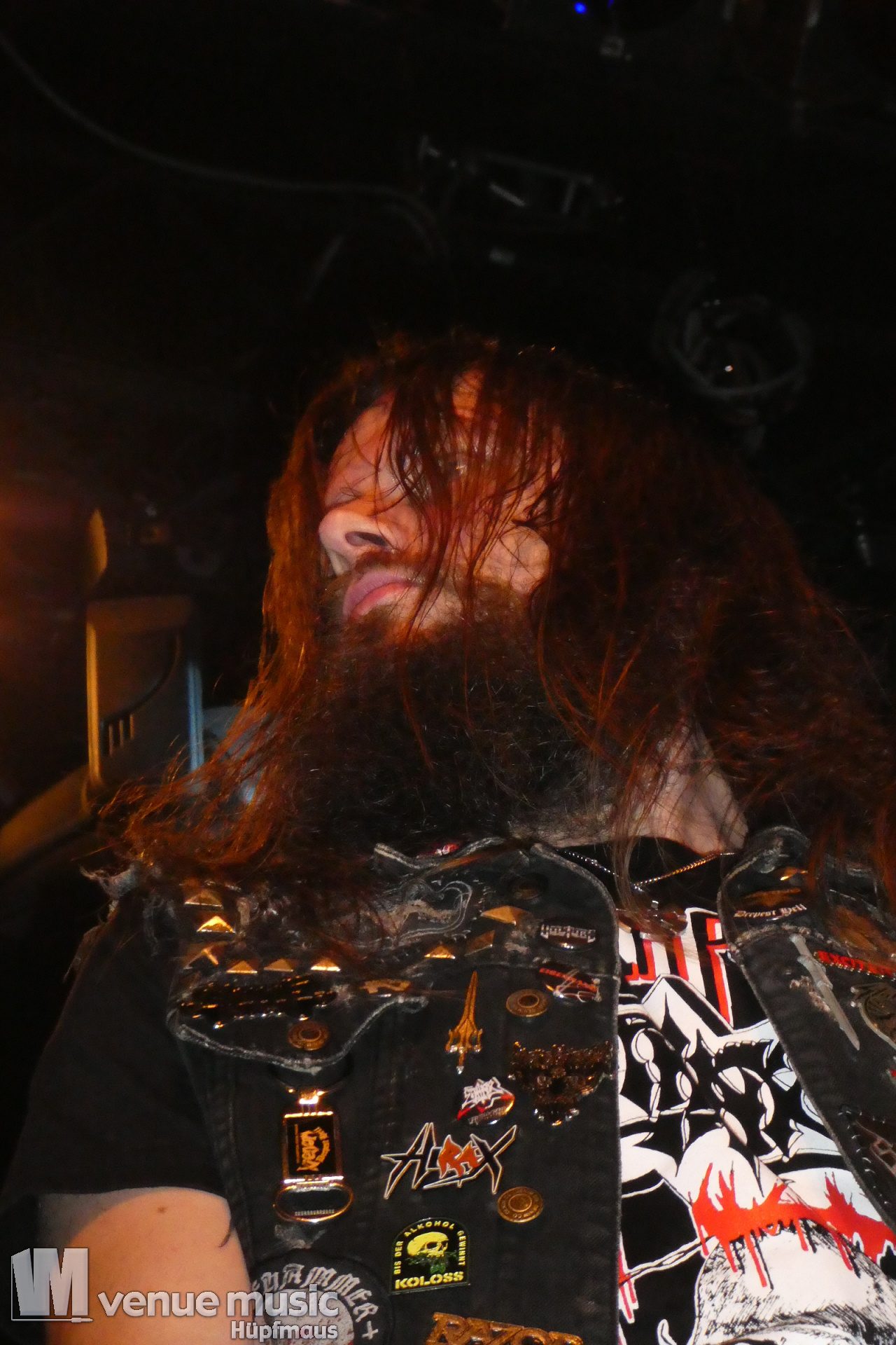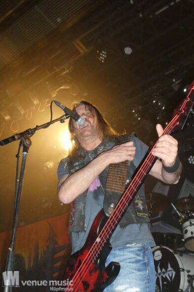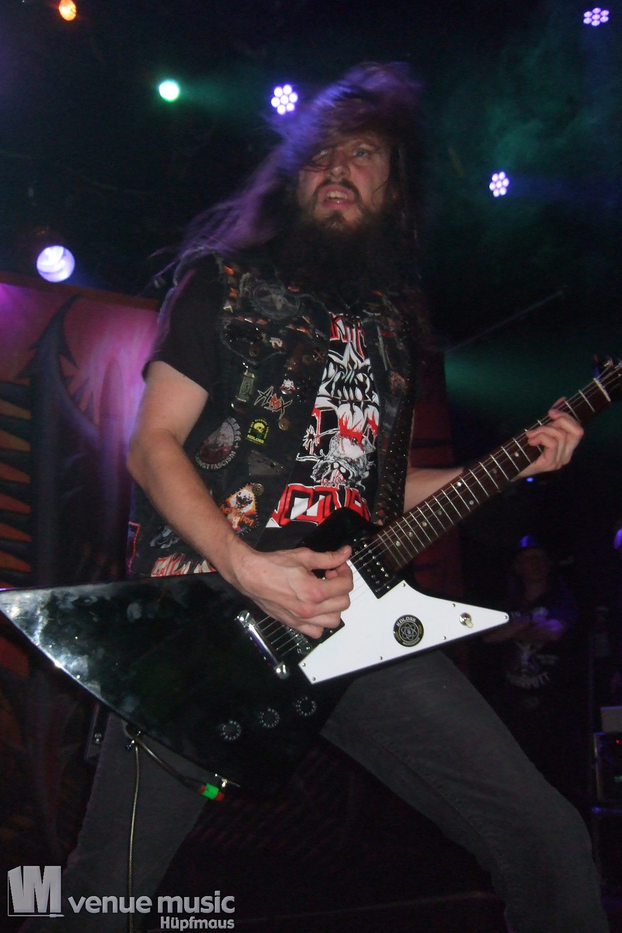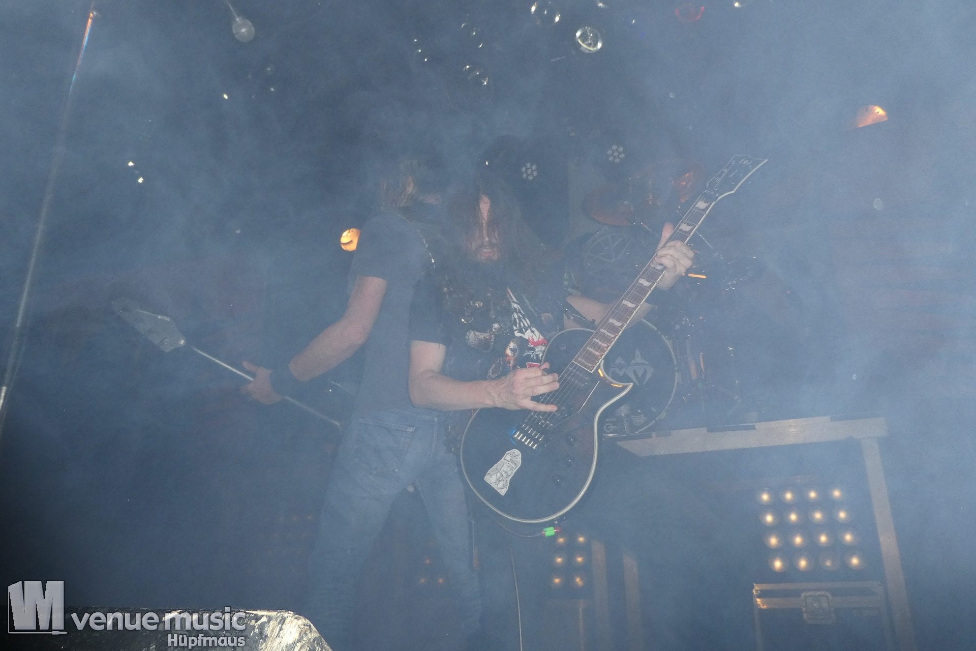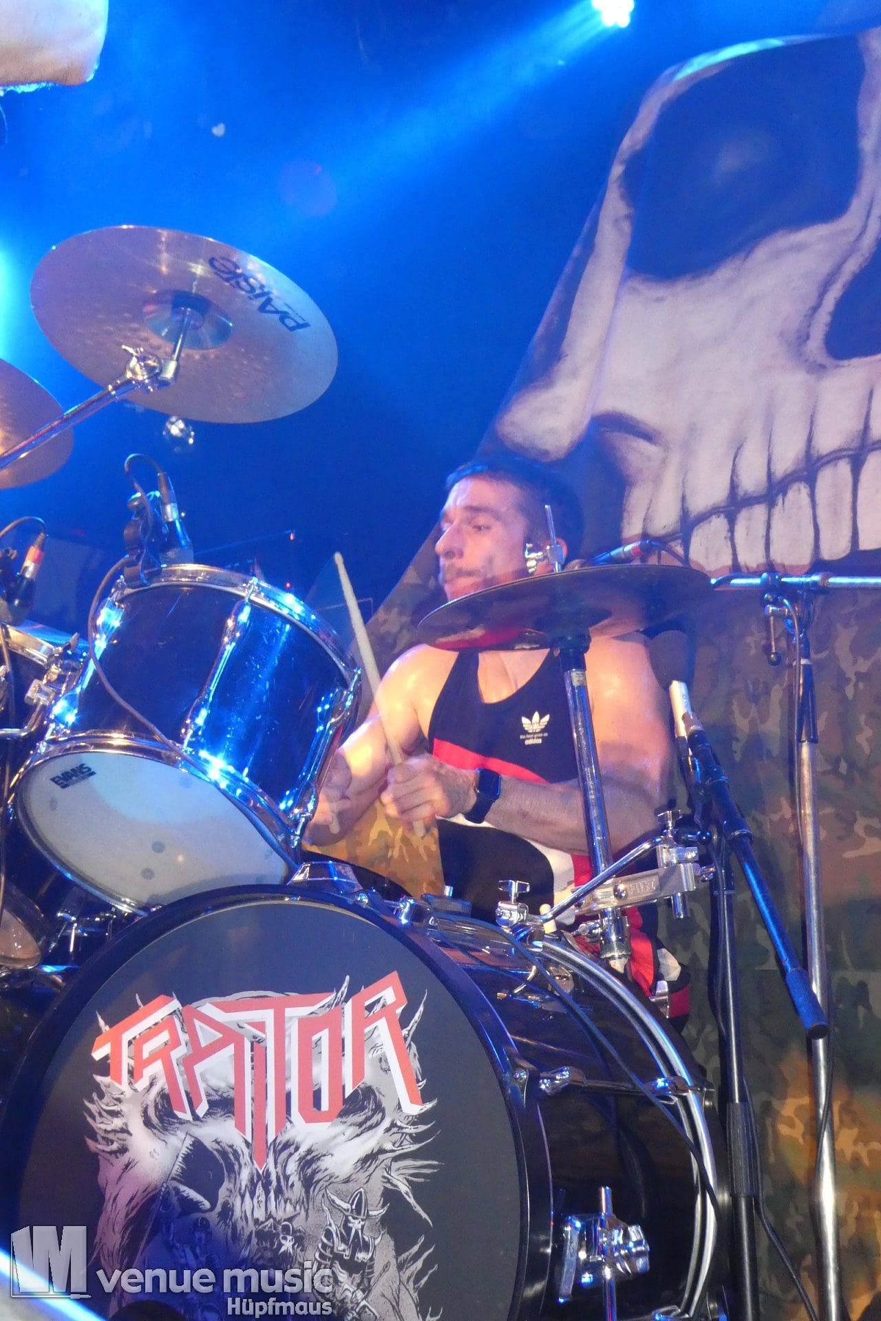 Recht pünktlich enterten Traitor die Bühne. Die Jungs aus Balingen machen bereits seit 2004 zusammen Musik (seit 2009 als Traitor – Besetzungswechsel inklusive). Leider kennen wir sie erst seit der „Knee-Deep in the Dead“ LP von 2018, die Jungs sind nämlich echt gut. Mit besagtem Titelsong haben sie dann auch ihr Set eröffnet. Und da ging es gut zur Sache, sie hatten echt Spaß auf der Bühne. Ein gutes duzend Songs knallten sie uns um die Ohren, mit dabei unter anderem „Thrash Command“, „Total Thrash“, „Venomizer“ und der Titelsong des diesjährigen Albums „Exiled to the surface“ (viel zu wenig gehört bisher die LP, auch wenn die hier natürlich im Regal steht…).