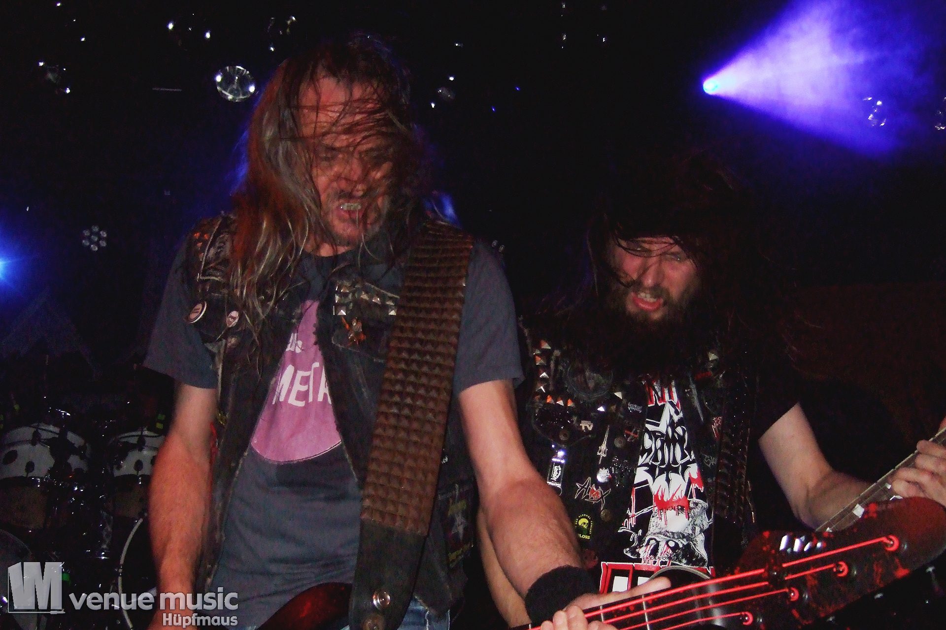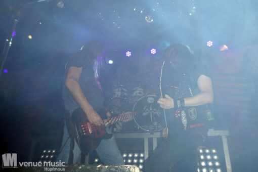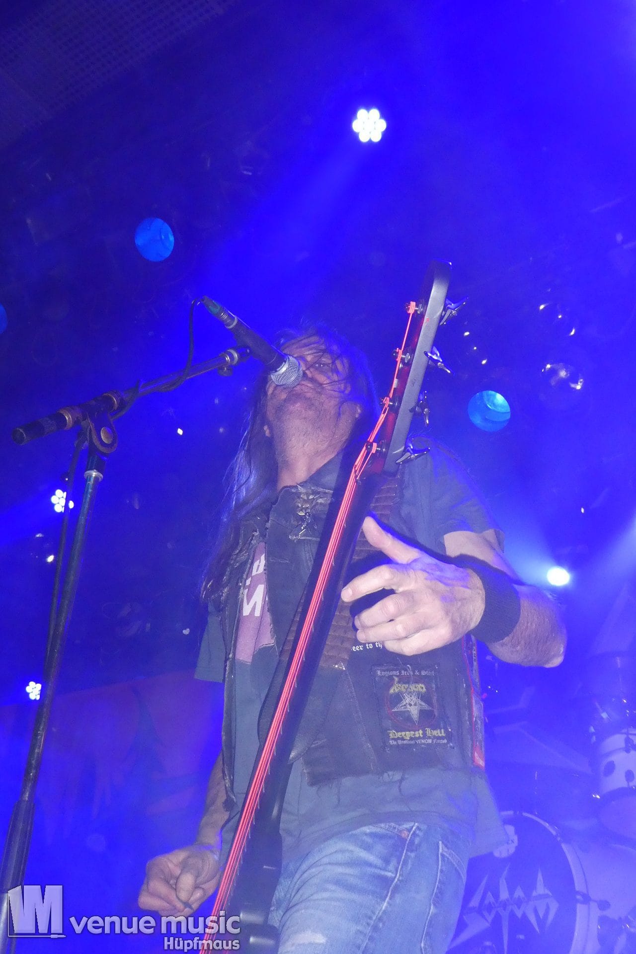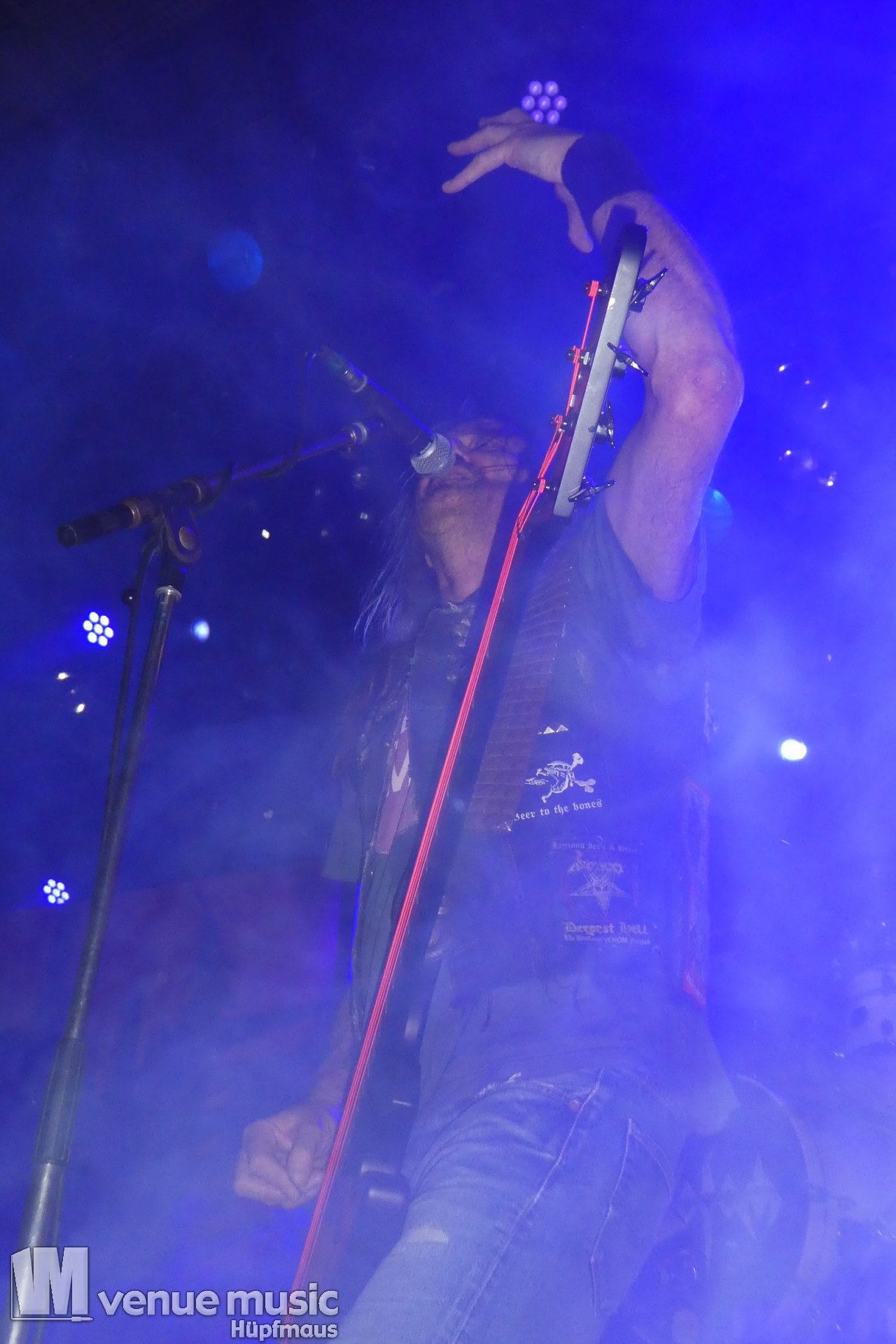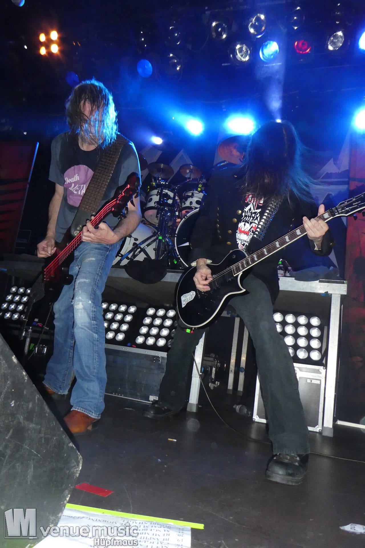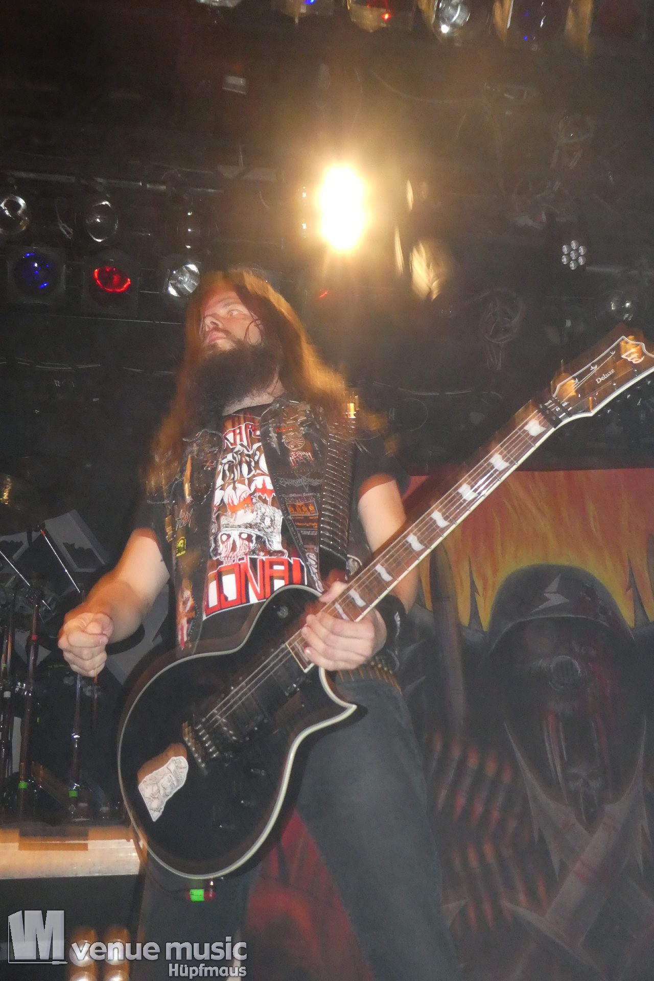 Recht pünktlich enterten Traitor die Bühne. Die Jungs aus Balingen machen bereits seit 2004 zusammen Musik (seit 2009 als Traitor – Besetzungswechsel inklusive). Leider kennen wir sie erst seit der „Knee-Deep in the Dead“ LP von 2018, die Jungs sind nämlich echt gut. Mit besagtem Titelsong haben sie dann auch ihr Set eröffnet. Und da ging es gut zur Sache, sie hatten echt Spaß auf der Bühne. Ein gutes duzend Songs knallten sie uns um die Ohren, mit dabei unter anderem „Thrash Command“, „Total Thrash“, „Venomizer“ und der Titelsong des diesjährigen Albums „Exiled to the surface“ (viel zu wenig gehört bisher die LP, auch wenn die hier natürlich im Regal steht…).