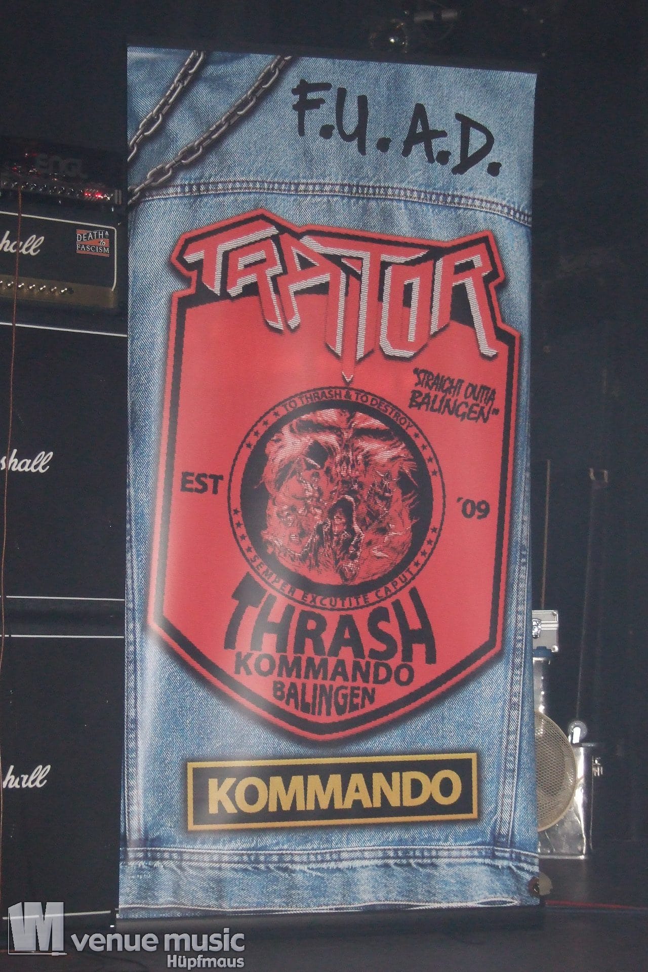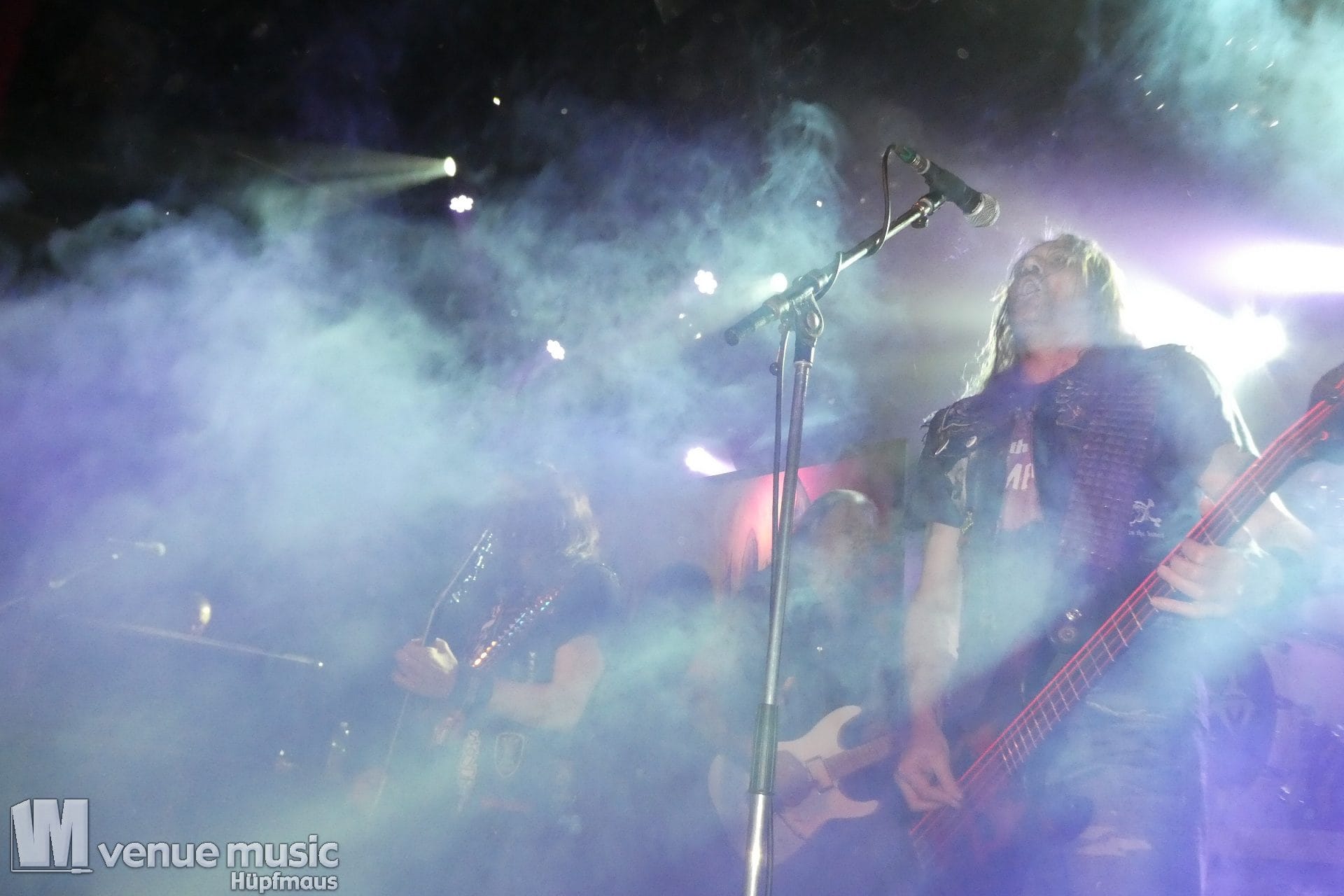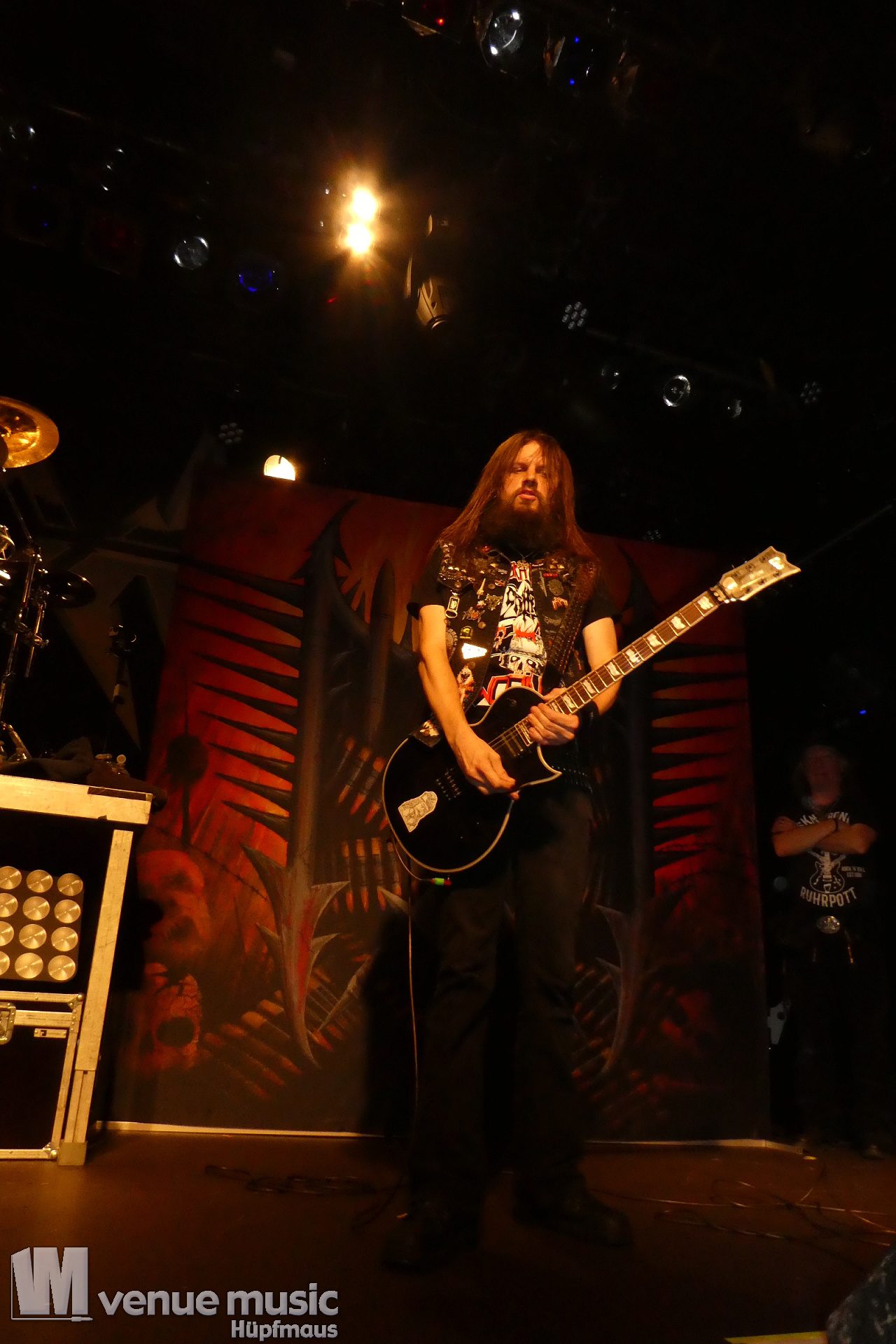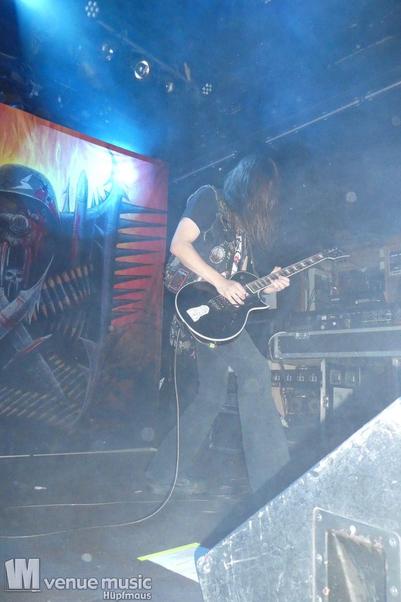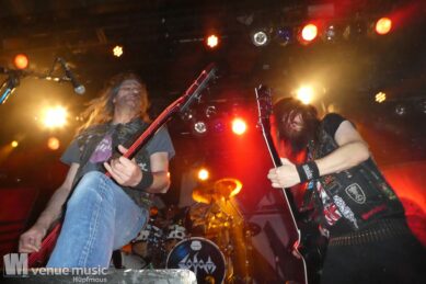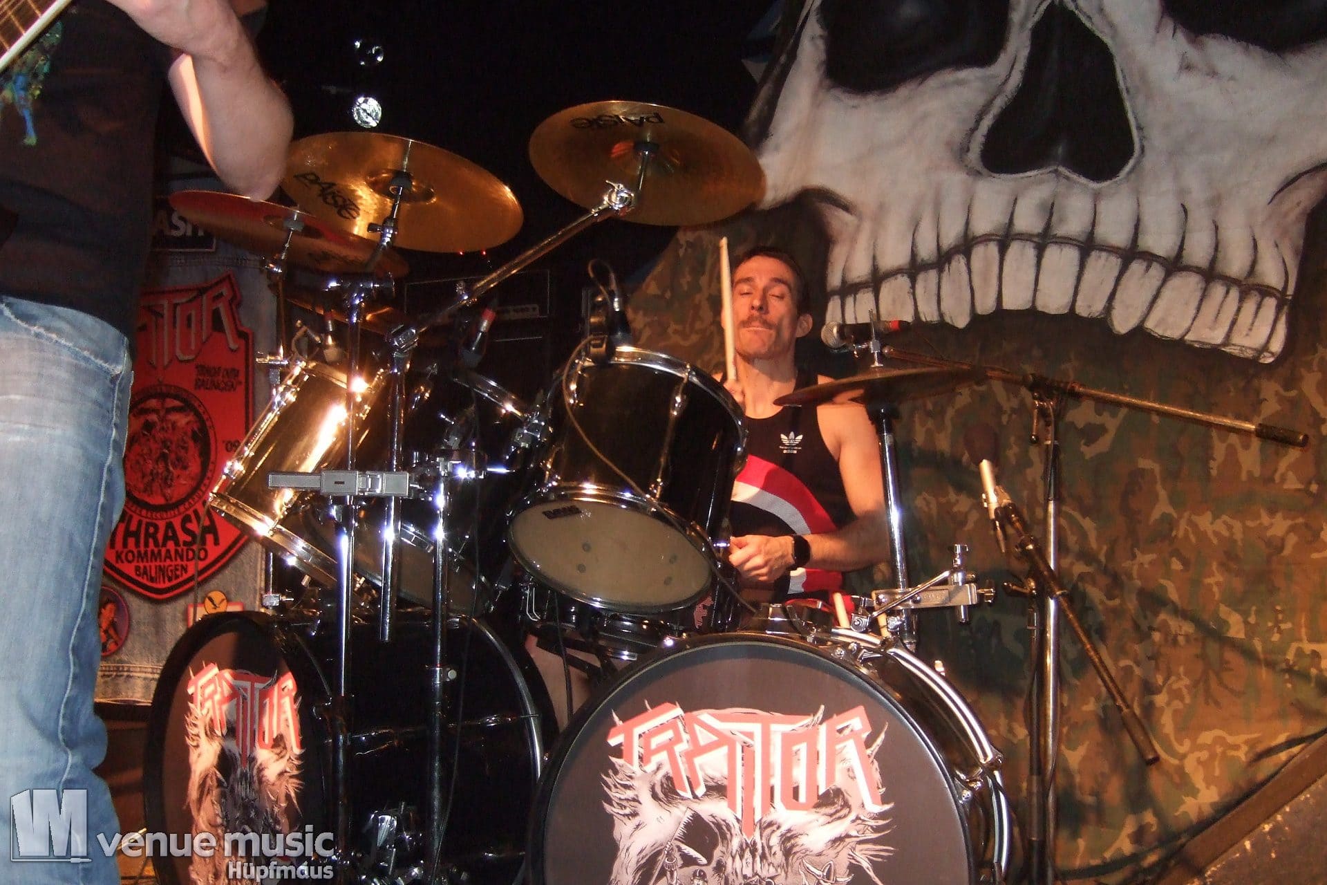 Recht pünktlich enterten Traitor die Bühne. Die Jungs aus Balingen machen bereits seit 2004 zusammen Musik (seit 2009 als Traitor – Besetzungswechsel inklusive). Leider kennen wir sie erst seit der „Knee-Deep in the Dead“ LP von 2018, die Jungs sind nämlich echt gut. Mit besagtem Titelsong haben sie dann auch ihr Set eröffnet. Und da ging es gut zur Sache, sie hatten echt Spaß auf der Bühne. Ein gutes duzend Songs knallten sie uns um die Ohren, mit dabei unter anderem „Thrash Command“, „Total Thrash“, „Venomizer“ und der Titelsong des diesjährigen Albums „Exiled to the surface“ (viel zu wenig gehört bisher die LP, auch wenn die hier natürlich im Regal steht…).