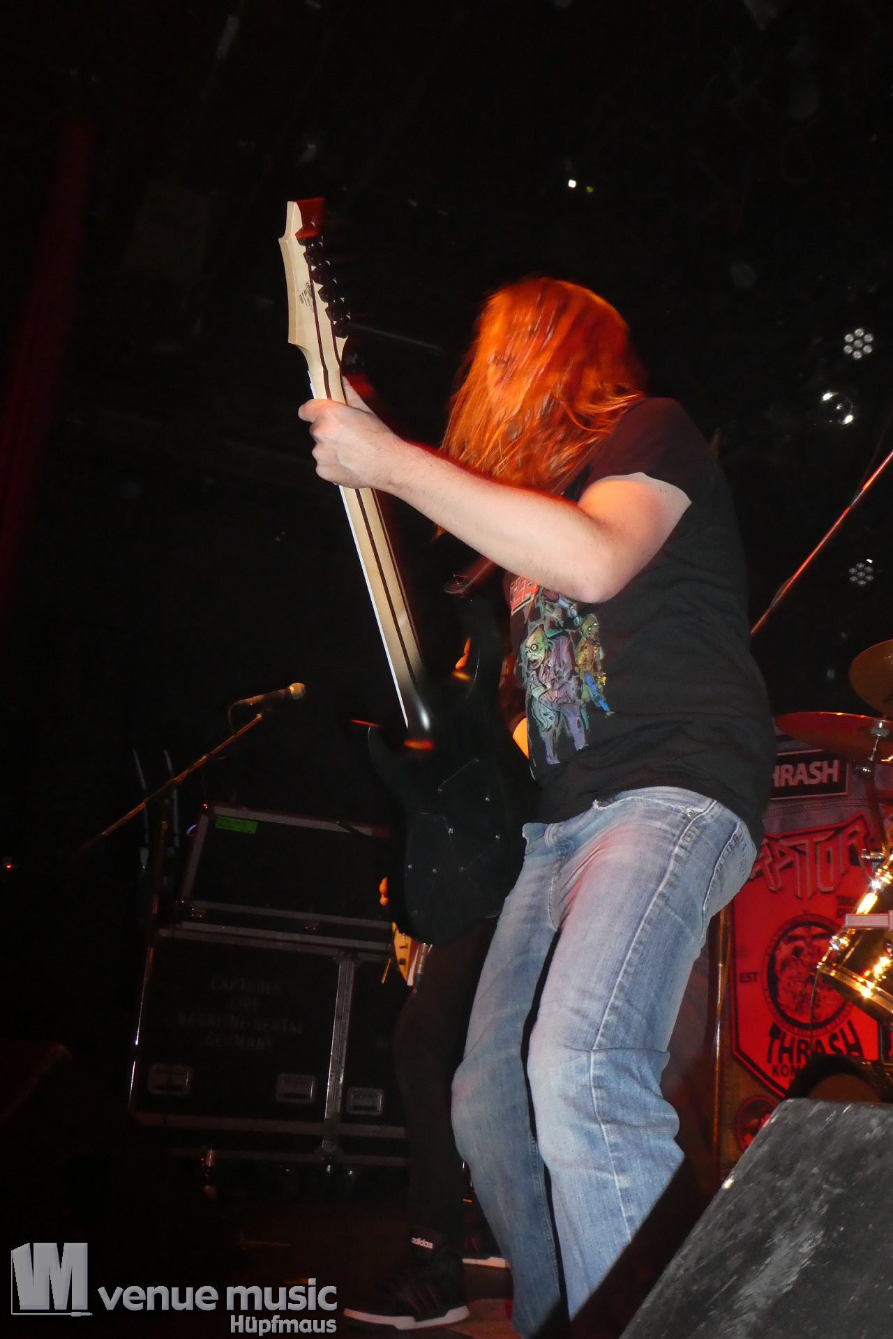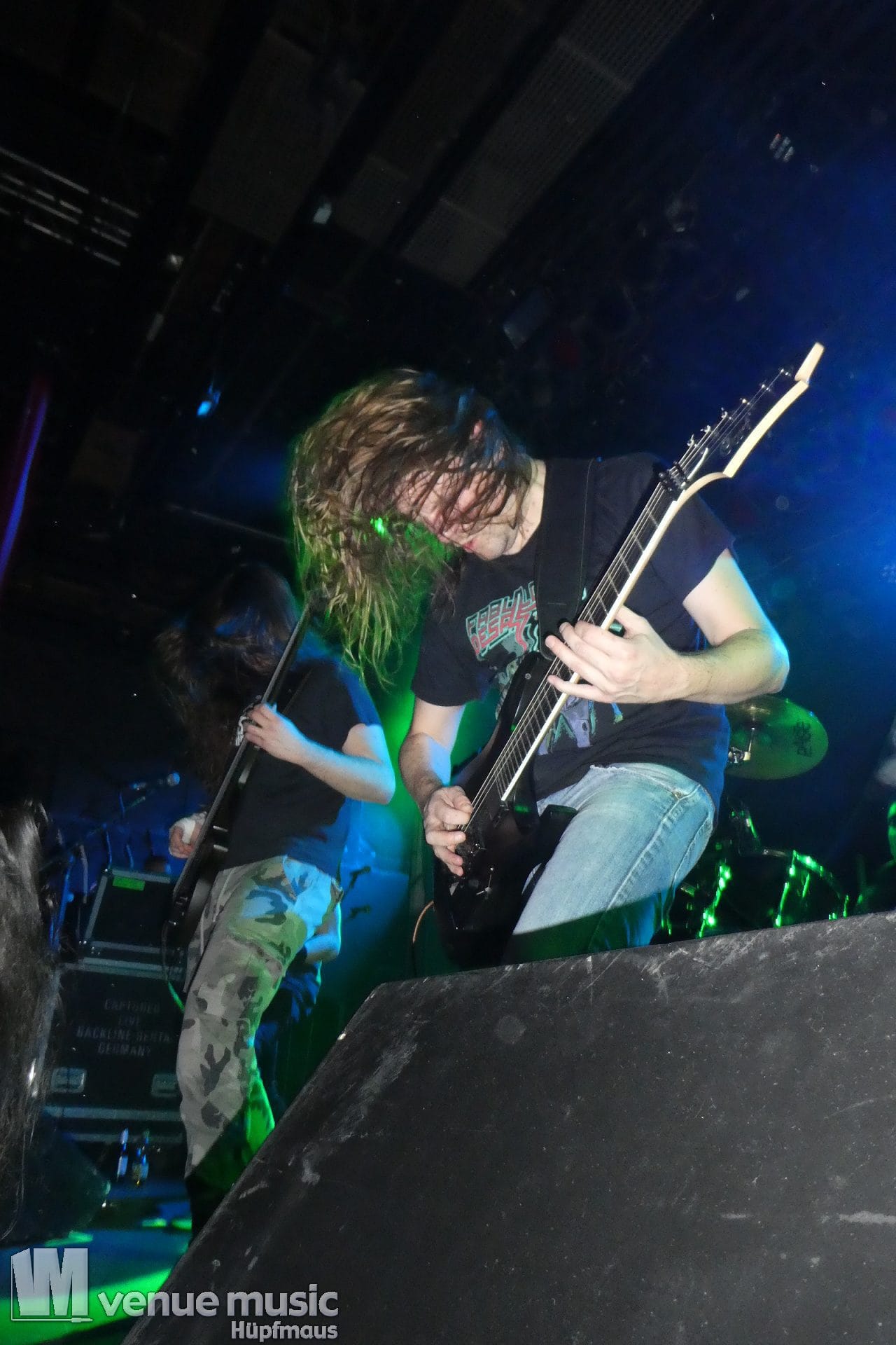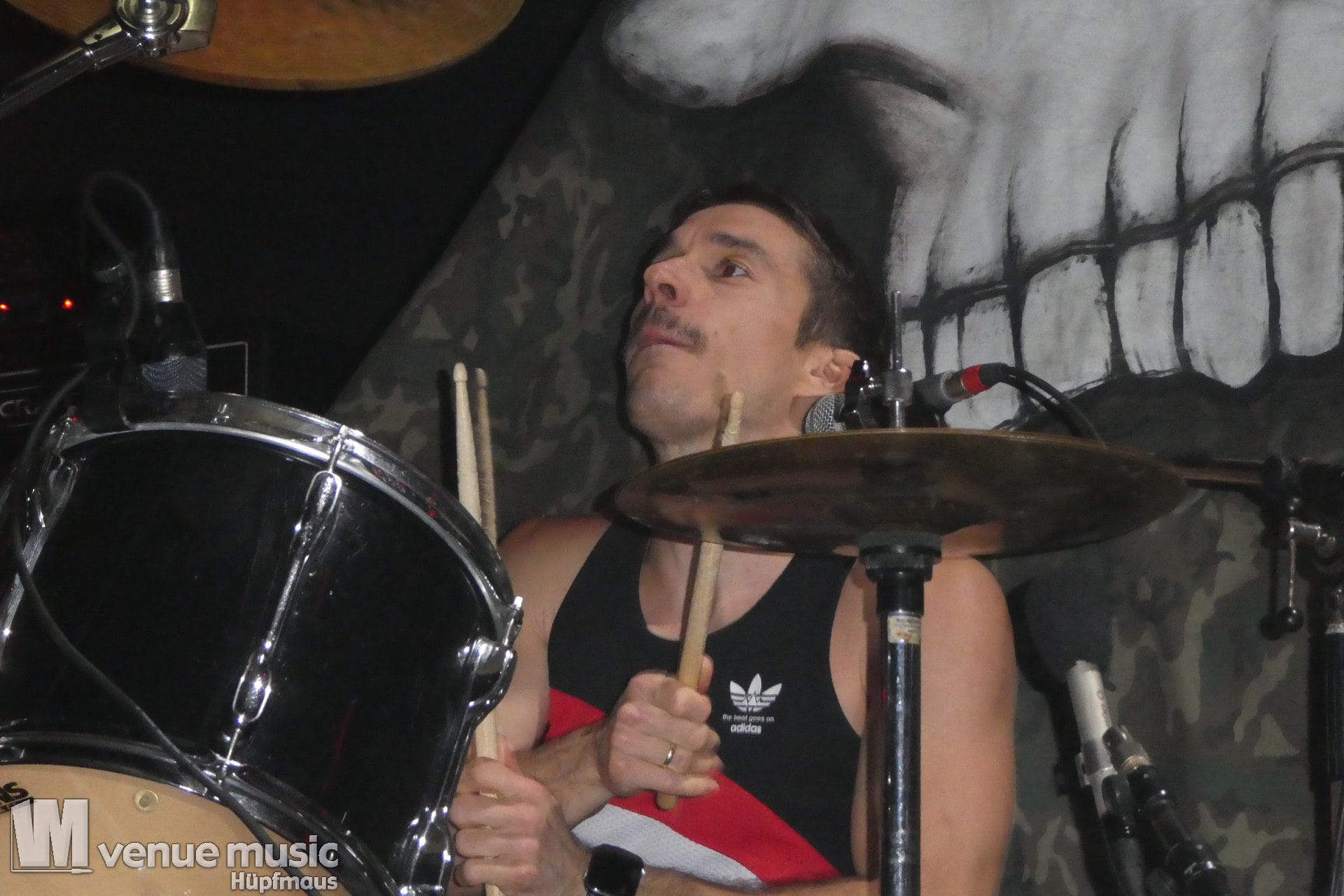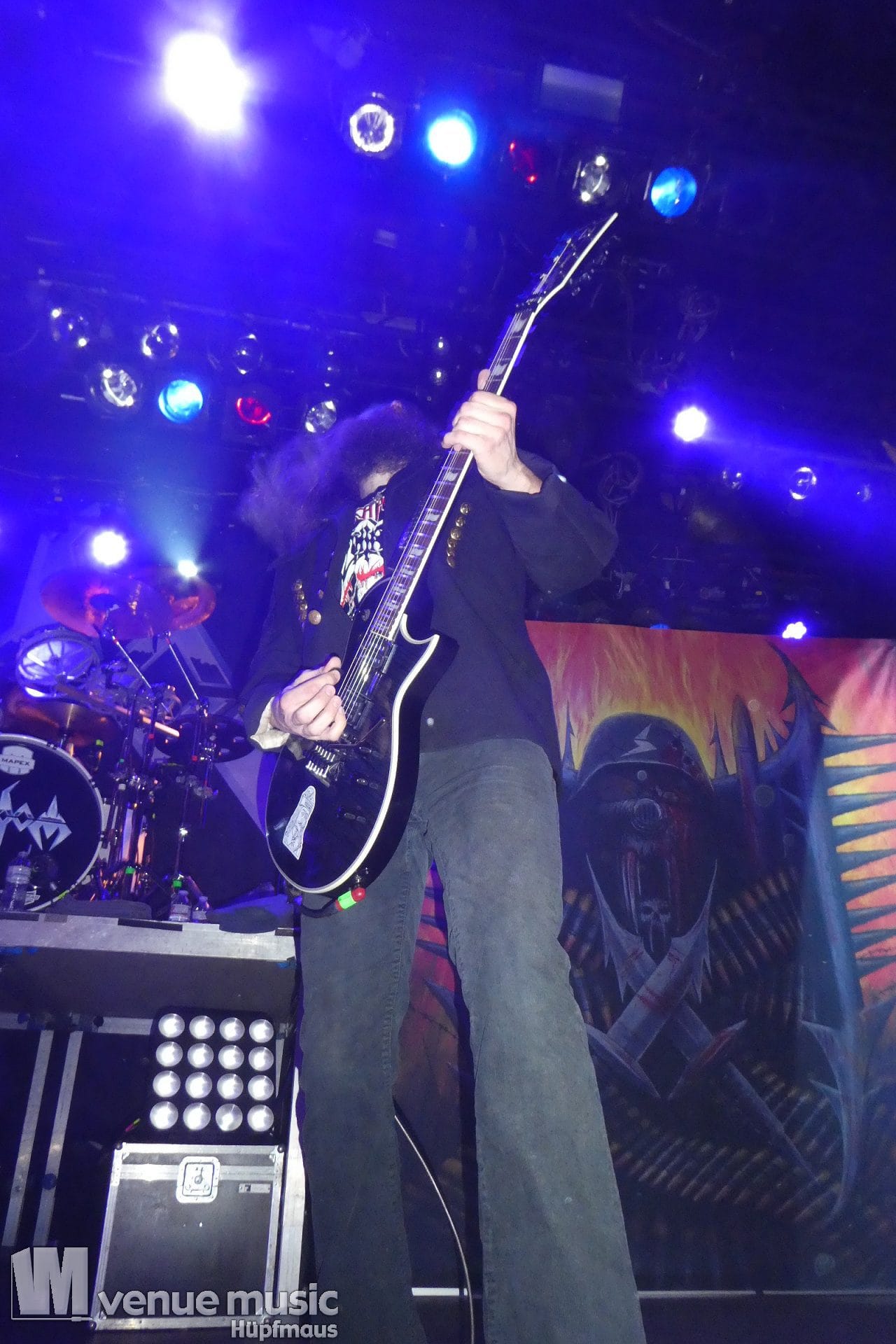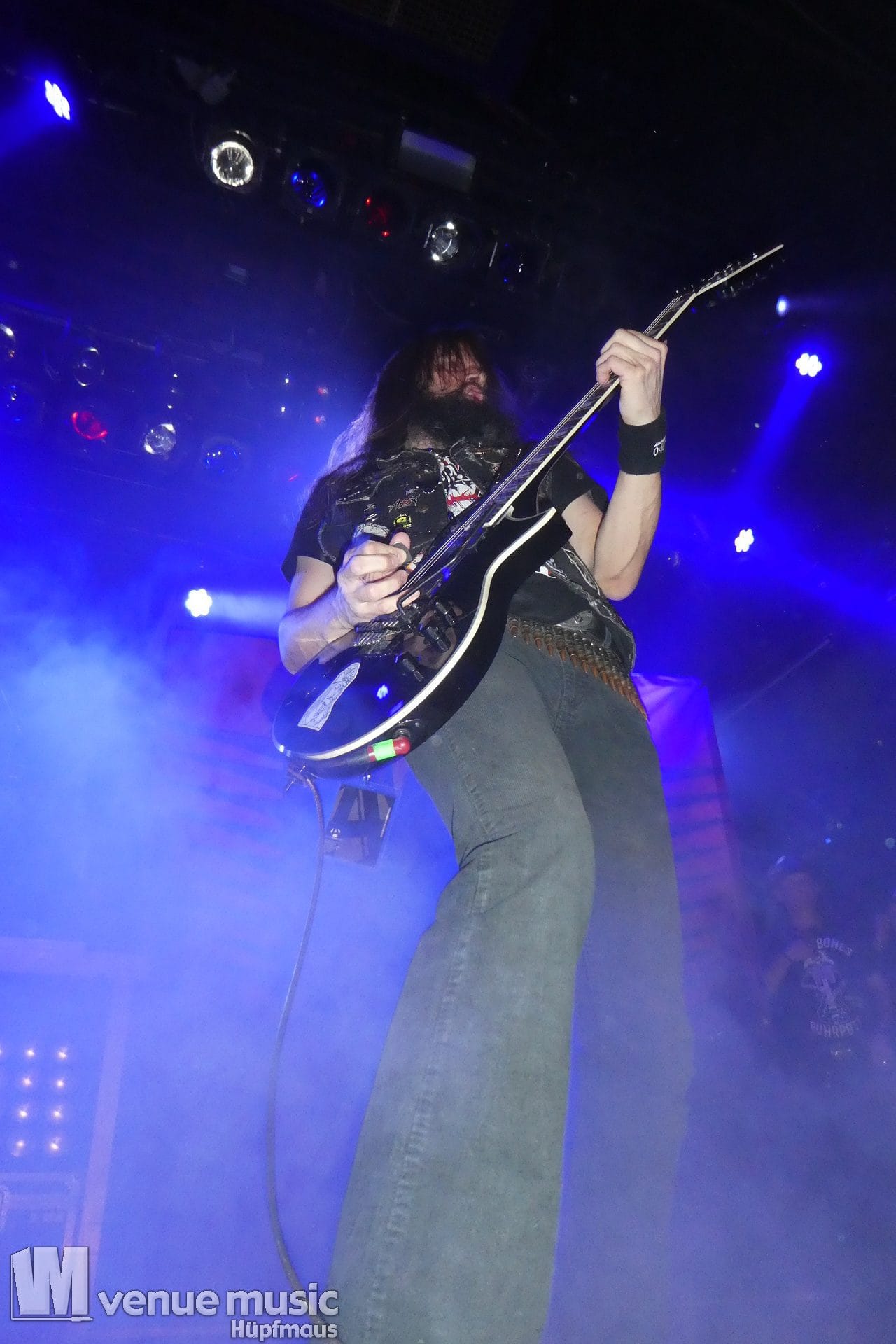 Recht pünktlich enterten Traitor die Bühne. Die Jungs aus Balingen machen bereits seit 2004 zusammen Musik (seit 2009 als Traitor – Besetzungswechsel inklusive). Leider kennen wir sie erst seit der „Knee-Deep in the Dead“ LP von 2018, die Jungs sind nämlich echt gut. Mit besagtem Titelsong haben sie dann auch ihr Set eröffnet. Und da ging es gut zur Sache, sie hatten echt Spaß auf der Bühne. Ein gutes duzend Songs knallten sie uns um die Ohren, mit dabei unter anderem „Thrash Command“, „Total Thrash“, „Venomizer“ und der Titelsong des diesjährigen Albums „Exiled to the surface“ (viel zu wenig gehört bisher die LP, auch wenn die hier natürlich im Regal steht…).