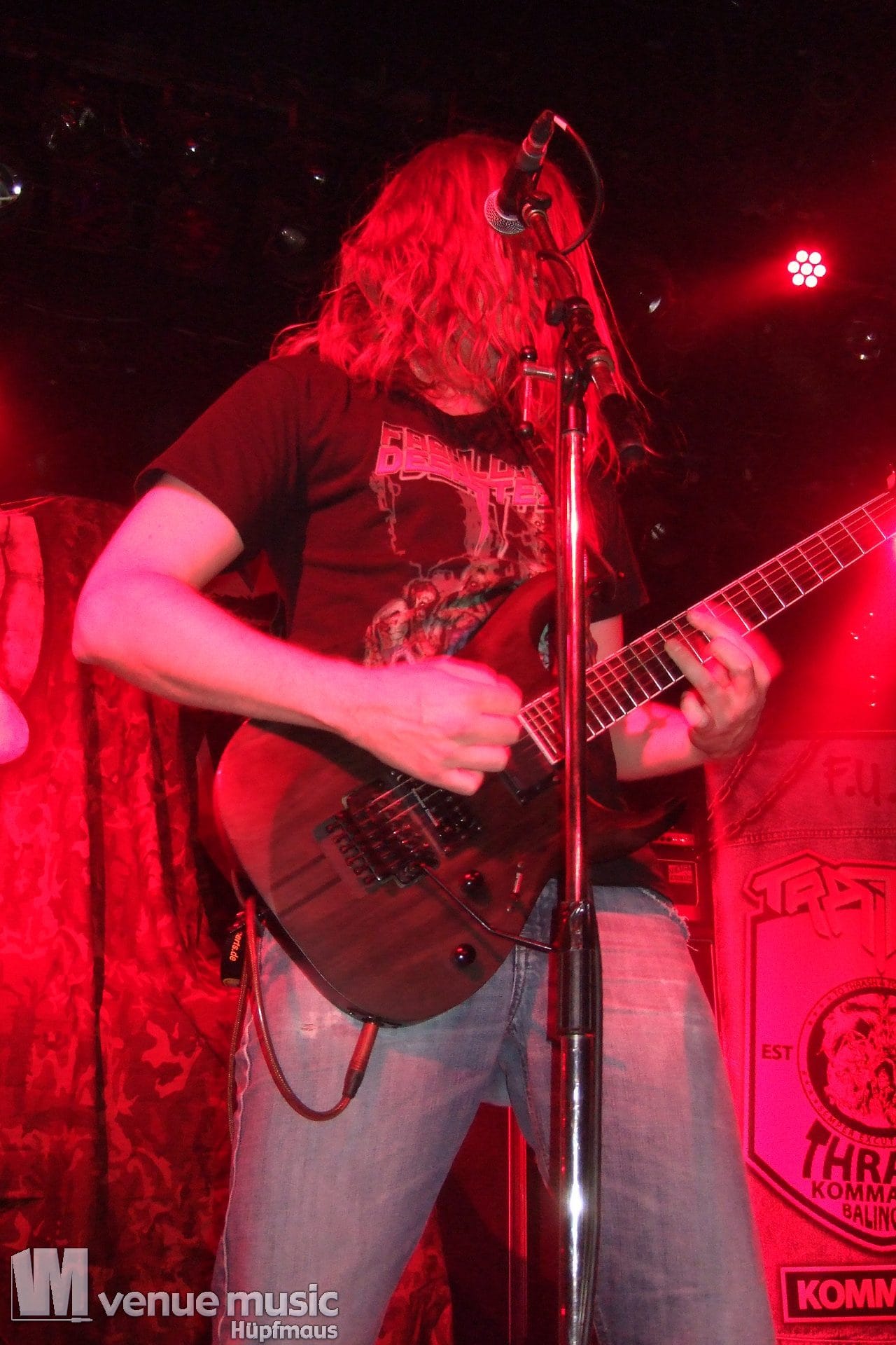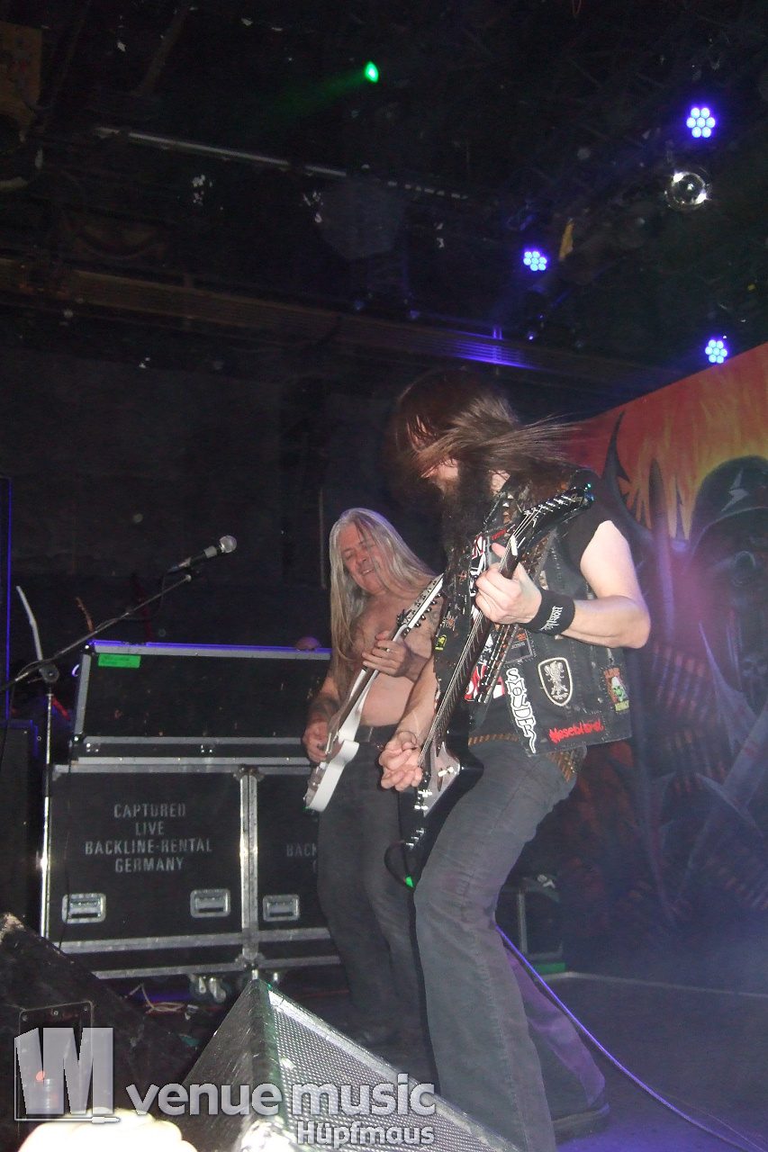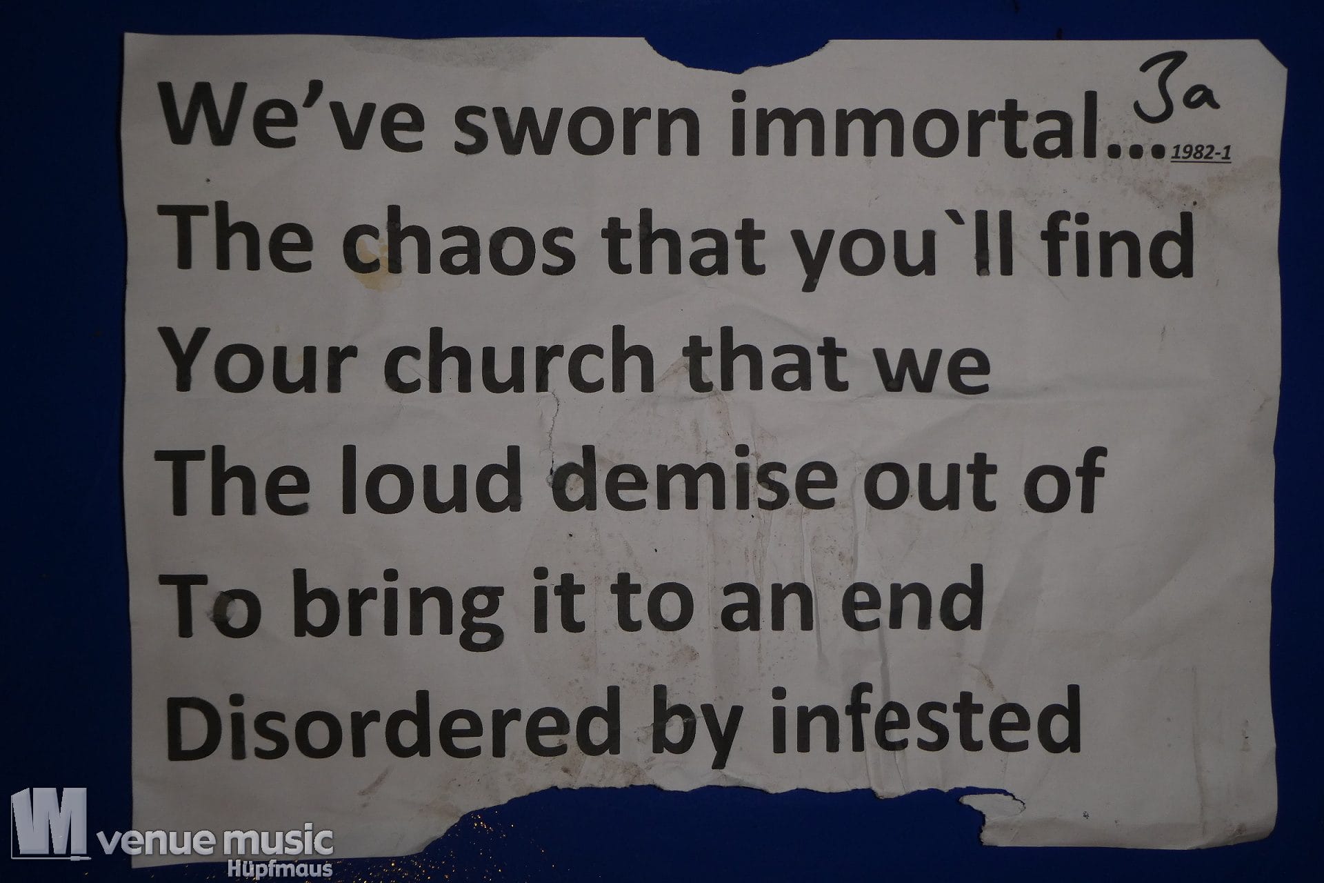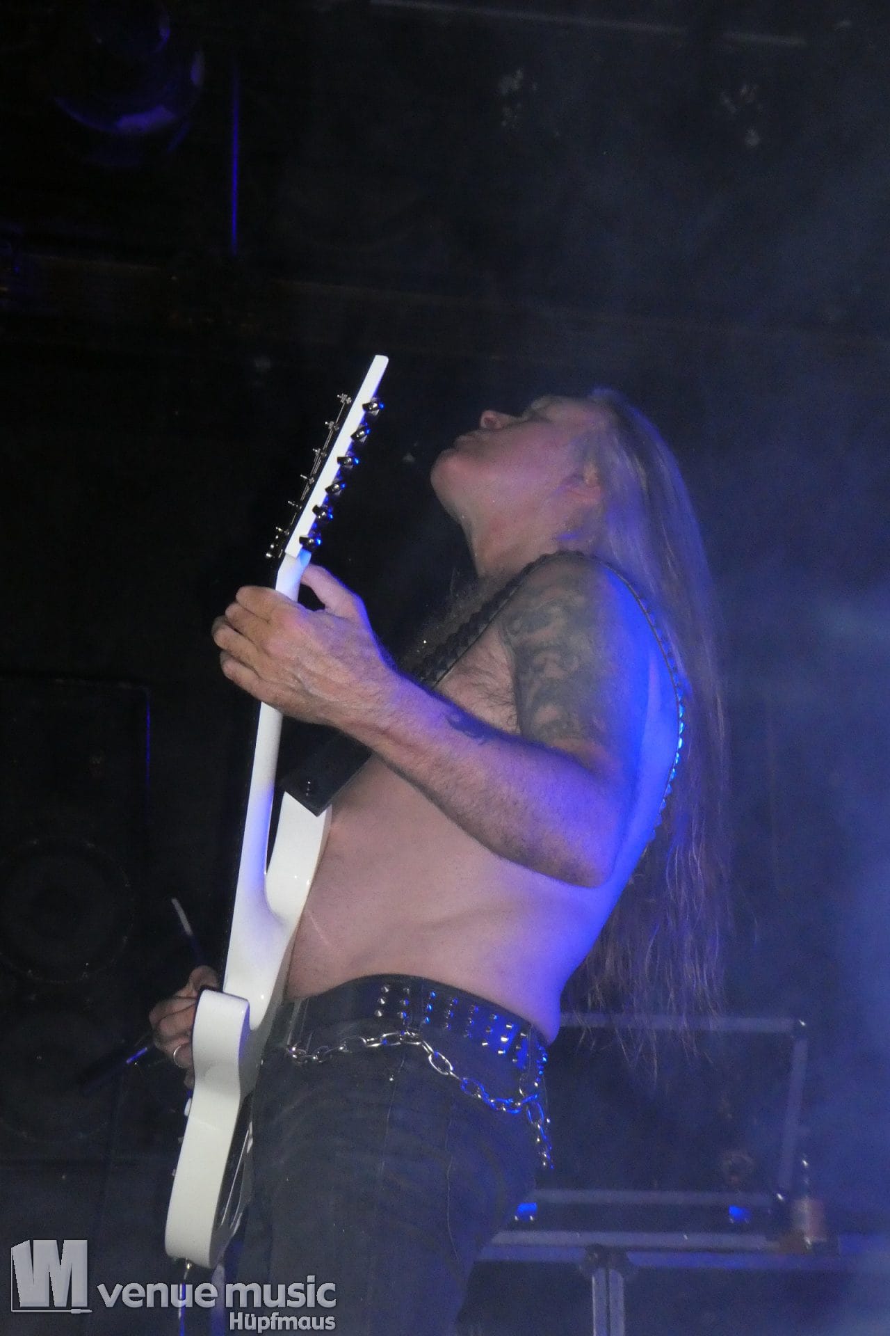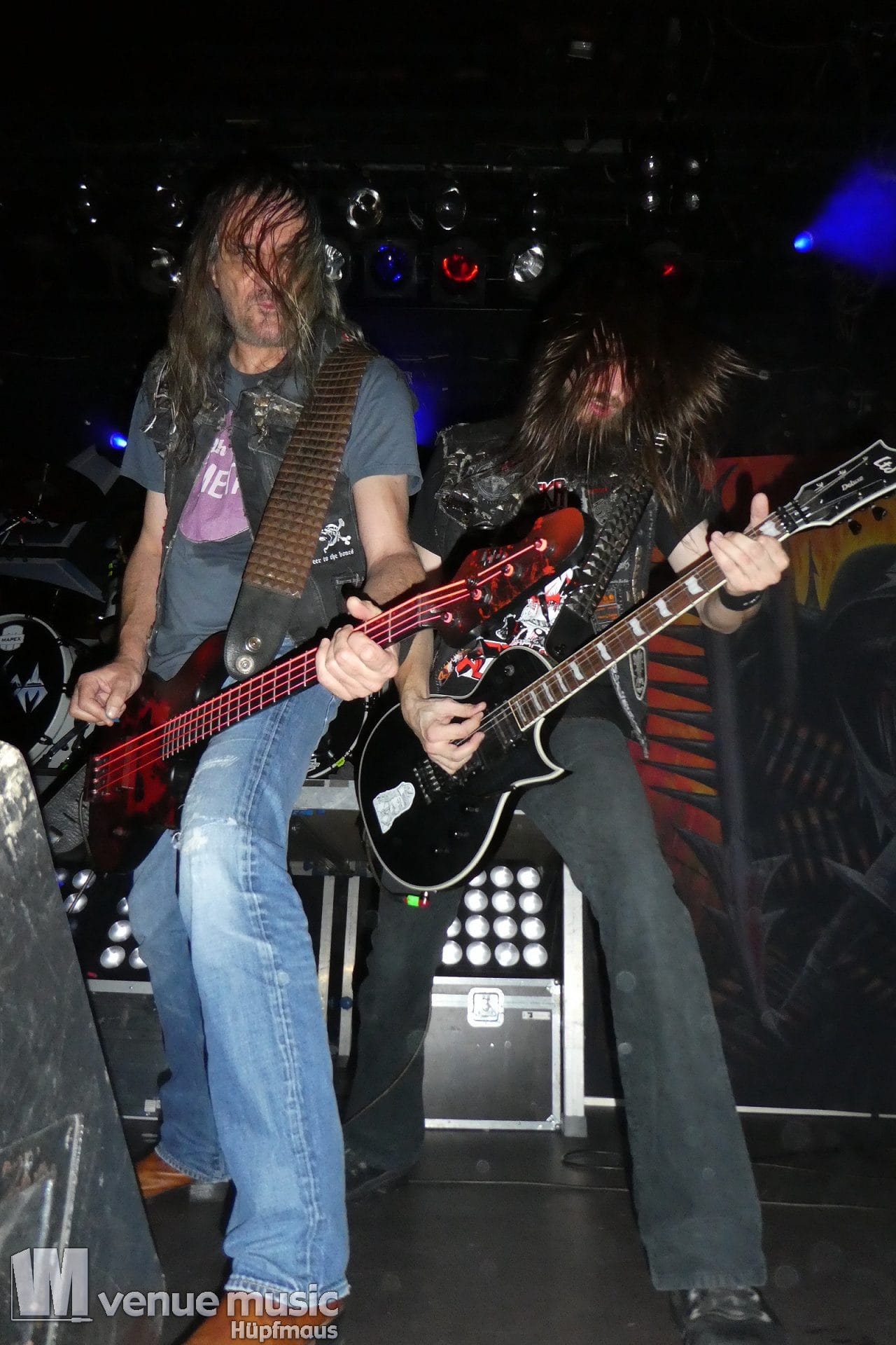 Recht pünktlich enterten Traitor die Bühne. Die Jungs aus Balingen machen bereits seit 2004 zusammen Musik (seit 2009 als Traitor – Besetzungswechsel inklusive). Leider kennen wir sie erst seit der „Knee-Deep in the Dead“ LP von 2018, die Jungs sind nämlich echt gut. Mit besagtem Titelsong haben sie dann auch ihr Set eröffnet. Und da ging es gut zur Sache, sie hatten echt Spaß auf der Bühne. Ein gutes duzend Songs knallten sie uns um die Ohren, mit dabei unter anderem „Thrash Command“, „Total Thrash“, „Venomizer“ und der Titelsong des diesjährigen Albums „Exiled to the surface“ (viel zu wenig gehört bisher die LP, auch wenn die hier natürlich im Regal steht…).