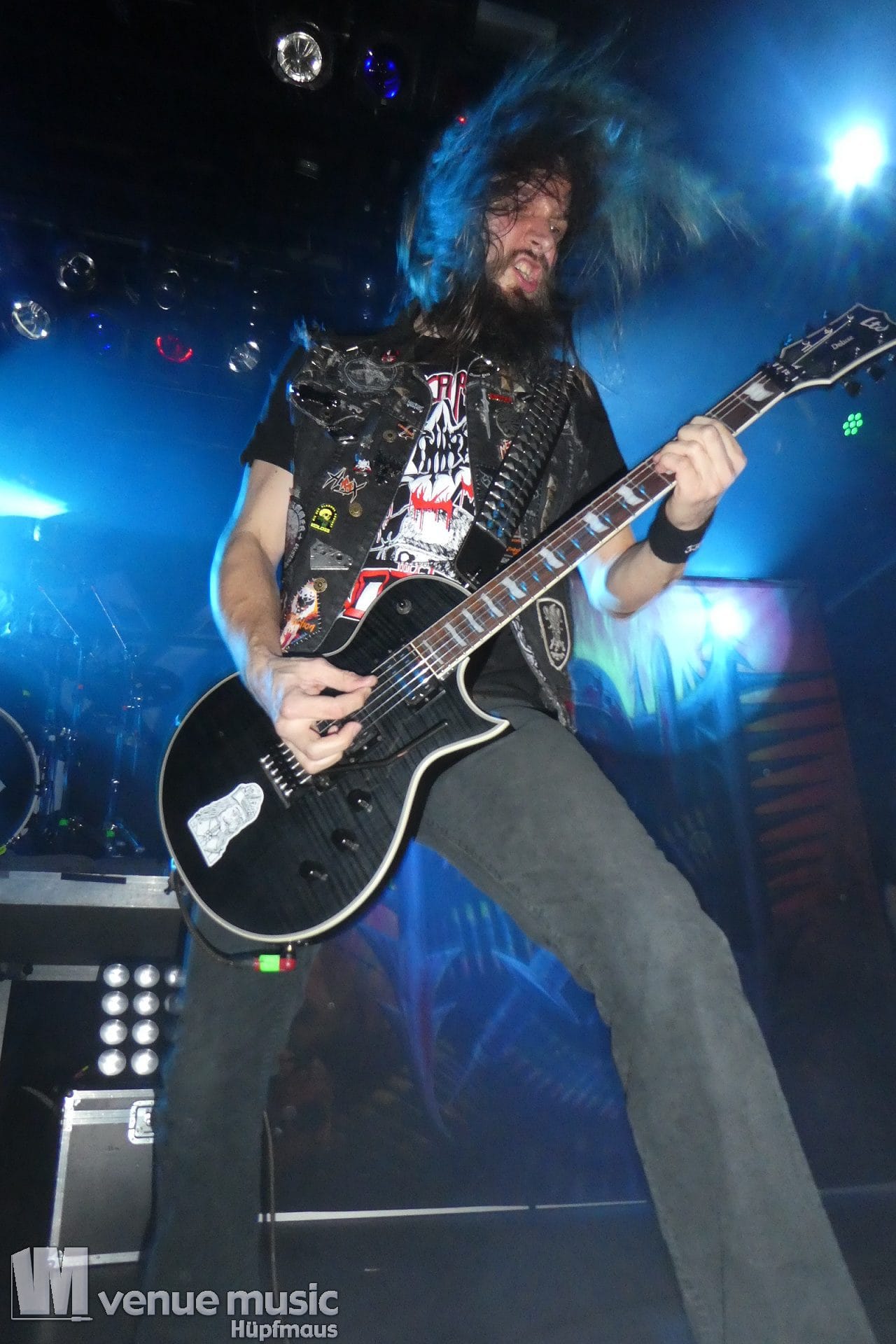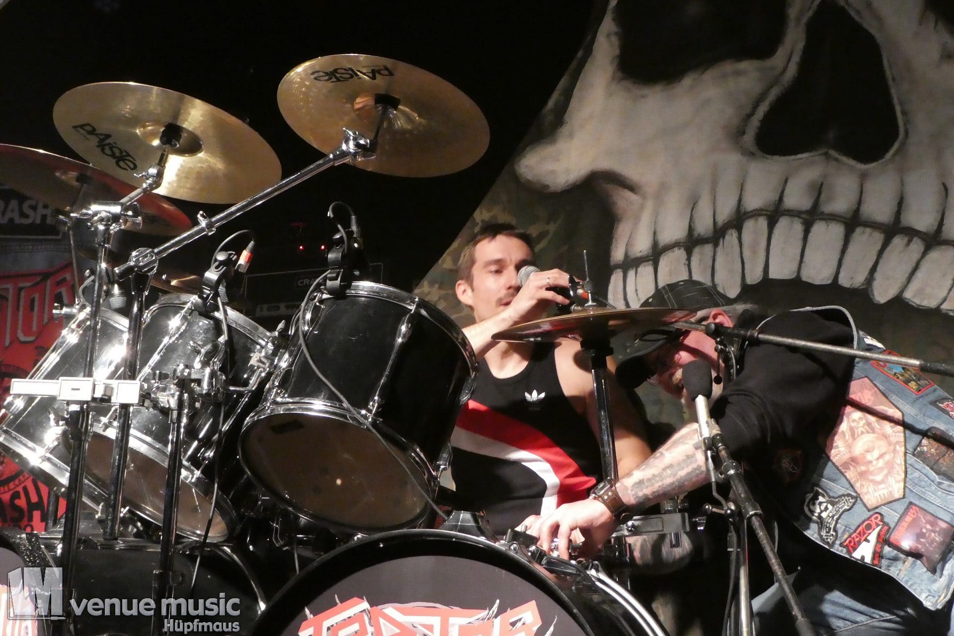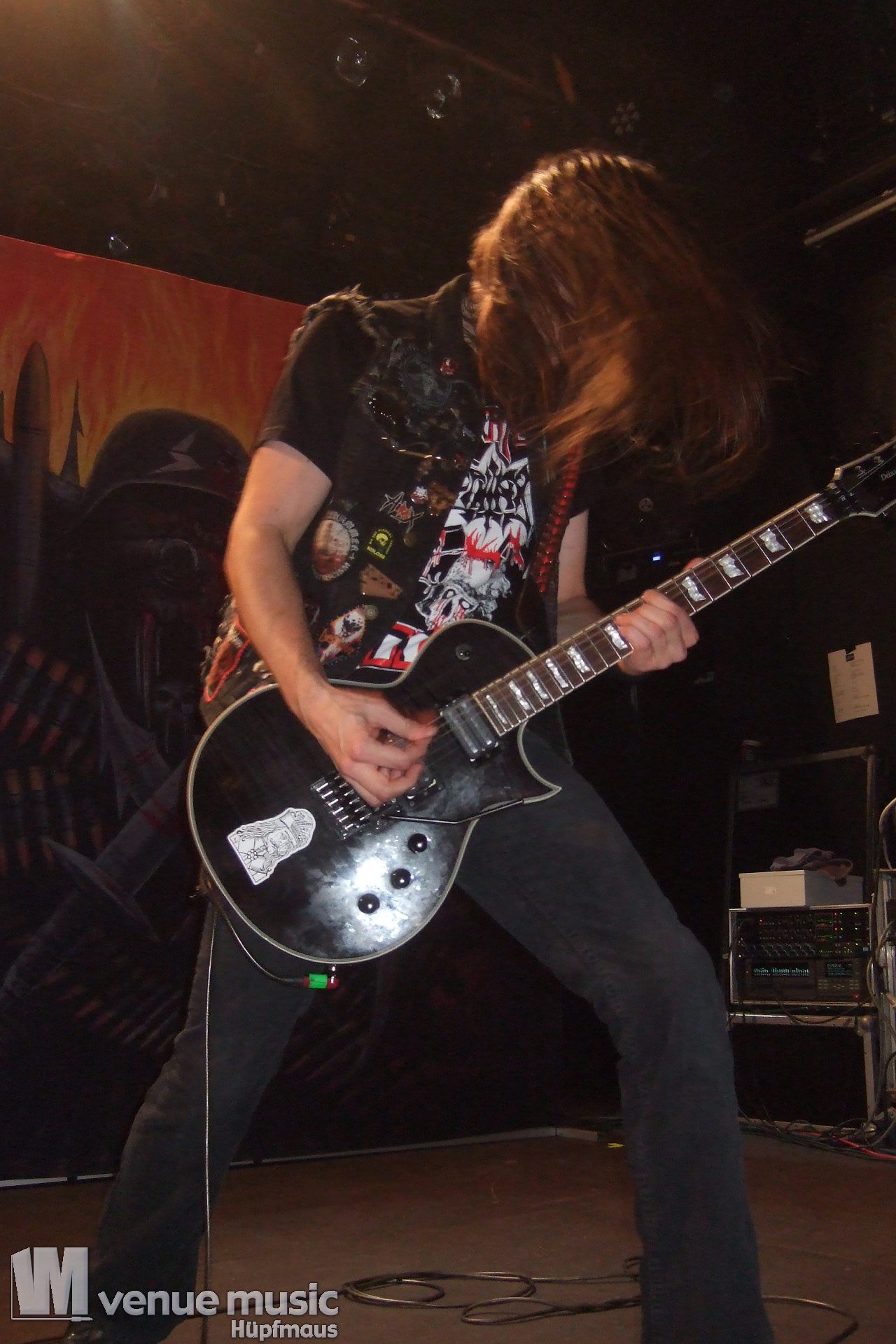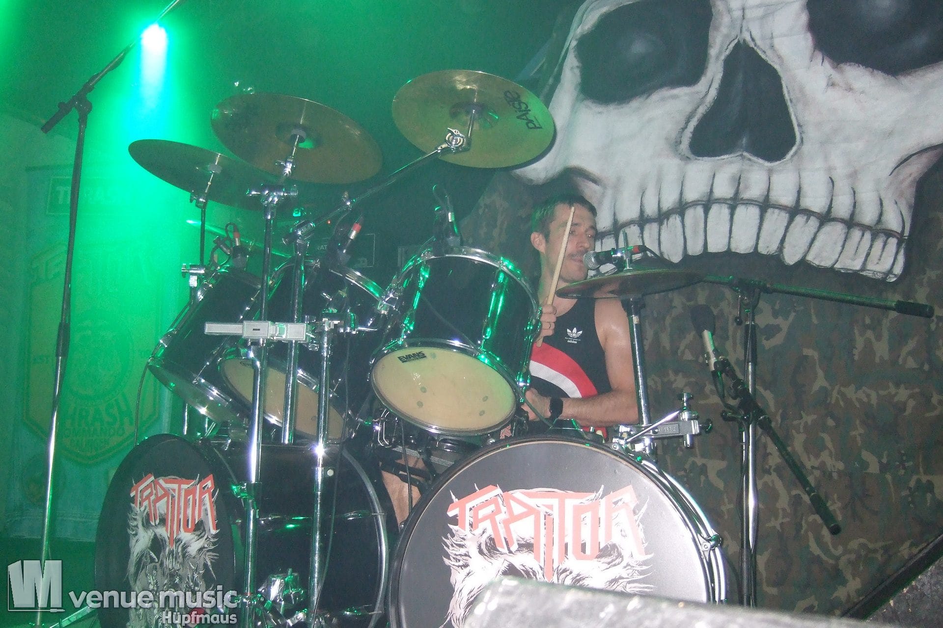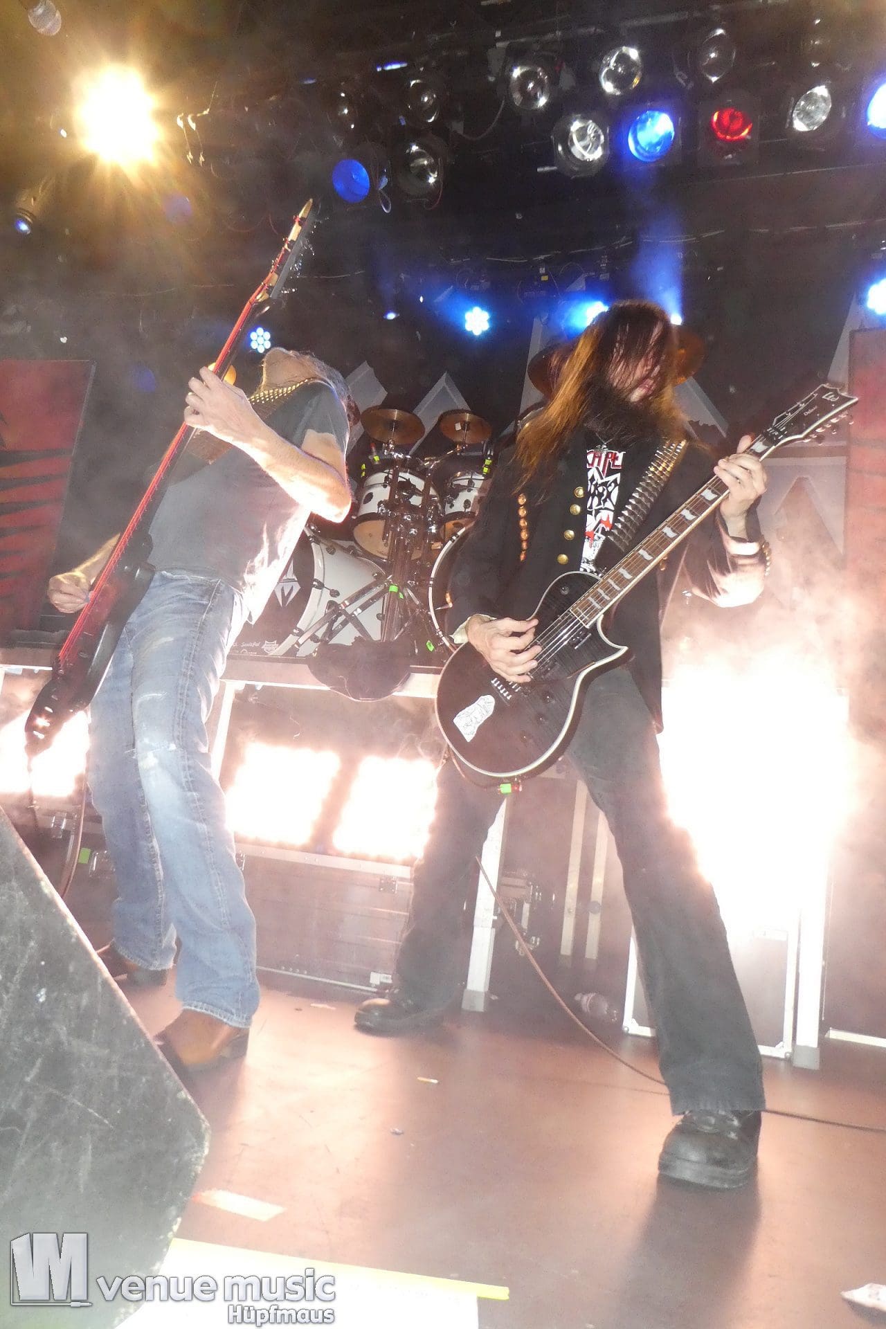 Recht pünktlich enterten Traitor die Bühne. Die Jungs aus Balingen machen bereits seit 2004 zusammen Musik (seit 2009 als Traitor – Besetzungswechsel inklusive). Leider kennen wir sie erst seit der „Knee-Deep in the Dead“ LP von 2018, die Jungs sind nämlich echt gut. Mit besagtem Titelsong haben sie dann auch ihr Set eröffnet. Und da ging es gut zur Sache, sie hatten echt Spaß auf der Bühne. Ein gutes duzend Songs knallten sie uns um die Ohren, mit dabei unter anderem „Thrash Command“, „Total Thrash“, „Venomizer“ und der Titelsong des diesjährigen Albums „Exiled to the surface“ (viel zu wenig gehört bisher die LP, auch wenn die hier natürlich im Regal steht…).