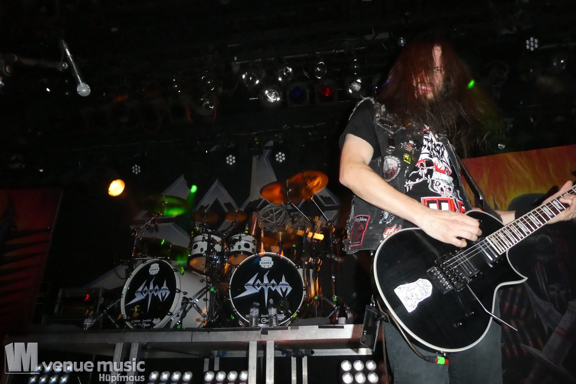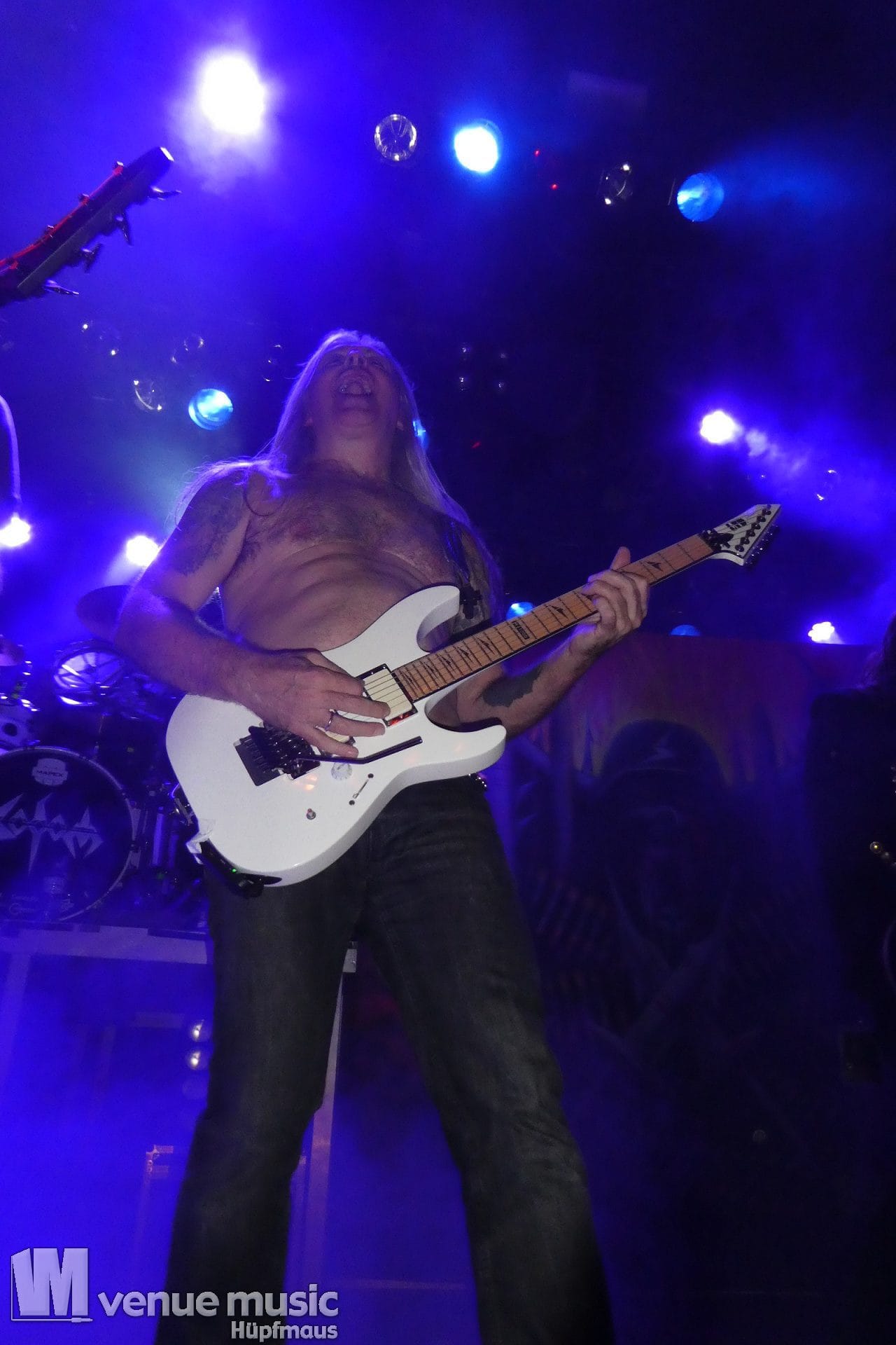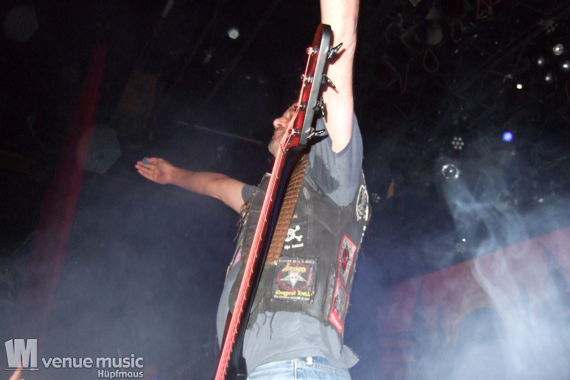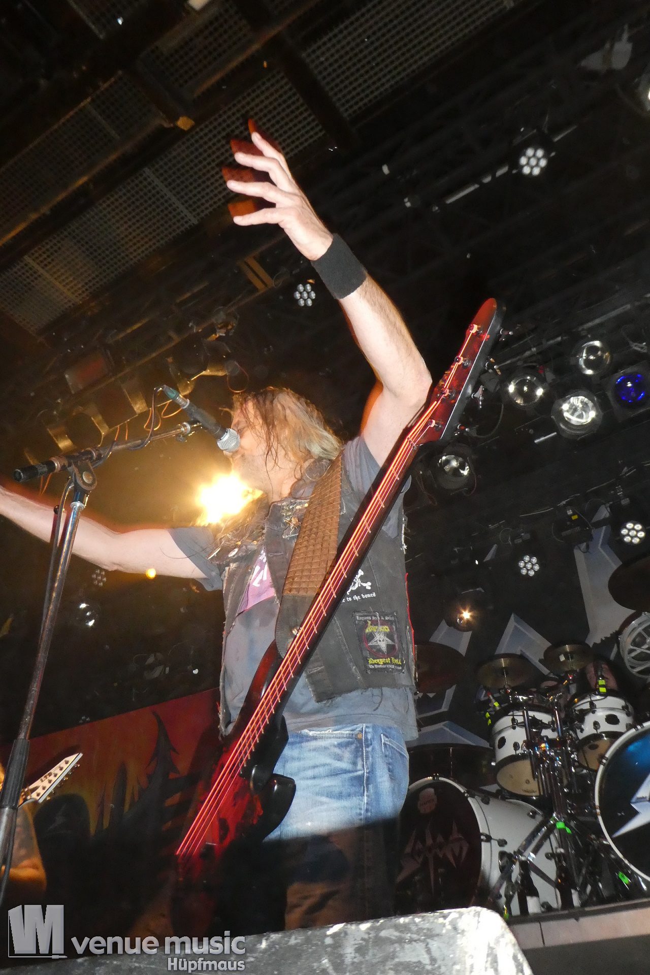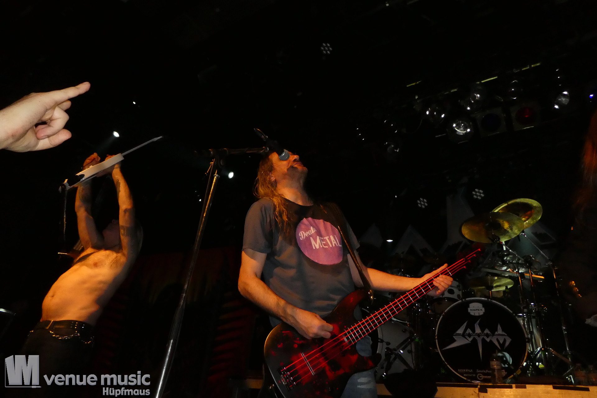 Um ca. 20.45 Uhr ging es dann weiter mit Sodom. Und da muss man sagen: das war grandios. Ziemlich genau 2 Stunden gab es einen Kracher nach dem anderen – manchmal auch auf Zuruf aus dem Publikum. „Das haben wir nicht geprobt, aber wir geben unser bestes“ – und was soll ich sagen: das rockte so richtig. Hier war nichts perfekt einstudiert, keine durchchoreografierte Show, aber das musste es auch nicht. Zack auf die Bühne ab dafür und Spaß haben – so muss das. Nah dran am Publikum (danke Tom für das Plec :) ) Musik noch so richtig zum Anfassen. Auch wenn sich anscheinend dann doch nicht (ich muss sagen zum Glück..) so viele zum Crowdsurfen animieren konnten… „früher gabs hier die geilsten Crowdsurfer – aber macht nichts kaputt“ so Tom Angelripper quasi als Aufforderung…