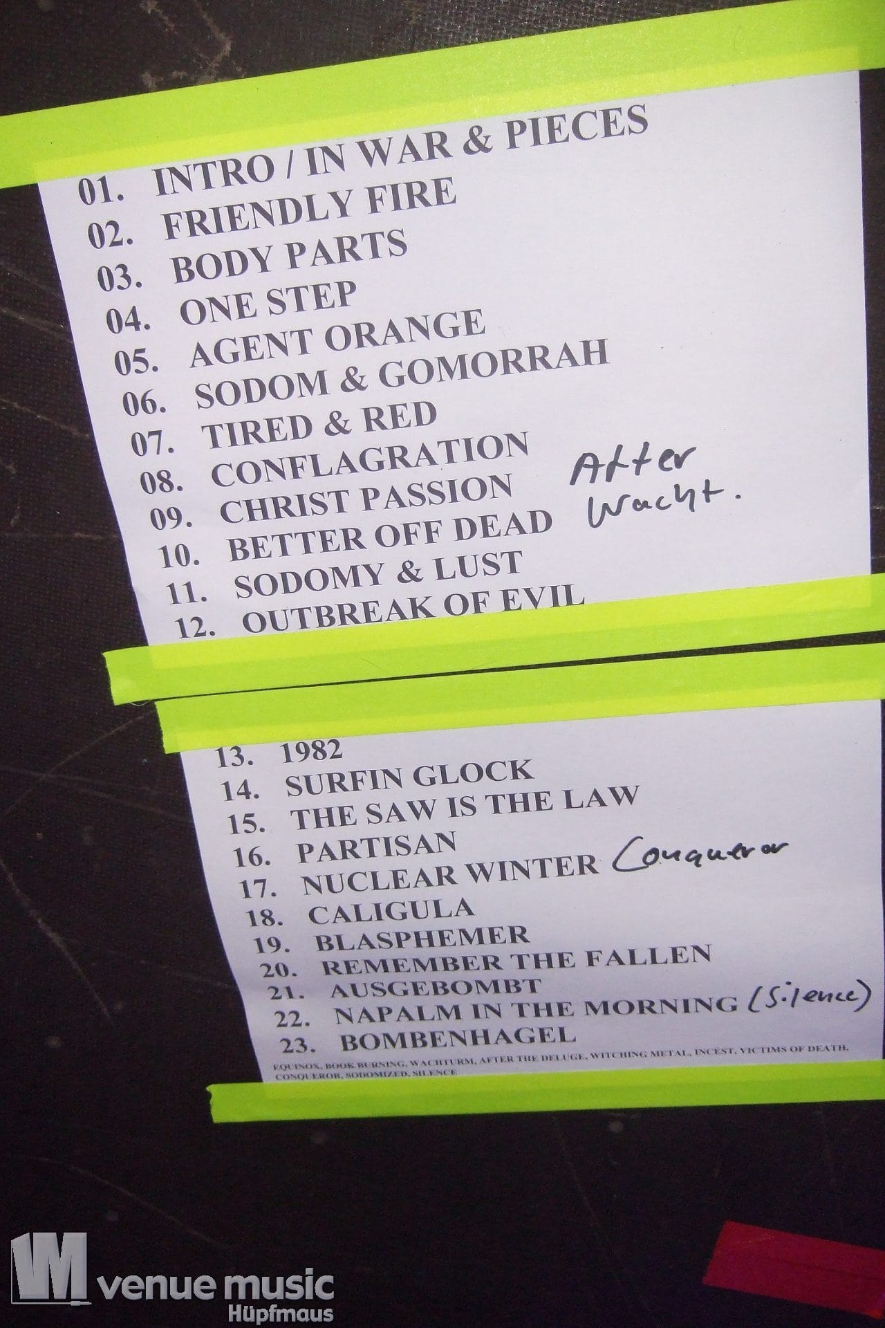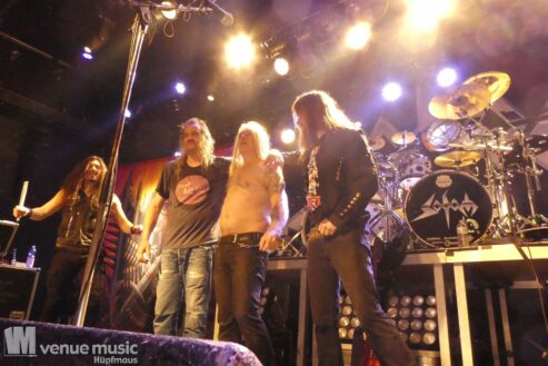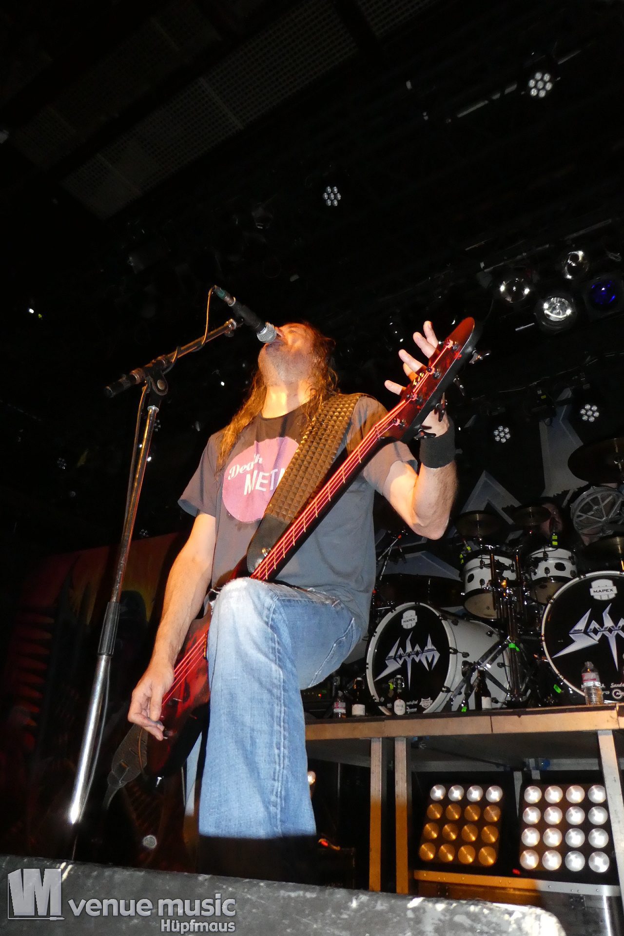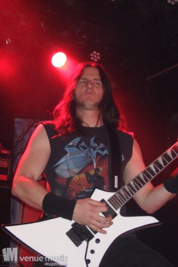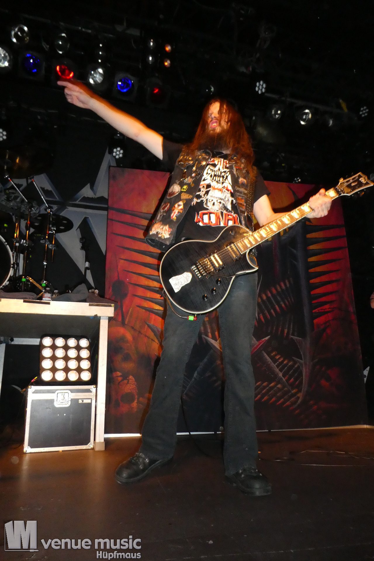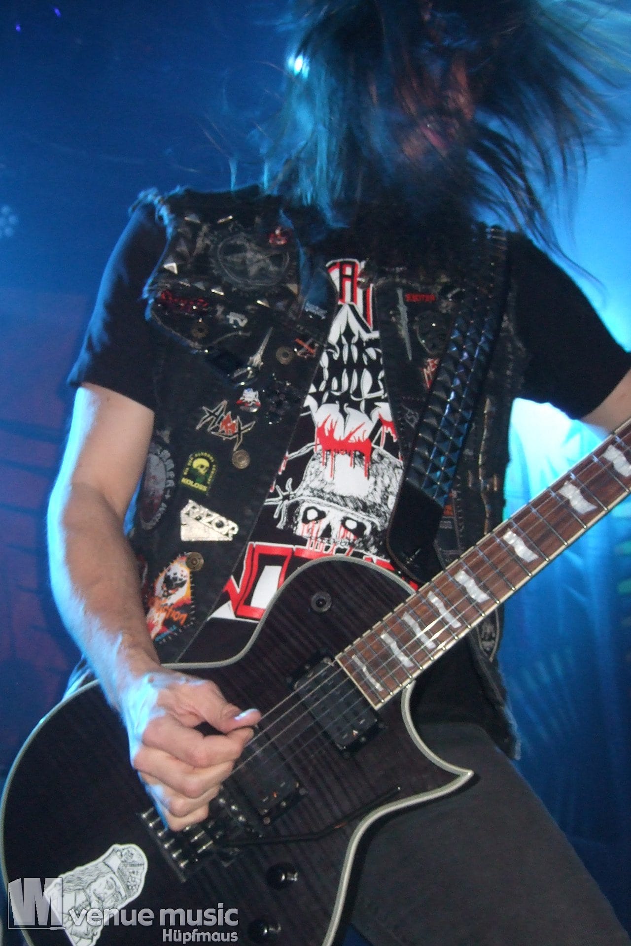 Um ca. 20.45 Uhr ging es dann weiter mit Sodom. Und da muss man sagen: das war grandios. Ziemlich genau 2 Stunden gab es einen Kracher nach dem anderen – manchmal auch auf Zuruf aus dem Publikum. „Das haben wir nicht geprobt, aber wir geben unser bestes“ – und was soll ich sagen: das rockte so richtig. Hier war nichts perfekt einstudiert, keine durchchoreografierte Show, aber das musste es auch nicht. Zack auf die Bühne ab dafür und Spaß haben – so muss das. Nah dran am Publikum (danke Tom für das Plec :) ) Musik noch so richtig zum Anfassen. Auch wenn sich anscheinend dann doch nicht (ich muss sagen zum Glück..) so viele zum Crowdsurfen animieren konnten… „früher gabs hier die geilsten Crowdsurfer – aber macht nichts kaputt“ so Tom Angelripper quasi als Aufforderung…