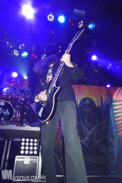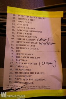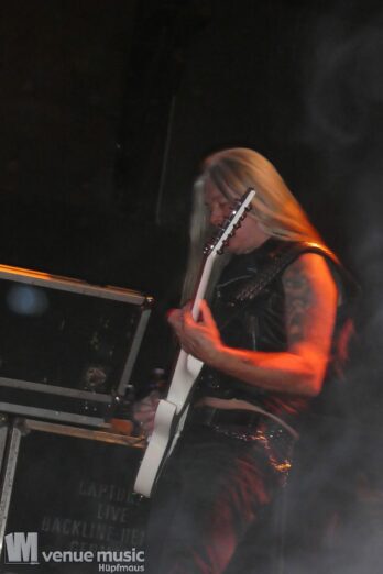 Die Zeche war auch gut gefüllt – ein, zwei Tage vorher hieß es „noch 100 Tickets übrig“ und an der Abendkasse sind dann auch noch mal einige über den Tisch gegangen. Andere Touren haben schlechte Vorverkäufe, werden abgesagt – aber nicht so hier im Pott bei Sodom! Da ist die Hütte voll. Wofür sich die Band aber auch noch mal bedankt hat. Auch ihnen hat die Livemusik gefehlt – wie uns allen. Die Stimmung in der Halle war saugeil, vor und auf der Bühne. Und vollkommen wurscht, dass Tom nächstes Jahr seinen 60sten Geburtstag feiert: sie gehen nicht schon nach 45 Minuten oder so von der Bühne (explizite Ansage ;) ). Inzwischen ist es ja – grade bei double-Headliner Touren – schon normal, dass die Hauptbands nur ca 70-75 Minuten spielen. Aber nicht mit Sodom ;)