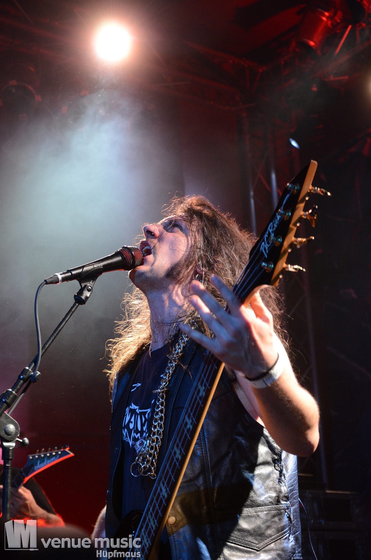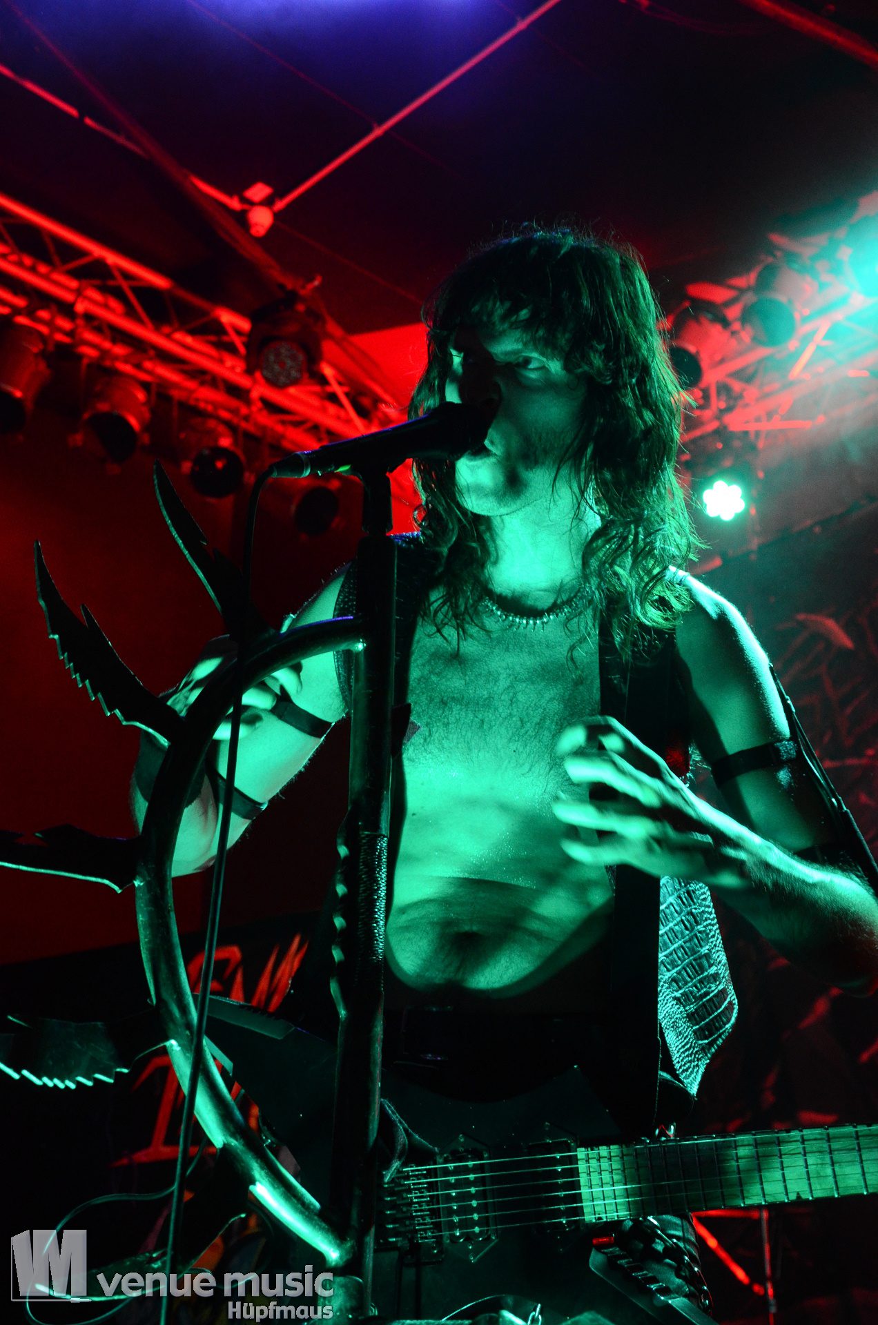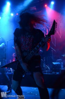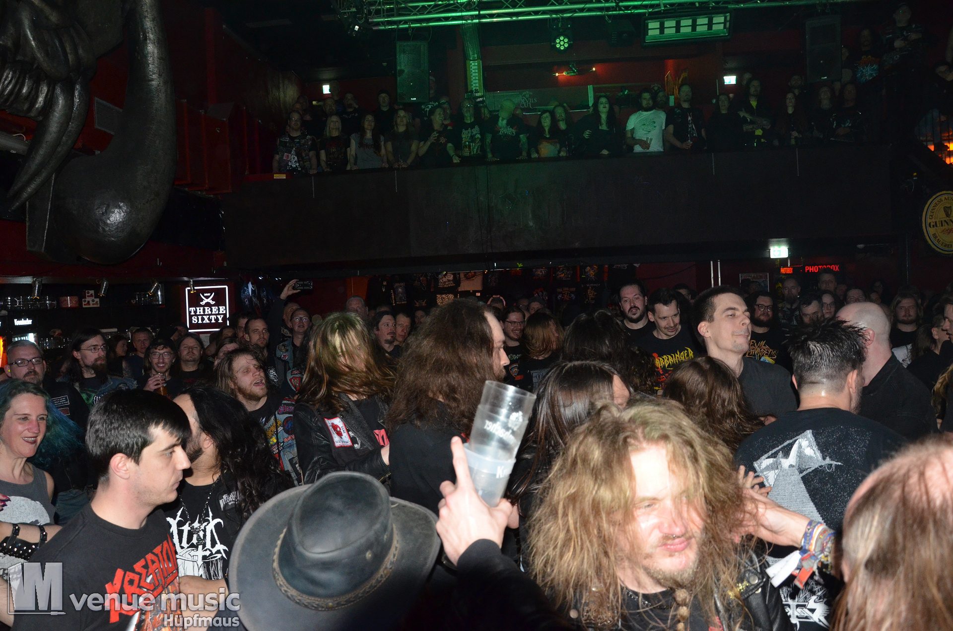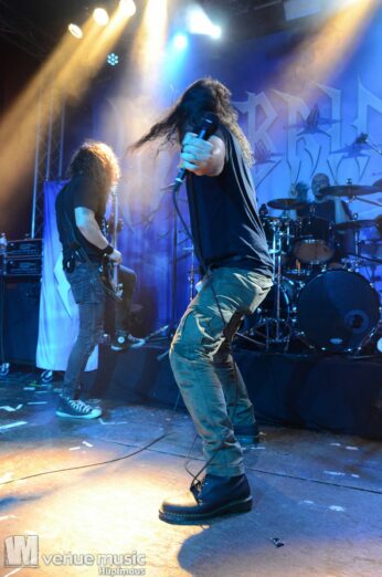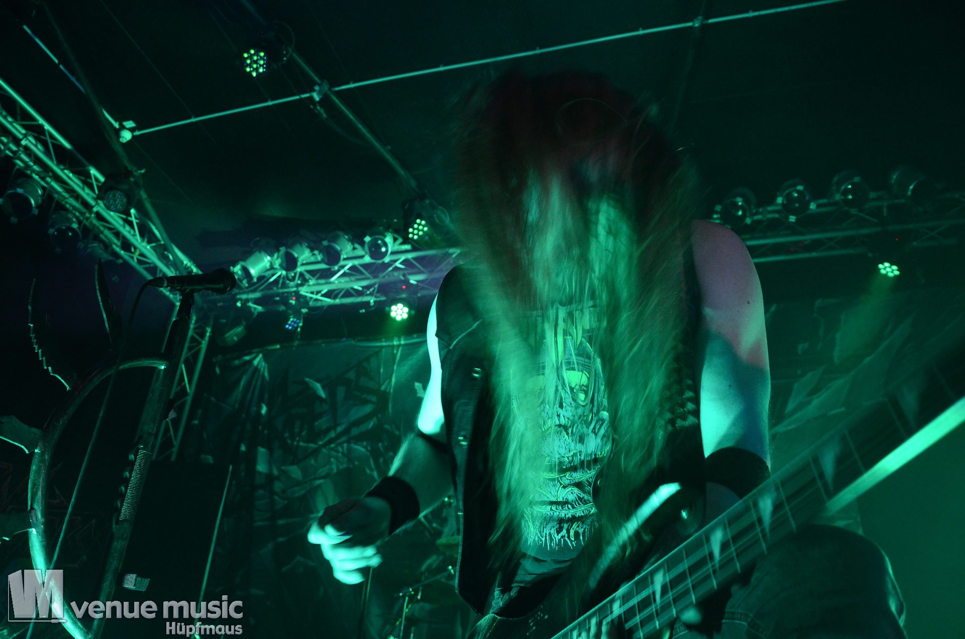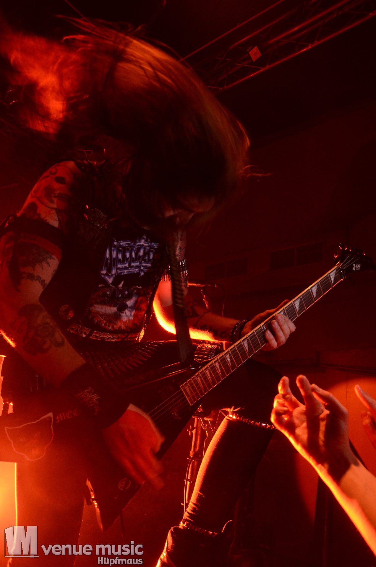 Warbringer haben dann alles so richtig weggeblasen. Der Sound war zwar generell nicht so der Bringer, aber das ist leider im Turock in der ersten Reihe oft so – man steht halt genau unter den Boxen, die an der Decke hängen und bekommt den Sound von da nicht ab. Egal, Spaß hats trotzdem gemacht. Auch auf der Bühne war so richtig Action. Die Jungs haben Gas gegeben ohne Ende. Es war auch voll, aber angenehm voll, eigentlich war es bis auf ein bisschen Moshpit entspannt – bis auf den einen Typen, der doch schon recht angetrunken war und bereits bei Evil Invaders augenscheinlich nicht mehr selber grade stehen konnte. Nervte dann auf Dauer, wenn ein mind 1,90 großer gefühlt mind. 120 kg schwerer Typ genau immer auf den Mädels vorne drauf hängt. Sonst hat nämlich niemand gedrängelt. (Die Duftmarke, wenn man leider nun mal genau das Gesicht auf Achselhöhe von dem hat und der mit ausgestrecktem Arm immer versucht, sich vor zu drängeln und sich auf einen drauf legt, die beschreibe ich auch mal nicht *fg*) Aber mit vereinten Kräften haben wir ihn dann klar gemacht, dass das scheisse ist ;) und dann war Ruhe…