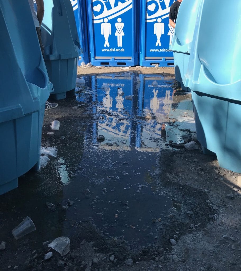 Symbolisch steht auch der Pisseteich für den Gigantismus des Veranstalters. Bereits mittags stand im Pissoirbereich knöcheltief das Urin, weil man wohl nicht damit gerechnet hatte, dass viele Männer viel pissen müssen. Also lief alles über. Auswechseln? Fehlanzeige. Da relativierte sich meine Beobachtung kurz zuvor, dass es auf Festivals immer dieses eine Arschloch gibt, dass direkt neben freien Pissoirs steht und gegen den Zaun strullt. Kurze Zeit später landete eh alles auf dem Boden.