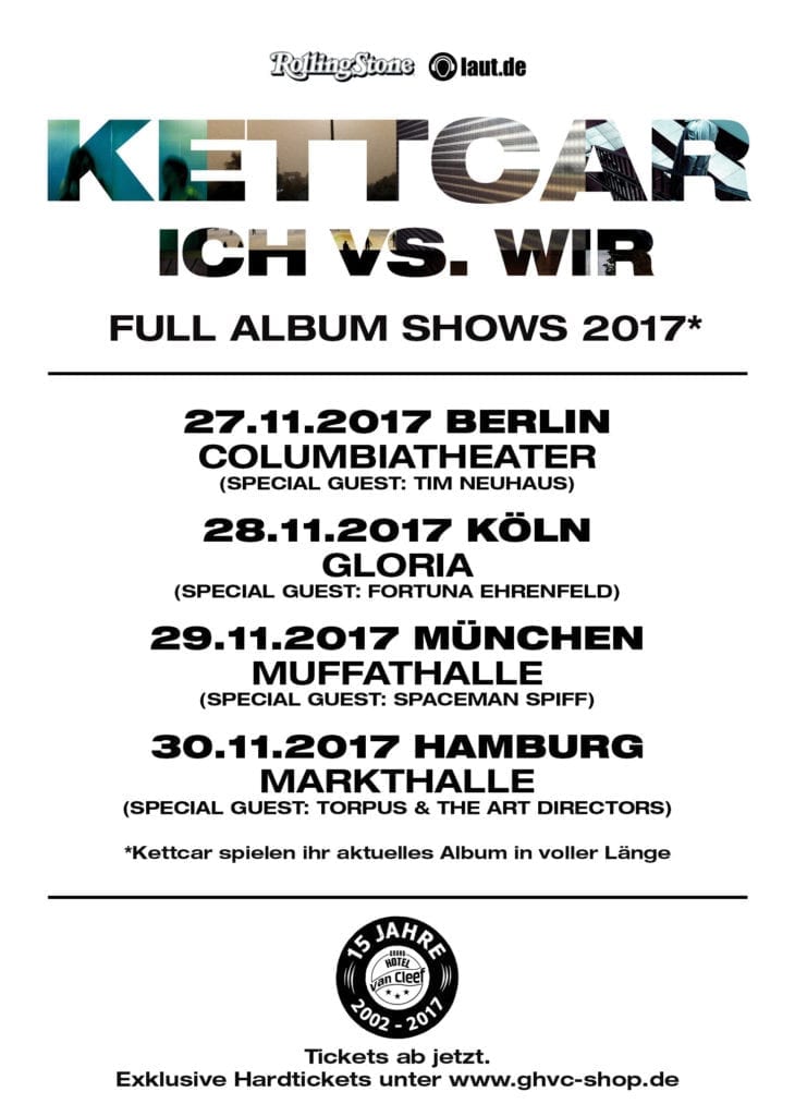 Während andere Bands Full Album Shows mit alten Veröffentlichungen machen, nehmen sich Kettcar dafür ihr aktuelles Album „Ich vs. Wir“(*) vor, das aktuell auf Platz 5 der deutschen Albumcharts eingestiegen ist. In Berlin, Köln, München und Hamburg werden sie Ende November das Album komplett live spielen: