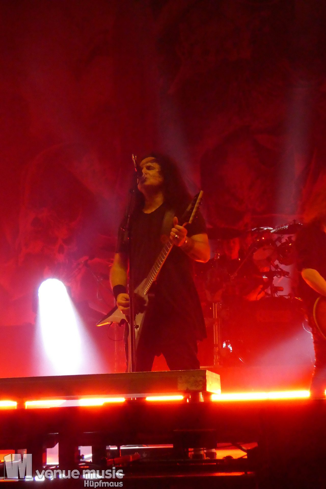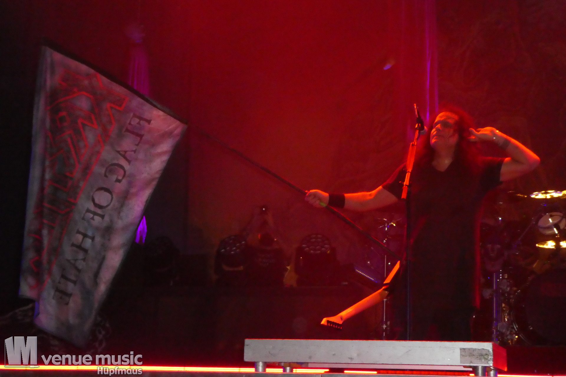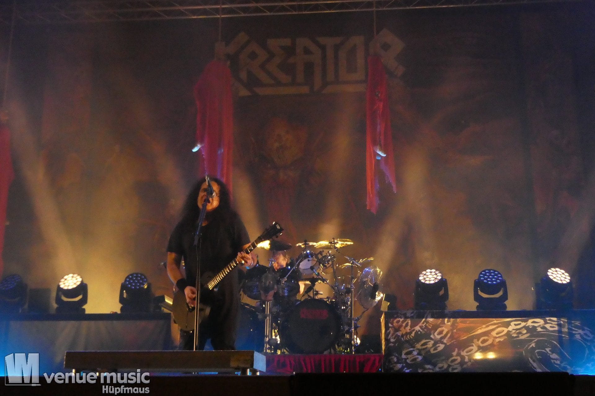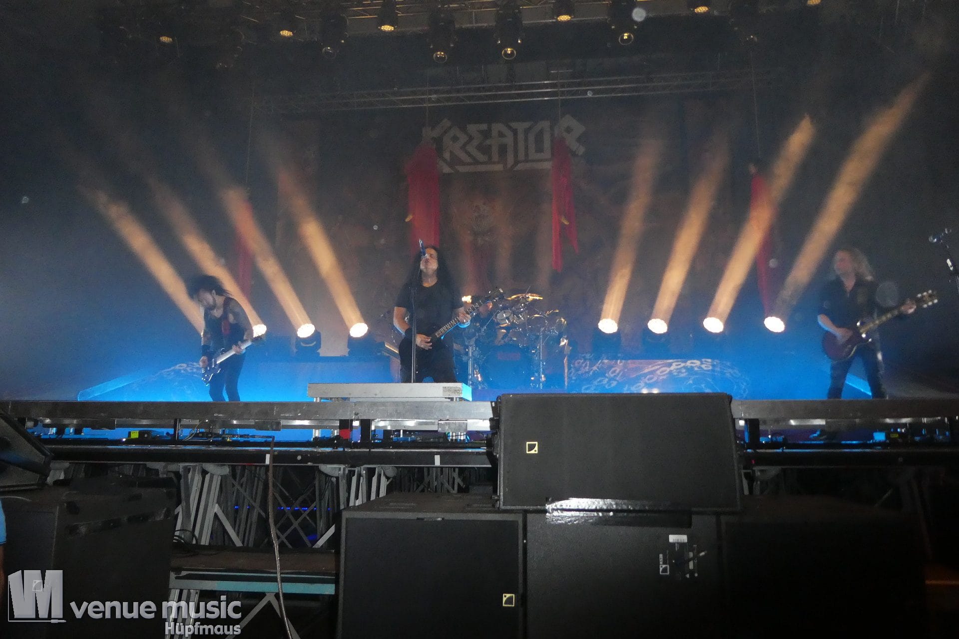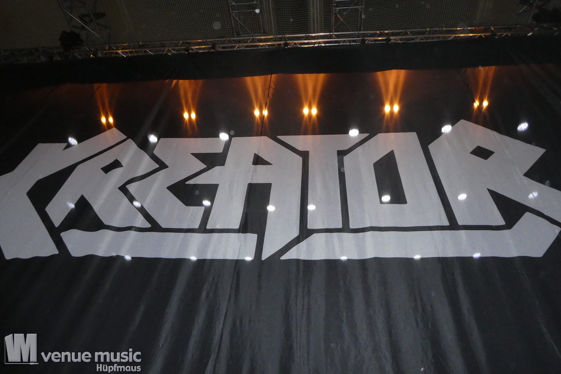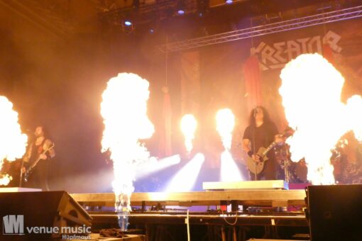 Ja, das mit dem Spaß hörte spätestens auf, das Kreator die Bühne betraten. Denn Kreator in der Gruga bedeutet Krieg! Aber wirklich. Leider gab es keinen Wellenbrecher. Hatten es ja zunächst gehofft, da die Security denen, die schon früh da waren, ein Bändchen brachte. Allerdings war dieses zwar für den Innenraum und es wurde schon wohl das Kontingent für den Innenraum begrenzt (es gab nur eine Kategorie Karten, da das Konzert ursprünglich in der Turbinenhalle hätte sein sollen), wer zu spät kam, musste auf dem Rang mit einem Sitzplatz vorlieb nehmen, aber leider reicht das einfach – grade bei Kreator – nicht aus. Der Druck vorne war so immens, dass nicht nur das Mädel, was am Anfang hinter mir stand, sich sehr schnell raus ziehen lassen musste, selbst der ca 1,90m große Typ, der echt versucht hat, den Druck ein wenig abzumildern, hat nach ca der Hälfte des Sets aufgegeben und sich von der Grabensecurity vorne raus heben lassen. Es war echt nicht lustig. Und zur Frage, warum ich mir das dann antue: weil es an sich zwar nun mal ein Metalkonzert und kein Kindergeburtstag ist, einiges an Druck von hinten und Crowdsurfer und alle das nun mal dazu gehört, es aber meistens nicht so derbe schlimm wird. Und man nun mal einfach so nah an der Bühne ist, den Musikern quasi in die Augen schauen kann. Wenn ich weiter hinten stehe, sehe ich ja nix. Da kann ich auch ne DVD schauen. Und zweite oder dritte Reihe war da noch schlimmer denke ich. Da ists von allen Seiten heiss und ich seh nicht mal was im schlimmsten Fall… Man muss da halt durch und ich bin auch nicht zimperlich, aber das grenzte mal wieder echt an Körperverletzung. Da war ich dann tatsächlich ein bisschen froh, dass sie nur 14 Songs gespielt haben. Eigentlich sogar nur 13, denn von „Awakening of the Gods“ war nur das Intro im Set. Was an sich echt unfassbar wenig ist für einen Headliner. Co-Headliner-Tour hin oder her…(allerdings haben Kreator 2014+2017 auch nur je 2 Songs mehr auf der Setlist gehabt) So fehlten natürlich diverse Songs. Vom aktuellen Album „Hate über alles“ gabs grade mal 3 Songs, von der „Gods of Violence“ 2 und sonst von den Alben immer nur einen Titel – meist den Titeltrack des Albums eben.. Klassiker wie „Extreme Aggressions“ oder „Tormentor“ fehlten echt sehr – und für mich hätten auch gerne noch mehr Songs von der „Phantom Antichrist“ und der „Gods of Violence“ dabei sein können, die ich echt geil finde. Auch wenn sie keine „Klassiker-Alben“ sind. Aber bei grade mal ca. 75 min Spielzeit ist das halt nicht drin. Sehr schade. Einen Gastauftritt hatte Sofia Portanet bei „Midnight Sun“ (habe davon immer noch einen Ohrwurm.. ).
