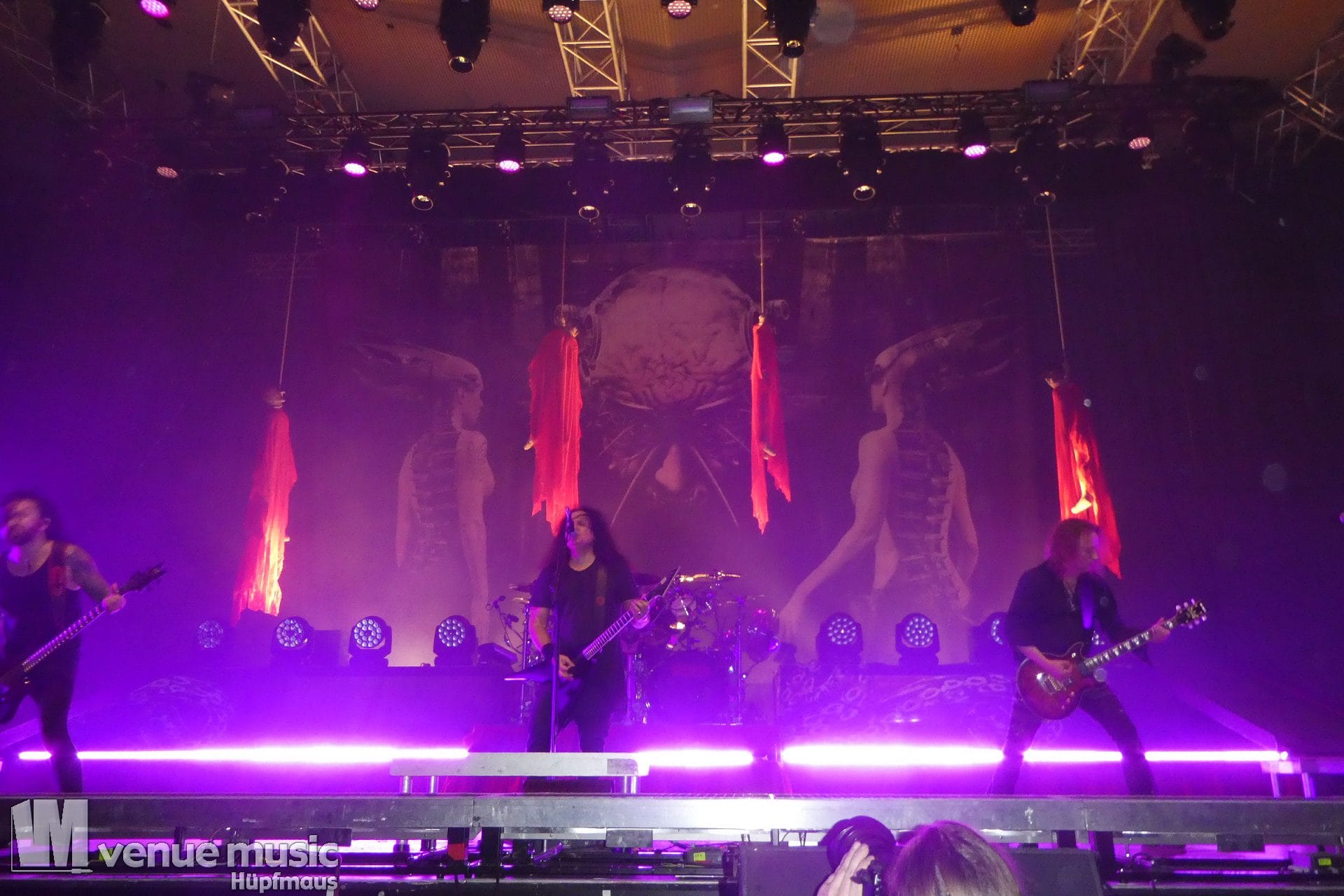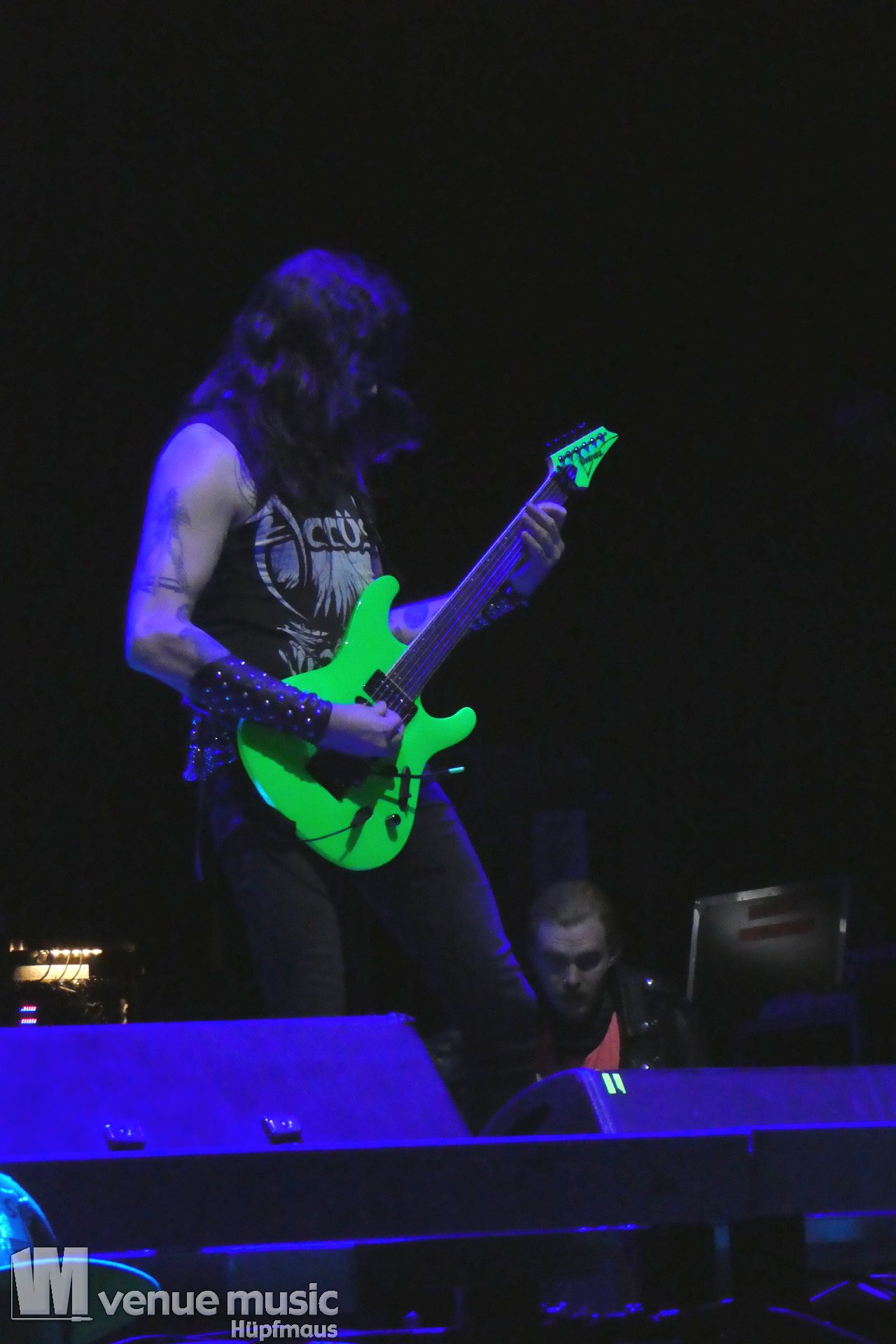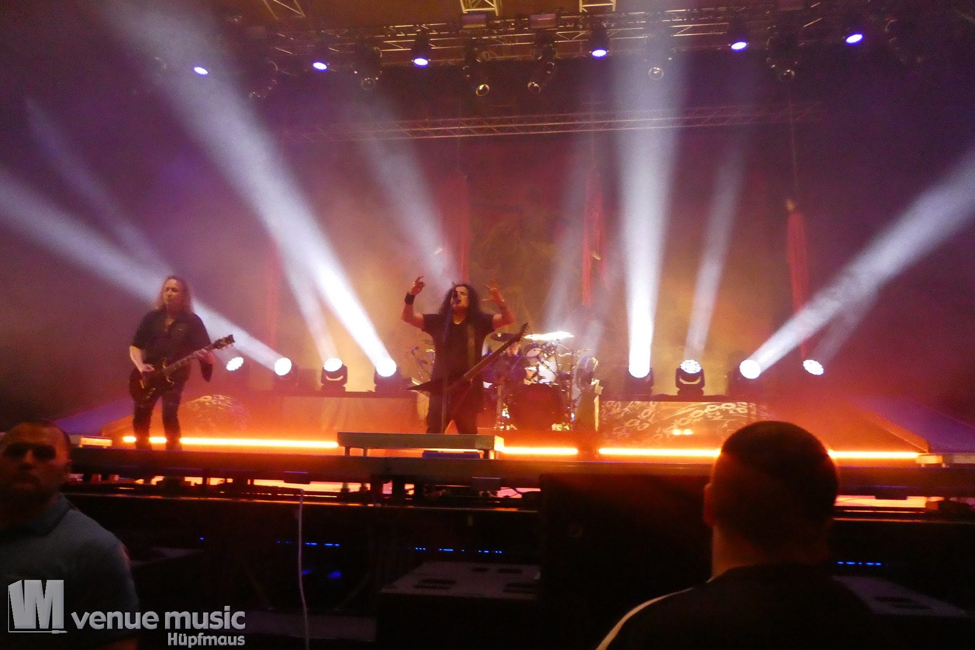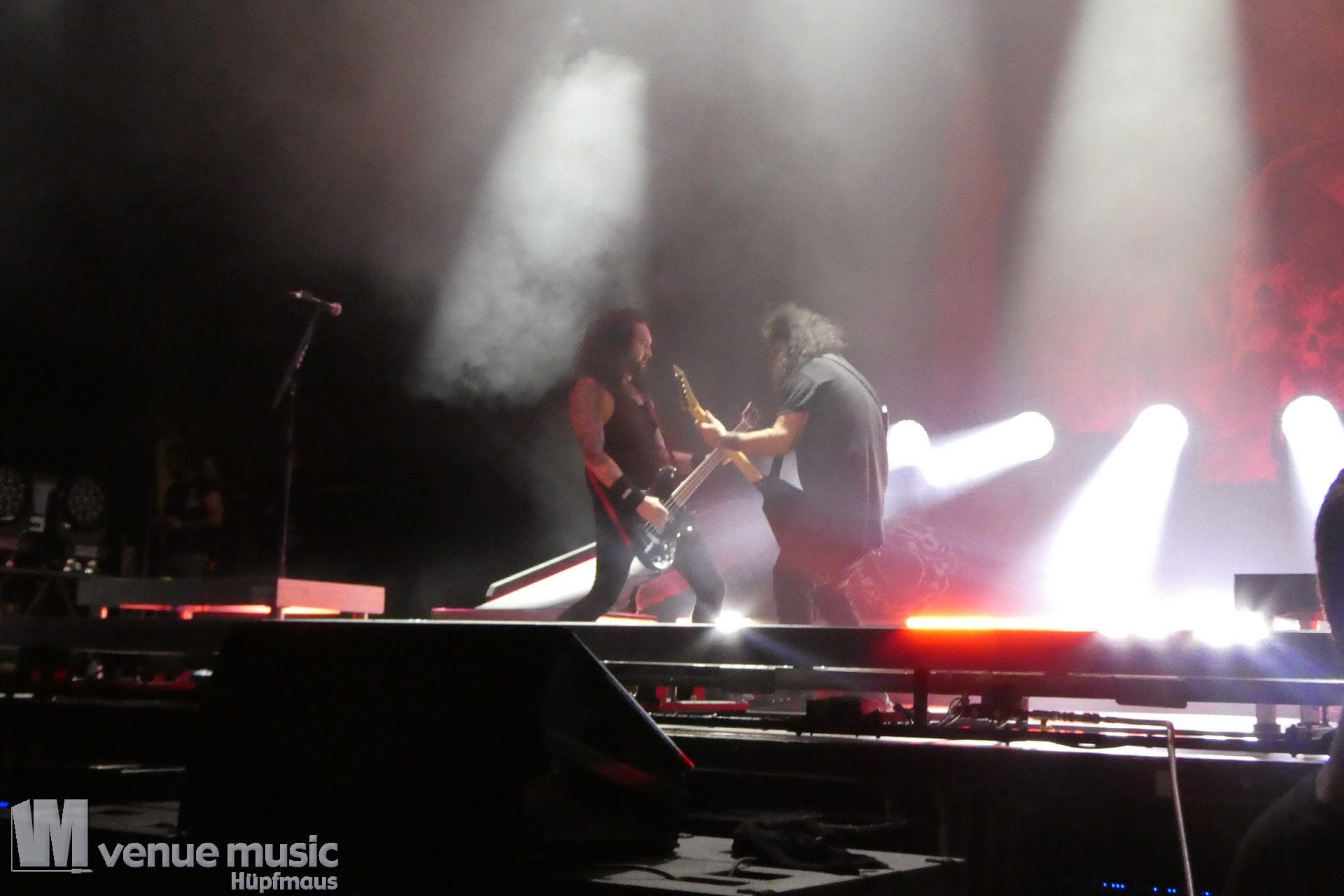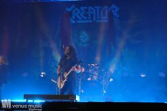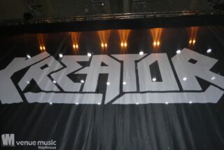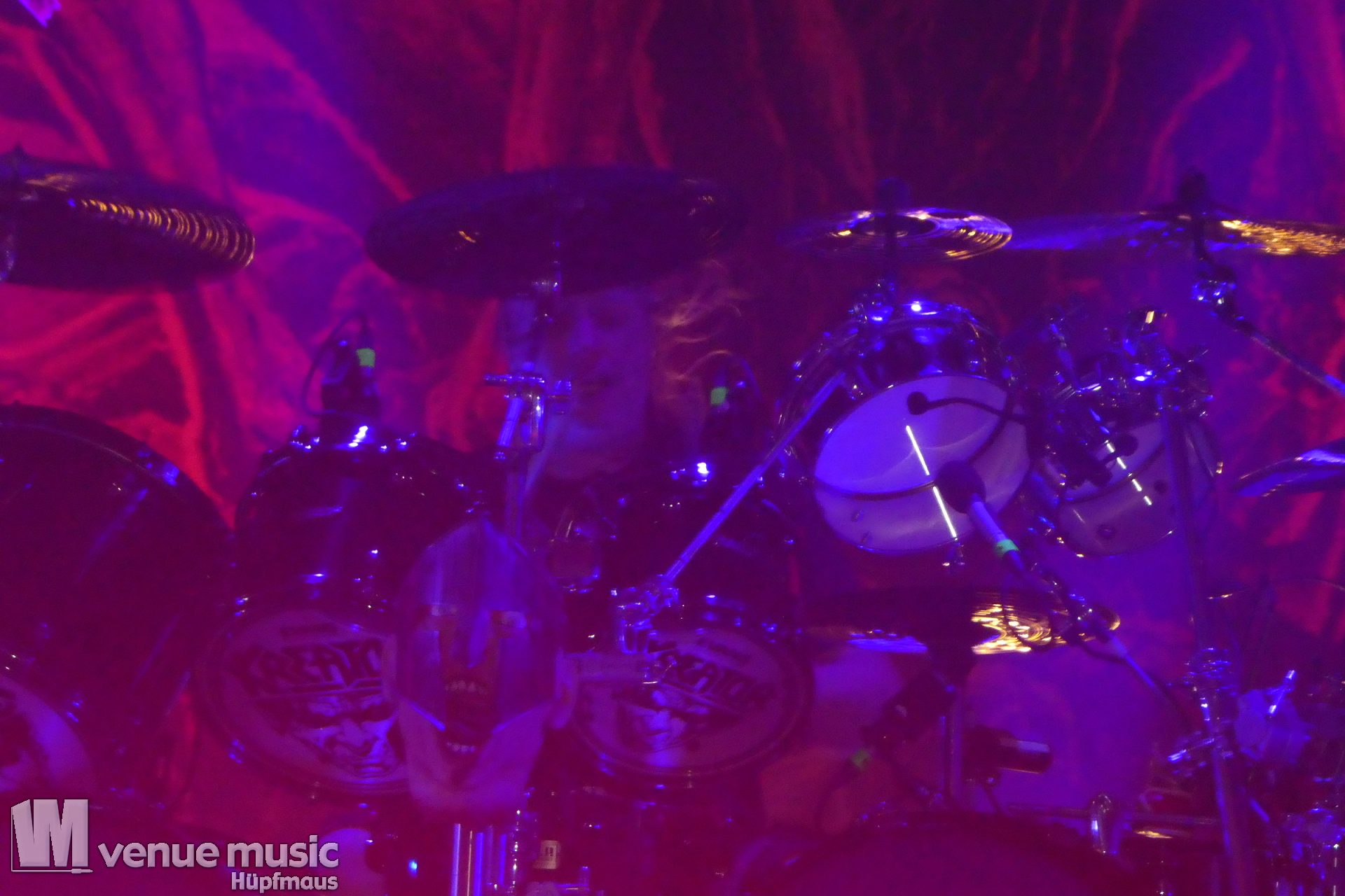 Ja, das mit dem Spaß hörte spätestens auf, das Kreator die Bühne betraten. Denn Kreator in der Gruga bedeutet Krieg! Aber wirklich. Leider gab es keinen Wellenbrecher. Hatten es ja zunächst gehofft, da die Security denen, die schon früh da waren, ein Bändchen brachte. Allerdings war dieses zwar für den Innenraum und es wurde schon wohl das Kontingent für den Innenraum begrenzt (es gab nur eine Kategorie Karten, da das Konzert ursprünglich in der Turbinenhalle hätte sein sollen), wer zu spät kam, musste auf dem Rang mit einem Sitzplatz vorlieb nehmen, aber leider reicht das einfach – grade bei Kreator – nicht aus. Der Druck vorne war so immens, dass nicht nur das Mädel, was am Anfang hinter mir stand, sich sehr schnell raus ziehen lassen musste, selbst der ca 1,90m große Typ, der echt versucht hat, den Druck ein wenig abzumildern, hat nach ca der Hälfte des Sets aufgegeben und sich von der Grabensecurity vorne raus heben lassen. Es war echt nicht lustig. Und zur Frage, warum ich mir das dann antue: weil es an sich zwar nun mal ein Metalkonzert und kein Kindergeburtstag ist, einiges an Druck von hinten und Crowdsurfer und alle das nun mal dazu gehört, es aber meistens nicht so derbe schlimm wird. Und man nun mal einfach so nah an der Bühne ist, den Musikern quasi in die Augen schauen kann. Wenn ich weiter hinten stehe, sehe ich ja nix. Da kann ich auch ne DVD schauen. Und zweite oder dritte Reihe war da noch schlimmer denke ich. Da ists von allen Seiten heiss und ich seh nicht mal was im schlimmsten Fall… Man muss da halt durch und ich bin auch nicht zimperlich, aber das grenzte mal wieder echt an Körperverletzung. Da war ich dann tatsächlich ein bisschen froh, dass sie nur 14 Songs gespielt haben. Eigentlich sogar nur 13, denn von „Awakening of the Gods“ war nur das Intro im Set. Was an sich echt unfassbar wenig ist für einen Headliner. Co-Headliner-Tour hin oder her…(allerdings haben Kreator 2014+2017 auch nur je 2 Songs mehr auf der Setlist gehabt) So fehlten natürlich diverse Songs. Vom aktuellen Album „Hate über alles“ gabs grade mal 3 Songs, von der „Gods of Violence“ 2 und sonst von den Alben immer nur einen Titel – meist den Titeltrack des Albums eben.. Klassiker wie „Extreme Aggressions“ oder „Tormentor“ fehlten echt sehr – und für mich hätten auch gerne noch mehr Songs von der „Phantom Antichrist“ und der „Gods of Violence“ dabei sein können, die ich echt geil finde. Auch wenn sie keine „Klassiker-Alben“ sind. Aber bei grade mal ca. 75 min Spielzeit ist das halt nicht drin. Sehr schade. Einen Gastauftritt hatte Sofia Portanet bei „Midnight Sun“ (habe davon immer noch einen Ohrwurm.. ).