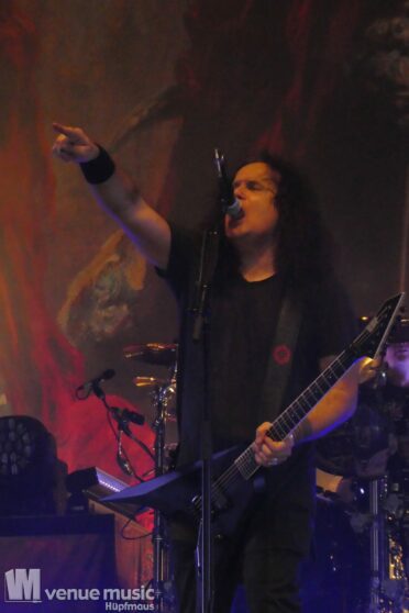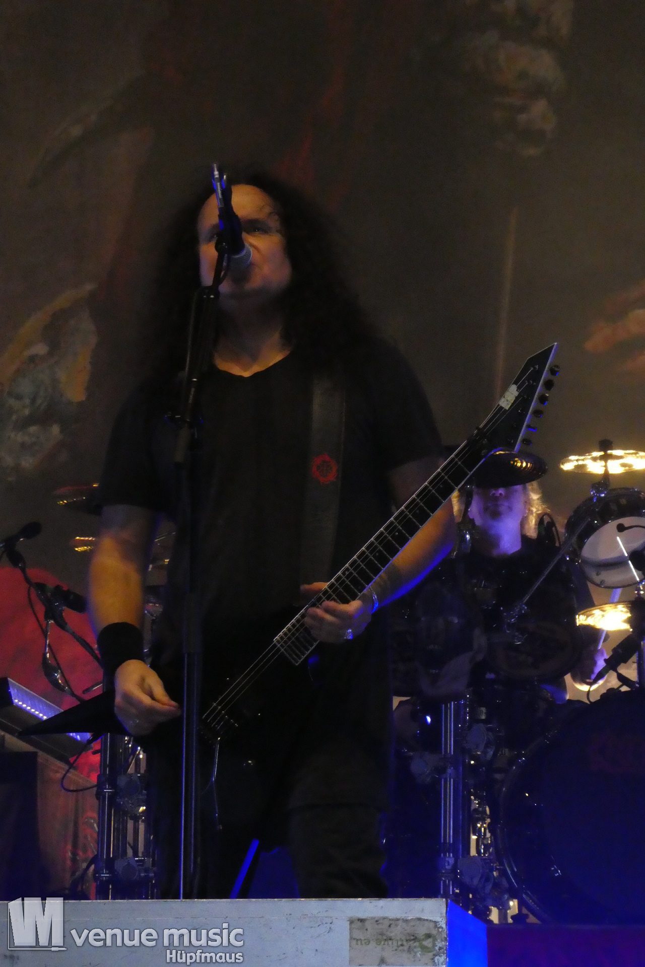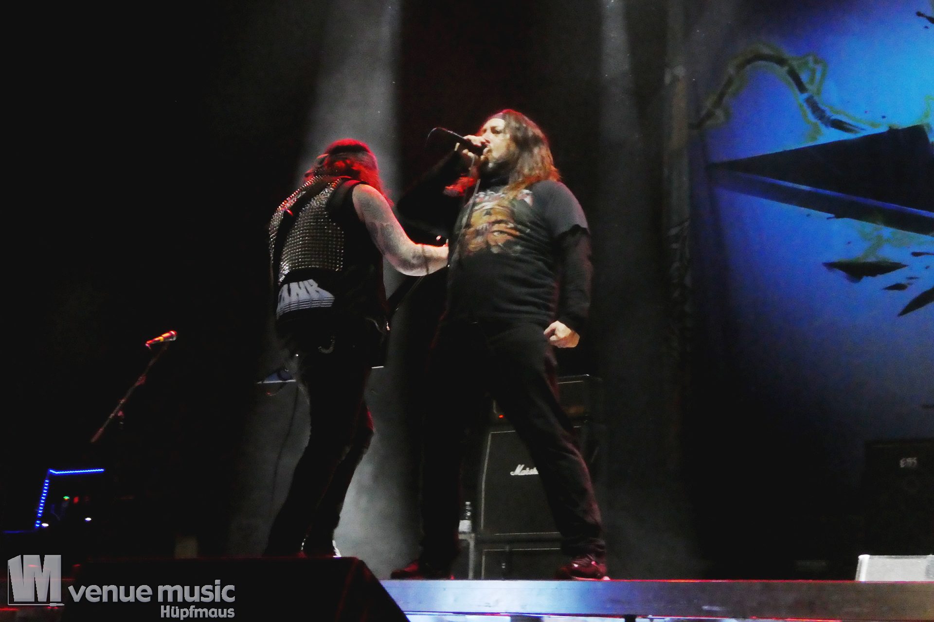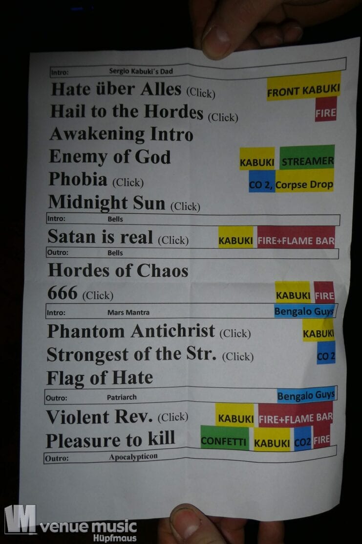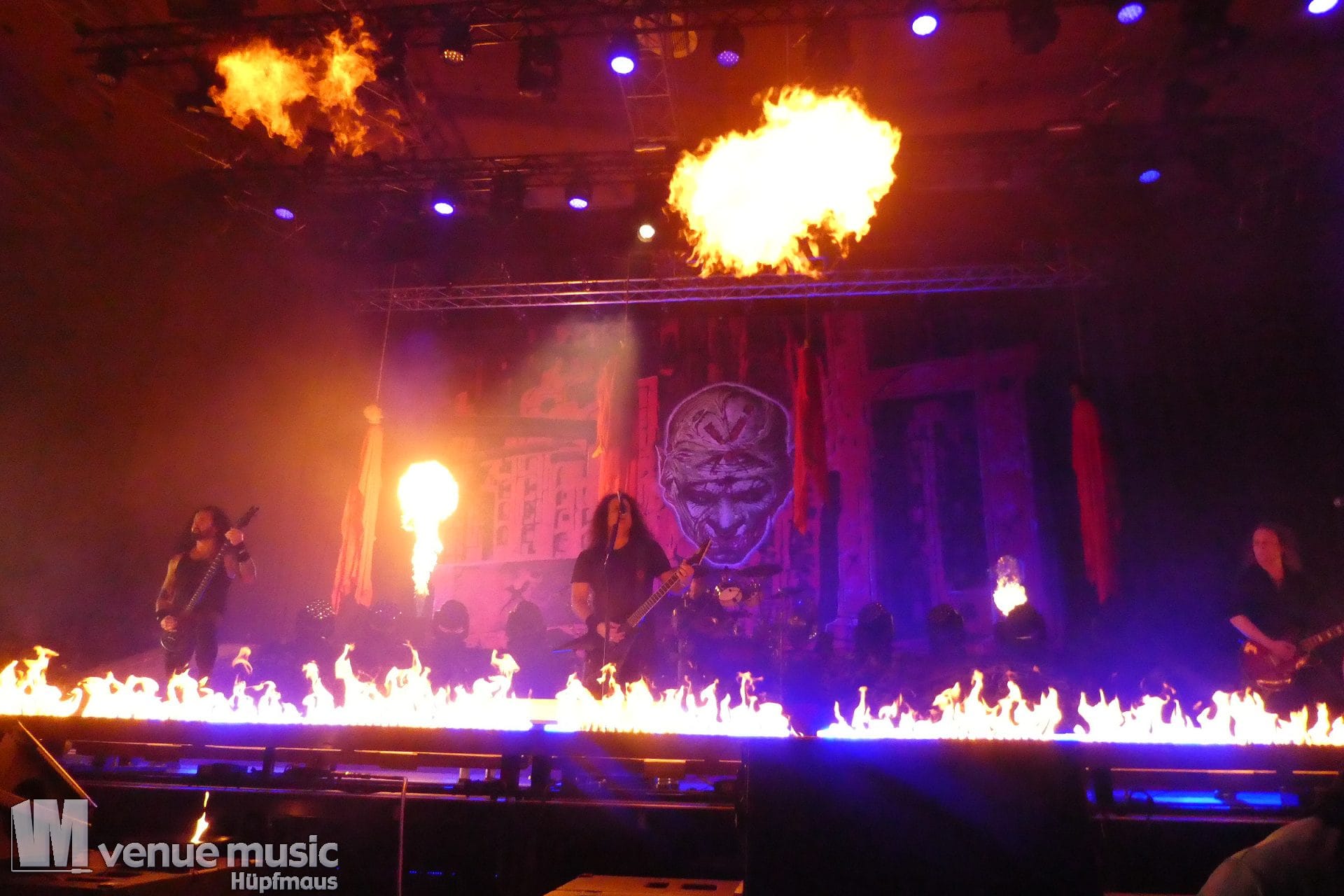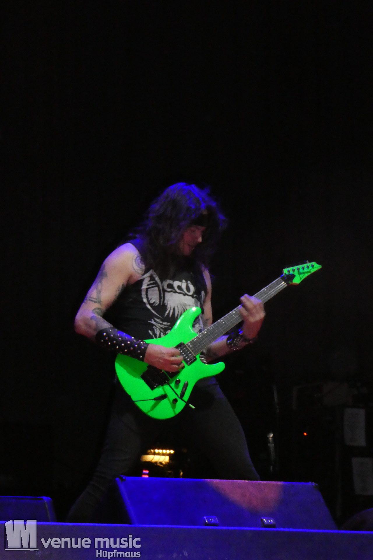 Ja, das mit dem Spaß hörte spätestens auf, das Kreator die Bühne betraten. Denn Kreator in der Gruga bedeutet Krieg! Aber wirklich. Leider gab es keinen Wellenbrecher. Hatten es ja zunächst gehofft, da die Security denen, die schon früh da waren, ein Bändchen brachte. Allerdings war dieses zwar für den Innenraum und es wurde schon wohl das Kontingent für den Innenraum begrenzt (es gab nur eine Kategorie Karten, da das Konzert ursprünglich in der Turbinenhalle hätte sein sollen), wer zu spät kam, musste auf dem Rang mit einem Sitzplatz vorlieb nehmen, aber leider reicht das einfach – grade bei Kreator – nicht aus. Der Druck vorne war so immens, dass nicht nur das Mädel, was am Anfang hinter mir stand, sich sehr schnell raus ziehen lassen musste, selbst der ca 1,90m große Typ, der echt versucht hat, den Druck ein wenig abzumildern, hat nach ca der Hälfte des Sets aufgegeben und sich von der Grabensecurity vorne raus heben lassen. Es war echt nicht lustig. Und zur Frage, warum ich mir das dann antue: weil es an sich zwar nun mal ein Metalkonzert und kein Kindergeburtstag ist, einiges an Druck von hinten und Crowdsurfer und alle das nun mal dazu gehört, es aber meistens nicht so derbe schlimm wird. Und man nun mal einfach so nah an der Bühne ist, den Musikern quasi in die Augen schauen kann. Wenn ich weiter hinten stehe, sehe ich ja nix. Da kann ich auch ne DVD schauen. Und zweite oder dritte Reihe war da noch schlimmer denke ich. Da ists von allen Seiten heiss und ich seh nicht mal was im schlimmsten Fall… Man muss da halt durch und ich bin auch nicht zimperlich, aber das grenzte mal wieder echt an Körperverletzung. Da war ich dann tatsächlich ein bisschen froh, dass sie nur 14 Songs gespielt haben. Eigentlich sogar nur 13, denn von „Awakening of the Gods“ war nur das Intro im Set. Was an sich echt unfassbar wenig ist für einen Headliner. Co-Headliner-Tour hin oder her…(allerdings haben Kreator 2014+2017 auch nur je 2 Songs mehr auf der Setlist gehabt) So fehlten natürlich diverse Songs. Vom aktuellen Album „Hate über alles“ gabs grade mal 3 Songs, von der „Gods of Violence“ 2 und sonst von den Alben immer nur einen Titel – meist den Titeltrack des Albums eben.. Klassiker wie „Extreme Aggressions“ oder „Tormentor“ fehlten echt sehr – und für mich hätten auch gerne noch mehr Songs von der „Phantom Antichrist“ und der „Gods of Violence“ dabei sein können, die ich echt geil finde. Auch wenn sie keine „Klassiker-Alben“ sind. Aber bei grade mal ca. 75 min Spielzeit ist das halt nicht drin. Sehr schade. Einen Gastauftritt hatte Sofia Portanet bei „Midnight Sun“ (habe davon immer noch einen Ohrwurm.. ).