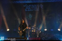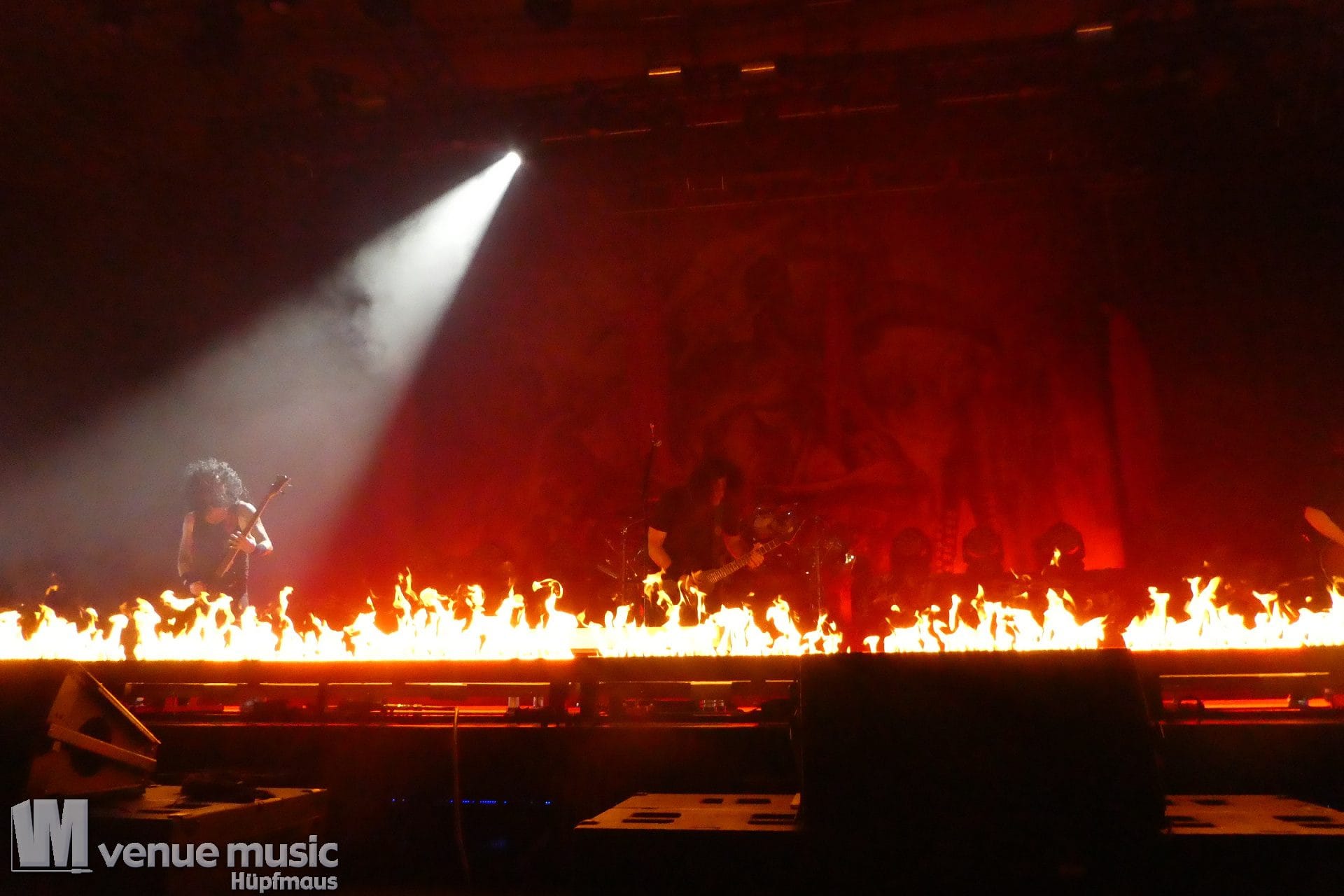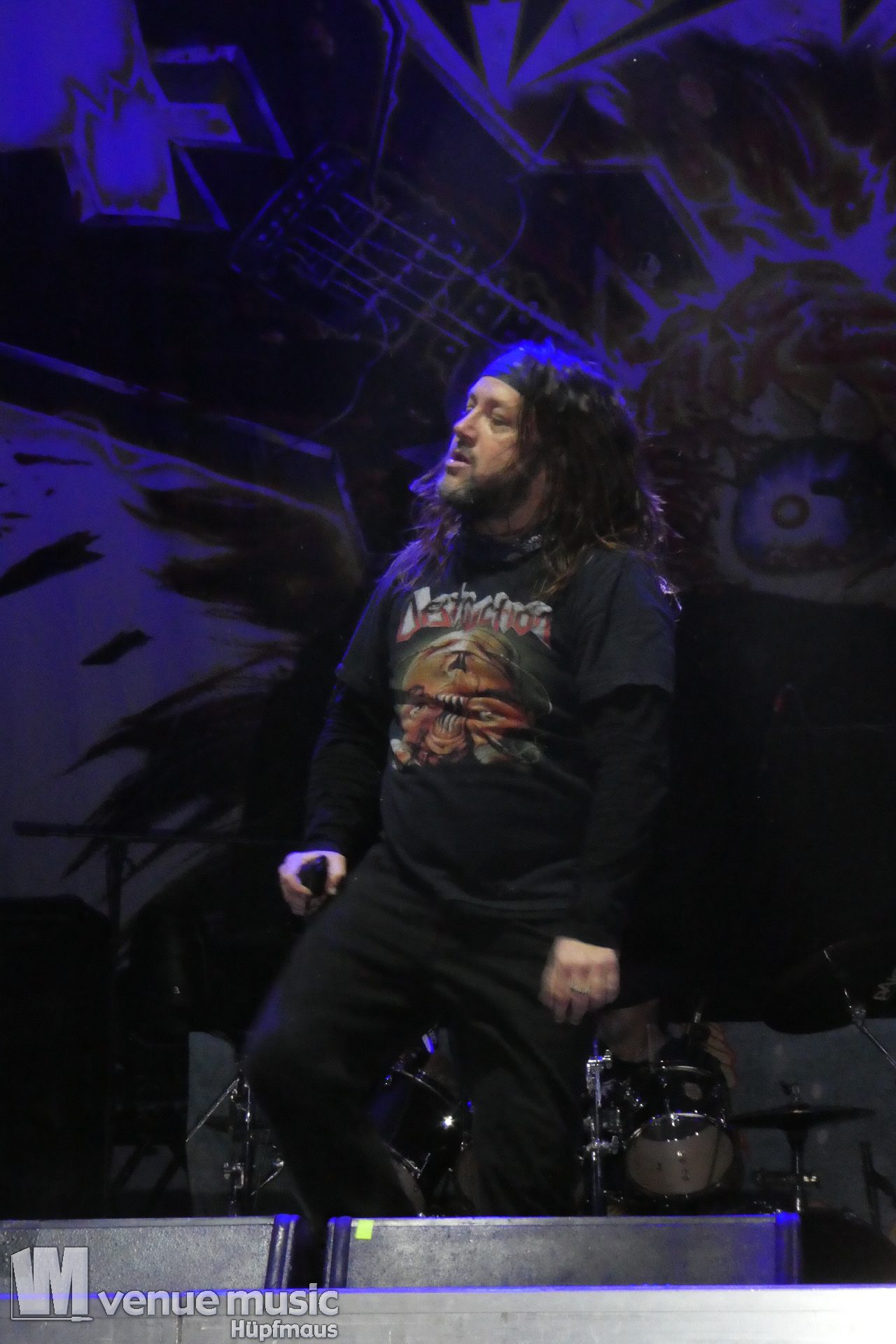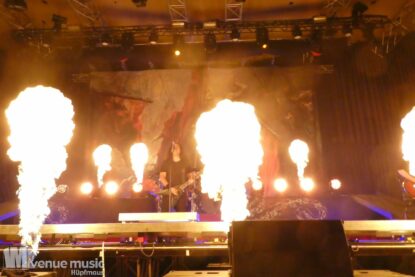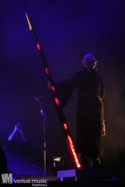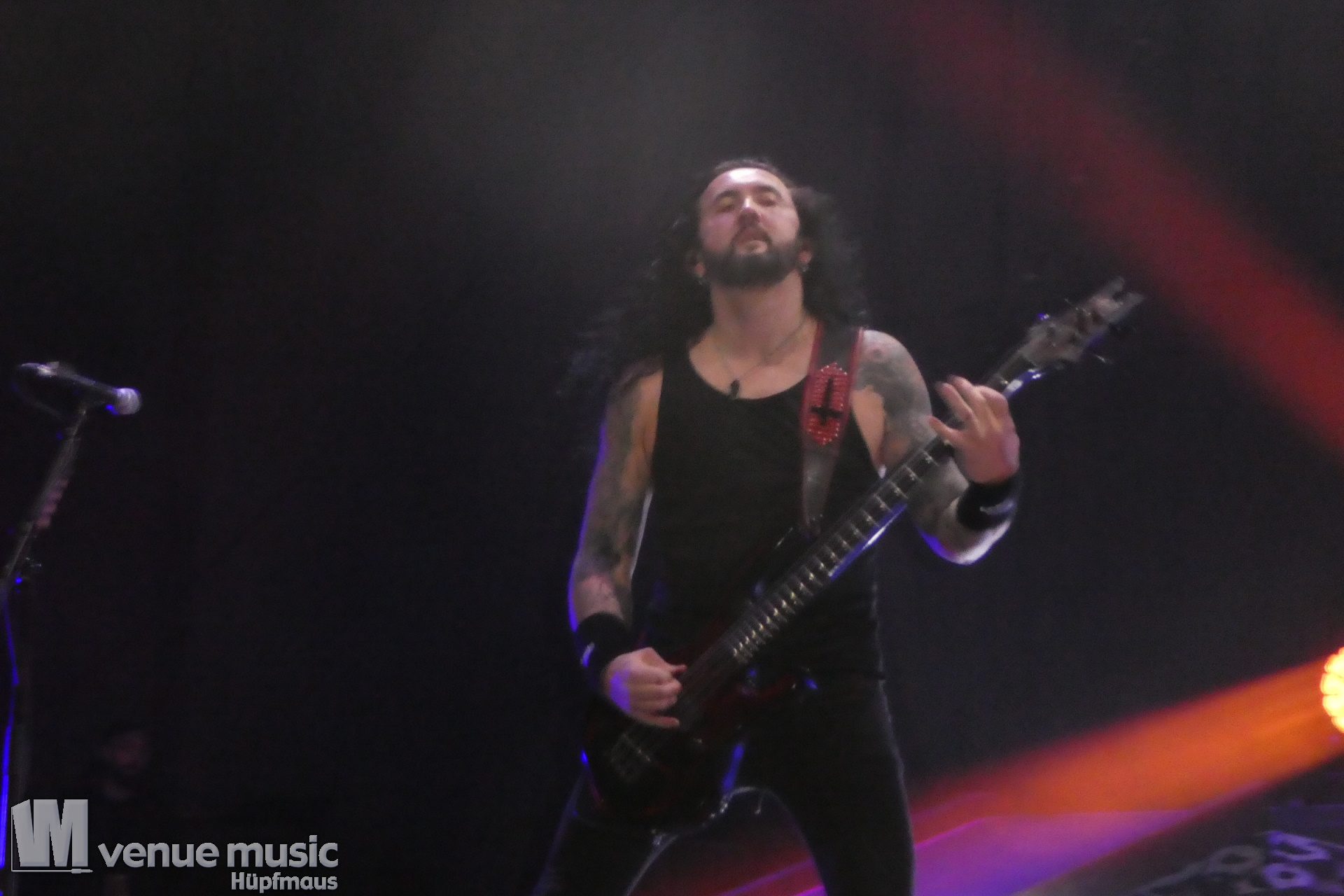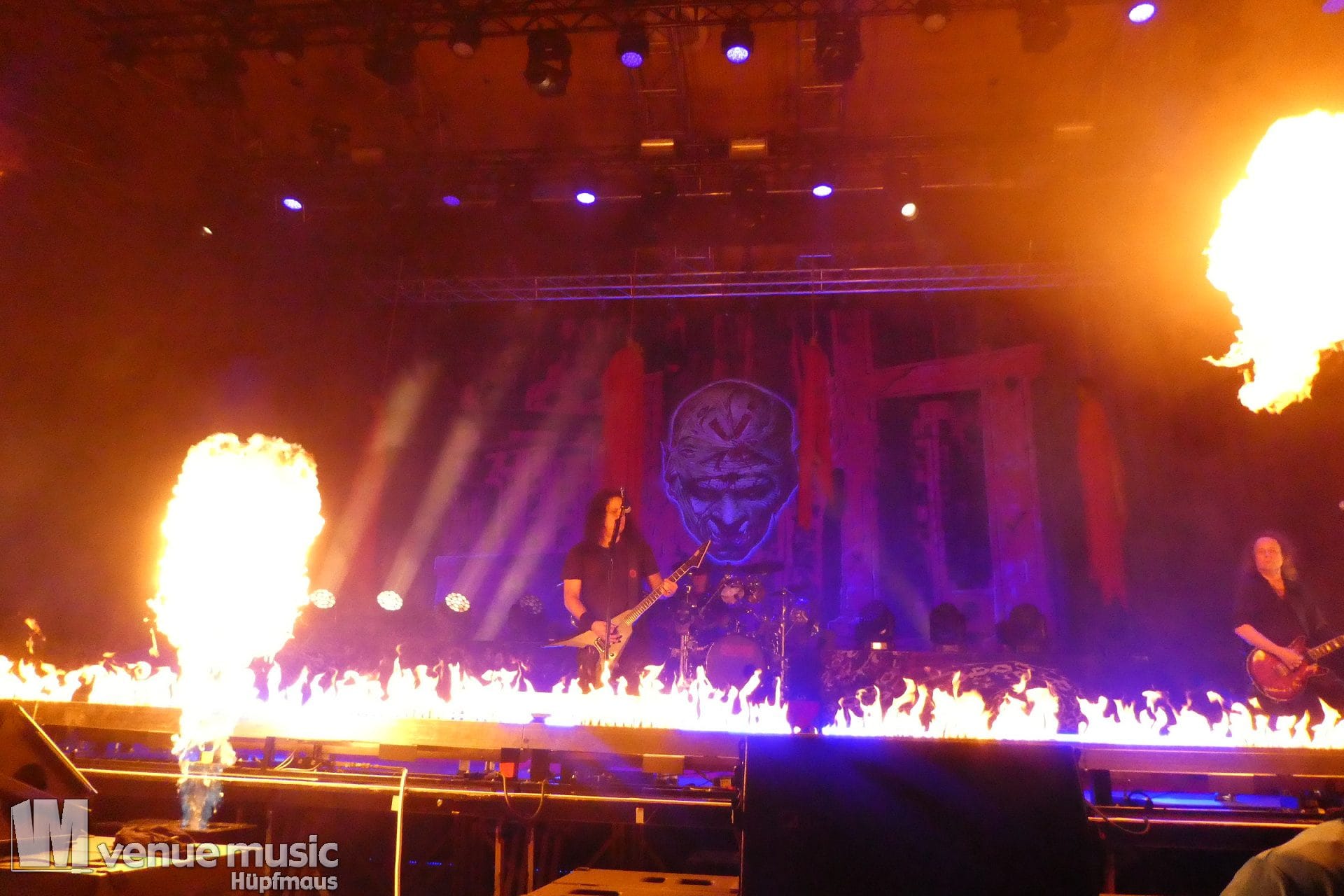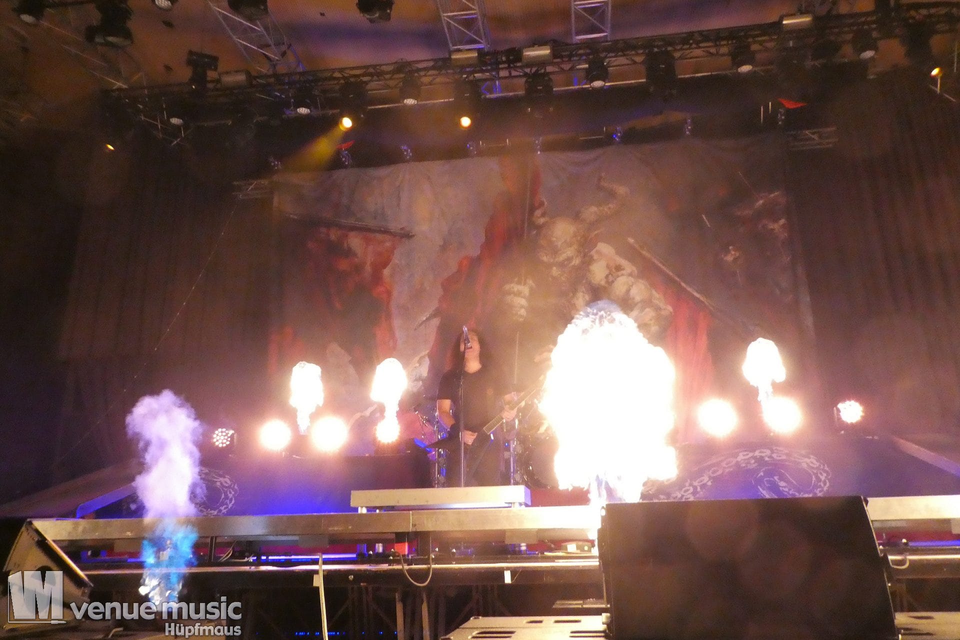 Ja, das mit dem Spaß hörte spätestens auf, das Kreator die Bühne betraten. Denn Kreator in der Gruga bedeutet Krieg! Aber wirklich. Leider gab es keinen Wellenbrecher. Hatten es ja zunächst gehofft, da die Security denen, die schon früh da waren, ein Bändchen brachte. Allerdings war dieses zwar für den Innenraum und es wurde schon wohl das Kontingent für den Innenraum begrenzt (es gab nur eine Kategorie Karten, da das Konzert ursprünglich in der Turbinenhalle hätte sein sollen), wer zu spät kam, musste auf dem Rang mit einem Sitzplatz vorlieb nehmen, aber leider reicht das einfach – grade bei Kreator – nicht aus. Der Druck vorne war so immens, dass nicht nur das Mädel, was am Anfang hinter mir stand, sich sehr schnell raus ziehen lassen musste, selbst der ca 1,90m große Typ, der echt versucht hat, den Druck ein wenig abzumildern, hat nach ca der Hälfte des Sets aufgegeben und sich von der Grabensecurity vorne raus heben lassen. Es war echt nicht lustig. Und zur Frage, warum ich mir das dann antue: weil es an sich zwar nun mal ein Metalkonzert und kein Kindergeburtstag ist, einiges an Druck von hinten und Crowdsurfer und alle das nun mal dazu gehört, es aber meistens nicht so derbe schlimm wird. Und man nun mal einfach so nah an der Bühne ist, den Musikern quasi in die Augen schauen kann. Wenn ich weiter hinten stehe, sehe ich ja nix. Da kann ich auch ne DVD schauen. Und zweite oder dritte Reihe war da noch schlimmer denke ich. Da ists von allen Seiten heiss und ich seh nicht mal was im schlimmsten Fall… Man muss da halt durch und ich bin auch nicht zimperlich, aber das grenzte mal wieder echt an Körperverletzung. Da war ich dann tatsächlich ein bisschen froh, dass sie nur 14 Songs gespielt haben. Eigentlich sogar nur 13, denn von „Awakening of the Gods“ war nur das Intro im Set. Was an sich echt unfassbar wenig ist für einen Headliner. Co-Headliner-Tour hin oder her…(allerdings haben Kreator 2014+2017 auch nur je 2 Songs mehr auf der Setlist gehabt) So fehlten natürlich diverse Songs. Vom aktuellen Album „Hate über alles“ gabs grade mal 3 Songs, von der „Gods of Violence“ 2 und sonst von den Alben immer nur einen Titel – meist den Titeltrack des Albums eben.. Klassiker wie „Extreme Aggressions“ oder „Tormentor“ fehlten echt sehr – und für mich hätten auch gerne noch mehr Songs von der „Phantom Antichrist“ und der „Gods of Violence“ dabei sein können, die ich echt geil finde. Auch wenn sie keine „Klassiker-Alben“ sind. Aber bei grade mal ca. 75 min Spielzeit ist das halt nicht drin. Sehr schade. Einen Gastauftritt hatte Sofia Portanet bei „Midnight Sun“ (habe davon immer noch einen Ohrwurm.. ).