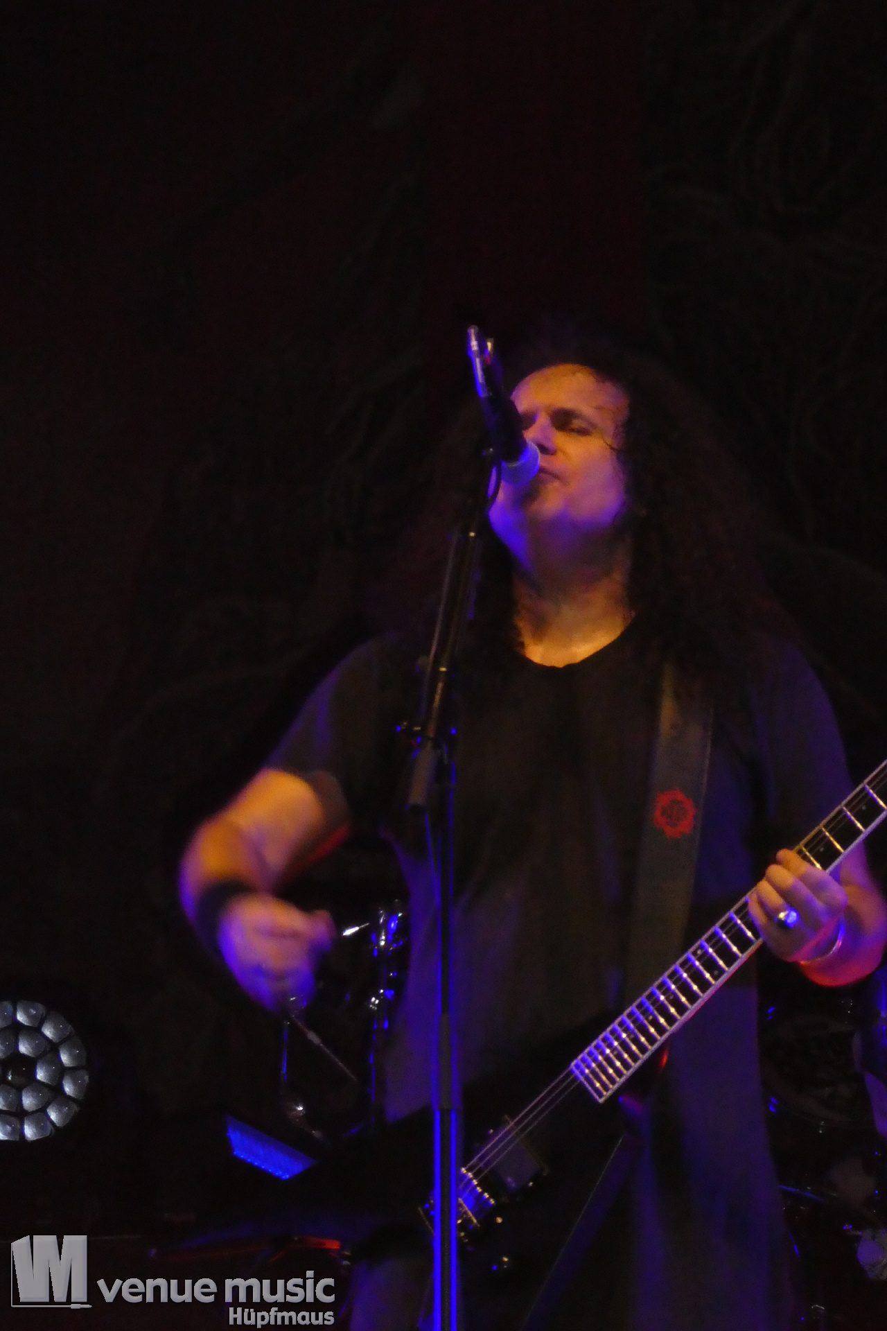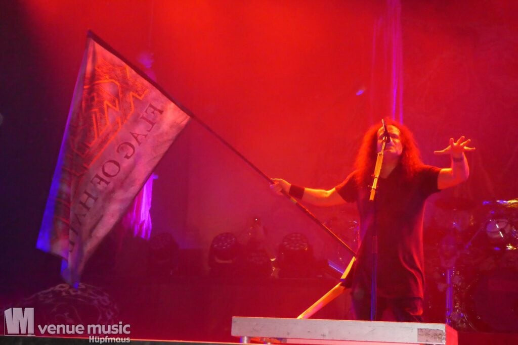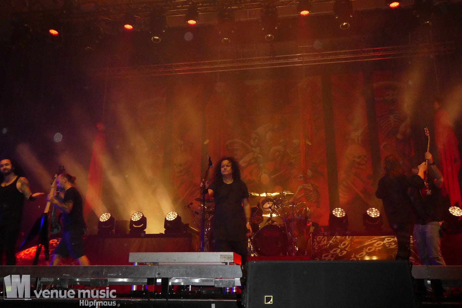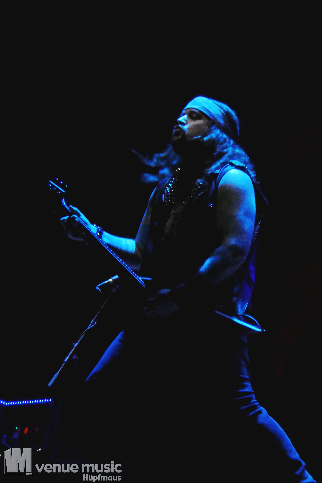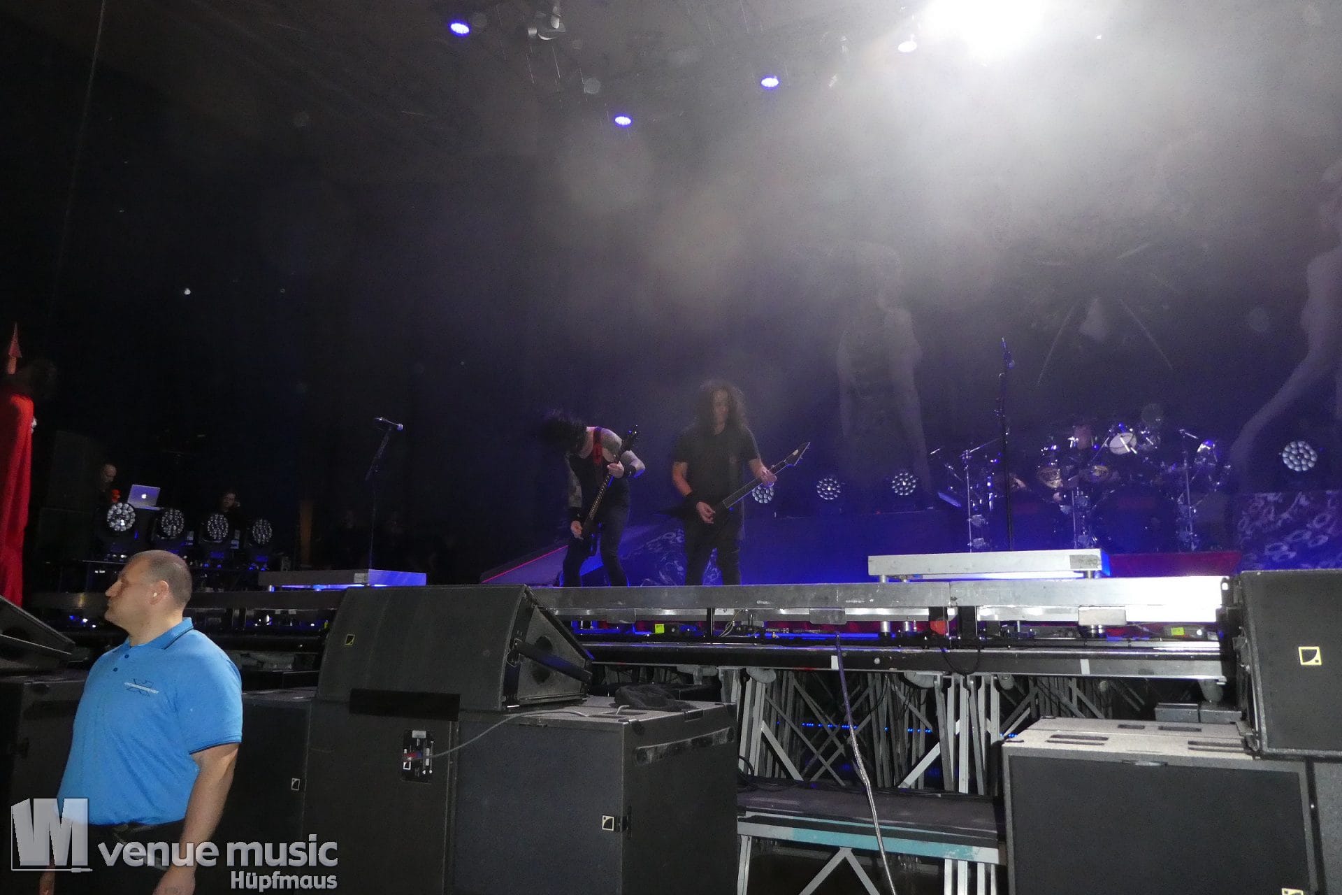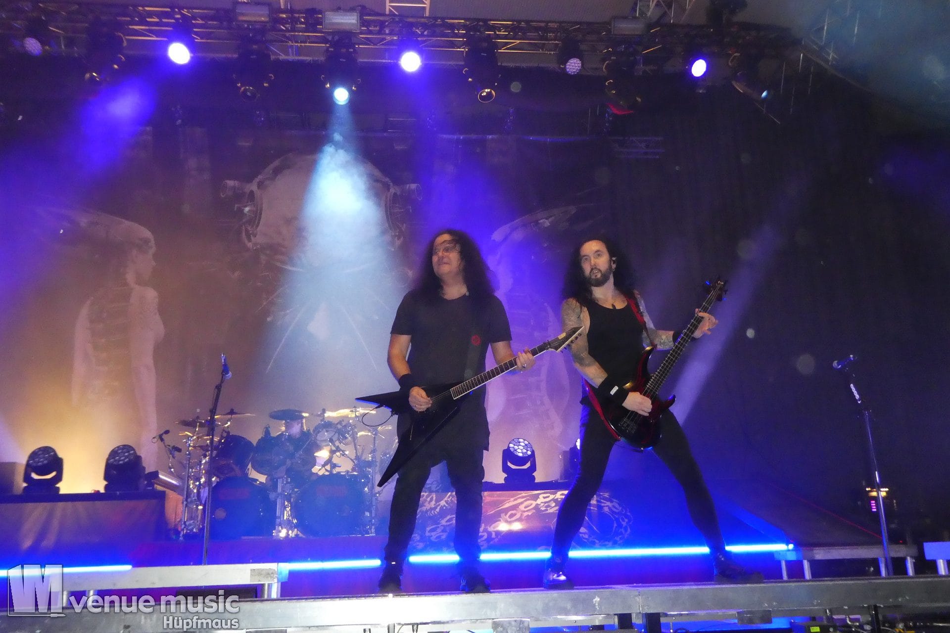 Ja, das mit dem Spaß hörte spätestens auf, das Kreator die Bühne betraten. Denn Kreator in der Gruga bedeutet Krieg! Aber wirklich. Leider gab es keinen Wellenbrecher. Hatten es ja zunächst gehofft, da die Security denen, die schon früh da waren, ein Bändchen brachte. Allerdings war dieses zwar für den Innenraum und es wurde schon wohl das Kontingent für den Innenraum begrenzt (es gab nur eine Kategorie Karten, da das Konzert ursprünglich in der Turbinenhalle hätte sein sollen), wer zu spät kam, musste auf dem Rang mit einem Sitzplatz vorlieb nehmen, aber leider reicht das einfach – grade bei Kreator – nicht aus. Der Druck vorne war so immens, dass nicht nur das Mädel, was am Anfang hinter mir stand, sich sehr schnell raus ziehen lassen musste, selbst der ca 1,90m große Typ, der echt versucht hat, den Druck ein wenig abzumildern, hat nach ca der Hälfte des Sets aufgegeben und sich von der Grabensecurity vorne raus heben lassen. Es war echt nicht lustig. Und zur Frage, warum ich mir das dann antue: weil es an sich zwar nun mal ein Metalkonzert und kein Kindergeburtstag ist, einiges an Druck von hinten und Crowdsurfer und alle das nun mal dazu gehört, es aber meistens nicht so derbe schlimm wird. Und man nun mal einfach so nah an der Bühne ist, den Musikern quasi in die Augen schauen kann. Wenn ich weiter hinten stehe, sehe ich ja nix. Da kann ich auch ne DVD schauen. Und zweite oder dritte Reihe war da noch schlimmer denke ich. Da ists von allen Seiten heiss und ich seh nicht mal was im schlimmsten Fall… Man muss da halt durch und ich bin auch nicht zimperlich, aber das grenzte mal wieder echt an Körperverletzung. Da war ich dann tatsächlich ein bisschen froh, dass sie nur 14 Songs gespielt haben. Eigentlich sogar nur 13, denn von „Awakening of the Gods“ war nur das Intro im Set. Was an sich echt unfassbar wenig ist für einen Headliner. Co-Headliner-Tour hin oder her…(allerdings haben Kreator 2014+2017 auch nur je 2 Songs mehr auf der Setlist gehabt) So fehlten natürlich diverse Songs. Vom aktuellen Album „Hate über alles“ gabs grade mal 3 Songs, von der „Gods of Violence“ 2 und sonst von den Alben immer nur einen Titel – meist den Titeltrack des Albums eben.. Klassiker wie „Extreme Aggressions“ oder „Tormentor“ fehlten echt sehr – und für mich hätten auch gerne noch mehr Songs von der „Phantom Antichrist“ und der „Gods of Violence“ dabei sein können, die ich echt geil finde. Auch wenn sie keine „Klassiker-Alben“ sind. Aber bei grade mal ca. 75 min Spielzeit ist das halt nicht drin. Sehr schade. Einen Gastauftritt hatte Sofia Portanet bei „Midnight Sun“ (habe davon immer noch einen Ohrwurm.. ).