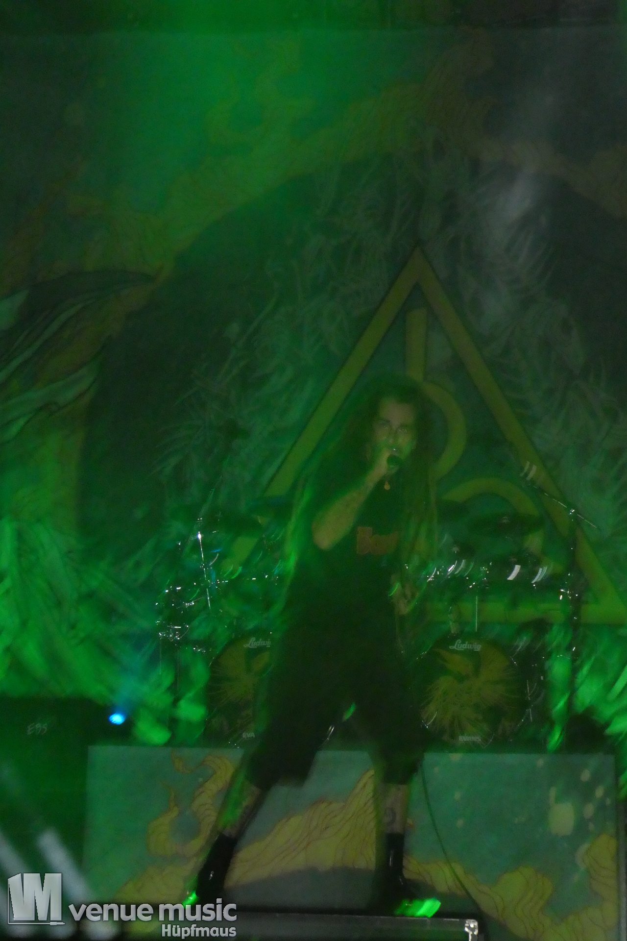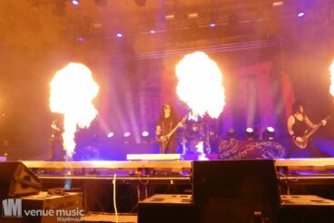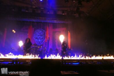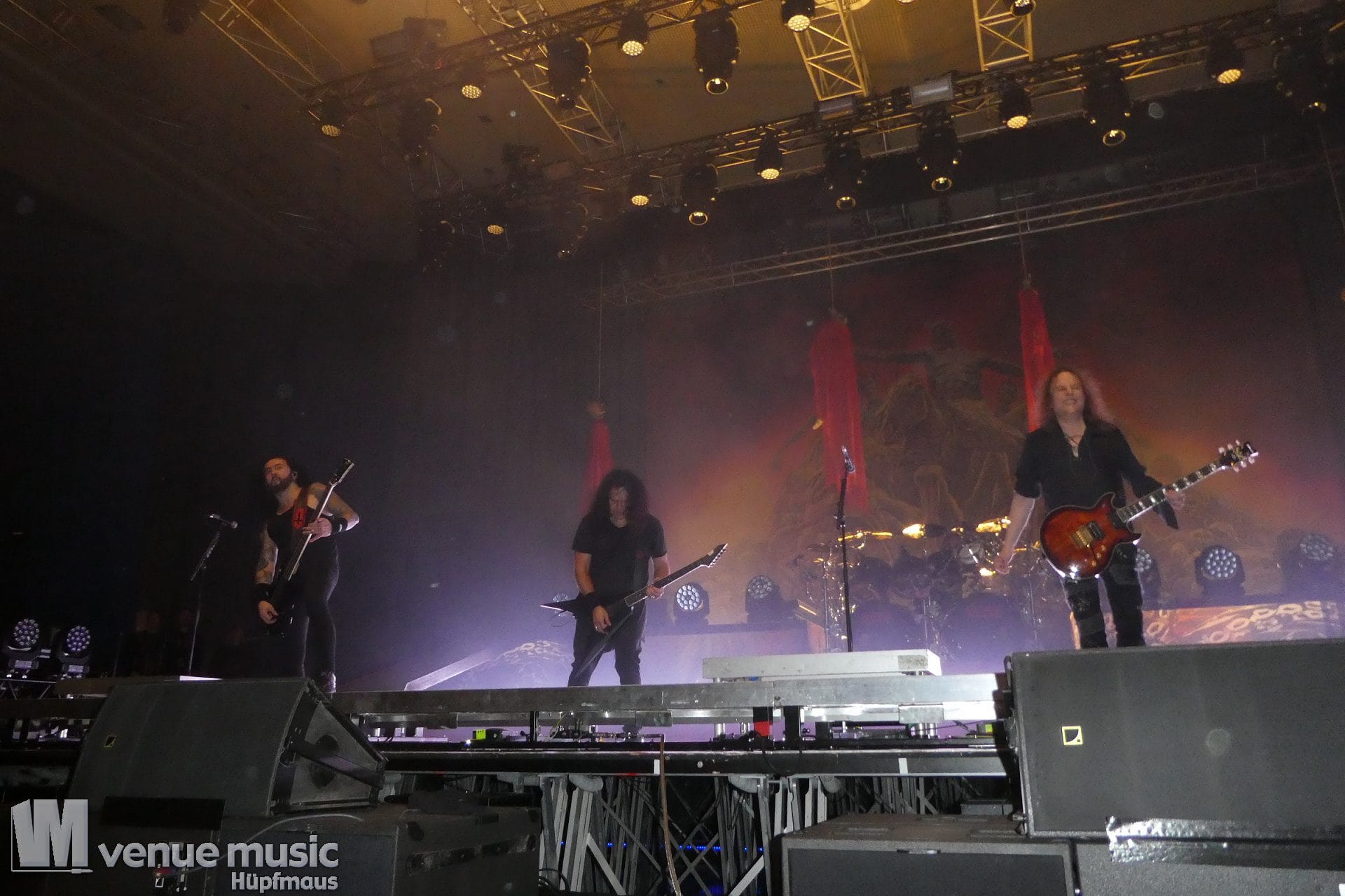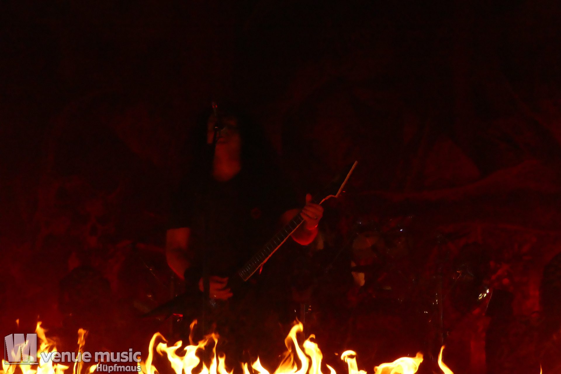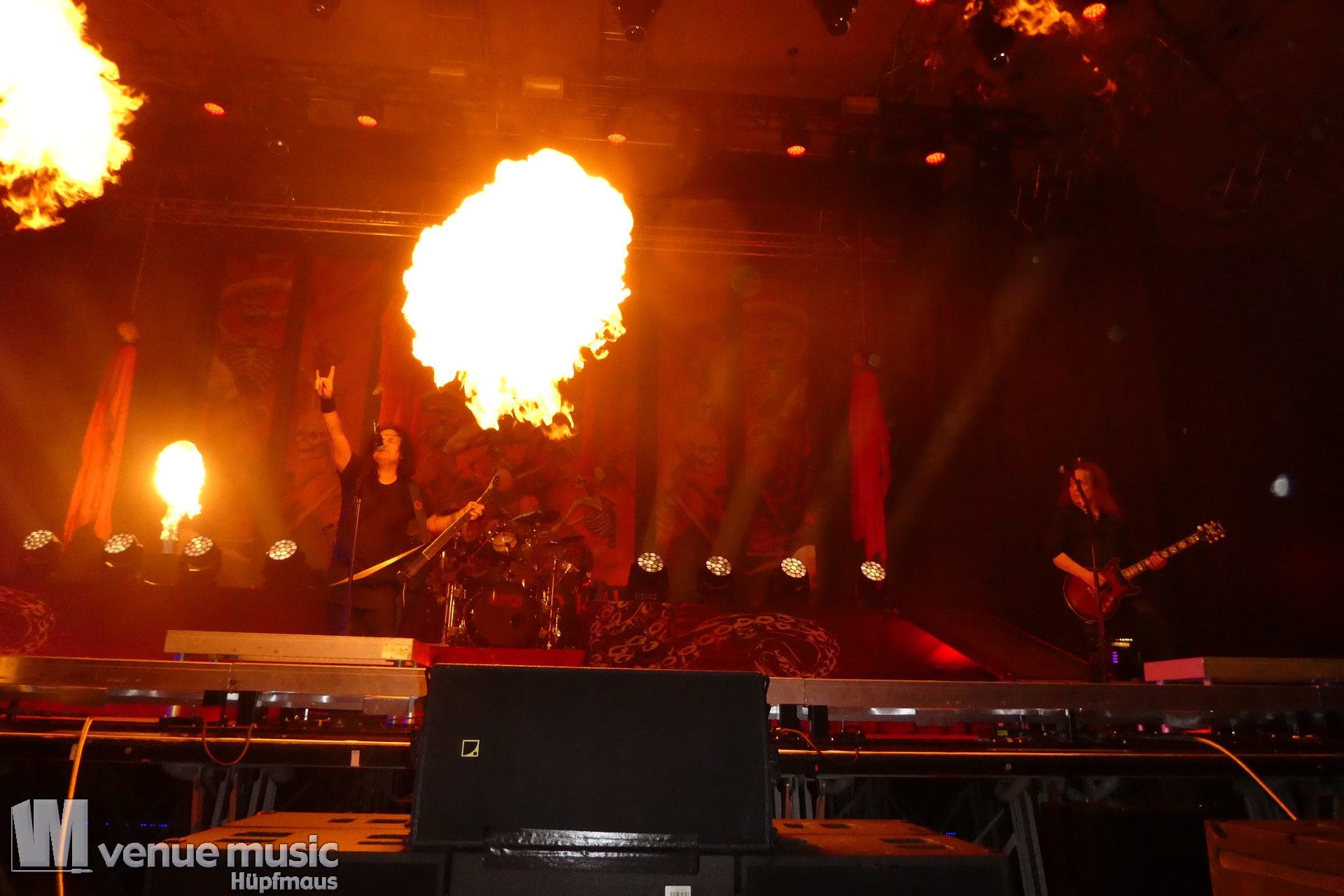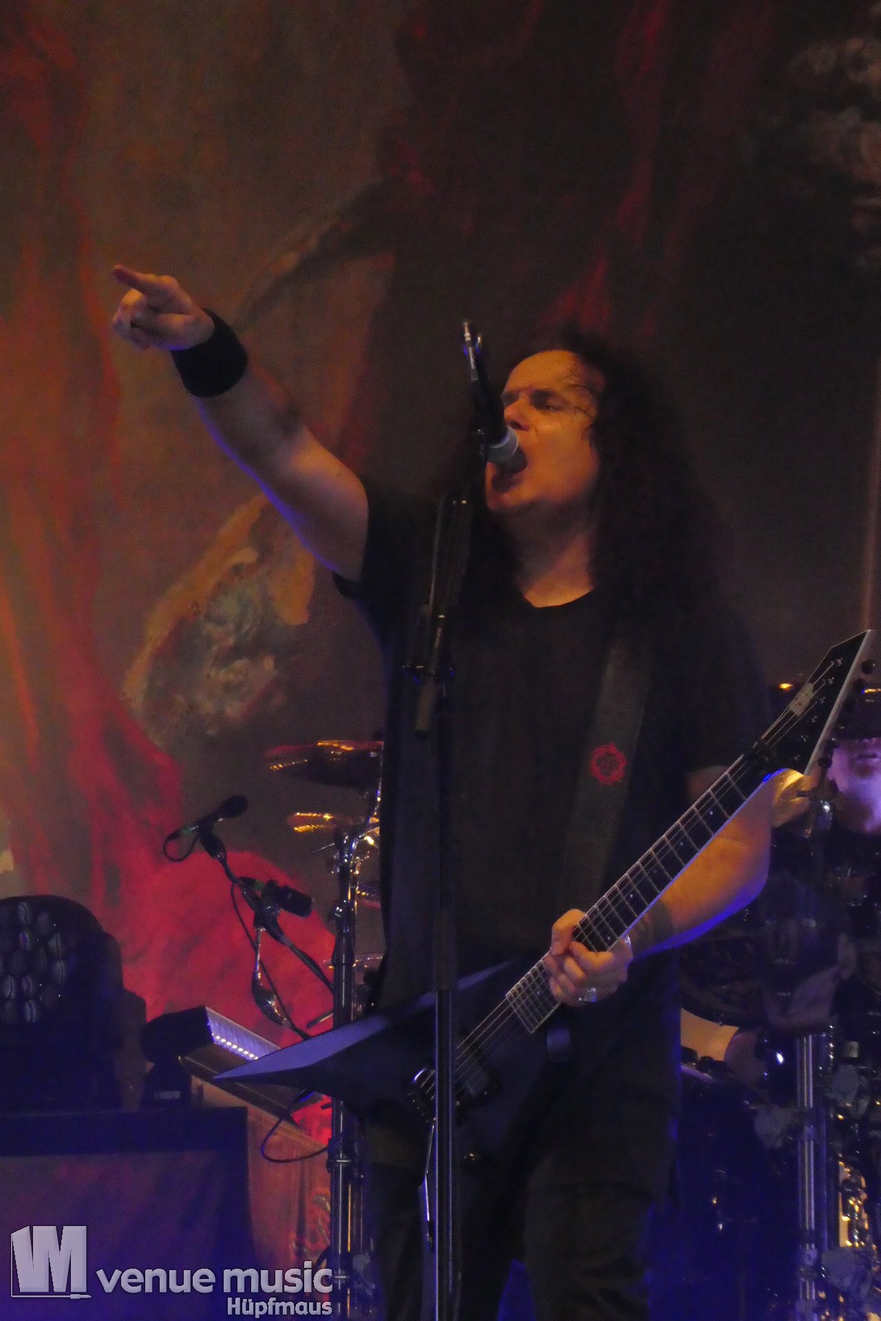 Ja, das mit dem Spaß hörte spätestens auf, das Kreator die Bühne betraten. Denn Kreator in der Gruga bedeutet Krieg! Aber wirklich. Leider gab es keinen Wellenbrecher. Hatten es ja zunächst gehofft, da die Security denen, die schon früh da waren, ein Bändchen brachte. Allerdings war dieses zwar für den Innenraum und es wurde schon wohl das Kontingent für den Innenraum begrenzt (es gab nur eine Kategorie Karten, da das Konzert ursprünglich in der Turbinenhalle hätte sein sollen), wer zu spät kam, musste auf dem Rang mit einem Sitzplatz vorlieb nehmen, aber leider reicht das einfach – grade bei Kreator – nicht aus. Der Druck vorne war so immens, dass nicht nur das Mädel, was am Anfang hinter mir stand, sich sehr schnell raus ziehen lassen musste, selbst der ca 1,90m große Typ, der echt versucht hat, den Druck ein wenig abzumildern, hat nach ca der Hälfte des Sets aufgegeben und sich von der Grabensecurity vorne raus heben lassen. Es war echt nicht lustig. Und zur Frage, warum ich mir das dann antue: weil es an sich zwar nun mal ein Metalkonzert und kein Kindergeburtstag ist, einiges an Druck von hinten und Crowdsurfer und alle das nun mal dazu gehört, es aber meistens nicht so derbe schlimm wird. Und man nun mal einfach so nah an der Bühne ist, den Musikern quasi in die Augen schauen kann. Wenn ich weiter hinten stehe, sehe ich ja nix. Da kann ich auch ne DVD schauen. Und zweite oder dritte Reihe war da noch schlimmer denke ich. Da ists von allen Seiten heiss und ich seh nicht mal was im schlimmsten Fall… Man muss da halt durch und ich bin auch nicht zimperlich, aber das grenzte mal wieder echt an Körperverletzung. Da war ich dann tatsächlich ein bisschen froh, dass sie nur 14 Songs gespielt haben. Eigentlich sogar nur 13, denn von „Awakening of the Gods“ war nur das Intro im Set. Was an sich echt unfassbar wenig ist für einen Headliner. Co-Headliner-Tour hin oder her…(allerdings haben Kreator 2014+2017 auch nur je 2 Songs mehr auf der Setlist gehabt) So fehlten natürlich diverse Songs. Vom aktuellen Album „Hate über alles“ gabs grade mal 3 Songs, von der „Gods of Violence“ 2 und sonst von den Alben immer nur einen Titel – meist den Titeltrack des Albums eben.. Klassiker wie „Extreme Aggressions“ oder „Tormentor“ fehlten echt sehr – und für mich hätten auch gerne noch mehr Songs von der „Phantom Antichrist“ und der „Gods of Violence“ dabei sein können, die ich echt geil finde. Auch wenn sie keine „Klassiker-Alben“ sind. Aber bei grade mal ca. 75 min Spielzeit ist das halt nicht drin. Sehr schade. Einen Gastauftritt hatte Sofia Portanet bei „Midnight Sun“ (habe davon immer noch einen Ohrwurm.. ).