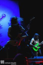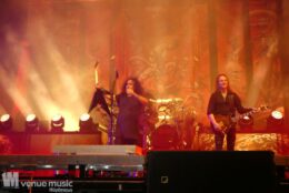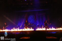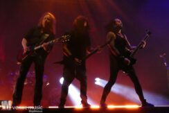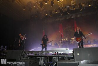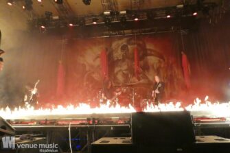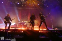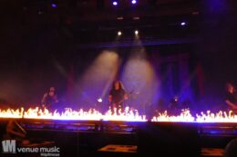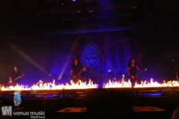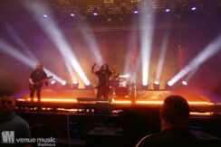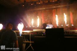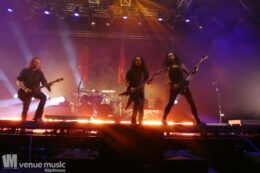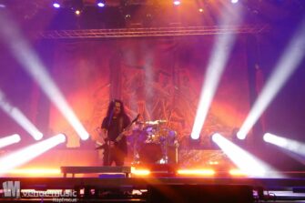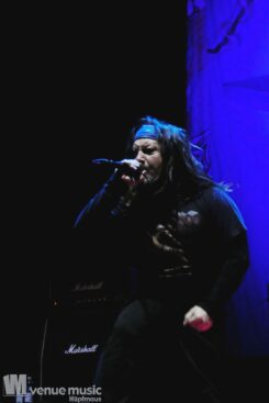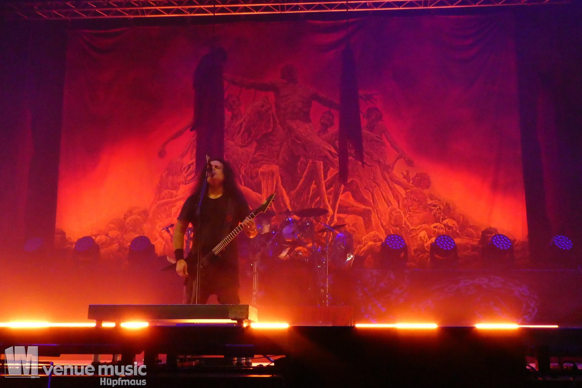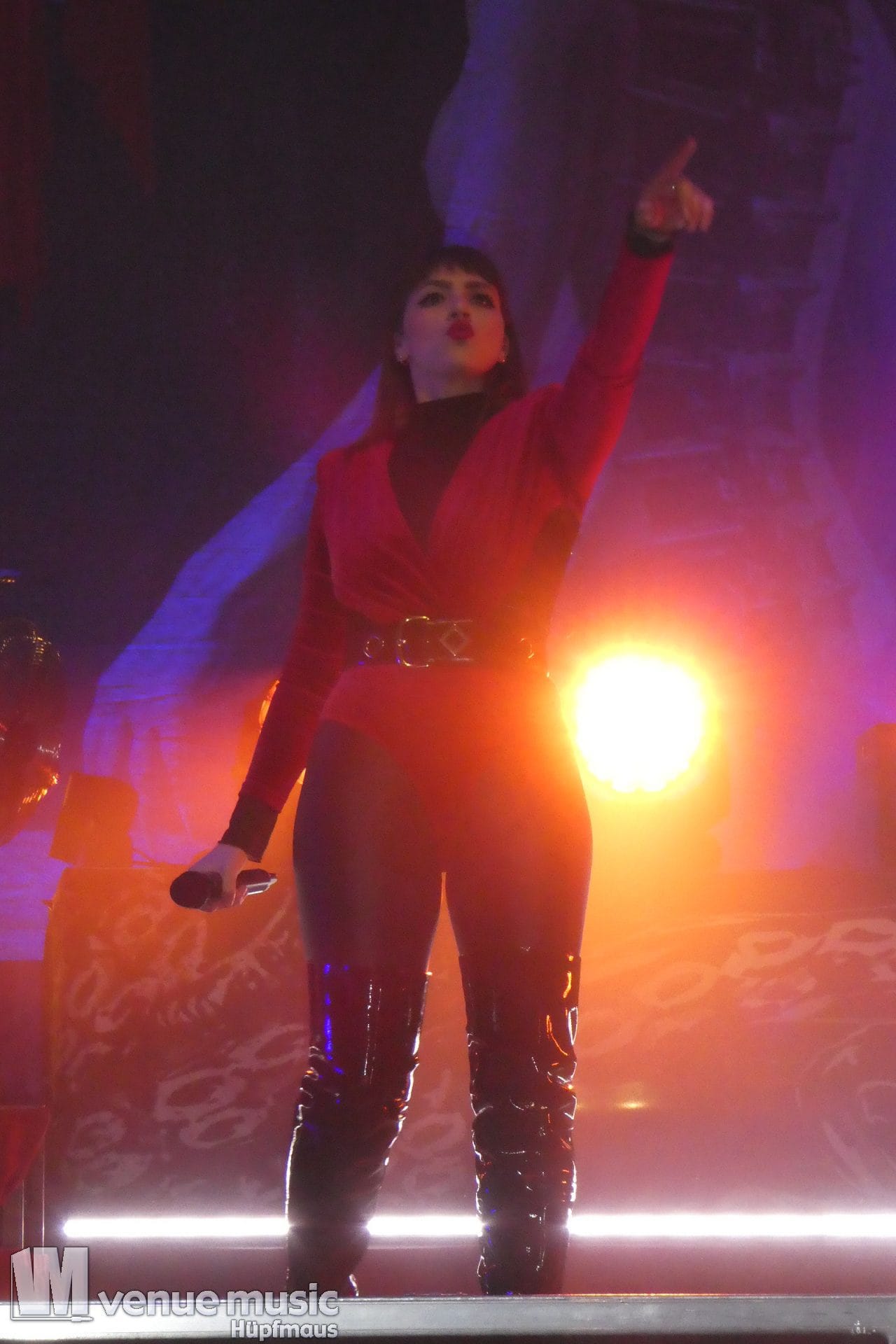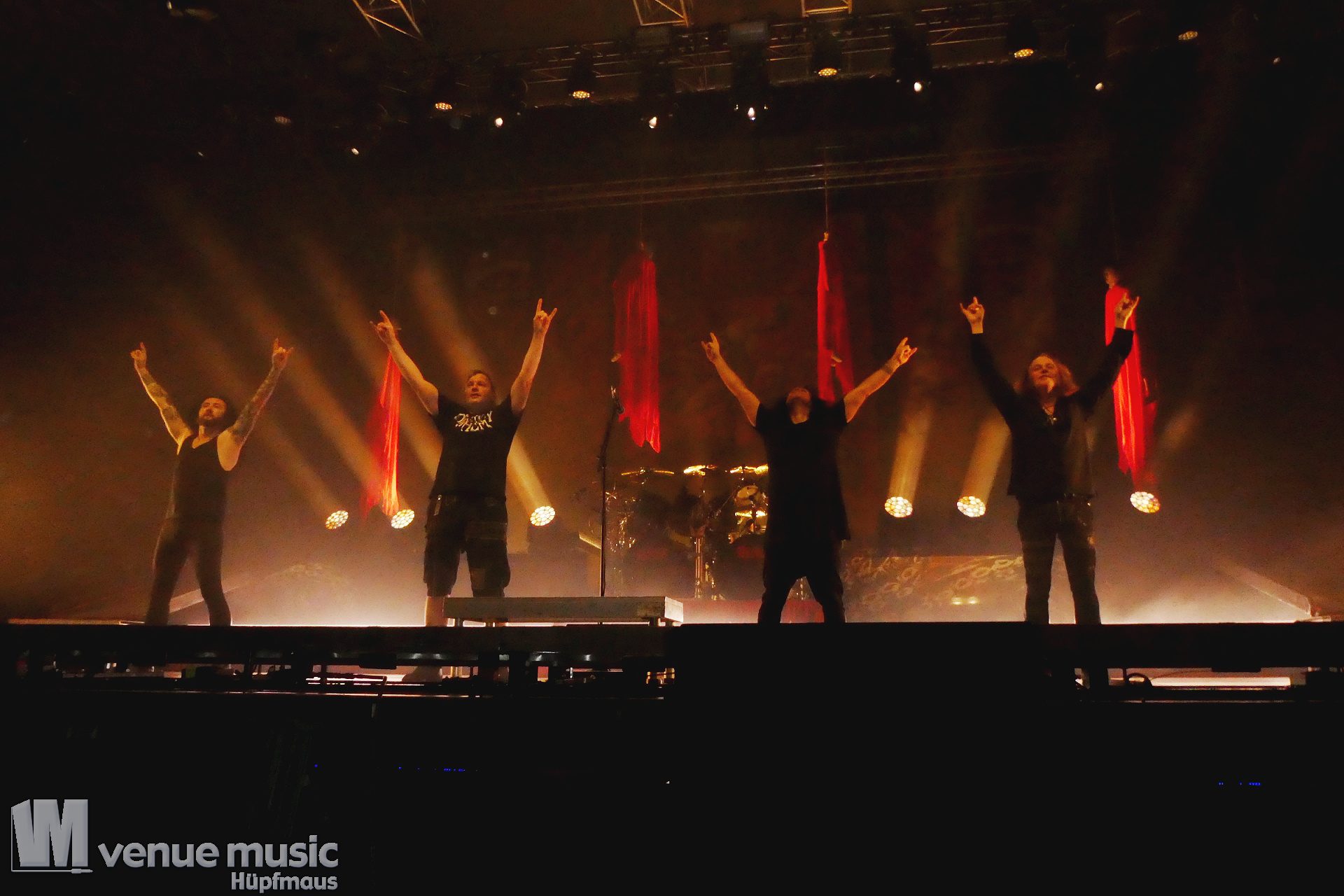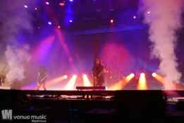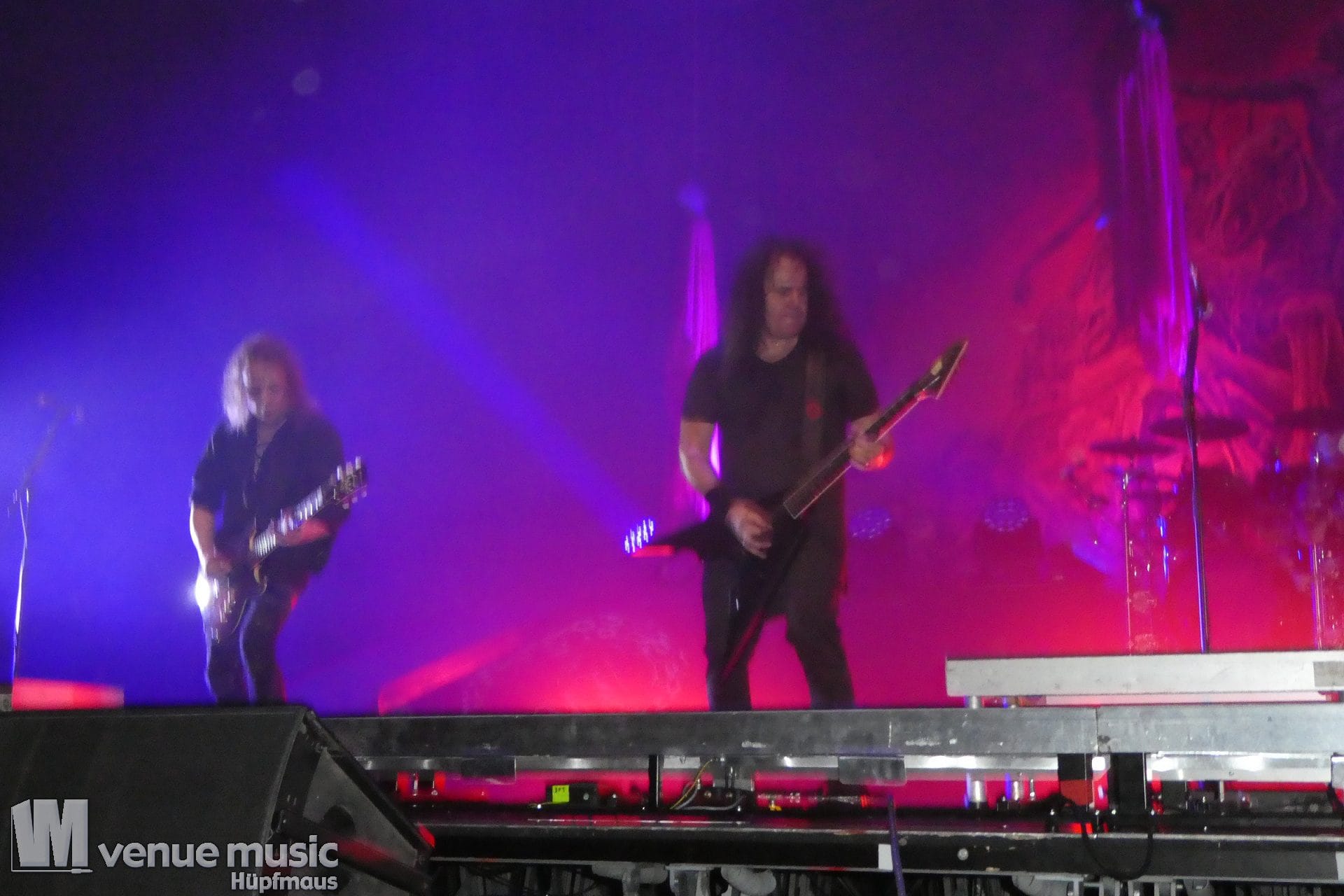 Ja, das mit dem Spaß hörte spätestens auf, das Kreator die Bühne betraten. Denn Kreator in der Gruga bedeutet Krieg! Aber wirklich. Leider gab es keinen Wellenbrecher. Hatten es ja zunächst gehofft, da die Security denen, die schon früh da waren, ein Bändchen brachte. Allerdings war dieses zwar für den Innenraum und es wurde schon wohl das Kontingent für den Innenraum begrenzt (es gab nur eine Kategorie Karten, da das Konzert ursprünglich in der Turbinenhalle hätte sein sollen), wer zu spät kam, musste auf dem Rang mit einem Sitzplatz vorlieb nehmen, aber leider reicht das einfach – grade bei Kreator – nicht aus. Der Druck vorne war so immens, dass nicht nur das Mädel, was am Anfang hinter mir stand, sich sehr schnell raus ziehen lassen musste, selbst der ca 1,90m große Typ, der echt versucht hat, den Druck ein wenig abzumildern, hat nach ca der Hälfte des Sets aufgegeben und sich von der Grabensecurity vorne raus heben lassen. Es war echt nicht lustig. Und zur Frage, warum ich mir das dann antue: weil es an sich zwar nun mal ein Metalkonzert und kein Kindergeburtstag ist, einiges an Druck von hinten und Crowdsurfer und alle das nun mal dazu gehört, es aber meistens nicht so derbe schlimm wird. Und man nun mal einfach so nah an der Bühne ist, den Musikern quasi in die Augen schauen kann. Wenn ich weiter hinten stehe, sehe ich ja nix. Da kann ich auch ne DVD schauen. Und zweite oder dritte Reihe war da noch schlimmer denke ich. Da ists von allen Seiten heiss und ich seh nicht mal was im schlimmsten Fall… Man muss da halt durch und ich bin auch nicht zimperlich, aber das grenzte mal wieder echt an Körperverletzung. Da war ich dann tatsächlich ein bisschen froh, dass sie nur 14 Songs gespielt haben. Eigentlich sogar nur 13, denn von „Awakening of the Gods“ war nur das Intro im Set. Was an sich echt unfassbar wenig ist für einen Headliner. Co-Headliner-Tour hin oder her…(allerdings haben Kreator 2014+2017 auch nur je 2 Songs mehr auf der Setlist gehabt) So fehlten natürlich diverse Songs. Vom aktuellen Album „Hate über alles“ gabs grade mal 3 Songs, von der „Gods of Violence“ 2 und sonst von den Alben immer nur einen Titel – meist den Titeltrack des Albums eben.. Klassiker wie „Extreme Aggressions“ oder „Tormentor“ fehlten echt sehr – und für mich hätten auch gerne noch mehr Songs von der „Phantom Antichrist“ und der „Gods of Violence“ dabei sein können, die ich echt geil finde. Auch wenn sie keine „Klassiker-Alben“ sind. Aber bei grade mal ca. 75 min Spielzeit ist das halt nicht drin. Sehr schade. Einen Gastauftritt hatte Sofia Portanet bei „Midnight Sun“ (habe davon immer noch einen Ohrwurm.. ).