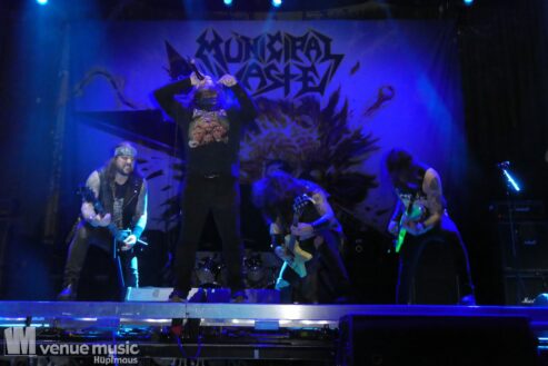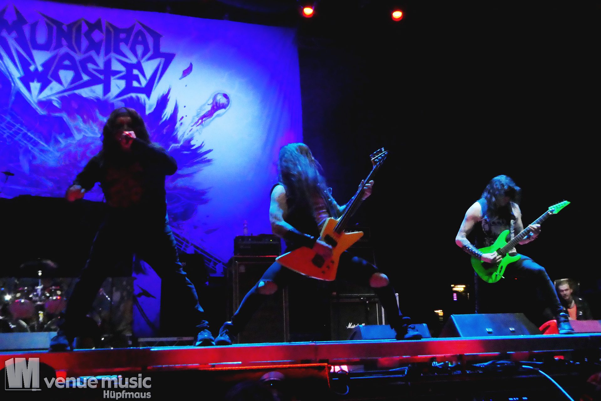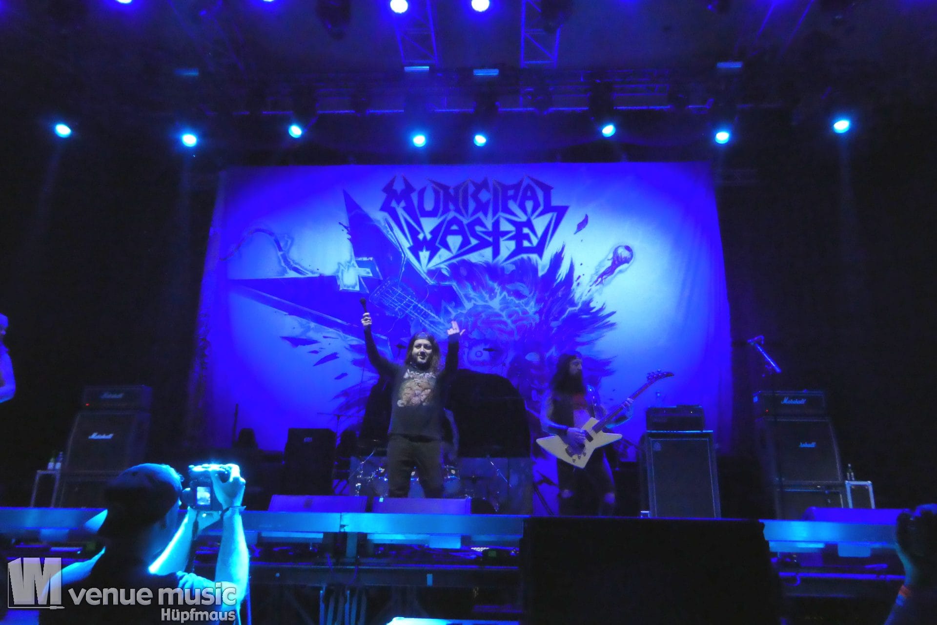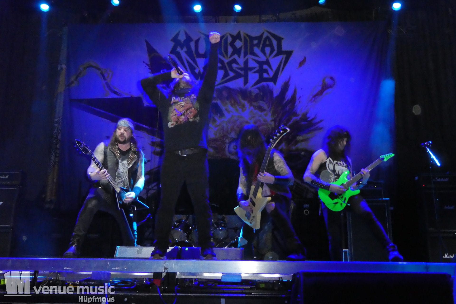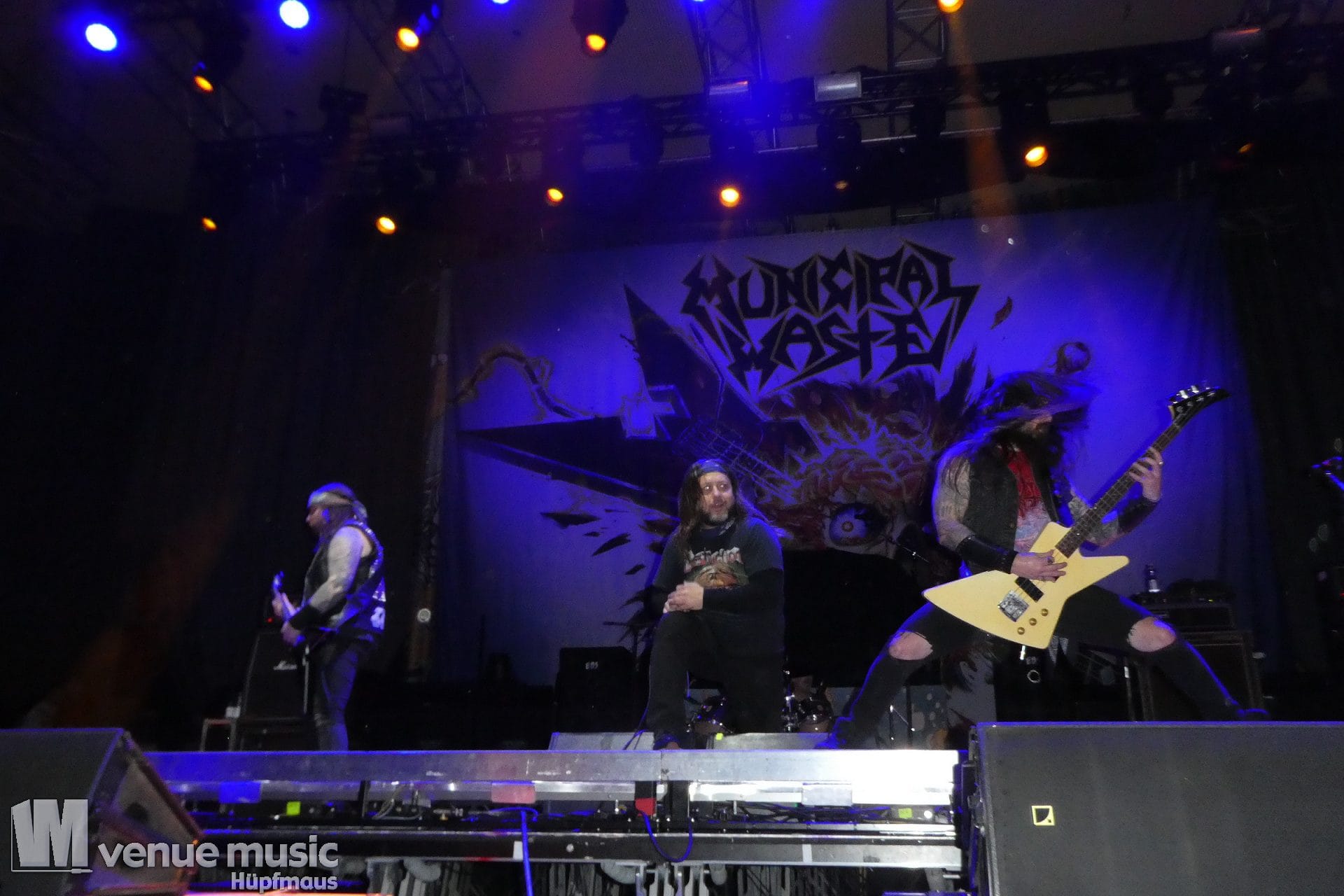 Nun aber rein in die Halle und geile Musik hören. Den Anfang machten Municipal Waste, die wir bereits 2019 im Kulttempel bei ihrer Headliner Show gesehen hatten. Wir machten uns also schon mal bereit für viele Crowdsurfer, denn damals ging das da richtig ab. Ja, es gab auch so einige, aber es war noch voll OK und so konnten wir die Band super abfeiern. Das machte Spaß!