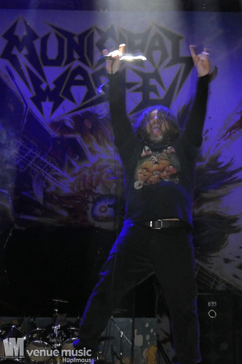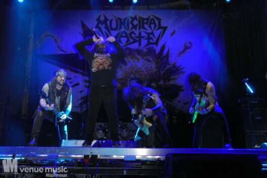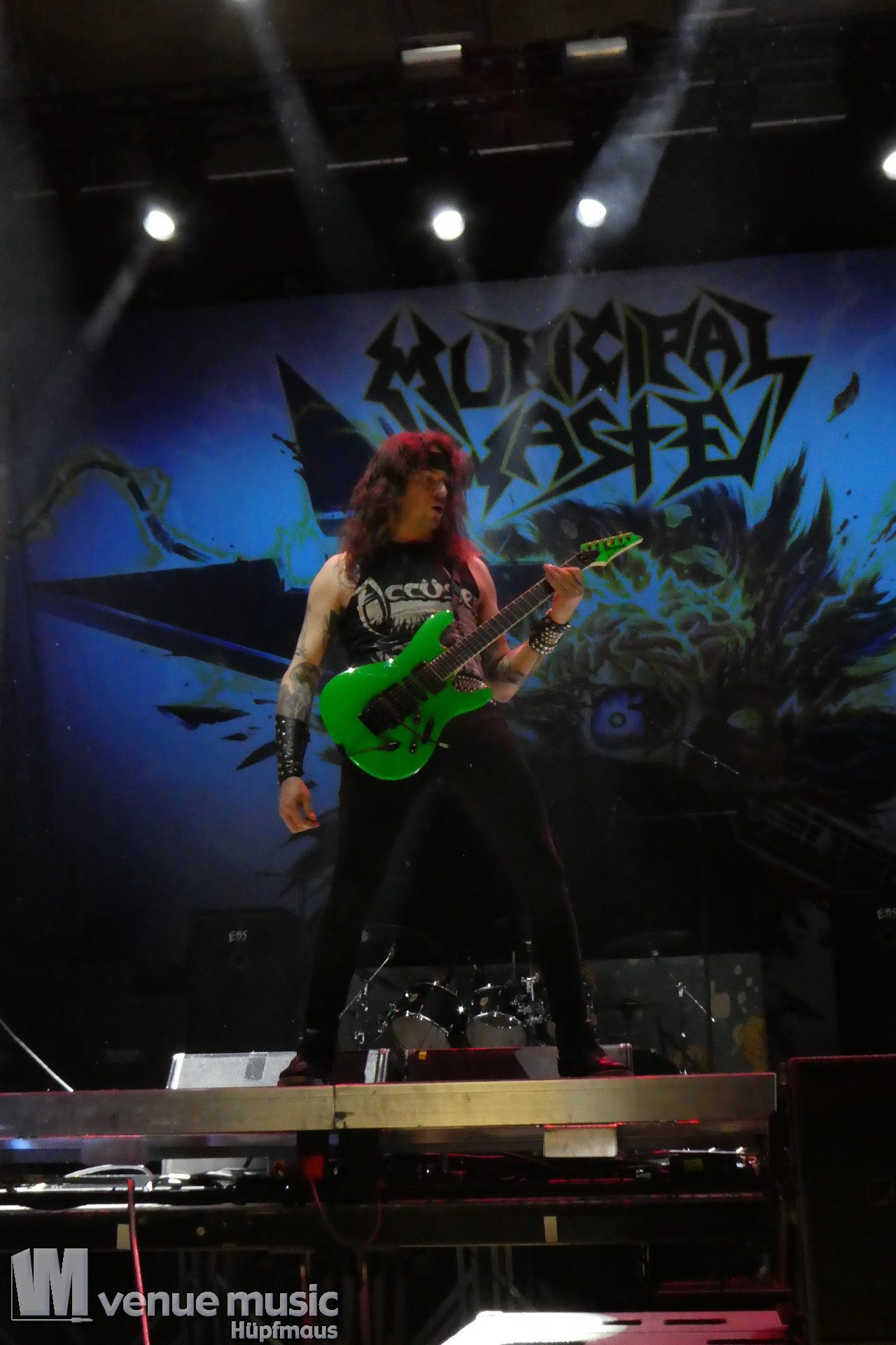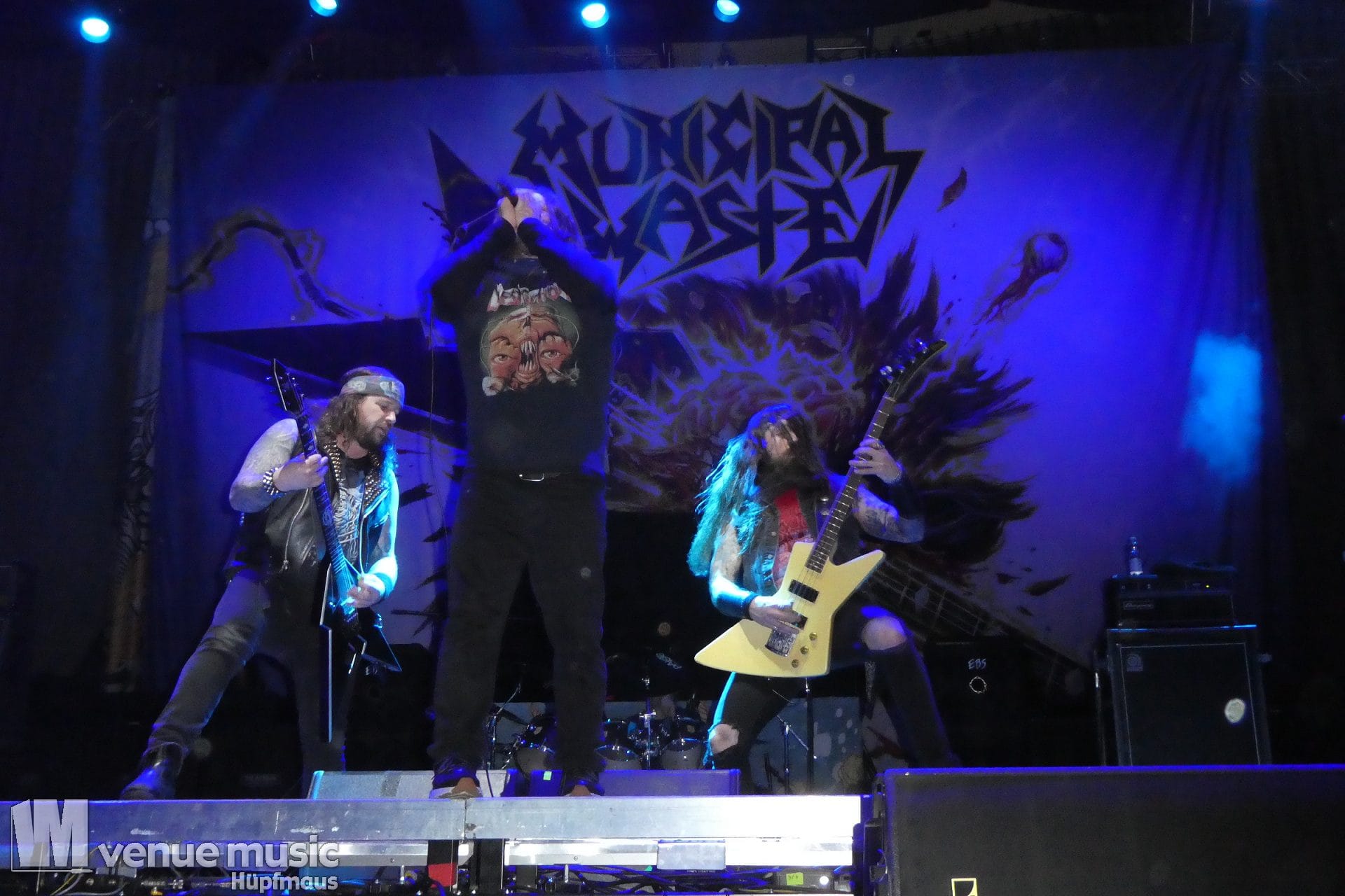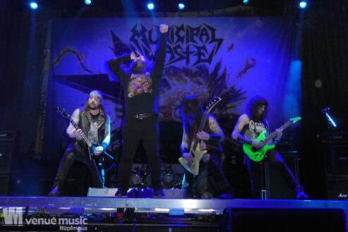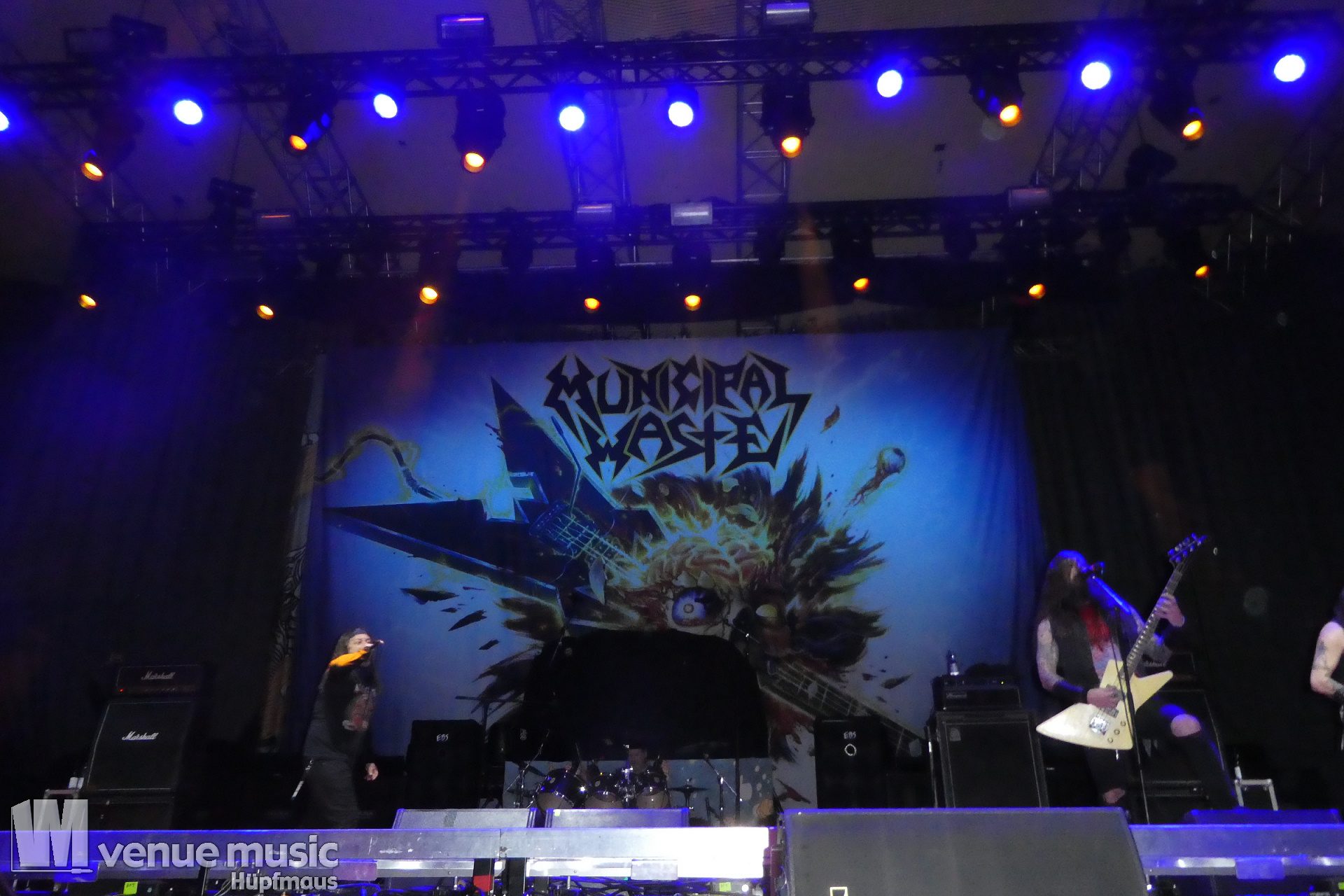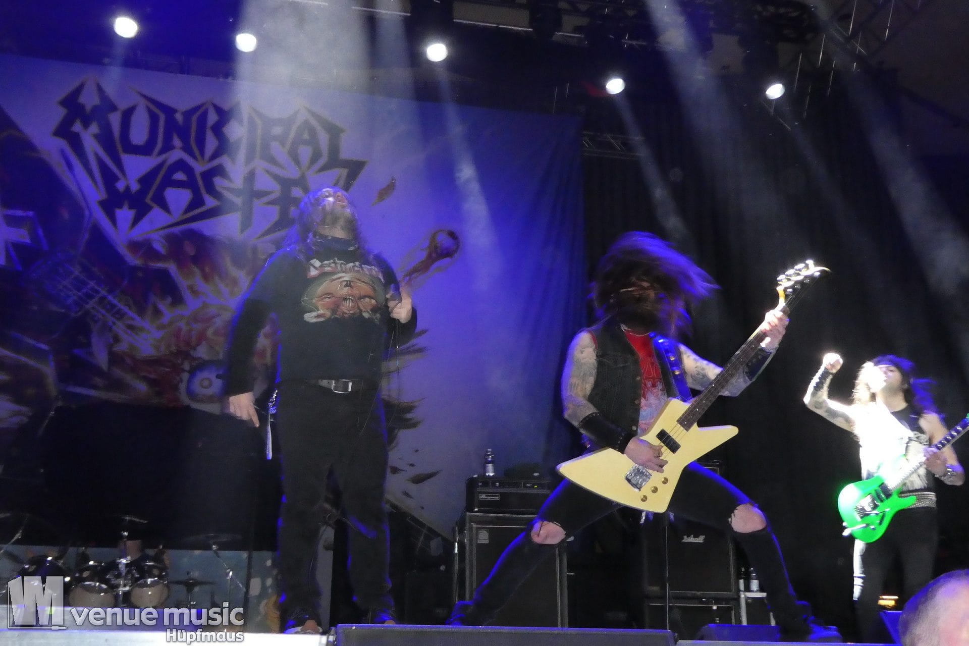 Nun aber rein in die Halle und geile Musik hören. Den Anfang machten Municipal Waste, die wir bereits 2019 im Kulttempel bei ihrer Headliner Show gesehen hatten. Wir machten uns also schon mal bereit für viele Crowdsurfer, denn damals ging das da richtig ab. Ja, es gab auch so einige, aber es war noch voll OK und so konnten wir die Band super abfeiern. Das machte Spaß!