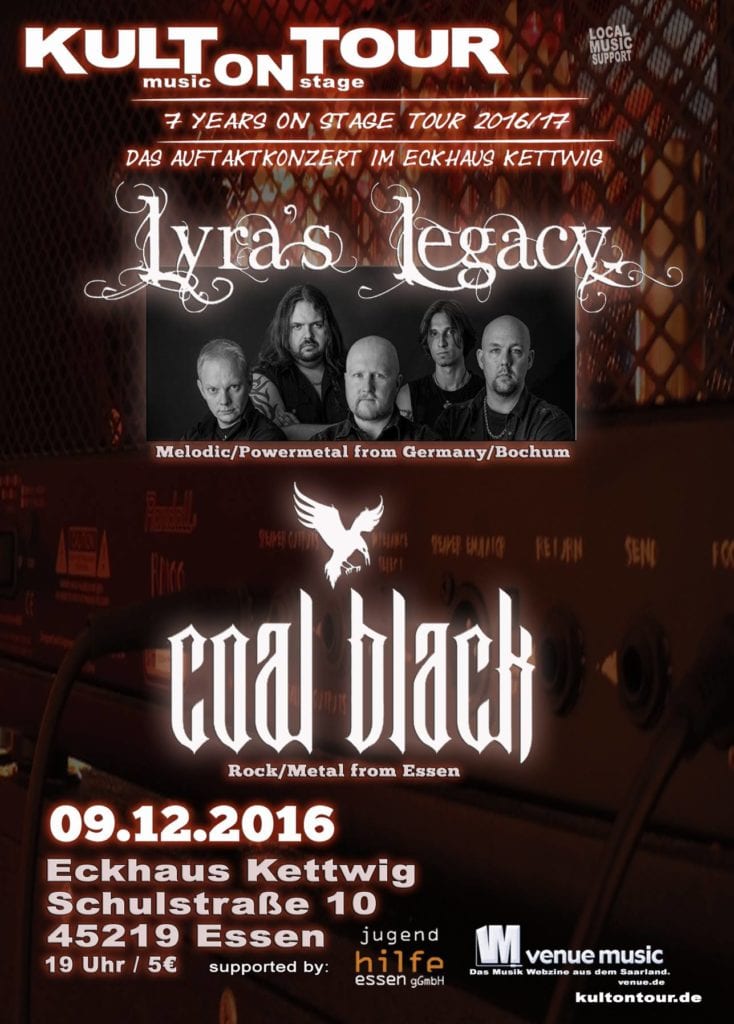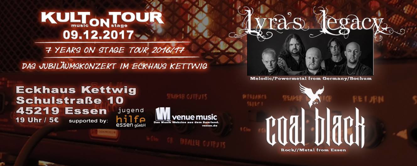 Das erste KULT on TOUR Konzert fand am 6. November 2009 statt, inzwischen kamen noch 65 weitere Konzerte in verschiedenen Locations mit über 260 Bands und Solokünstlern dazu. Das Jubiläum wird nun mit einer ganzen Konzertreihe gefeiert, den Start macht am Freitag, den 9. Dezember ein Konzert im Eckhaus Kettwig in Essen. Spielen werden an diesem Abend Lyra’s Legacy aus Bochum (Melodic/Power-Metal) und Coal Black aus Essen (Rock/Metal).
