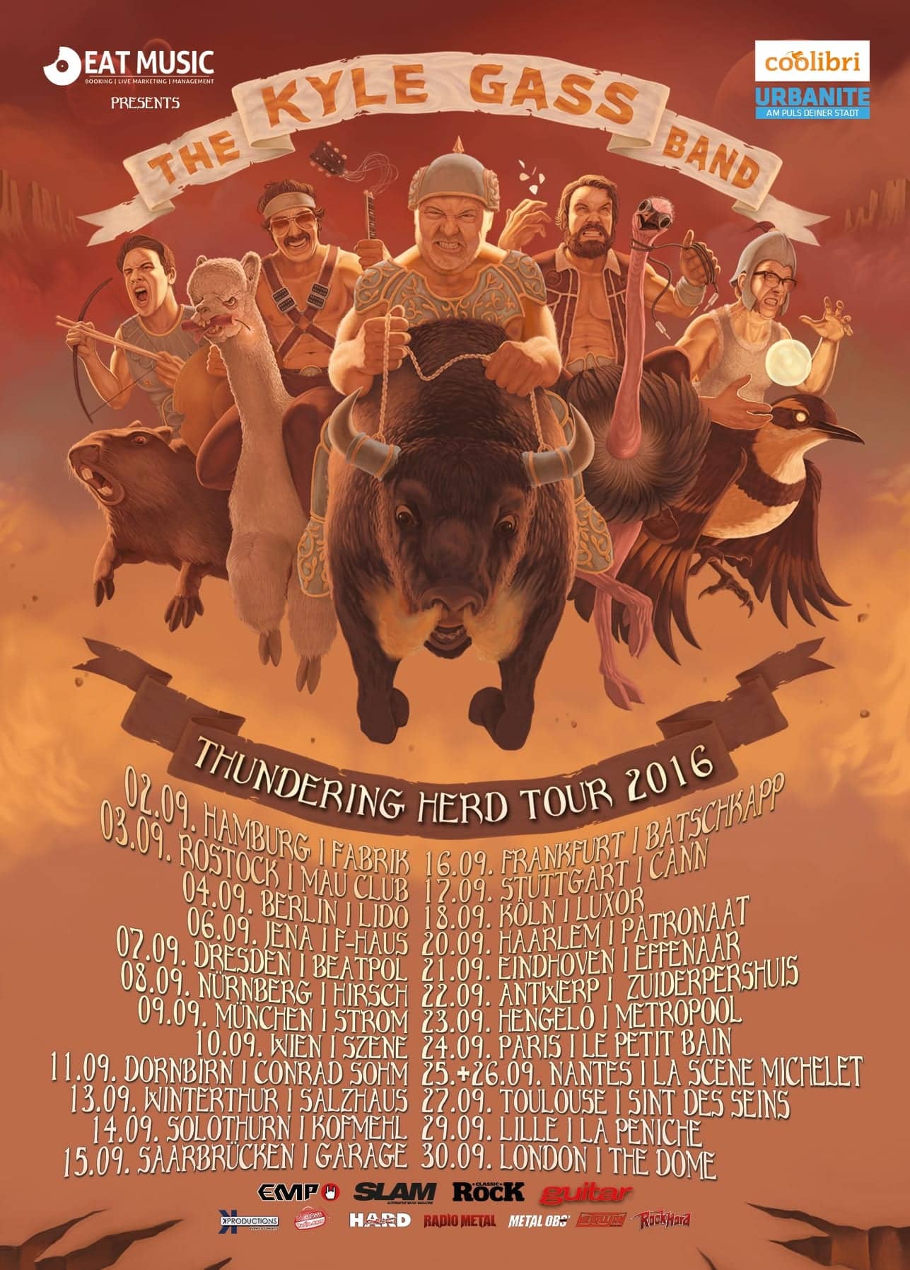 Die Kyle Gass Band ist zurück! Am 02. September 2016 erscheint ihr neues Album „Thundering Herd„(*) und pünktlich zum Release-Datum gehen die Jungs mit den neuen Songs auf Europa-Tour durch Deutschland, Österreich, Schweiz, Frankreich, Niederlande, Belgien und UK. Nachdem sich die Supergroup aus Los Angeles letztes Jahr einen Namen gemacht hat, trägt sie jetzt noch eine Spur dicker auf: mehr Tiere, breitere Koteletten und mit Frontmann Mr. Kyle Gass (Tenacious D) persönlich. Mit an Bord sind auch Stimmwunder Mike Bray, Gitarrenvirtuose John Konesky und Jason Keene, der vielleicht beste Bass spielende Fotograf ever und nicht zu vergessen der talentierte Schlagzeuger Tim Spier, Michael Jackson Doppelgänger und Augenschmaus in einem.