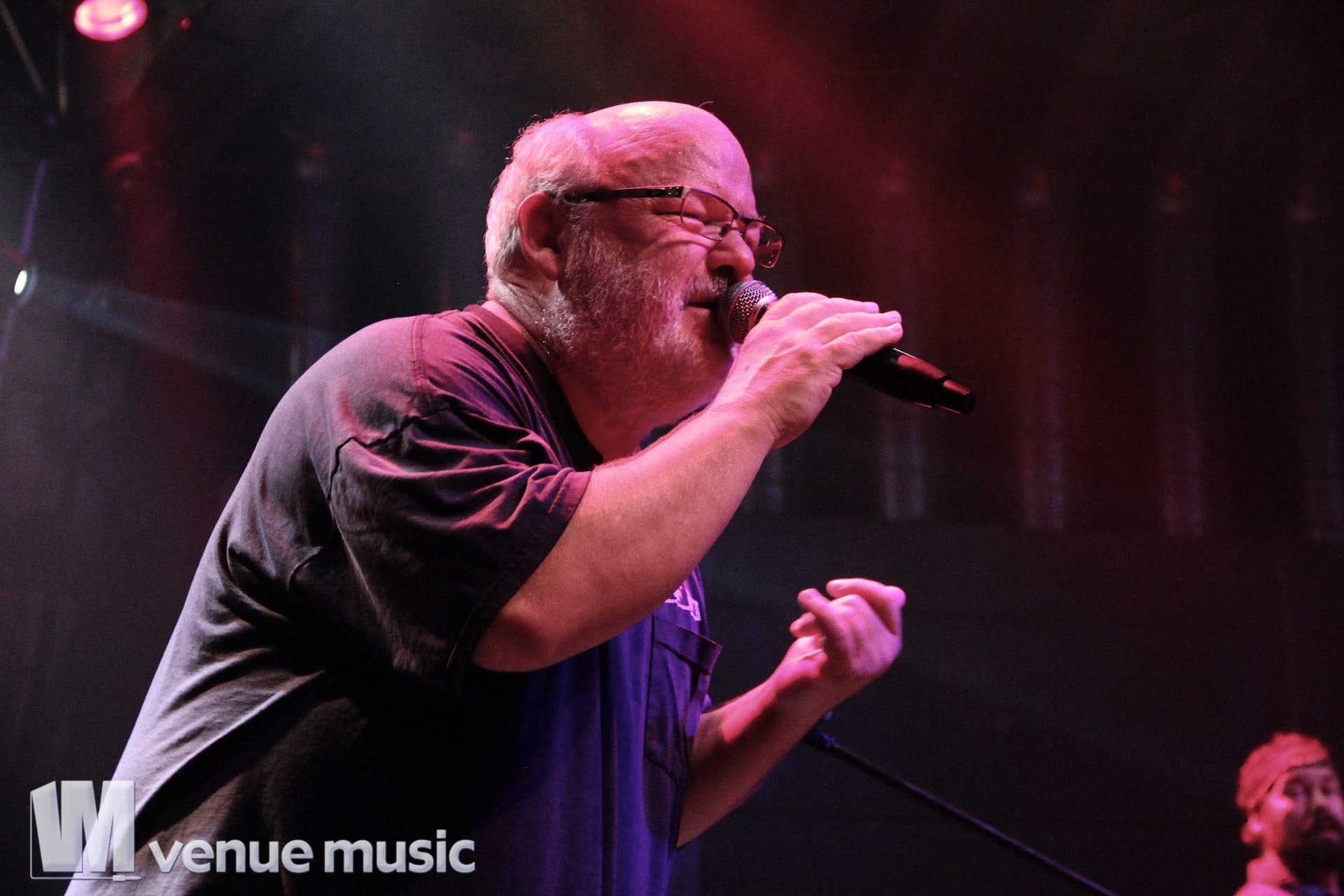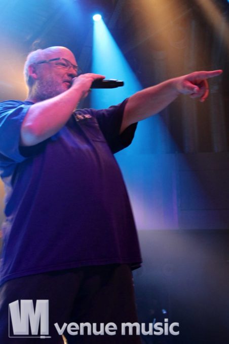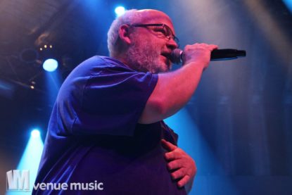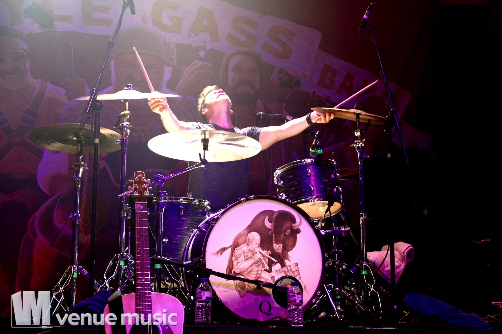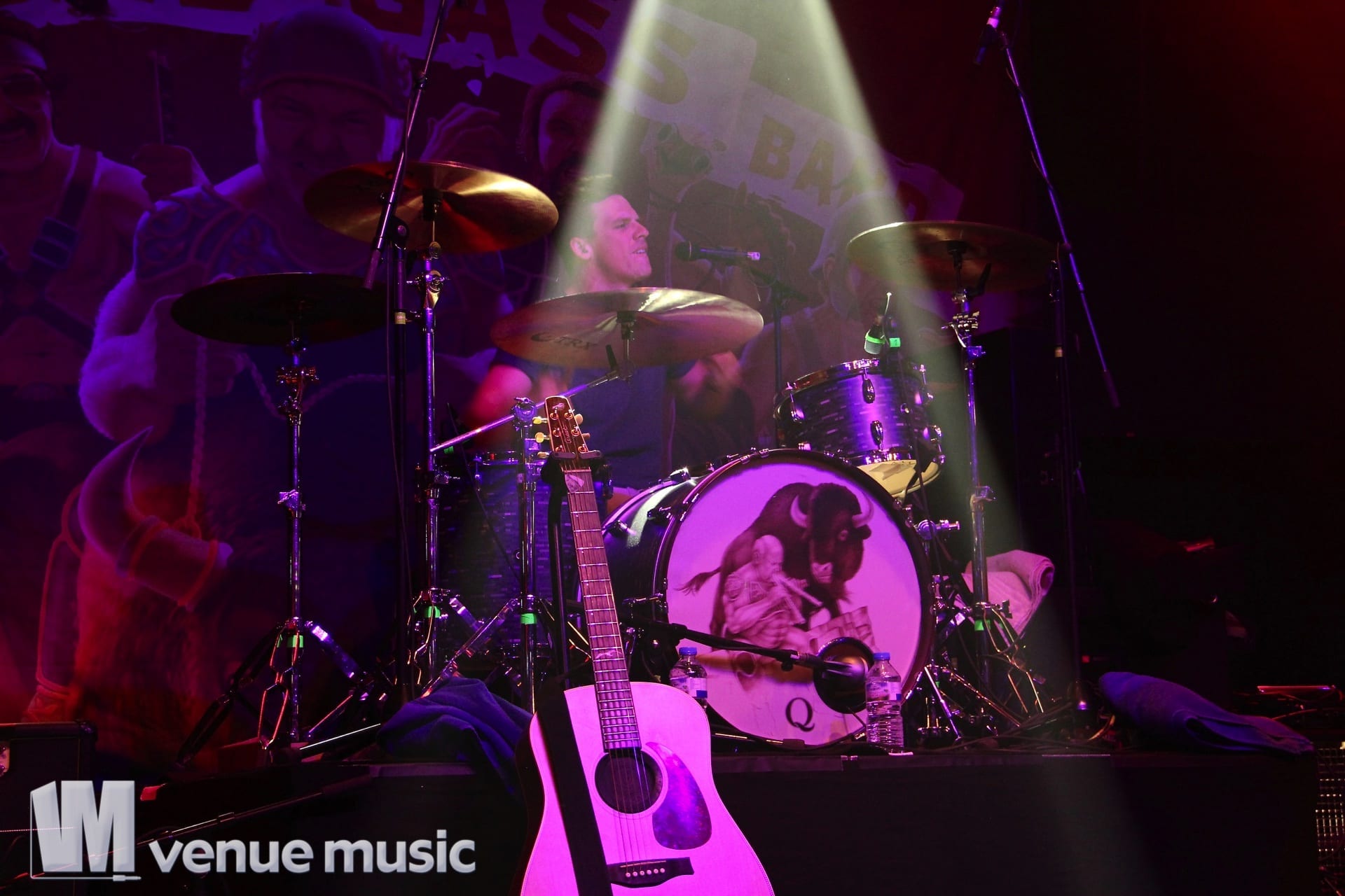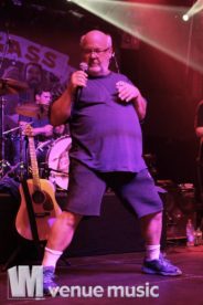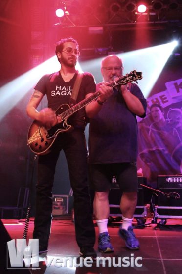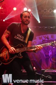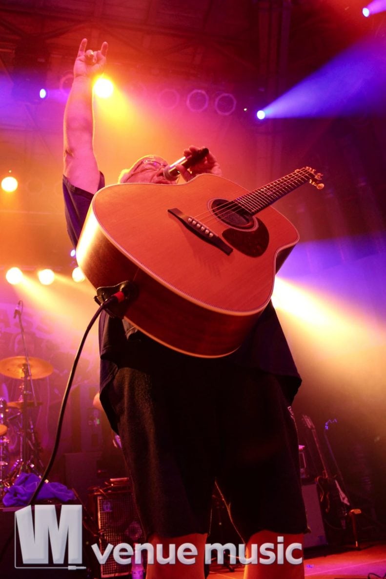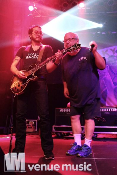 Dank dem Zoll der Schweiz und der offenbar sehr genauen Kontrolle der Merch-Artikel, fing das Konzert der Kyle Gass Band auf ihrer „Thundering Herd“(*) Tour in der Garage in Saarbrücken mit deutlicher Verspätung an. Da die Truppe aber ohne Support spielte, ging es dann aber wenigstens direkt los mit der Rockband, die nicht aussieht wie eine Rockband. Wer ohne die Band zu kennen ein Konzert der Kyle Gass Band besucht, der könnte im ersten Moment glauben, dass hier jemand einfach ein paar Leute von der Straße eingesammelt – oder, im Fall des Namensgebers der Band, vom Pool eines All-Inclusive-Hotels in Spanien – und direkt auf die Bühne gestellt hätte. Der Moment dauert aber wirklich nur einen Moment, denn sobald die fünf anfangen zu spielen, merkt man, dass hier eine verdammt gute Band auf der Bühne steht. Und das zeigte die Band während des ganzen Auftritts, zu dem auch mal ein kurzer Besuch im Graben bei den Fans in der ersten Reihe gehörte (Berührungsängste? Kennt Kyle Gass offensichtlich nicht).