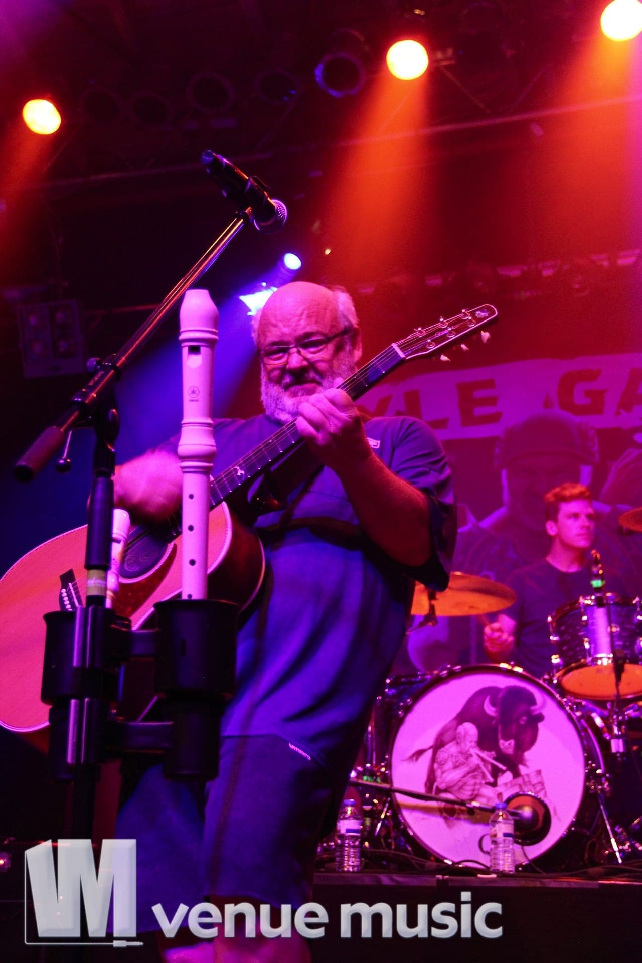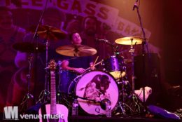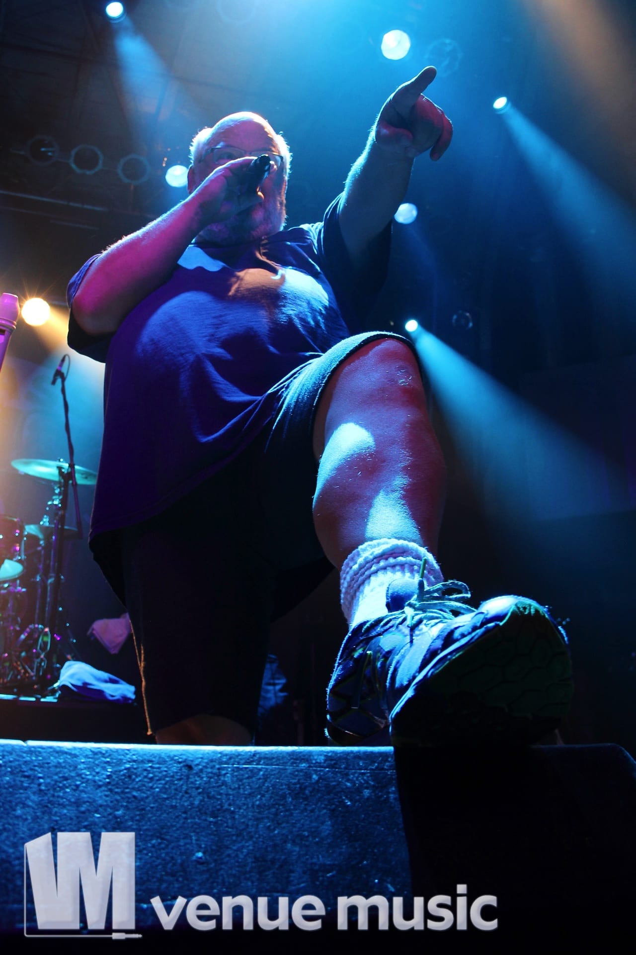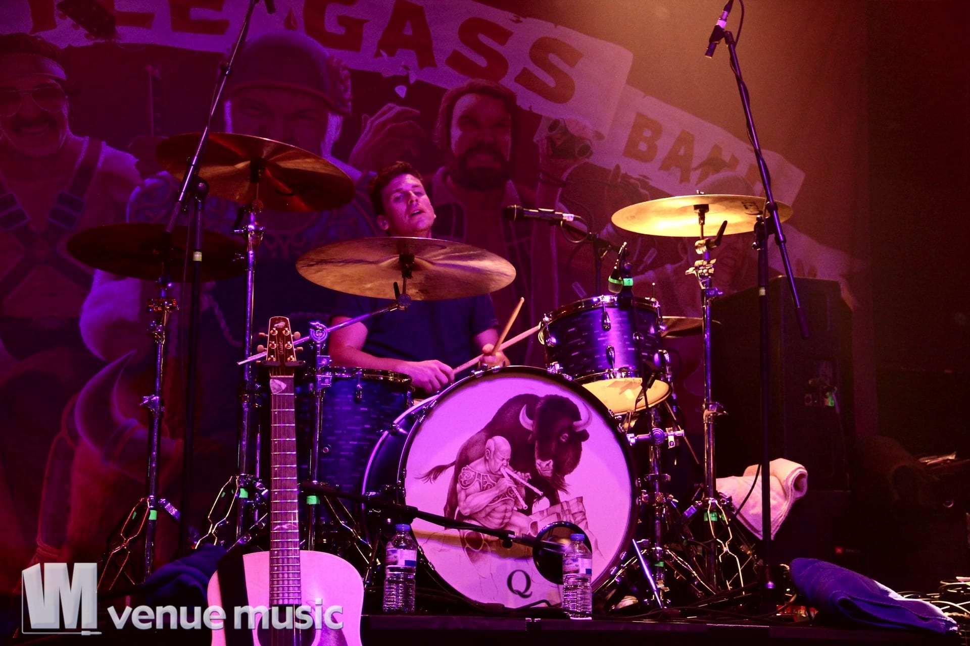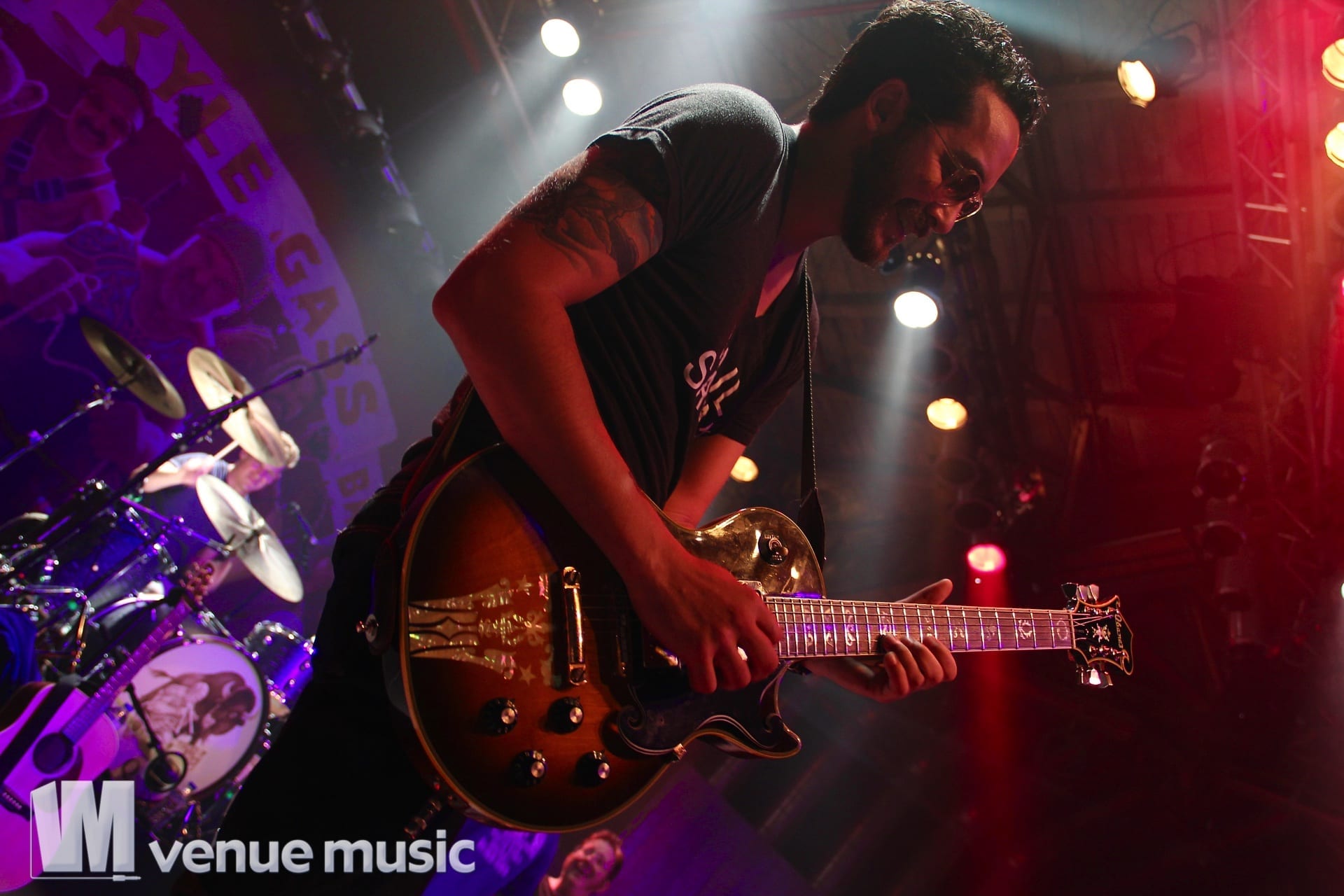 Dank dem Zoll der Schweiz und der offenbar sehr genauen Kontrolle der Merch-Artikel, fing das Konzert der Kyle Gass Band auf ihrer „Thundering Herd“(*) Tour in der Garage in Saarbrücken mit deutlicher Verspätung an. Da die Truppe aber ohne Support spielte, ging es dann aber wenigstens direkt los mit der Rockband, die nicht aussieht wie eine Rockband. Wer ohne die Band zu kennen ein Konzert der Kyle Gass Band besucht, der könnte im ersten Moment glauben, dass hier jemand einfach ein paar Leute von der Straße eingesammelt – oder, im Fall des Namensgebers der Band, vom Pool eines All-Inclusive-Hotels in Spanien – und direkt auf die Bühne gestellt hätte. Der Moment dauert aber wirklich nur einen Moment, denn sobald die fünf anfangen zu spielen, merkt man, dass hier eine verdammt gute Band auf der Bühne steht. Und das zeigte die Band während des ganzen Auftritts, zu dem auch mal ein kurzer Besuch im Graben bei den Fans in der ersten Reihe gehörte (Berührungsängste? Kennt Kyle Gass offensichtlich nicht).