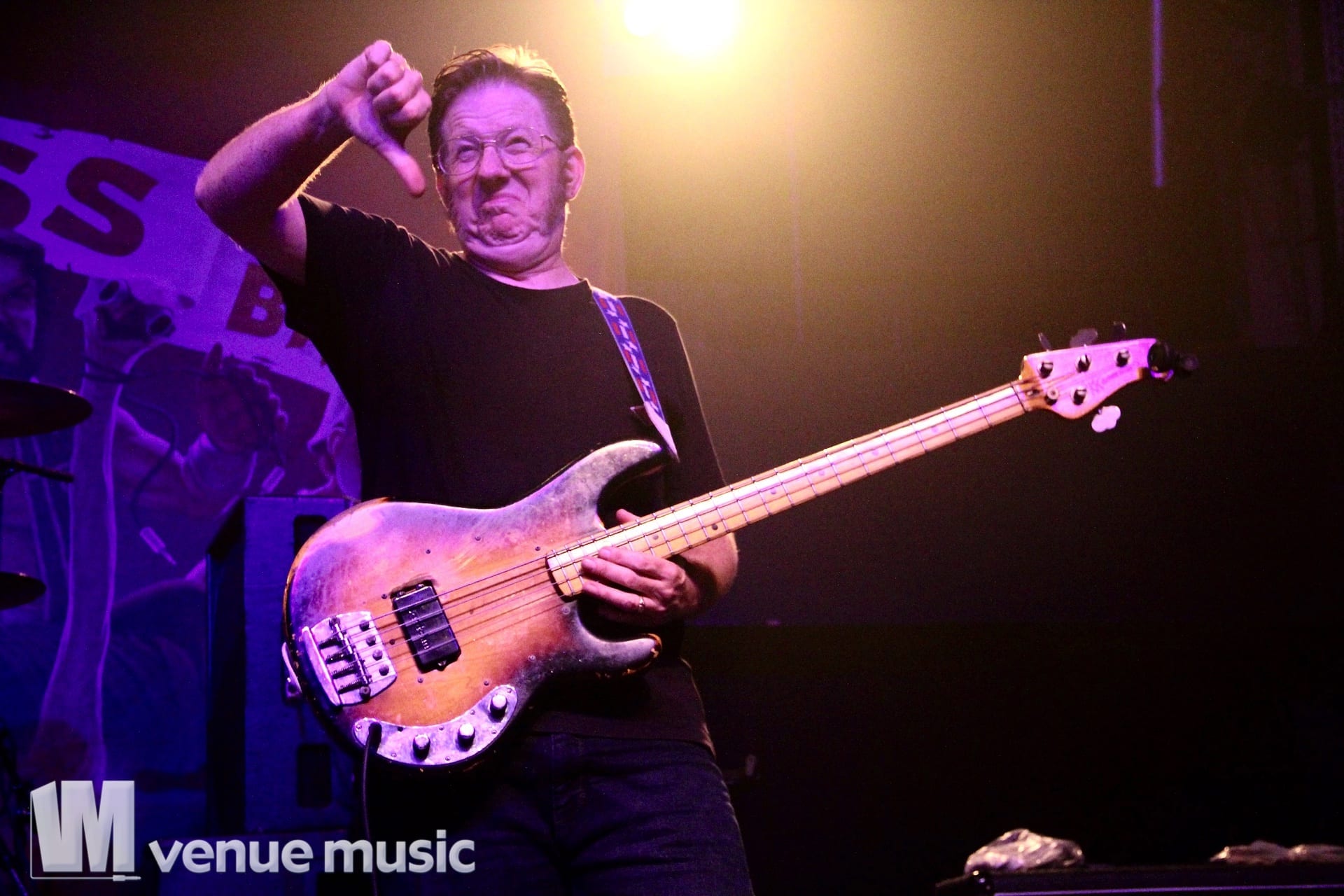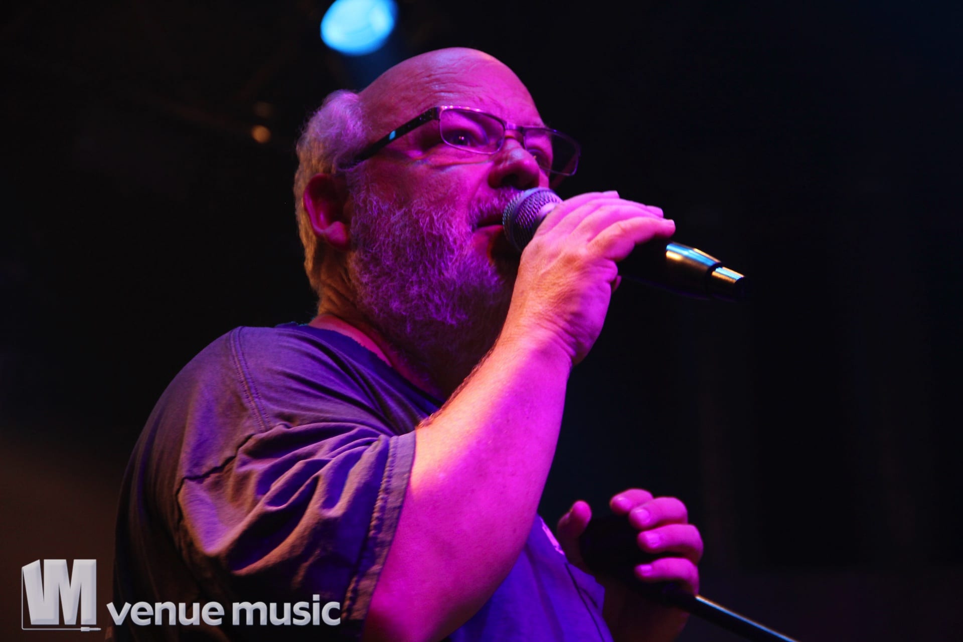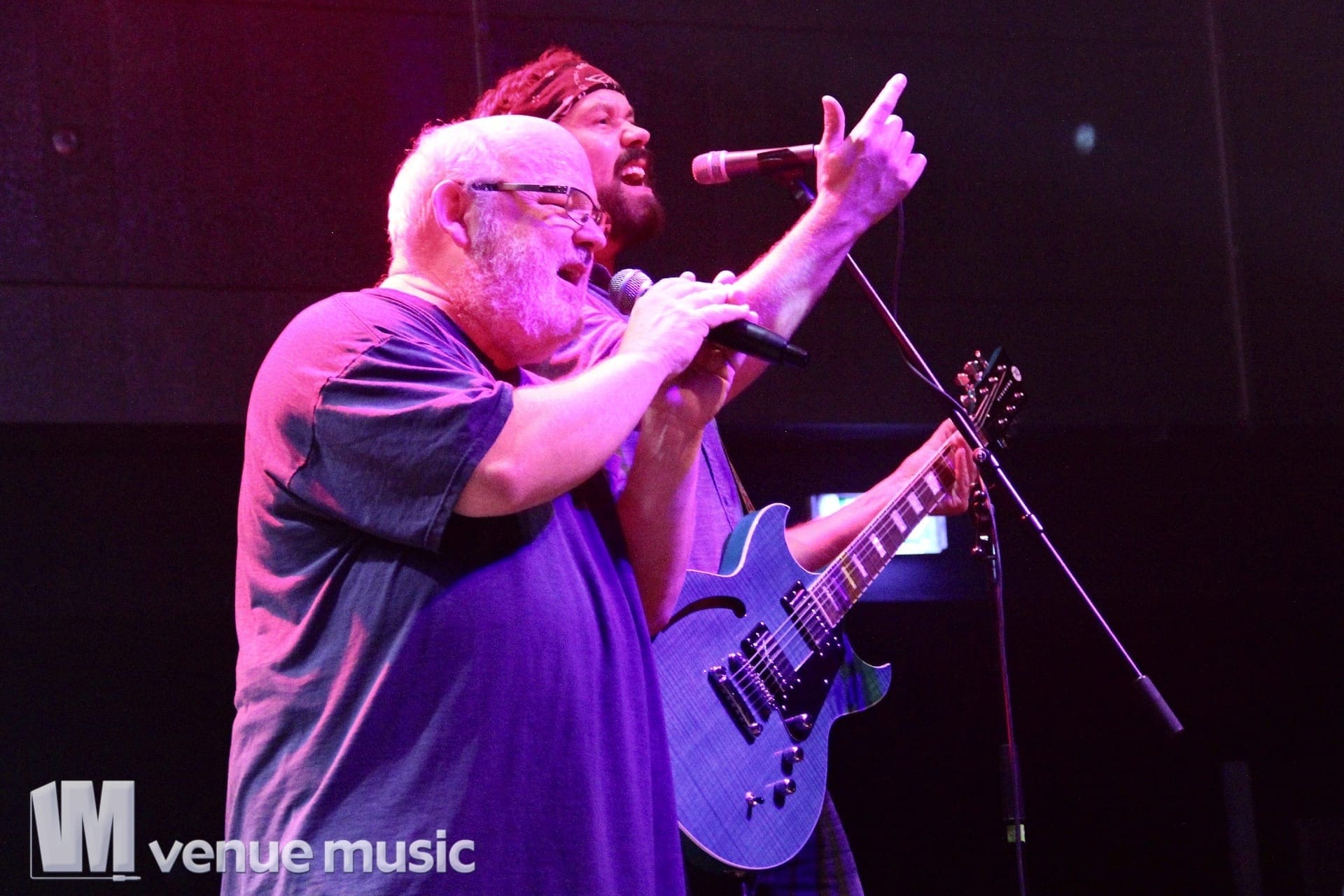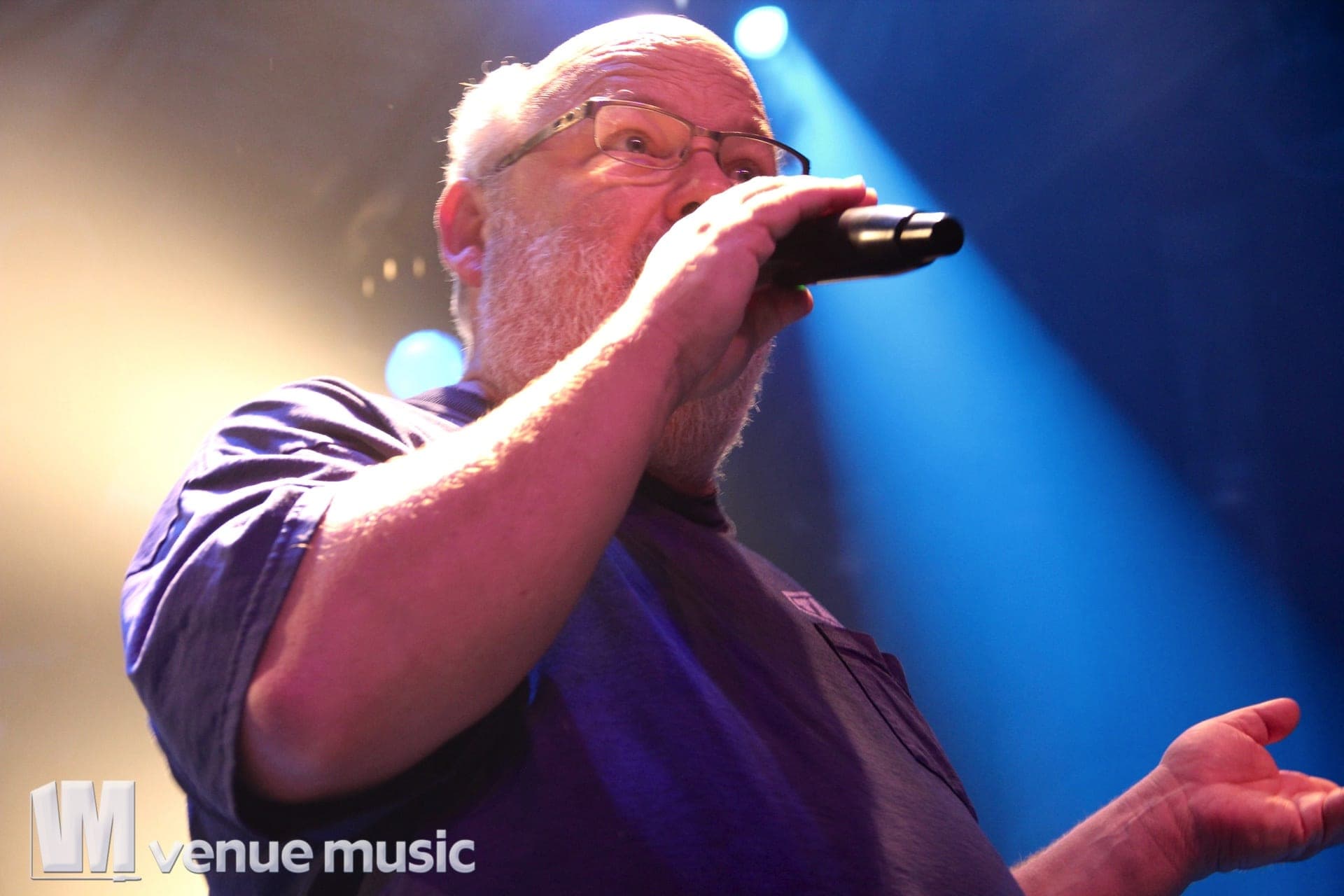 Dank dem Zoll der Schweiz und der offenbar sehr genauen Kontrolle der Merch-Artikel, fing das Konzert der Kyle Gass Band auf ihrer „Thundering Herd“(*) Tour in der Garage in Saarbrücken mit deutlicher Verspätung an. Da die Truppe aber ohne Support spielte, ging es dann aber wenigstens direkt los mit der Rockband, die nicht aussieht wie eine Rockband. Wer ohne die Band zu kennen ein Konzert der Kyle Gass Band besucht, der könnte im ersten Moment glauben, dass hier jemand einfach ein paar Leute von der Straße eingesammelt – oder, im Fall des Namensgebers der Band, vom Pool eines All-Inclusive-Hotels in Spanien – und direkt auf die Bühne gestellt hätte. Der Moment dauert aber wirklich nur einen Moment, denn sobald die fünf anfangen zu spielen, merkt man, dass hier eine verdammt gute Band auf der Bühne steht. Und das zeigte die Band während des ganzen Auftritts, zu dem auch mal ein kurzer Besuch im Graben bei den Fans in der ersten Reihe gehörte (Berührungsängste? Kennt Kyle Gass offensichtlich nicht).