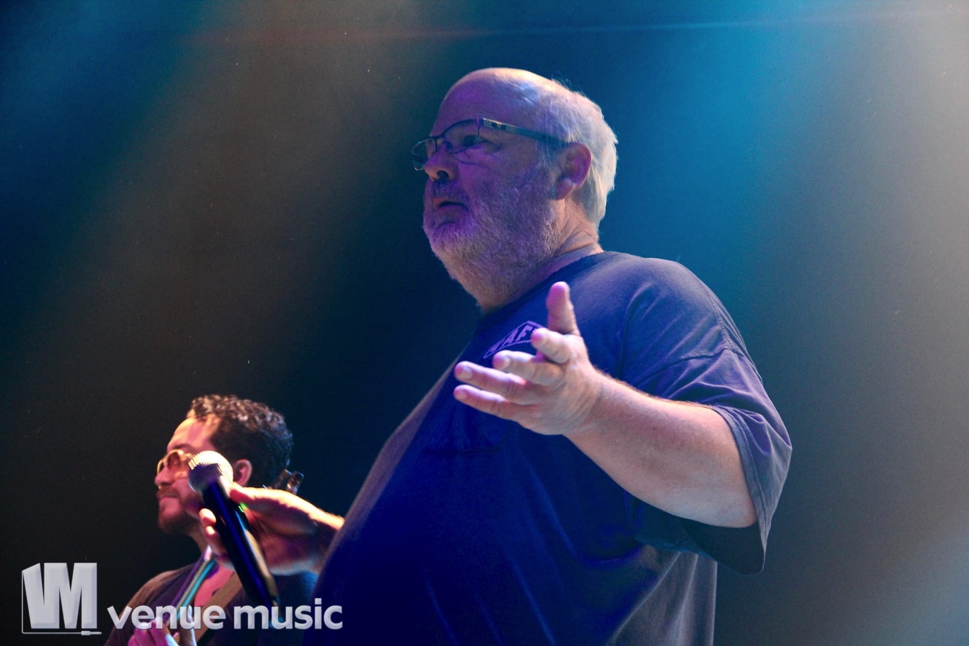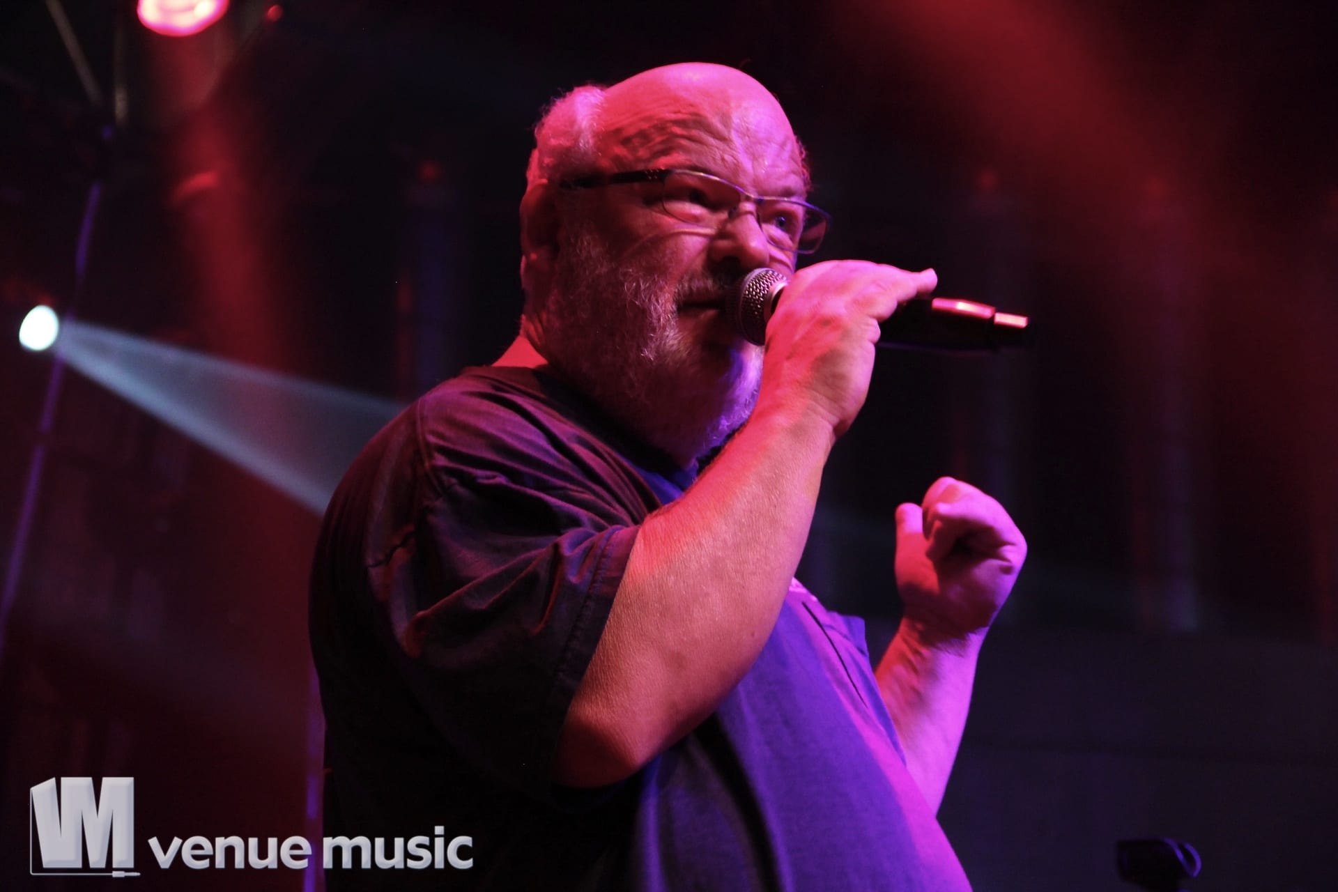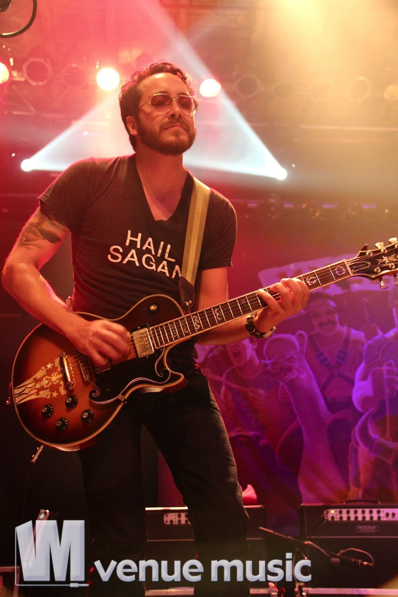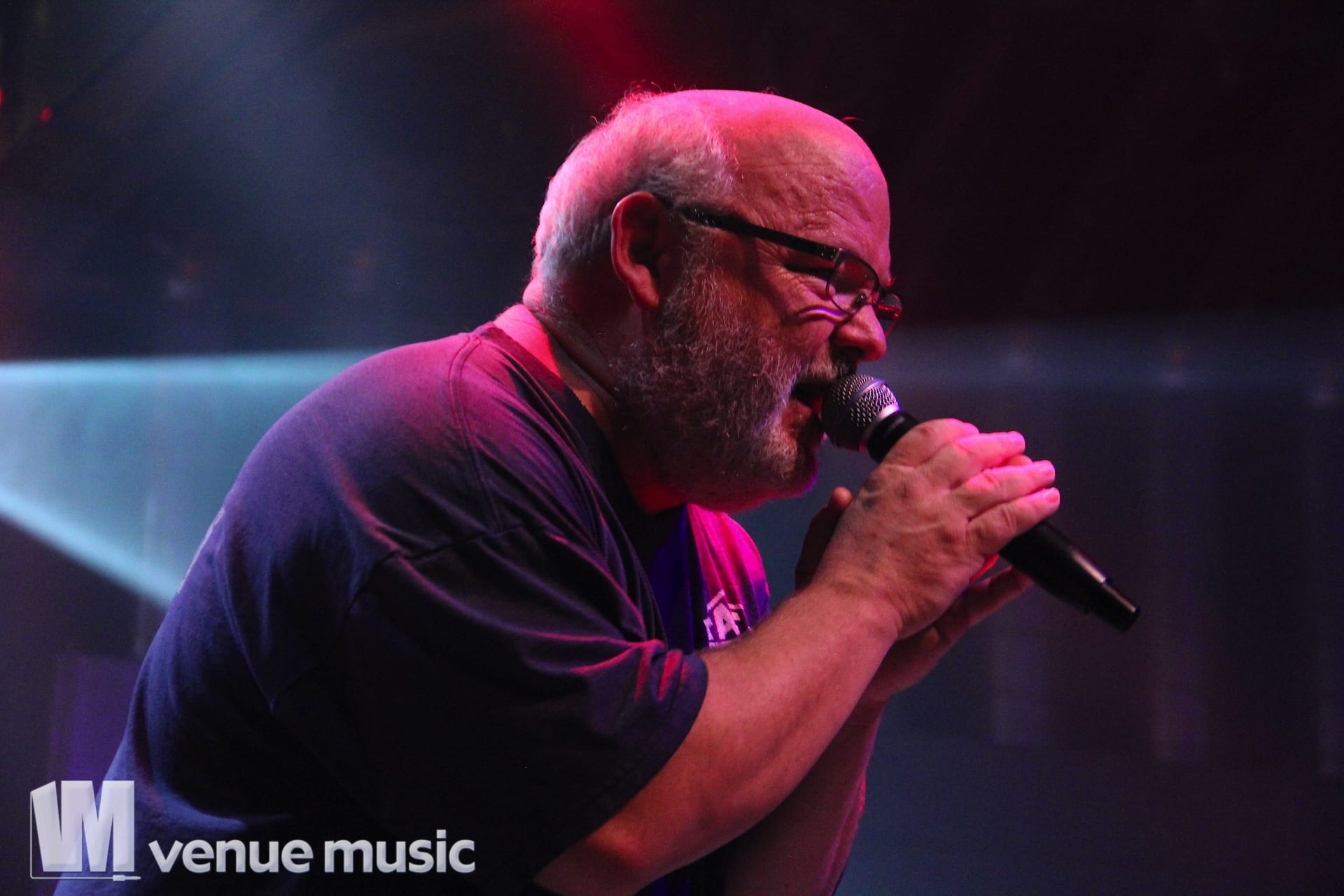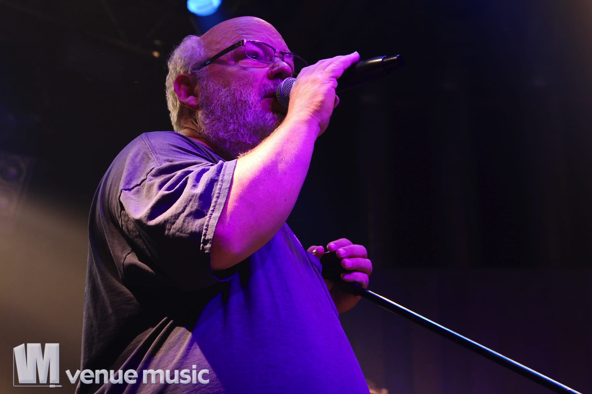 Dank dem Zoll der Schweiz und der offenbar sehr genauen Kontrolle der Merch-Artikel, fing das Konzert der Kyle Gass Band auf ihrer „Thundering Herd“(*) Tour in der Garage in Saarbrücken mit deutlicher Verspätung an. Da die Truppe aber ohne Support spielte, ging es dann aber wenigstens direkt los mit der Rockband, die nicht aussieht wie eine Rockband. Wer ohne die Band zu kennen ein Konzert der Kyle Gass Band besucht, der könnte im ersten Moment glauben, dass hier jemand einfach ein paar Leute von der Straße eingesammelt – oder, im Fall des Namensgebers der Band, vom Pool eines All-Inclusive-Hotels in Spanien – und direkt auf die Bühne gestellt hätte. Der Moment dauert aber wirklich nur einen Moment, denn sobald die fünf anfangen zu spielen, merkt man, dass hier eine verdammt gute Band auf der Bühne steht. Und das zeigte die Band während des ganzen Auftritts, zu dem auch mal ein kurzer Besuch im Graben bei den Fans in der ersten Reihe gehörte (Berührungsängste? Kennt Kyle Gass offensichtlich nicht).