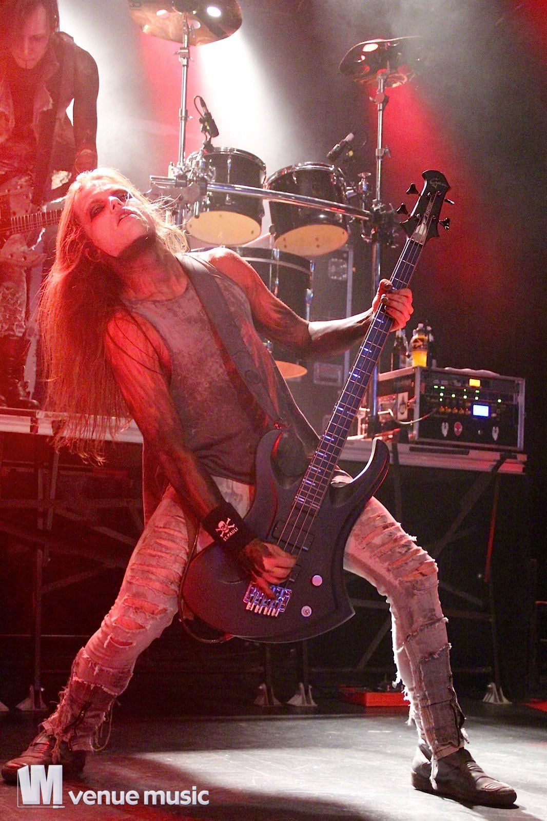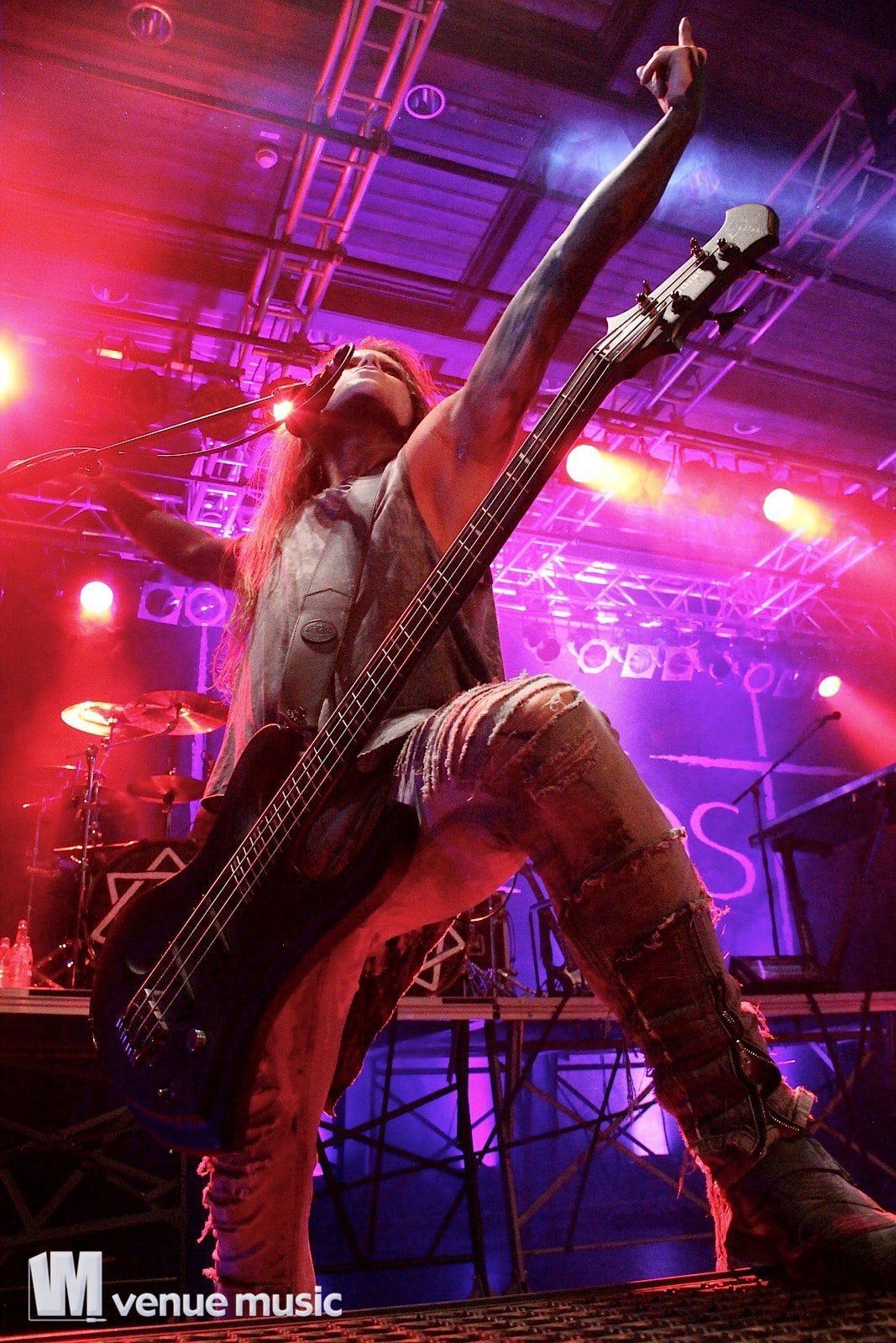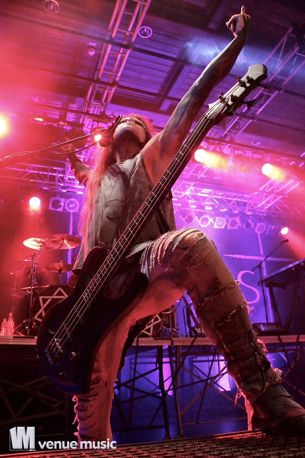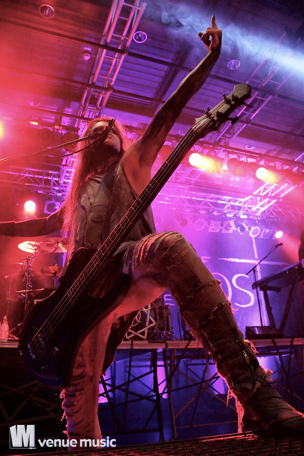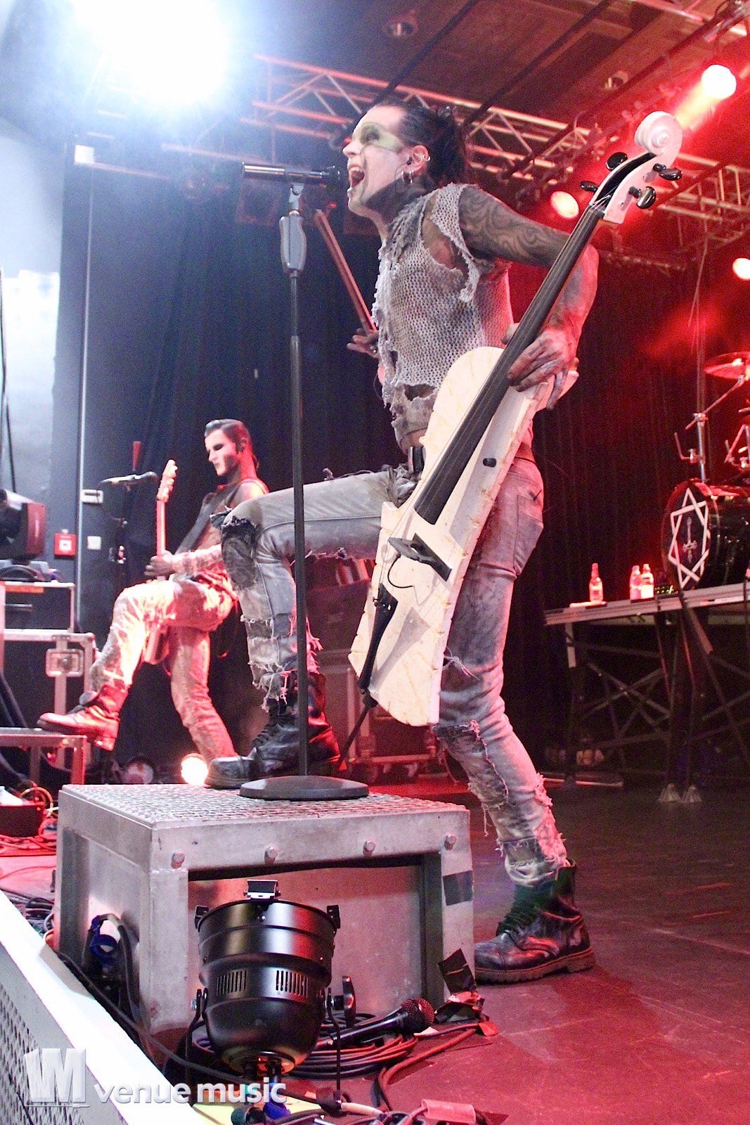 Chris Harms, Lord Of The Lost - Foto: Andrea Jaeckel-DobschatDanach kamen Lord Of The Lost mit ihrem imposanten BĂźhnenaufbau. Die BĂźhne war in zwei Podeste aufgeteilt: Bo, Chris und Class waren vor allem unten vorzufinden und fĂźr Tobias und Gared war das hintere hohe Podest reserviert, wo Schlagzeug, Keyboard und Percussions ins BĂźhnenbild integriert wurden. Los ging’s mit dem Titelsong der aktuellen EP „Full Metal Whore„, bei dem Sänger Chris mit dem E-Cello auf die BĂźhne kam. Ich hatte es recht schwer im Foto-Graben: Nicht, weil dieser etwa so ĂźberfĂźllt gewesen wäre. Nein, ich hatte echte Probleme, still stehen zu bleiben, weil ich ständig mithĂźpfen wollte. Ich kann mich noch erinnern, dass danach „Black Lolita“ und „Love & Hate“ folgten, zwei meiner Lieblingssongs. Die Setlist war eine bunte Mischung aus neuen Songs und älteren Krachern, die einfach nicht fehlen durften. So zum Beispiel „Fists Up In The Air“, „Shut Up When You’re Talking To Me“, „Six Feet Underground“, „Sex On Legs“, „Blood For Blood“, „La Bomba“ und ganz zum Schluss das „Credo“, bei dem jeder in der Halle mitsang. Viel geredet wurde nicht, aber es wurde auch nicht nur trocken das Programm abgespult. Chris packte den ein oder anderen Gag aus, man fachsimpelte Ăźber Bier, Star Wars, die Herkunft der Fans im Publikum und stimmte auch vĂśllig Ăźberdreht „Schatzi schenk mir ein Foto“ von Mickie Krause an – sehr zur Freude der Fans – kein Wunder, dass ab und zu Unterwäsche in Übergröße auf die BĂźhne geflogen kam. ;-)