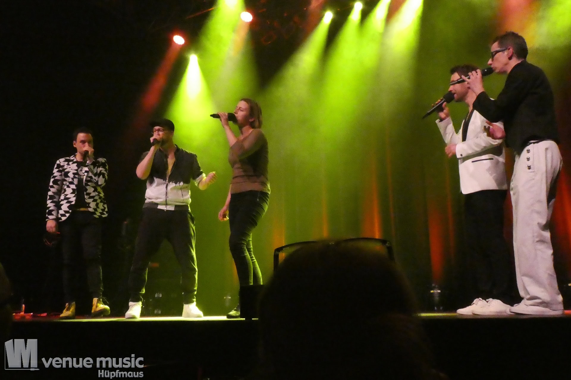 Eine etwas andere Version von „Am Sonntag will mein Süßer mit mir segeln geh’n“ folgte, bevor ein Zuschauer oder eine Zuschauerin die Chance bekam, mit Maybebop auf der Bühne zu singen. Bedingung: dass er oder sie das nicht bereits getan hatten. Jeder halt nur ein Kreuz..äh.. Song… zunächst meldete sich niemand, nur das Mädchen, welches bereits das Musikquiz souverän gemeistert (und die Band in Grund und Boden gequatscht hatte ;) ), aber da sie schon auf der Bühne war, traute sich dann doch noch jemand vom Rang: Johanna hieß die Mutige. Und was sie sich dann als Song aussuchte, brachte die Band zunächst kurz ins grübeln und zumindest das Gitarrenintro von Guns´n´Roses „Sweet Child of Mine“ war nicht so richtig singbar (zumindest nicht auf die Schnelle). Kurz auf youtube in den Song reingehört haben Maybebop aber eine klasse A Capella Unterstützung für Johanna geliefert, die – das muss man ehrlich sagen – echt gut singen kann. Das war ein Top-Auftritt, das muss man erst einmal so hinbekommen. Hut ab! Dafür bekam sie nicht nur die DVD zum aktuellen Album, sondern einen donnernden Applaus und eine dicke Umarmung von allen Musikern.