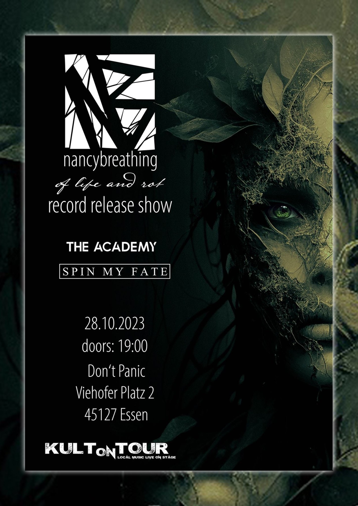 Der Countdown läuft: Die Alternative Metal Band „nancybreathing“ aus Essen veröffentlicht am 21.10.2023 ihr 3. Studioalbum „of life and rot“. Nach der digitalen Veröffentlichung folgt am 28.10.2023 der physische Release und der wird im Rahmen der neuen Kult On Tour-Konzertserie >incarnate< gebührend gefeiert.