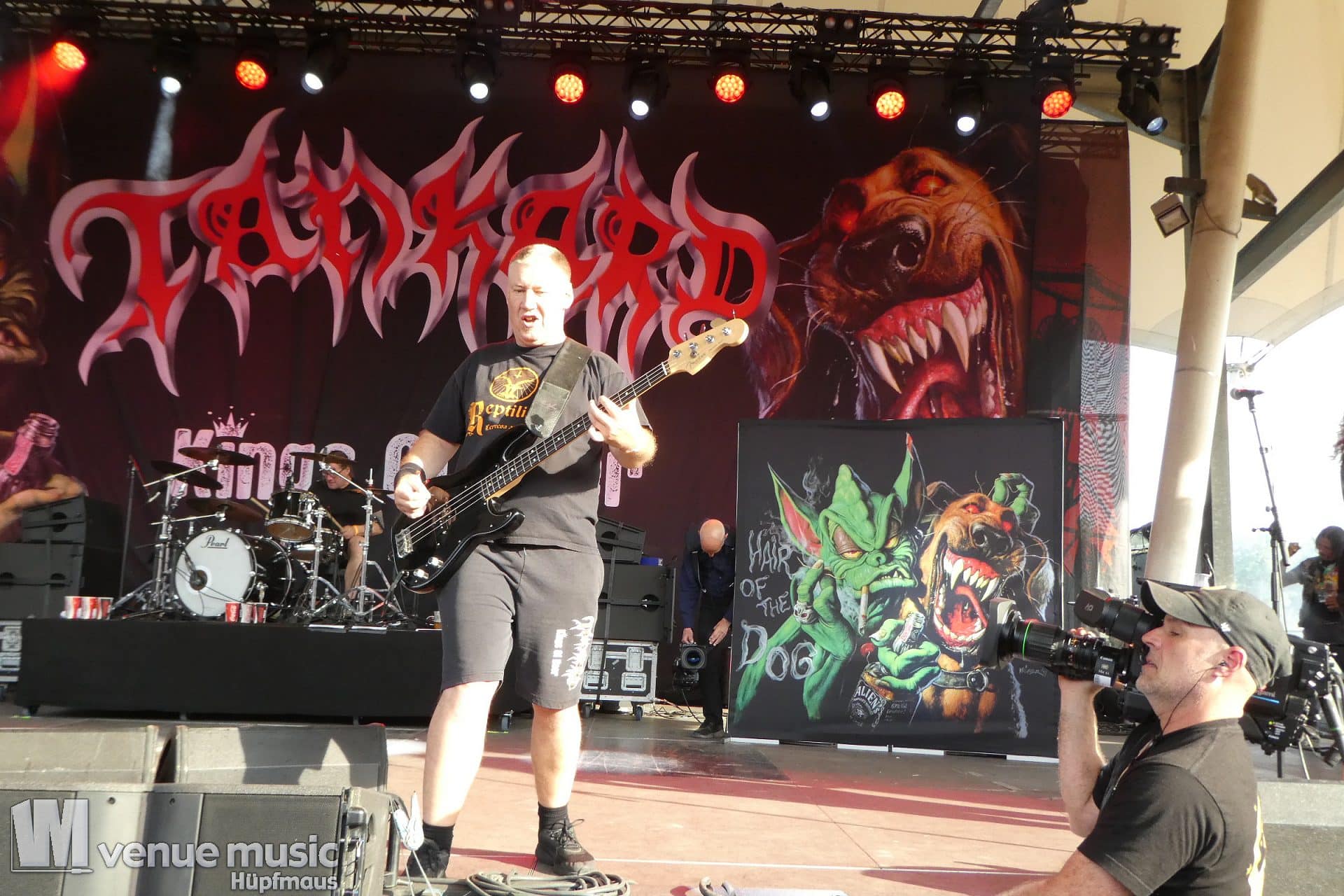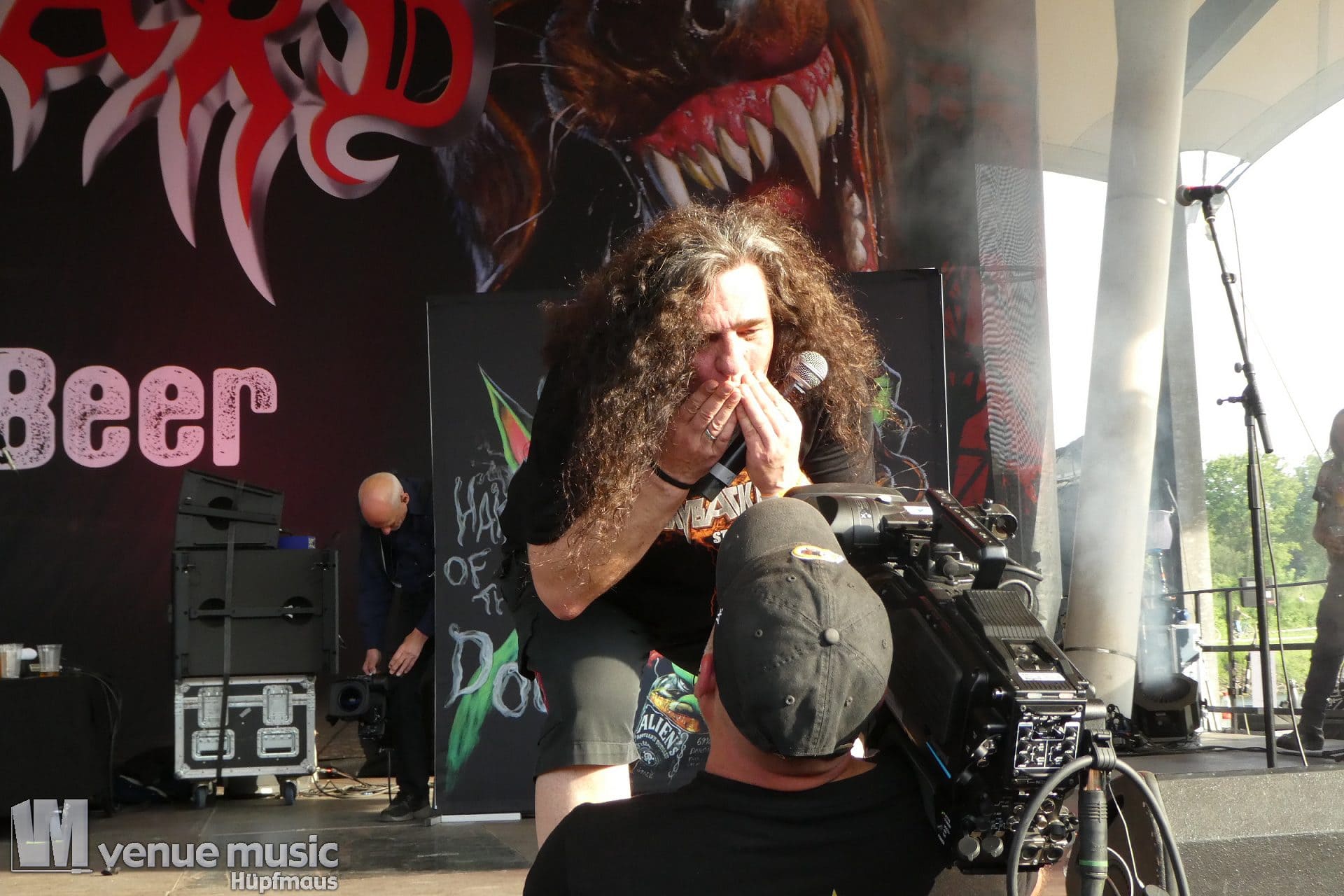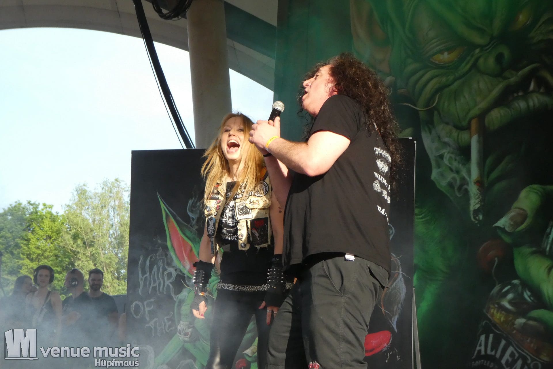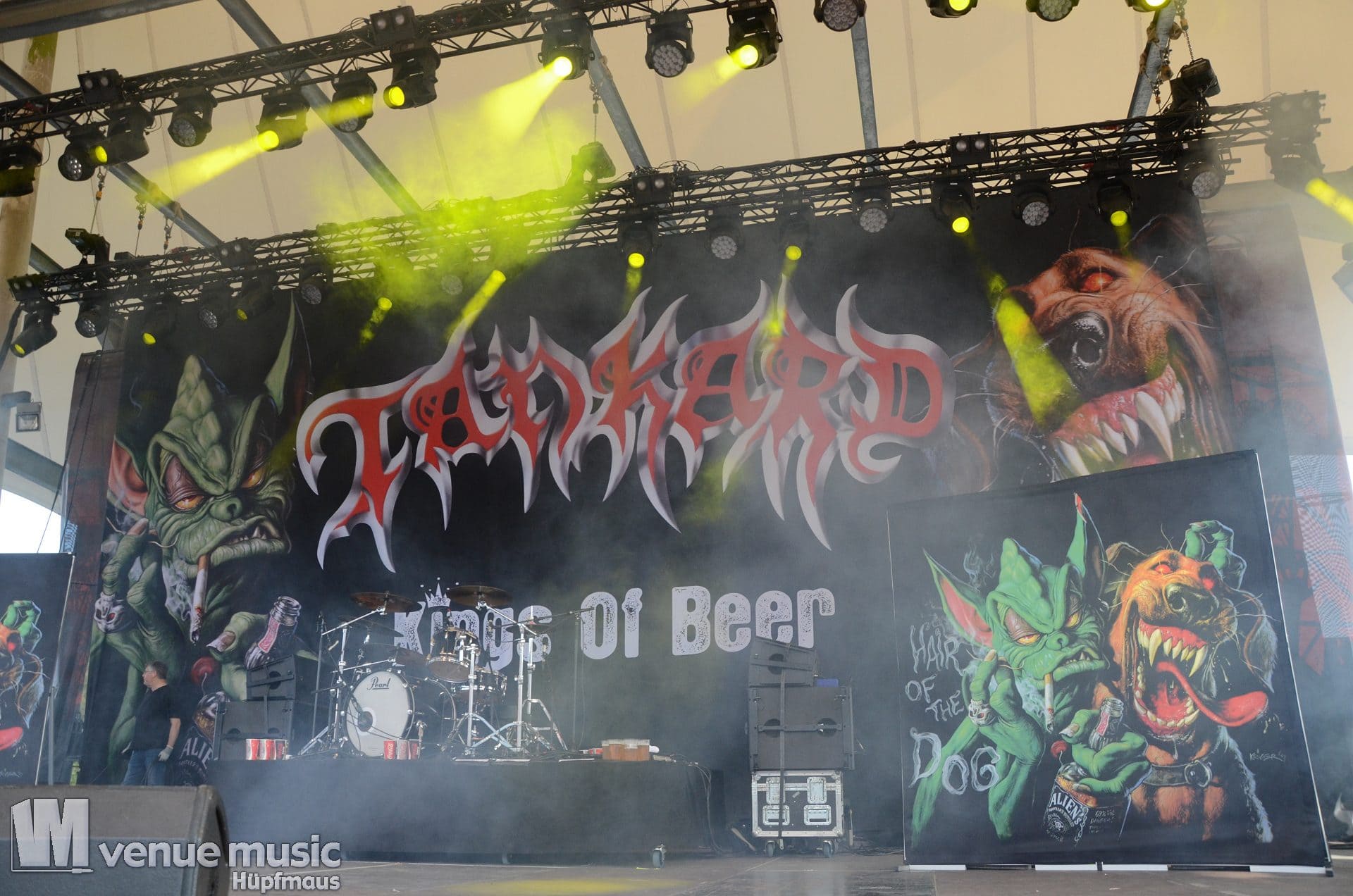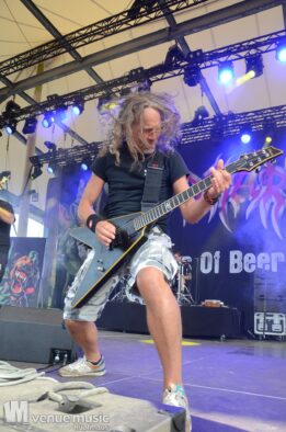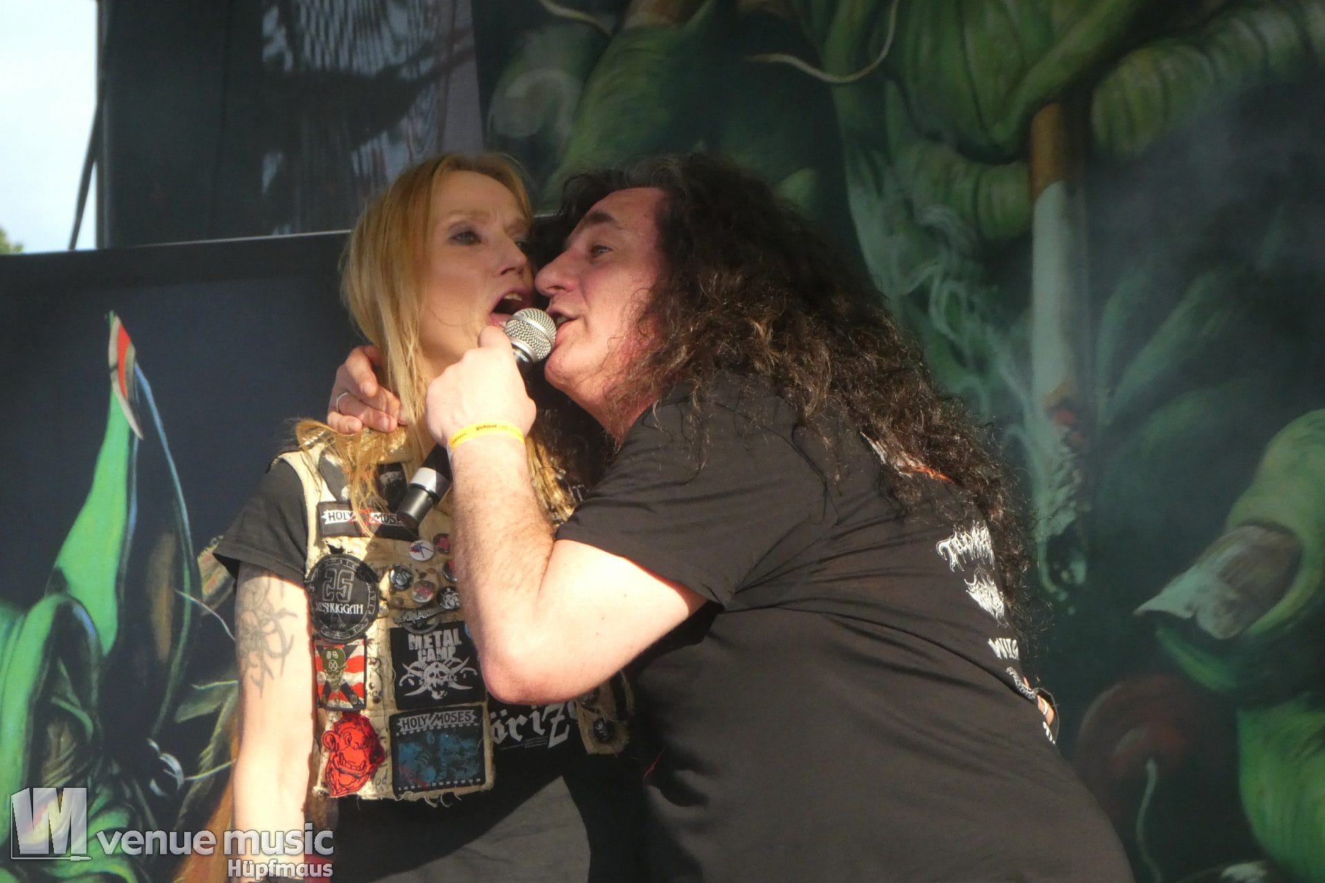 Danach ging es mit ebenso viel Power auf der Bühne weiter, denn Tankard waren nun an der Reihe. Und wie immer war es schwierig, Gerre mal bei einem ruhigen Moment zu erwischen, denn wie immer flitzte er von rechts nach links über die Bühne. Auch Frank Thorwarth stand wie so oft kaum still – und war mal wieder ein Meister der Grimassen ;) In weiser Voraussicht hatte die Kamerafrau vom WDR sich bei Tankard für eine der Kameras hinten im Publikum einteilen lassen, wurde sie doch bereits bei einem früheren Auftritt der Band von Gerre auf die Bühne geholt zu „A Girl Called Cerveza“. Schade, ich fands damals lustig ;) Dafür hatten Tankard zum Abschluss des Sets noch einen prominenten Gast mit auf der Bühne, denn Sabina Claasen unterstützte Gerre bei „Empty Tankard“ fleissig. Dafür hat er auch lange genug an ihr herumgebaggert ;) Wie immer machte der Tankard Auftritt Spaß, um erstere Themen als die Reinheit des Bieres gehts eher selten.. Musik, Spaß und Bier eben. Reicht doch für einen geilen Auftritt. Auch hier war das Set gefühlt deutlich zu kurz, das Publikum feierte zu Titeln wie „Chemical Invasion“, „Zombie Attack“ oder „The Morning After“ richtig ab. Sicher wird dem einen oder anderen ein Lieblingssong gefehlt haben, doch so ist das immer auf den Festivals..