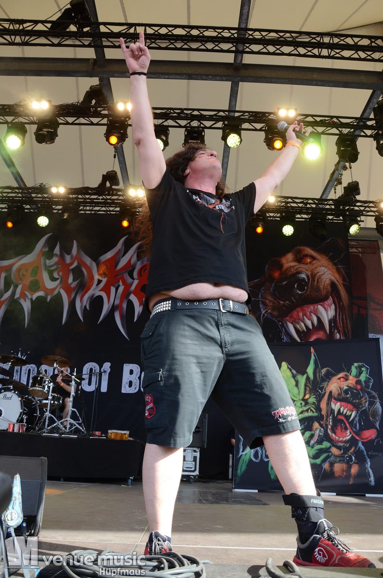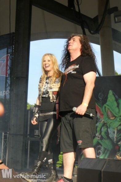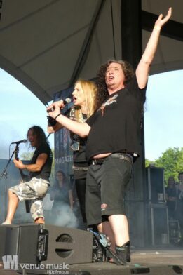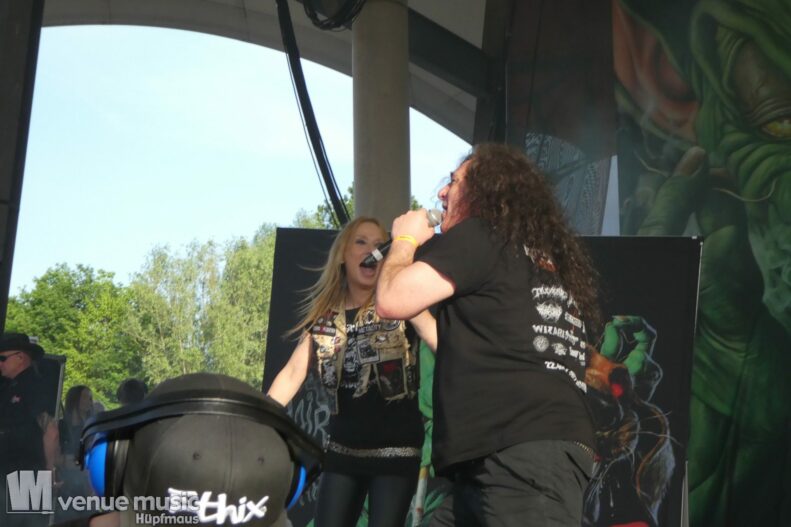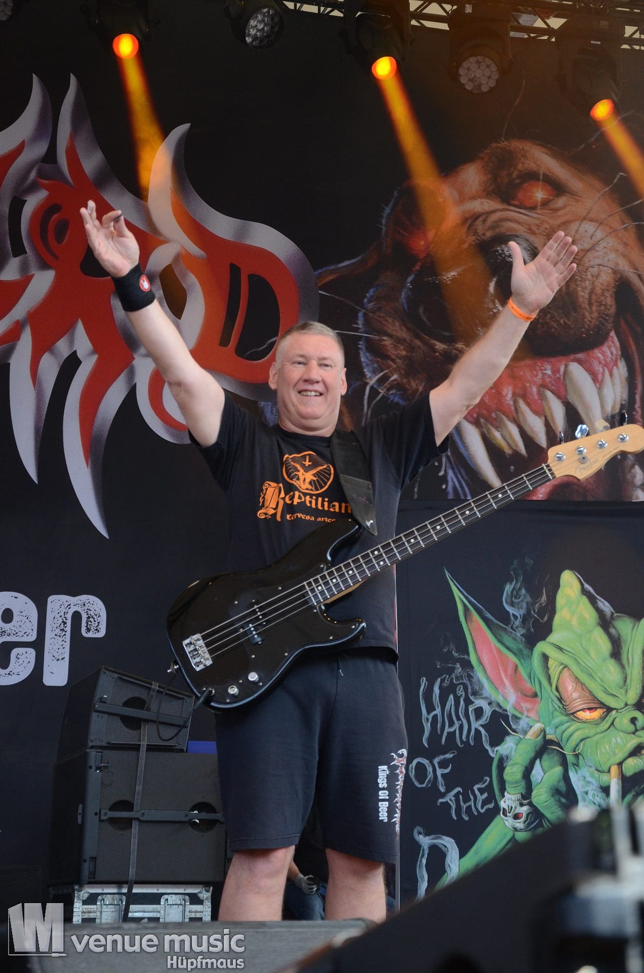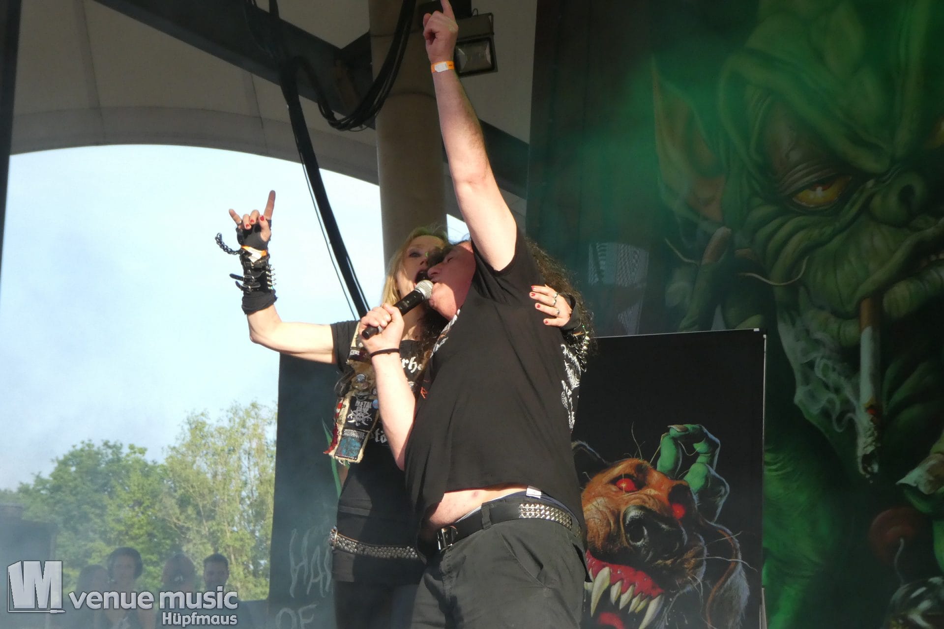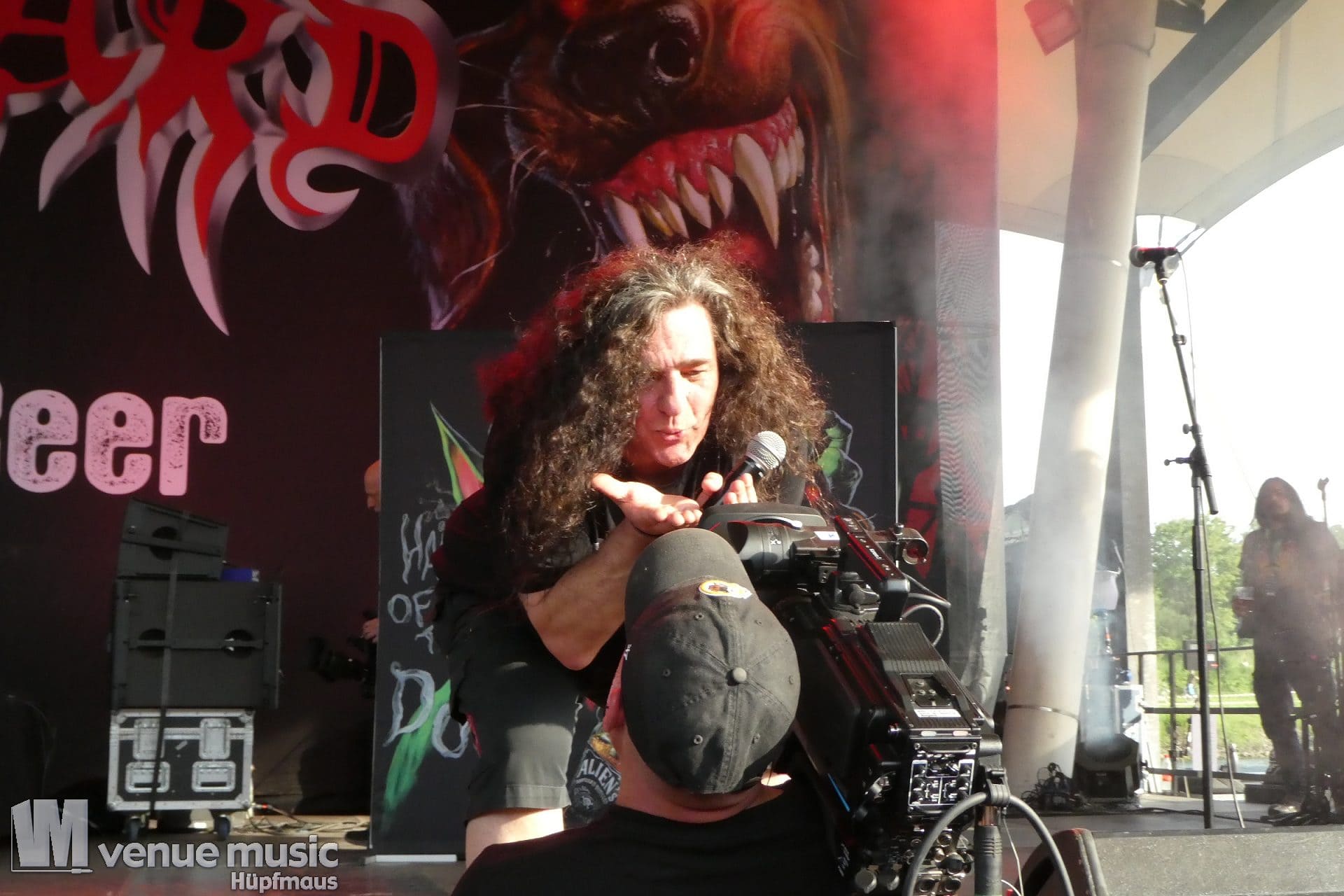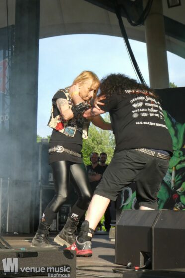 Danach ging es mit ebenso viel Power auf der Bühne weiter, denn Tankard waren nun an der Reihe. Und wie immer war es schwierig, Gerre mal bei einem ruhigen Moment zu erwischen, denn wie immer flitzte er von rechts nach links über die Bühne. Auch Frank Thorwarth stand wie so oft kaum still – und war mal wieder ein Meister der Grimassen ;) In weiser Voraussicht hatte die Kamerafrau vom WDR sich bei Tankard für eine der Kameras hinten im Publikum einteilen lassen, wurde sie doch bereits bei einem früheren Auftritt der Band von Gerre auf die Bühne geholt zu „A Girl Called Cerveza“. Schade, ich fands damals lustig ;) Dafür hatten Tankard zum Abschluss des Sets noch einen prominenten Gast mit auf der Bühne, denn Sabina Claasen unterstützte Gerre bei „Empty Tankard“ fleissig. Dafür hat er auch lange genug an ihr herumgebaggert ;) Wie immer machte der Tankard Auftritt Spaß, um erstere Themen als die Reinheit des Bieres gehts eher selten.. Musik, Spaß und Bier eben. Reicht doch für einen geilen Auftritt. Auch hier war das Set gefühlt deutlich zu kurz, das Publikum feierte zu Titeln wie „Chemical Invasion“, „Zombie Attack“ oder „The Morning After“ richtig ab. Sicher wird dem einen oder anderen ein Lieblingssong gefehlt haben, doch so ist das immer auf den Festivals..