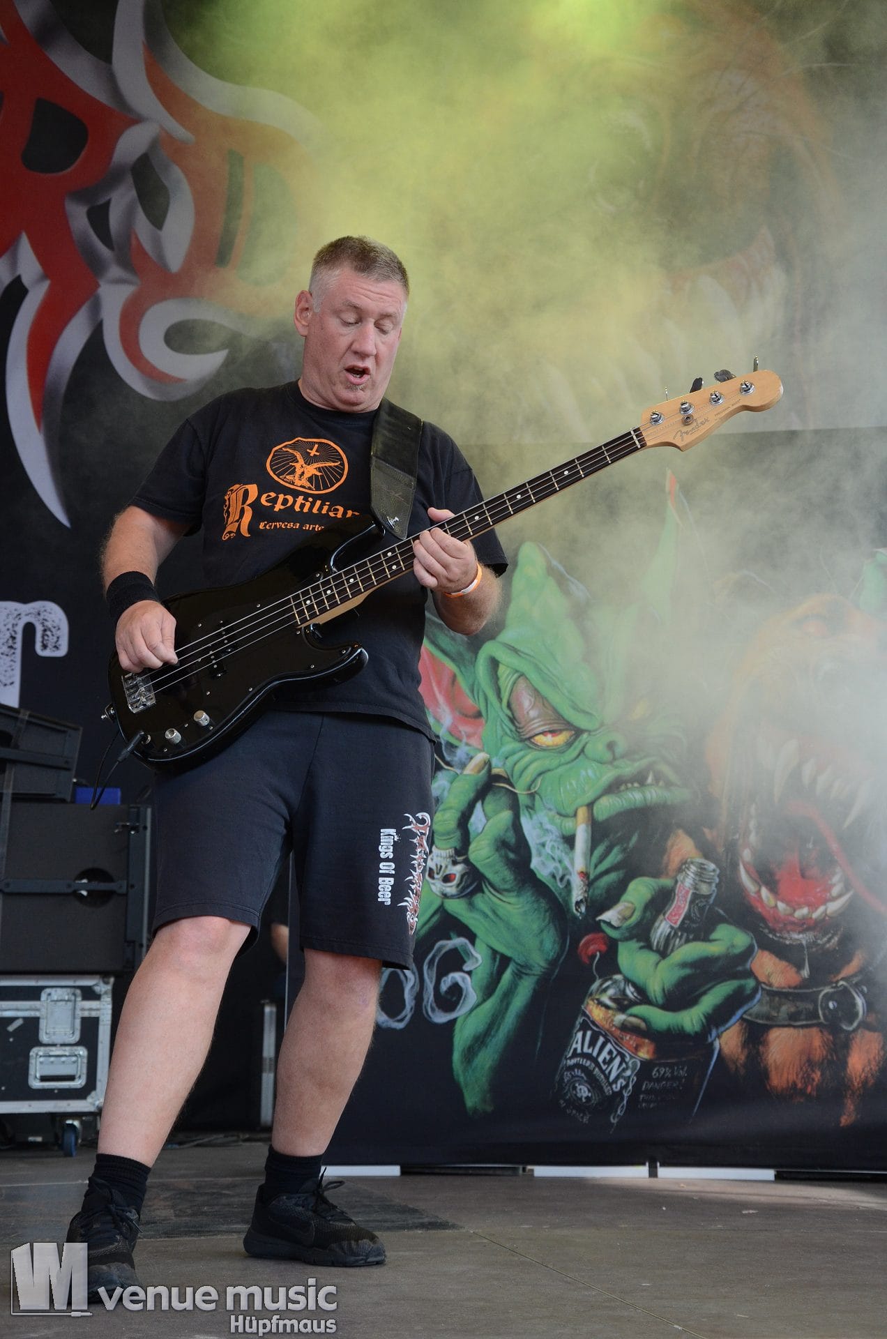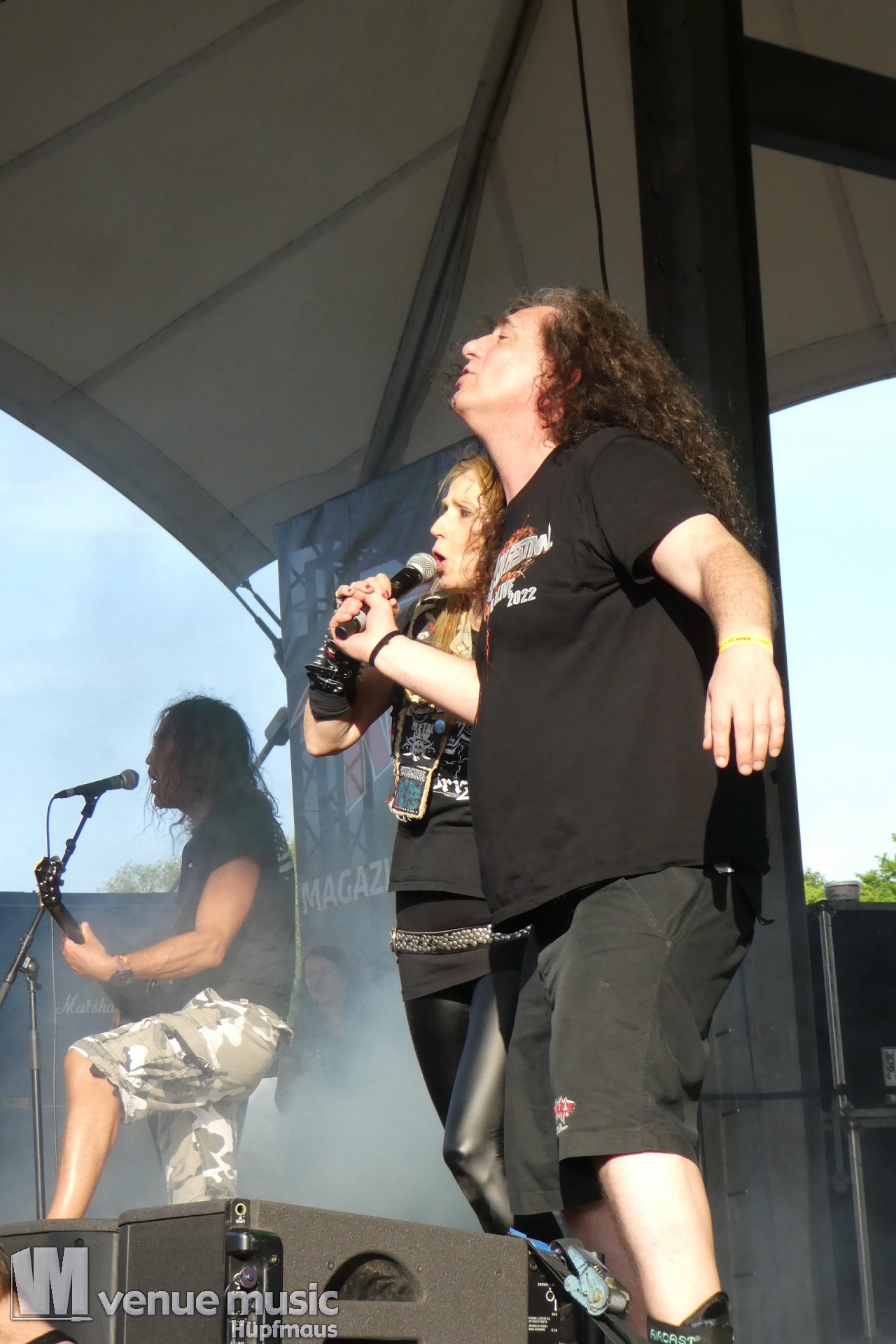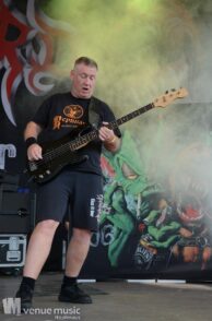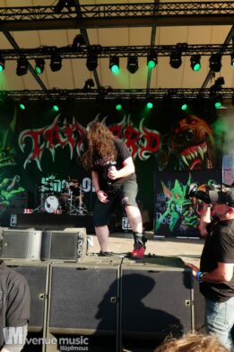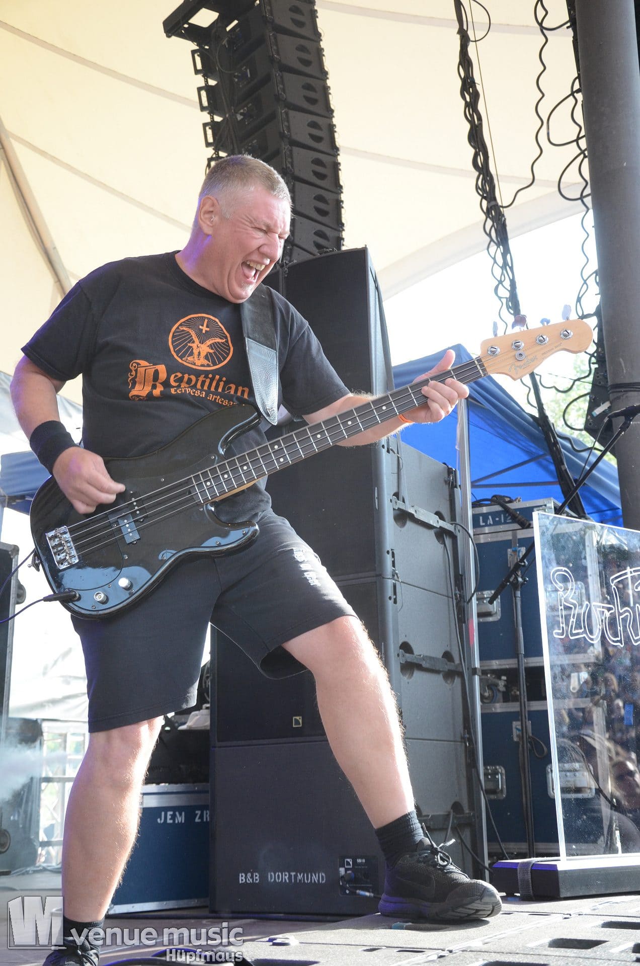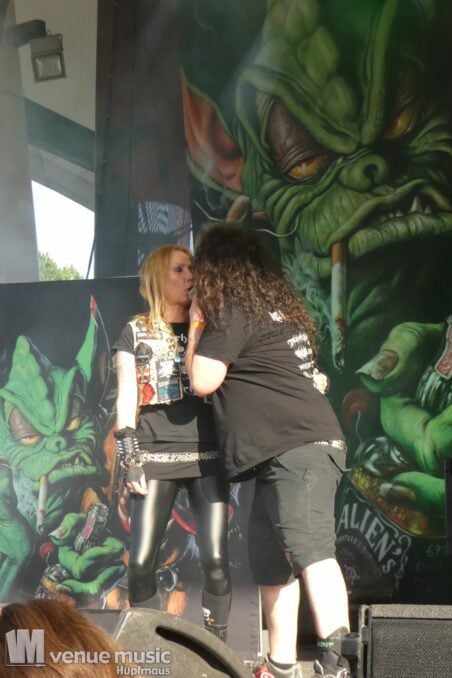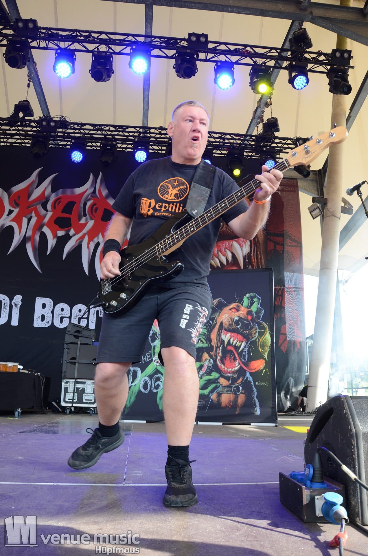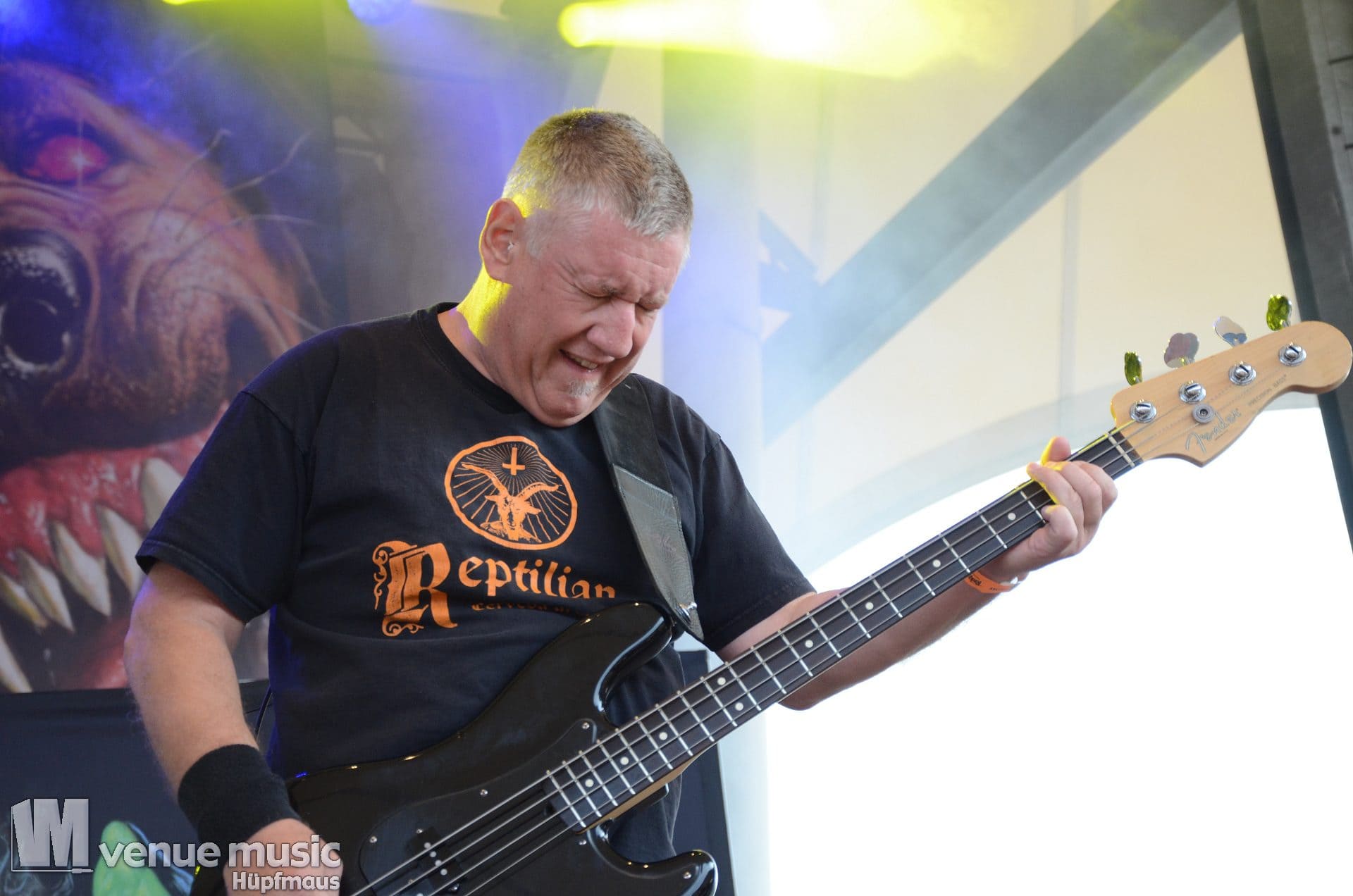 Danach ging es mit ebenso viel Power auf der Bühne weiter, denn Tankard waren nun an der Reihe. Und wie immer war es schwierig, Gerre mal bei einem ruhigen Moment zu erwischen, denn wie immer flitzte er von rechts nach links über die Bühne. Auch Frank Thorwarth stand wie so oft kaum still – und war mal wieder ein Meister der Grimassen ;) In weiser Voraussicht hatte die Kamerafrau vom WDR sich bei Tankard für eine der Kameras hinten im Publikum einteilen lassen, wurde sie doch bereits bei einem früheren Auftritt der Band von Gerre auf die Bühne geholt zu „A Girl Called Cerveza“. Schade, ich fands damals lustig ;) Dafür hatten Tankard zum Abschluss des Sets noch einen prominenten Gast mit auf der Bühne, denn Sabina Claasen unterstützte Gerre bei „Empty Tankard“ fleissig. Dafür hat er auch lange genug an ihr herumgebaggert ;) Wie immer machte der Tankard Auftritt Spaß, um erstere Themen als die Reinheit des Bieres gehts eher selten.. Musik, Spaß und Bier eben. Reicht doch für einen geilen Auftritt. Auch hier war das Set gefühlt deutlich zu kurz, das Publikum feierte zu Titeln wie „Chemical Invasion“, „Zombie Attack“ oder „The Morning After“ richtig ab. Sicher wird dem einen oder anderen ein Lieblingssong gefehlt haben, doch so ist das immer auf den Festivals..
