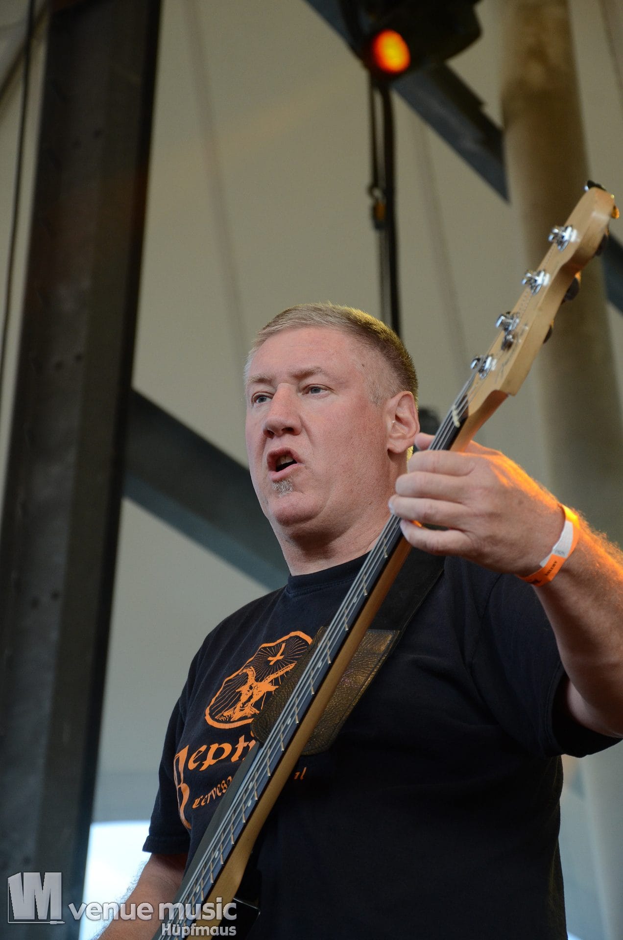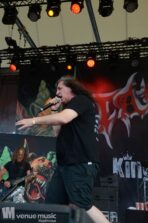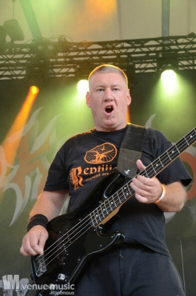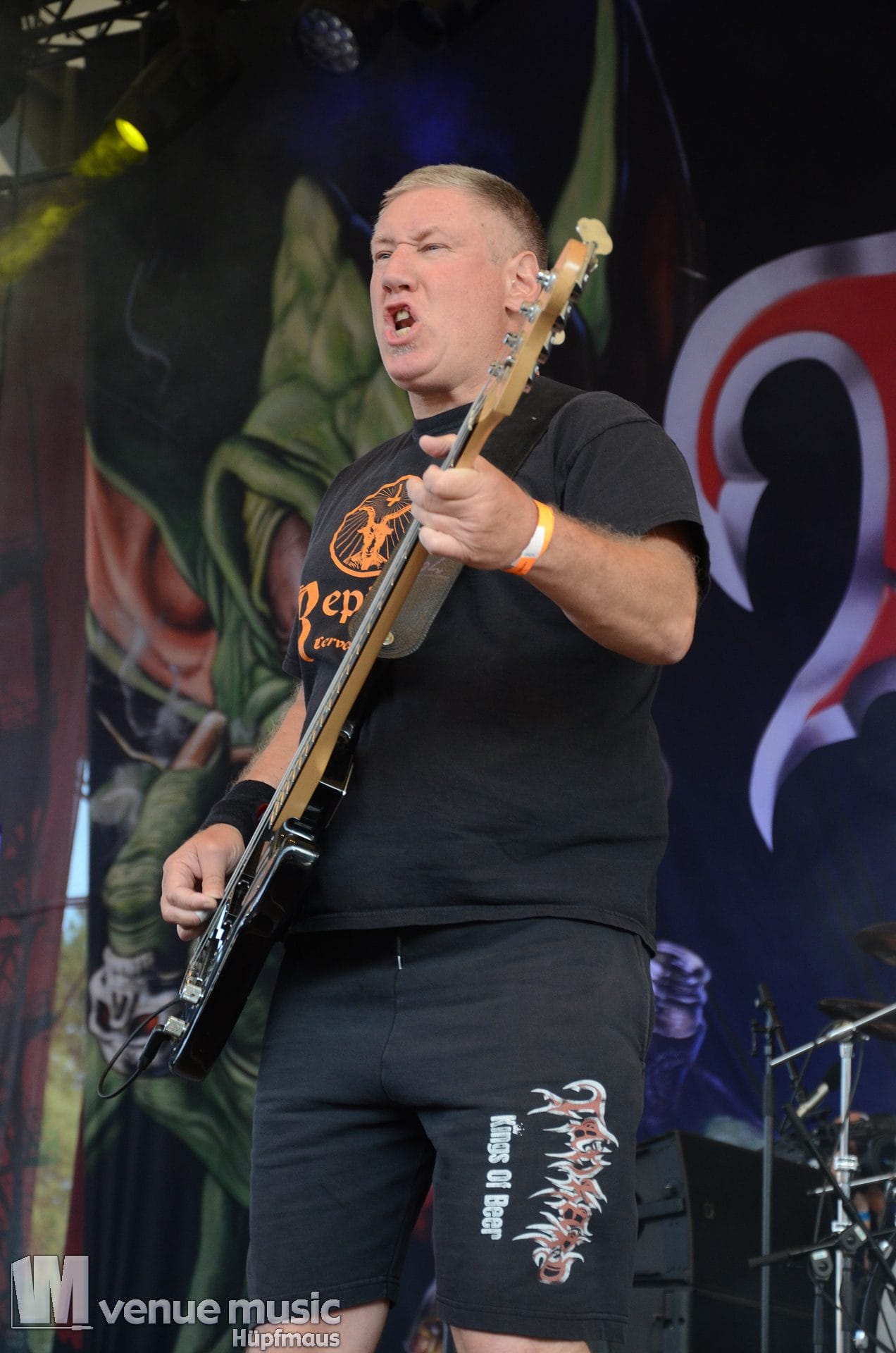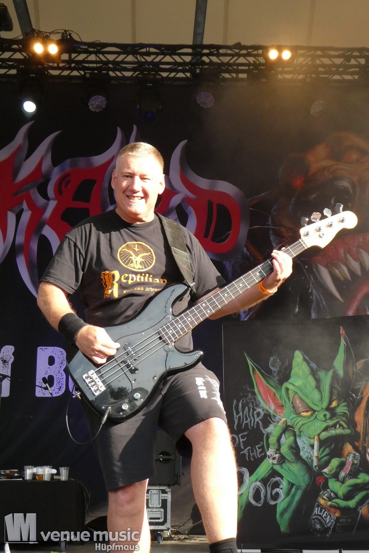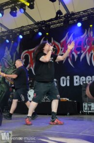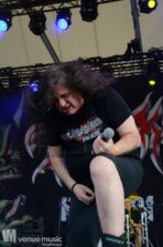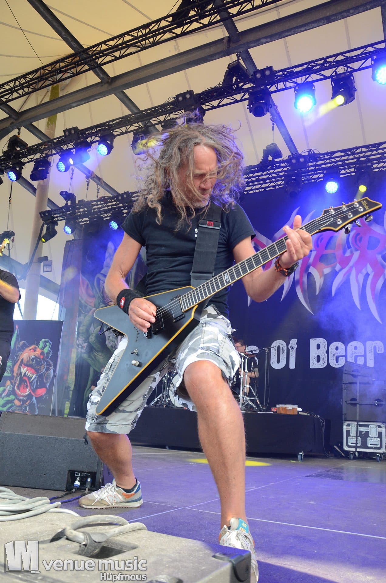 Danach ging es mit ebenso viel Power auf der Bühne weiter, denn Tankard waren nun an der Reihe. Und wie immer war es schwierig, Gerre mal bei einem ruhigen Moment zu erwischen, denn wie immer flitzte er von rechts nach links über die Bühne. Auch Frank Thorwarth stand wie so oft kaum still – und war mal wieder ein Meister der Grimassen ;) In weiser Voraussicht hatte die Kamerafrau vom WDR sich bei Tankard für eine der Kameras hinten im Publikum einteilen lassen, wurde sie doch bereits bei einem früheren Auftritt der Band von Gerre auf die Bühne geholt zu „A Girl Called Cerveza“. Schade, ich fands damals lustig ;) Dafür hatten Tankard zum Abschluss des Sets noch einen prominenten Gast mit auf der Bühne, denn Sabina Claasen unterstützte Gerre bei „Empty Tankard“ fleissig. Dafür hat er auch lange genug an ihr herumgebaggert ;) Wie immer machte der Tankard Auftritt Spaß, um erstere Themen als die Reinheit des Bieres gehts eher selten.. Musik, Spaß und Bier eben. Reicht doch für einen geilen Auftritt. Auch hier war das Set gefühlt deutlich zu kurz, das Publikum feierte zu Titeln wie „Chemical Invasion“, „Zombie Attack“ oder „The Morning After“ richtig ab. Sicher wird dem einen oder anderen ein Lieblingssong gefehlt haben, doch so ist das immer auf den Festivals..